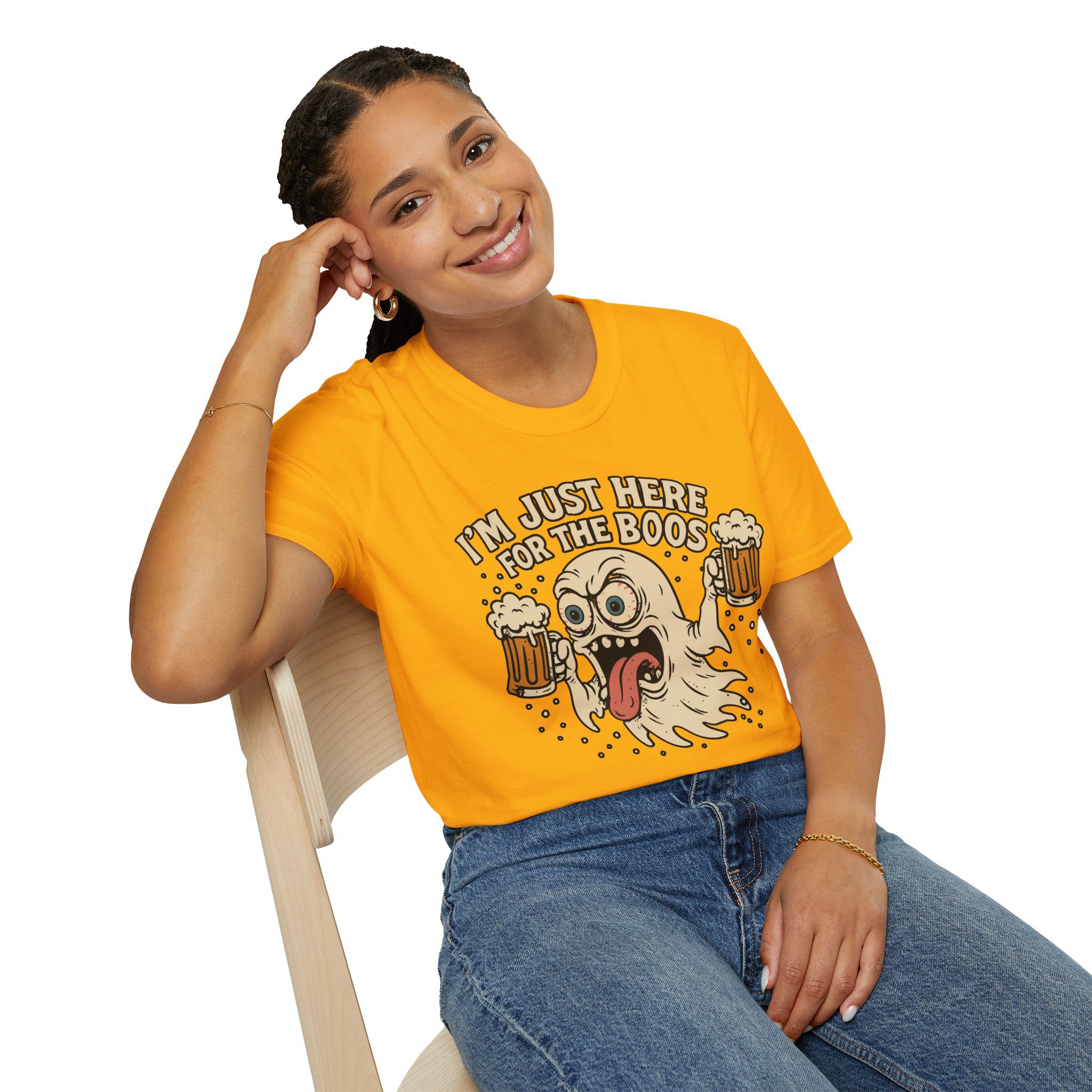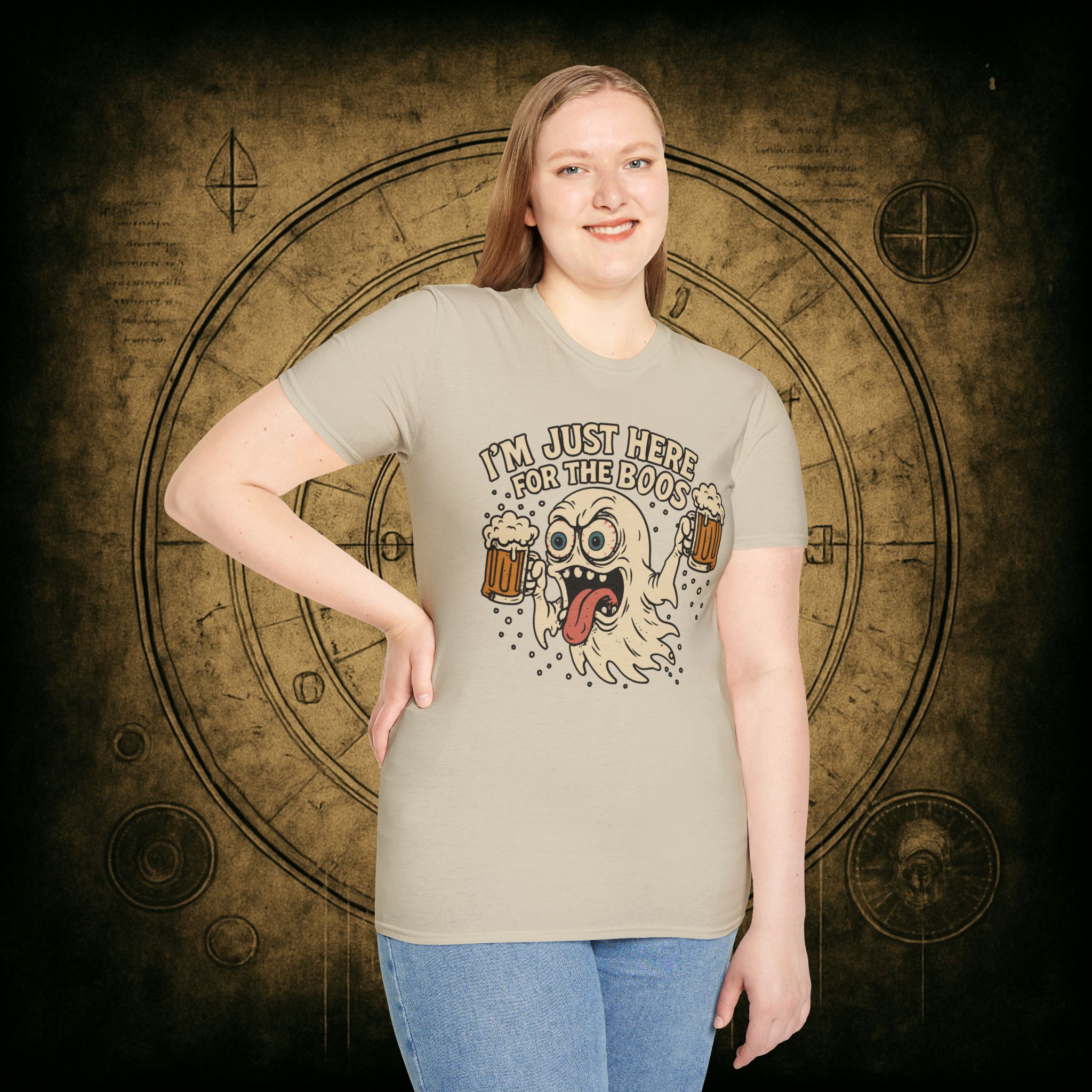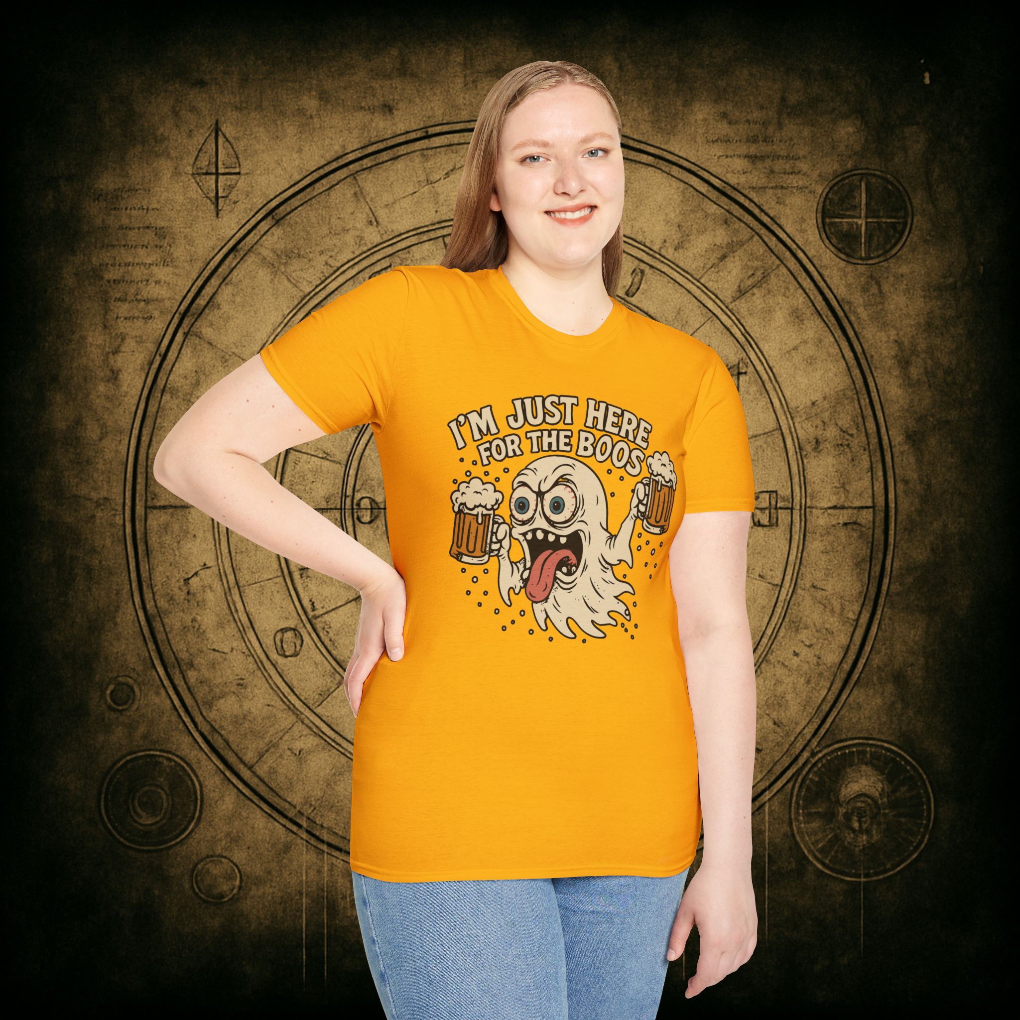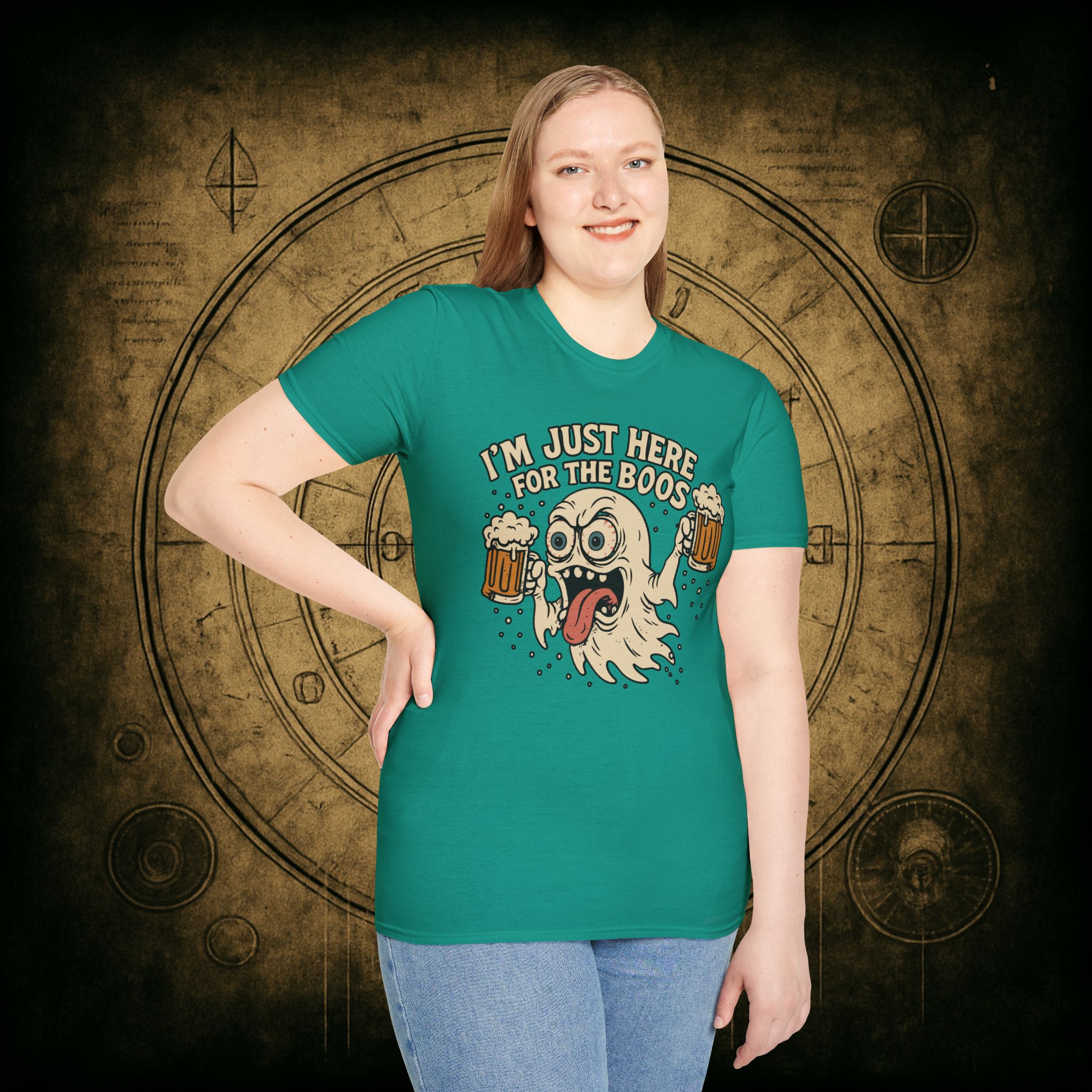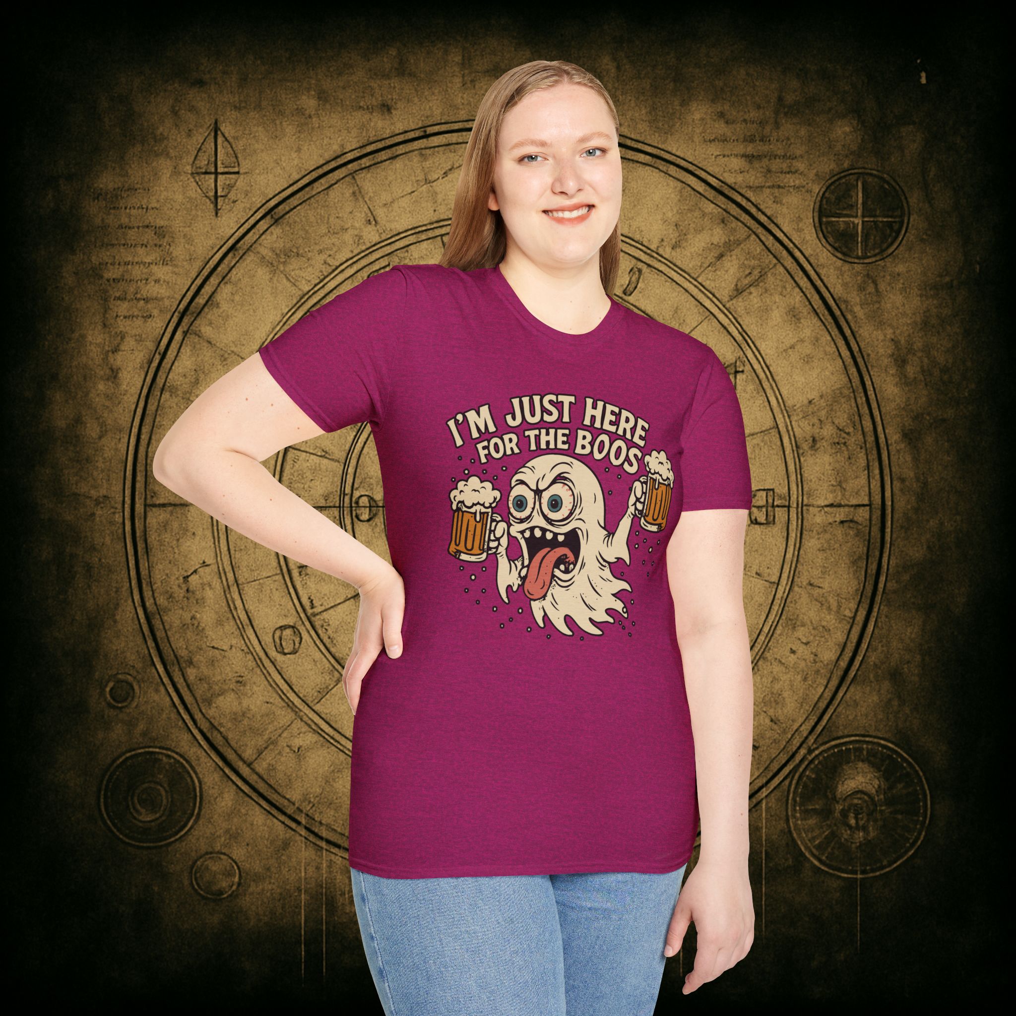 This T-Shirt is perfect for those who love a good pun, featuring a funny and snarky design with an alcoholic ghost saying ‘I’m just Here for the Boos’. It gives off a playful and lighthearted vibe, making it a great conversation starter. Ideal for ghosts who enjoy humor and relaxed style, this T-Shirt is perfect for Halloween, parties, or casual outings.
