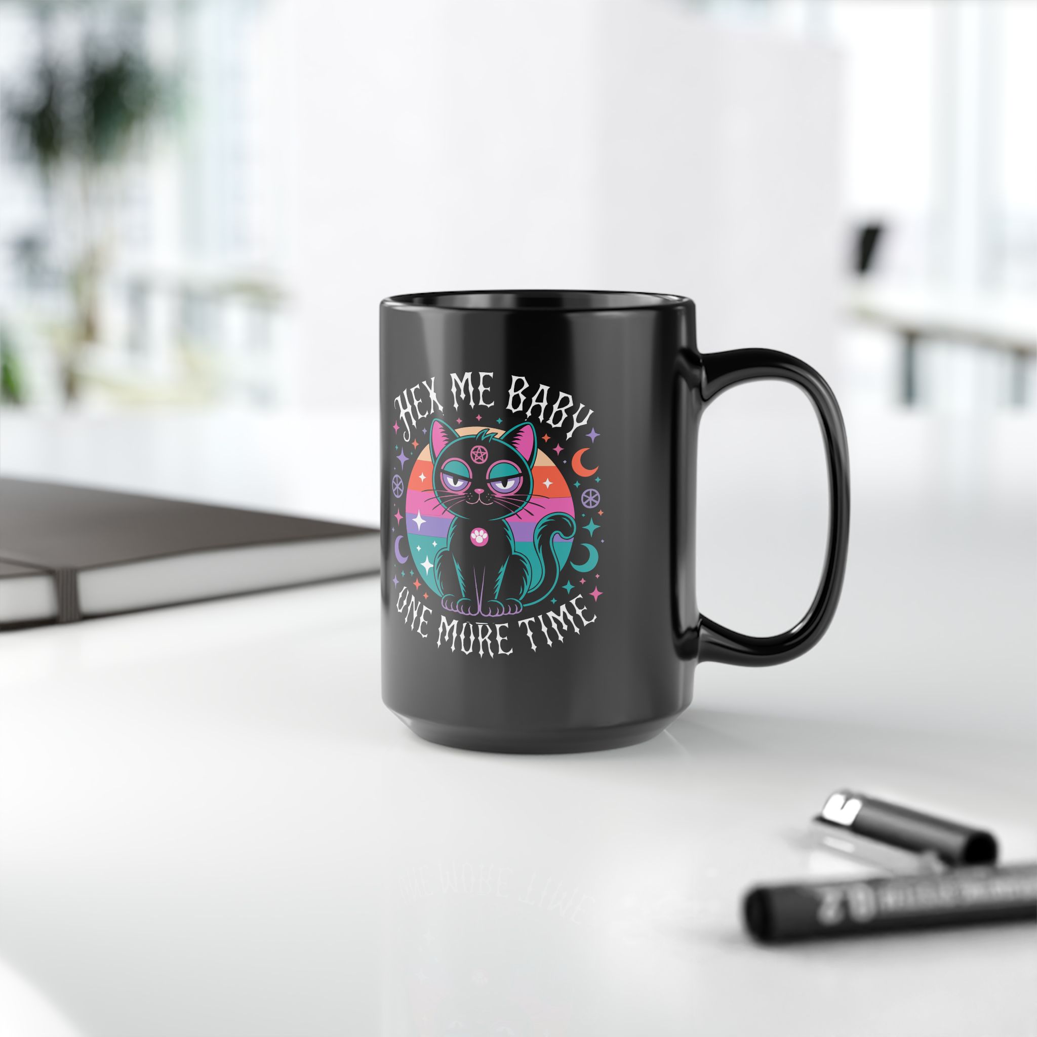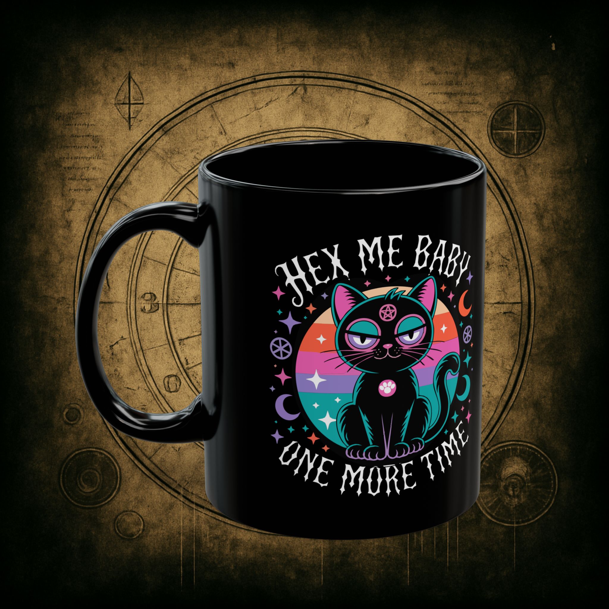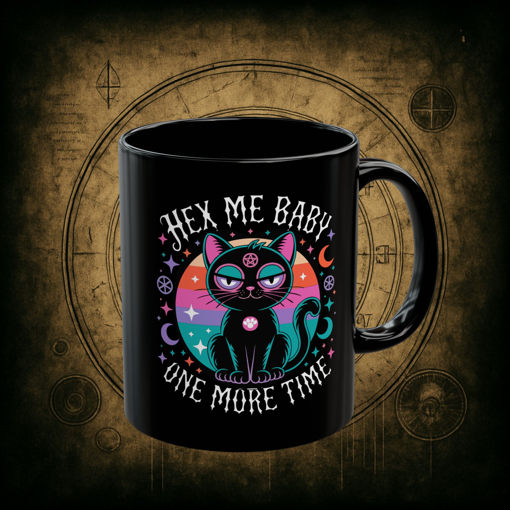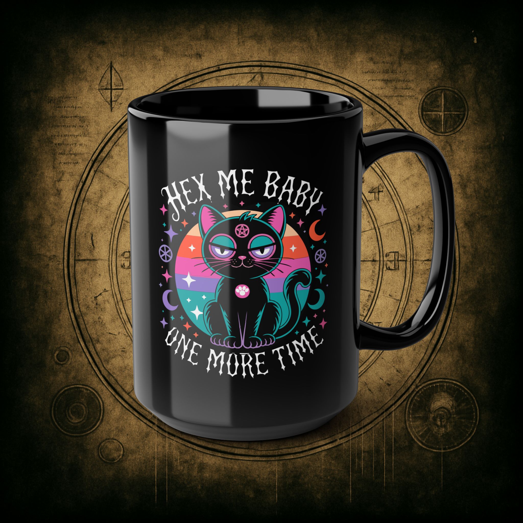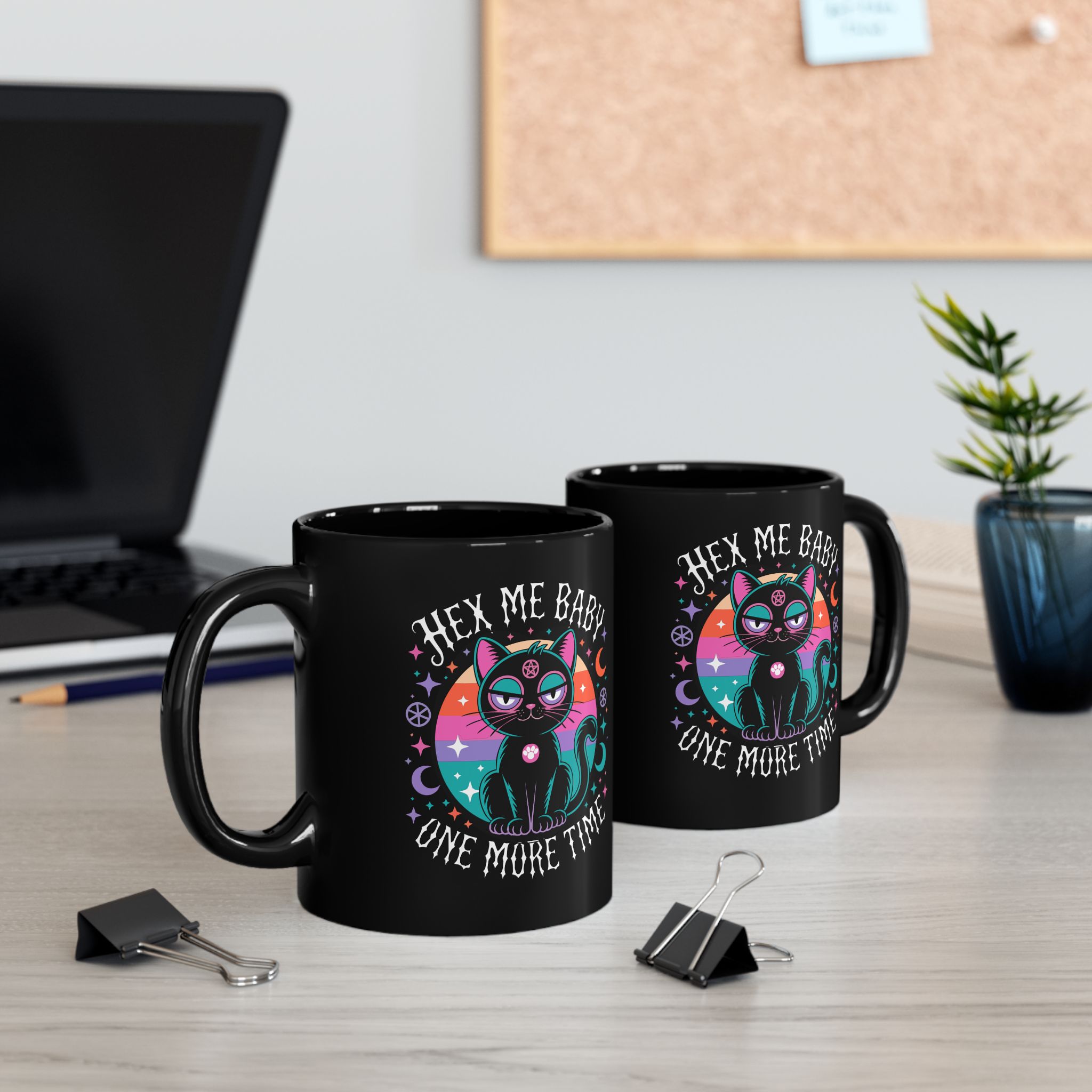 Featuring a sass-drenched black cat, cosmic symbols, and just enough sparkle to be dangerous, this mug is your daily dose of witchy pop power.