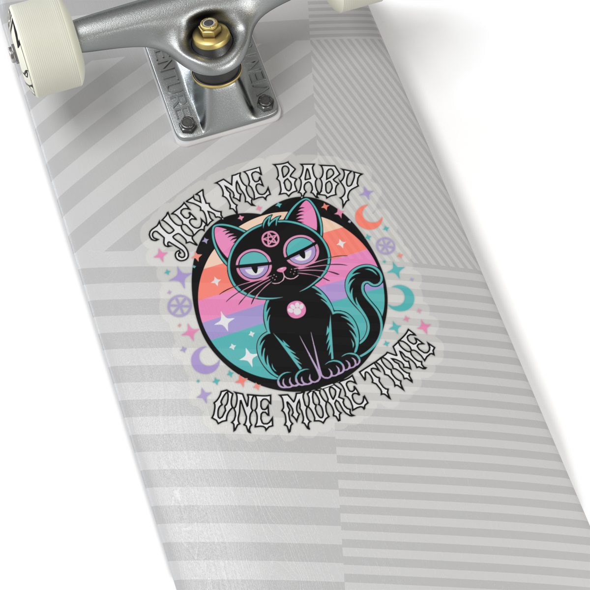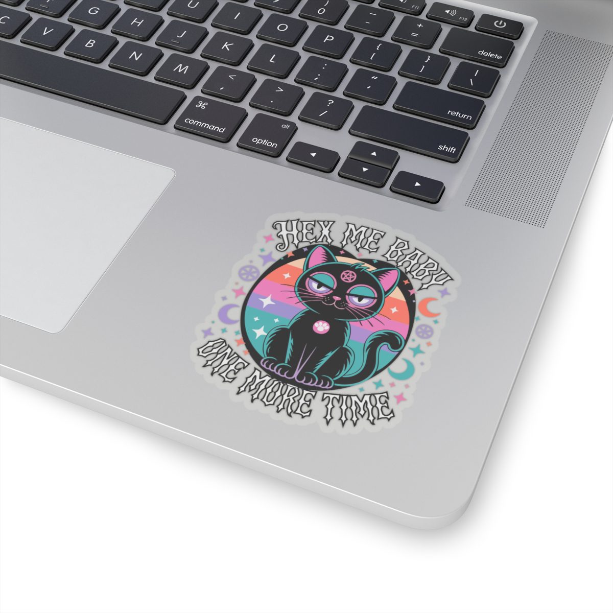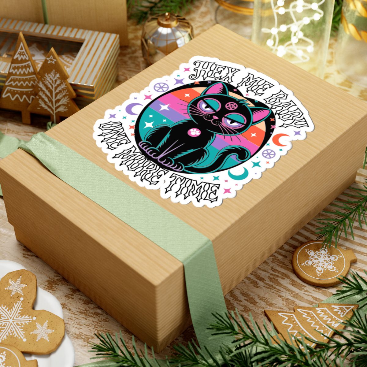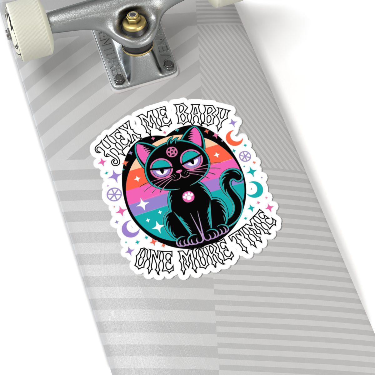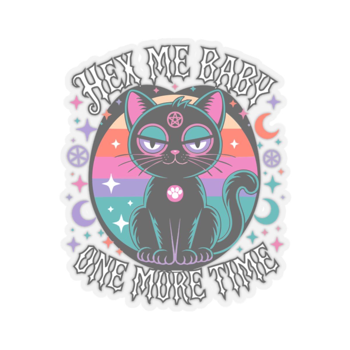 She’s spooky, she’s sassy, and she’s done explaining herself. This cosmic kitty radiates witch pop realness with retro neon flair and a pentacle stare that sees through your excuses. The Hex Me Baby One More Time sticker is for those who love revenge served sparkly, with a side of glittering chaos.