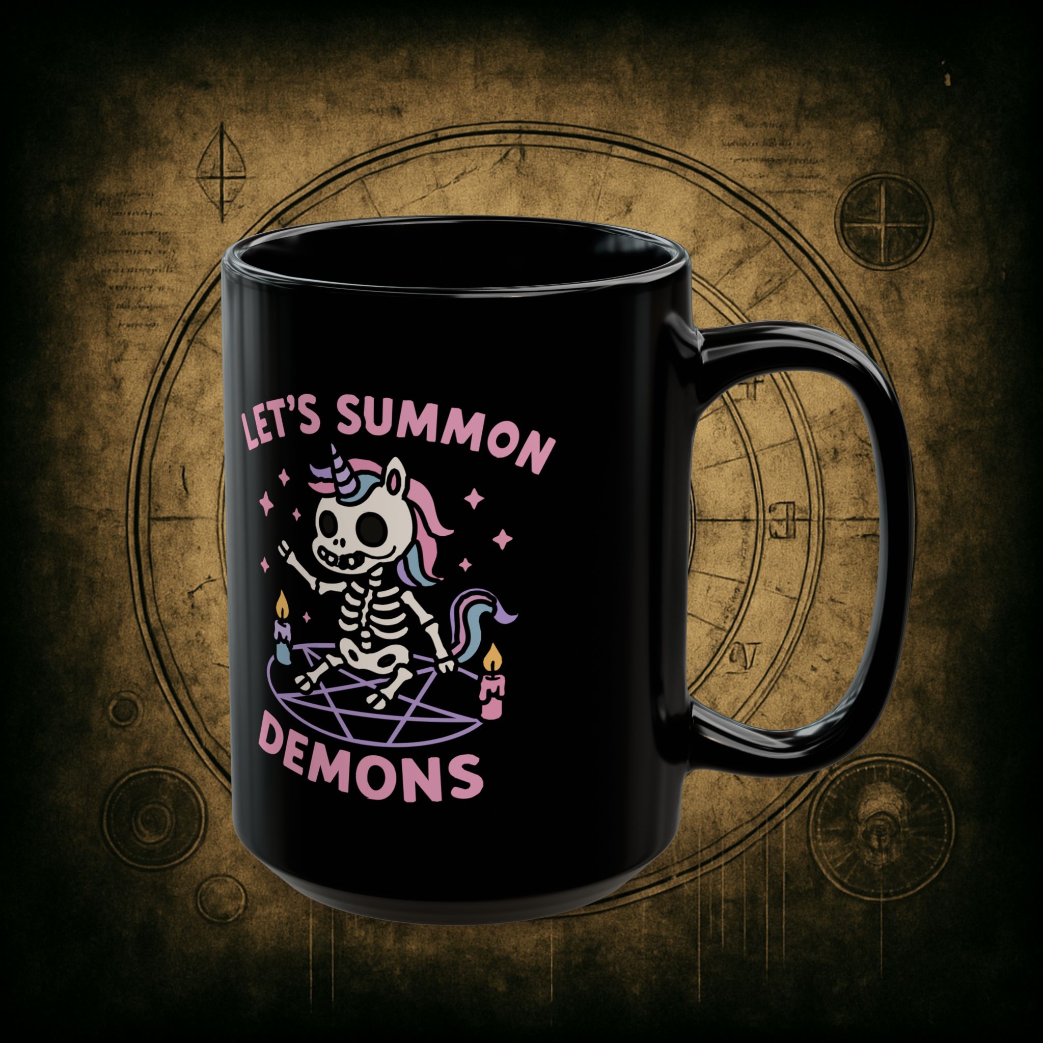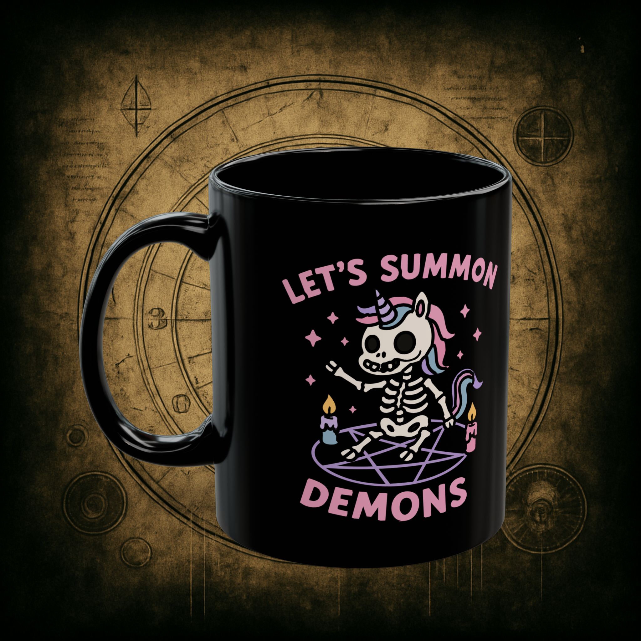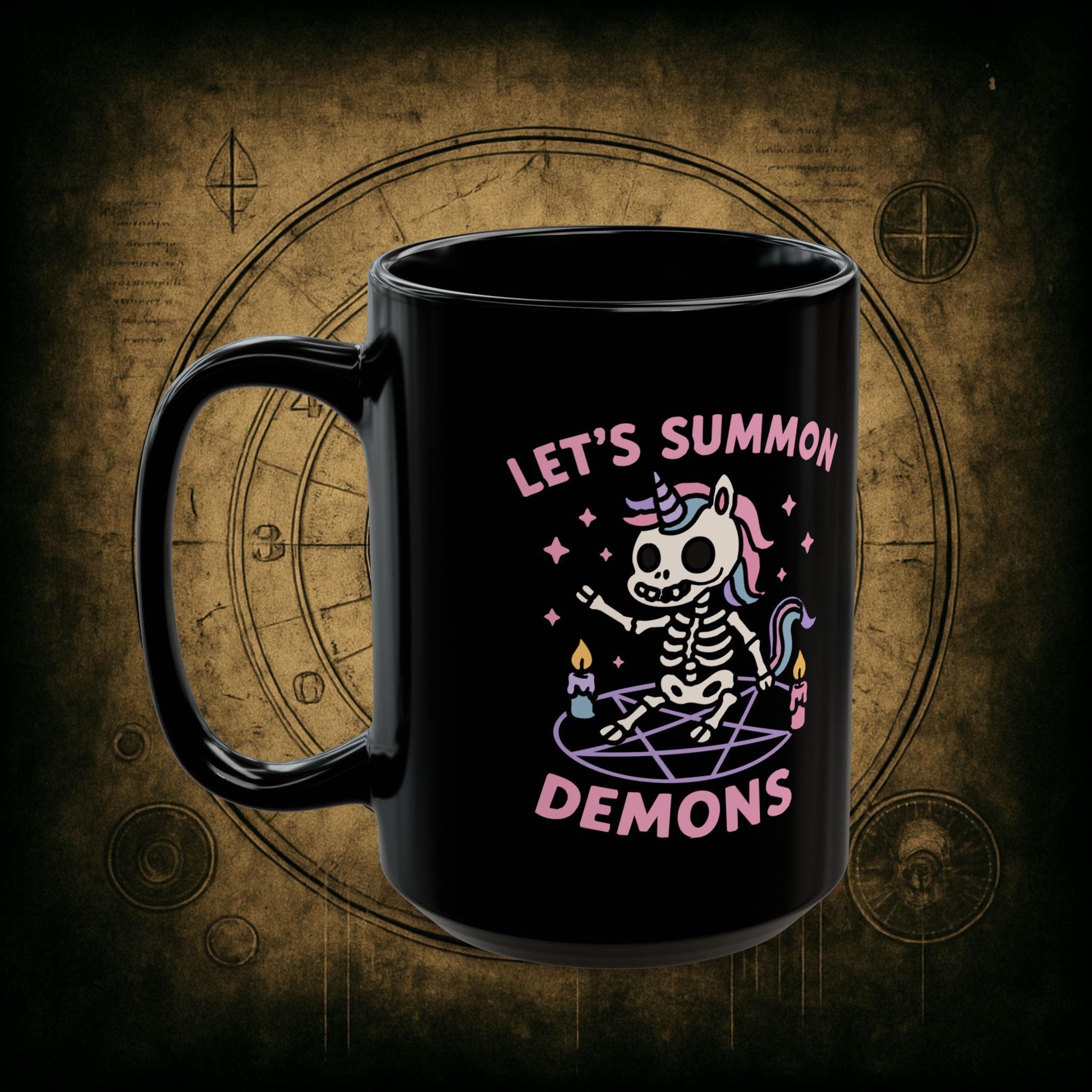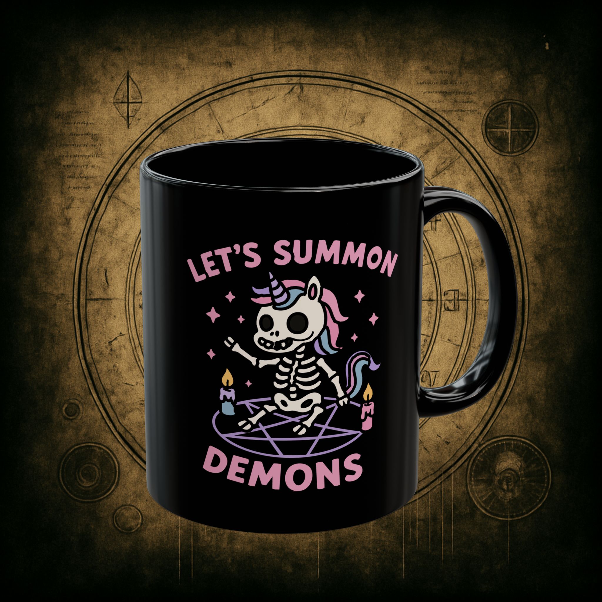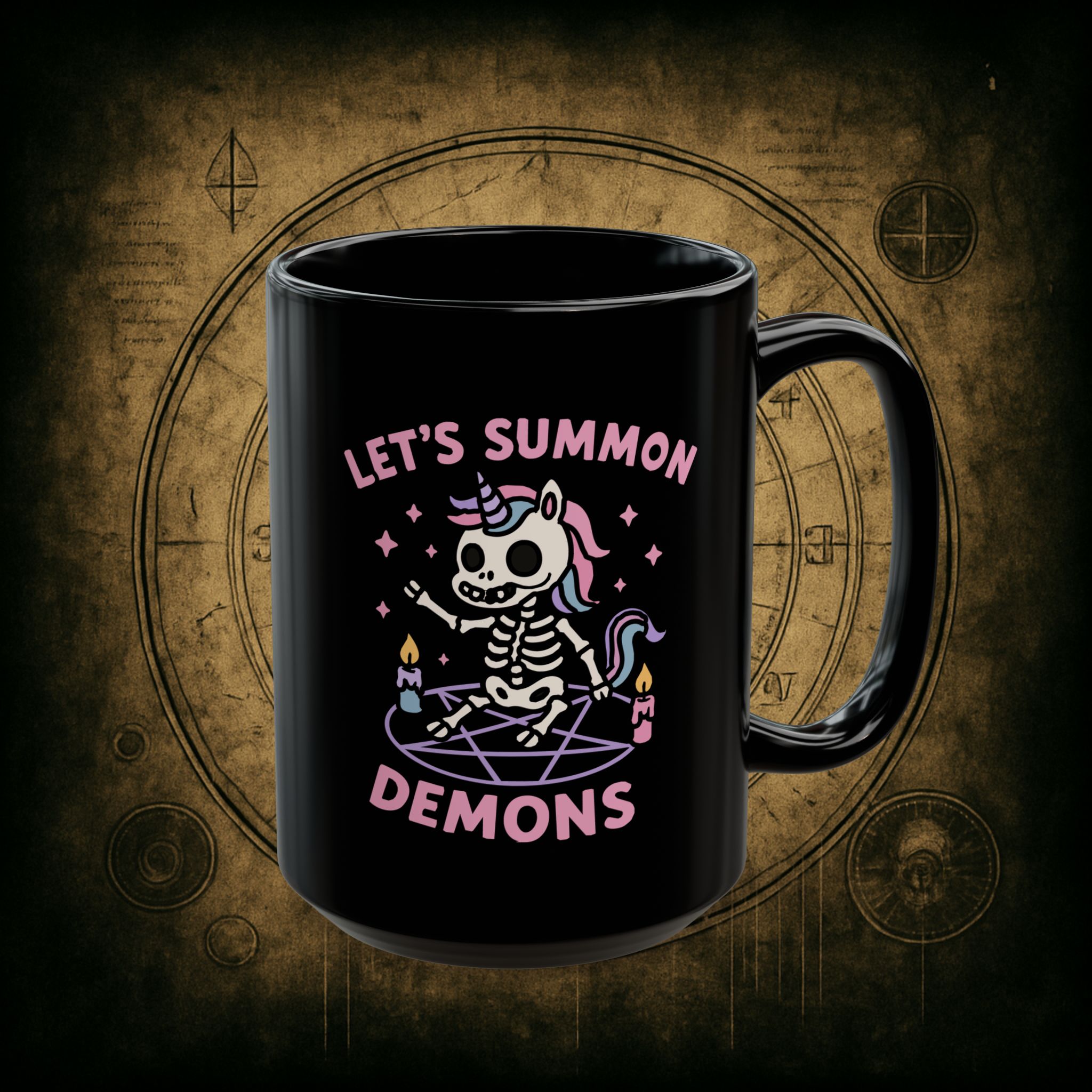 Pastel? Check. Skeleton unicorn? Check. Summoning circle and questionable decisions? Absolutely. This mug is for the cuties who sip pink drinks while conjuring pure chaos with glitter and candlelight.