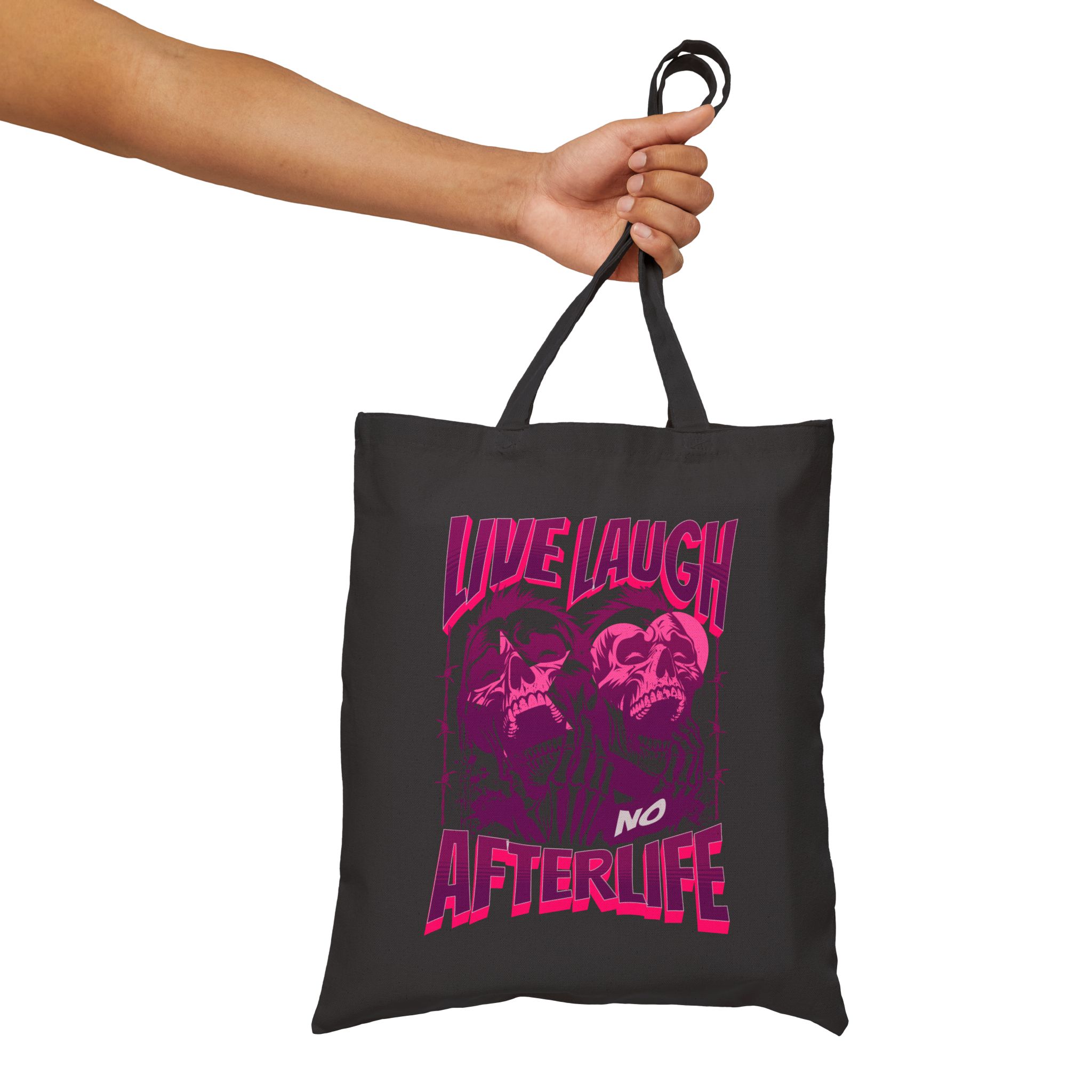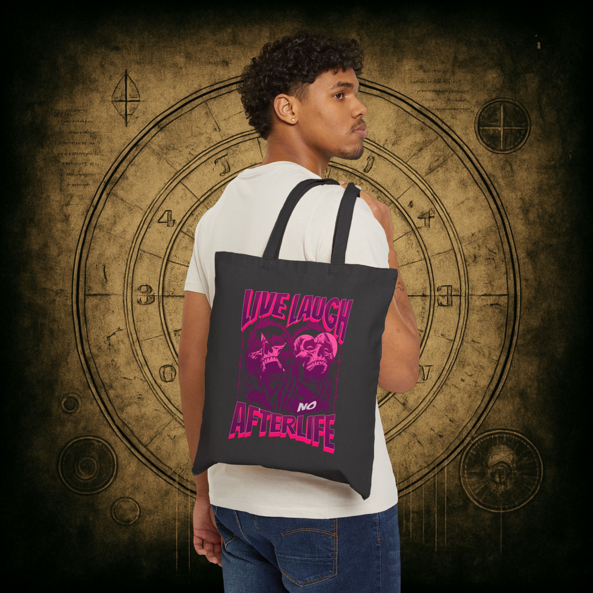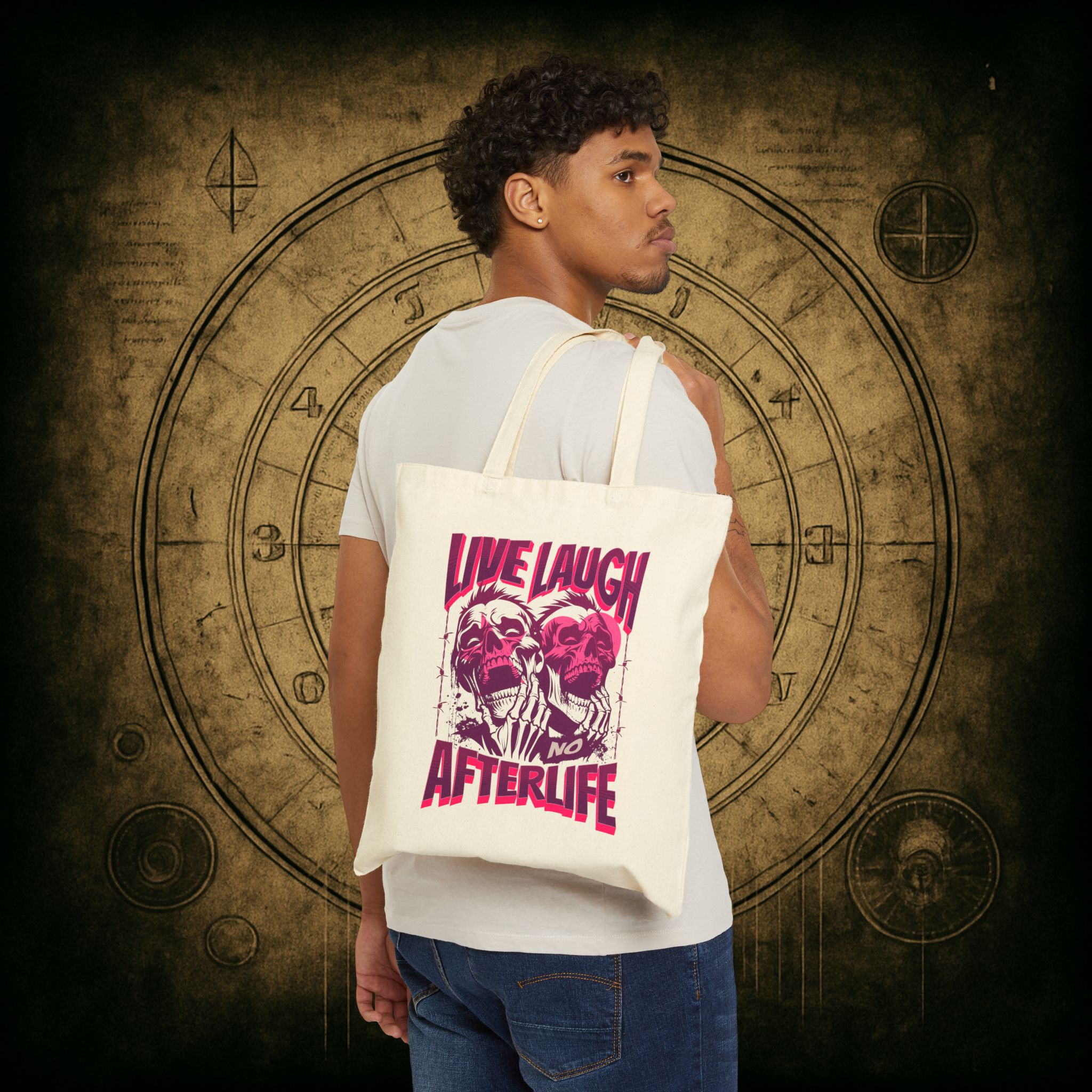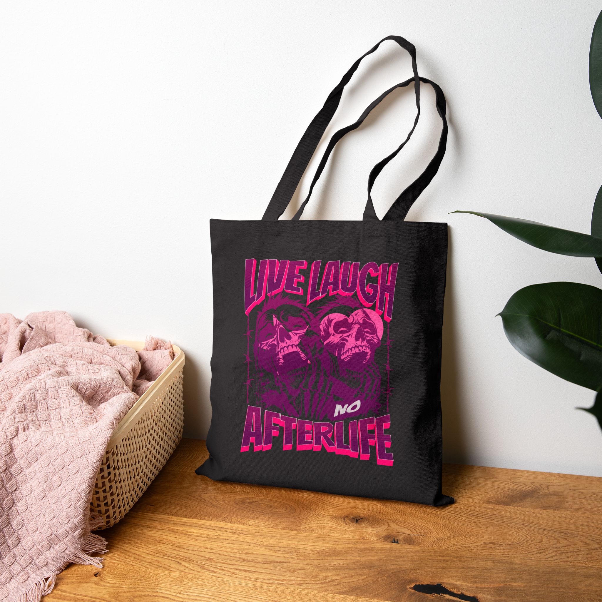 If you’ve ever side-eyed a farmhouse sign and thought, “But make it undead,” the Live Laugh No Afterlife Tote Bag is for you. Featuring neon zombie babes having a truly unholy giggle, this bag is for the snarky souls who know there’s no eternity, just vibes, grave dirt, and bad decisions. Take it to the crypt, coffee shop, or family brunch (if you’re brave enough).