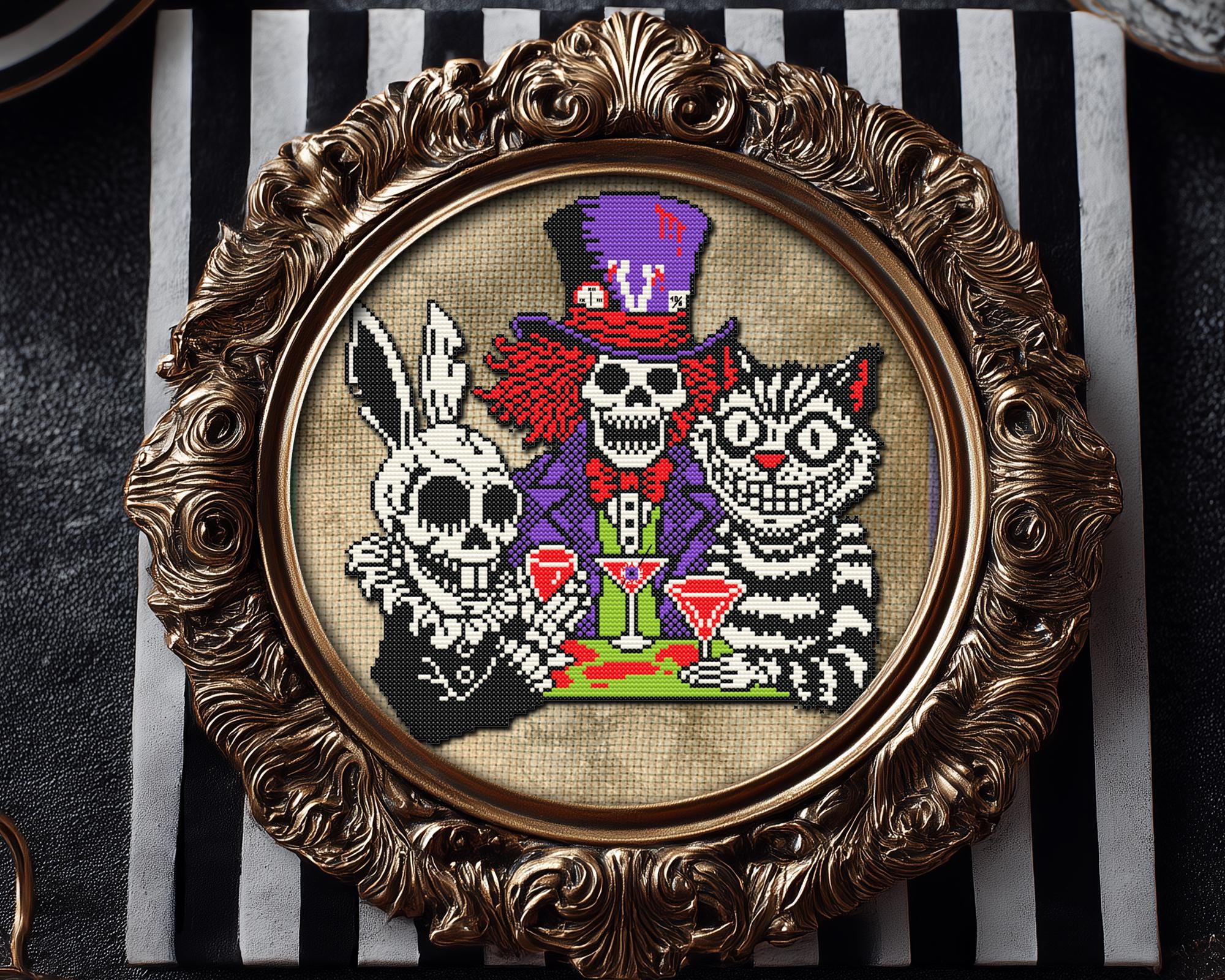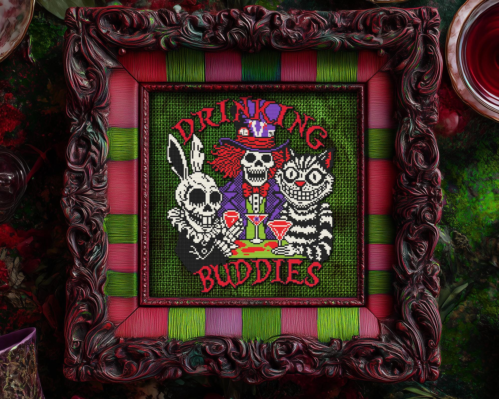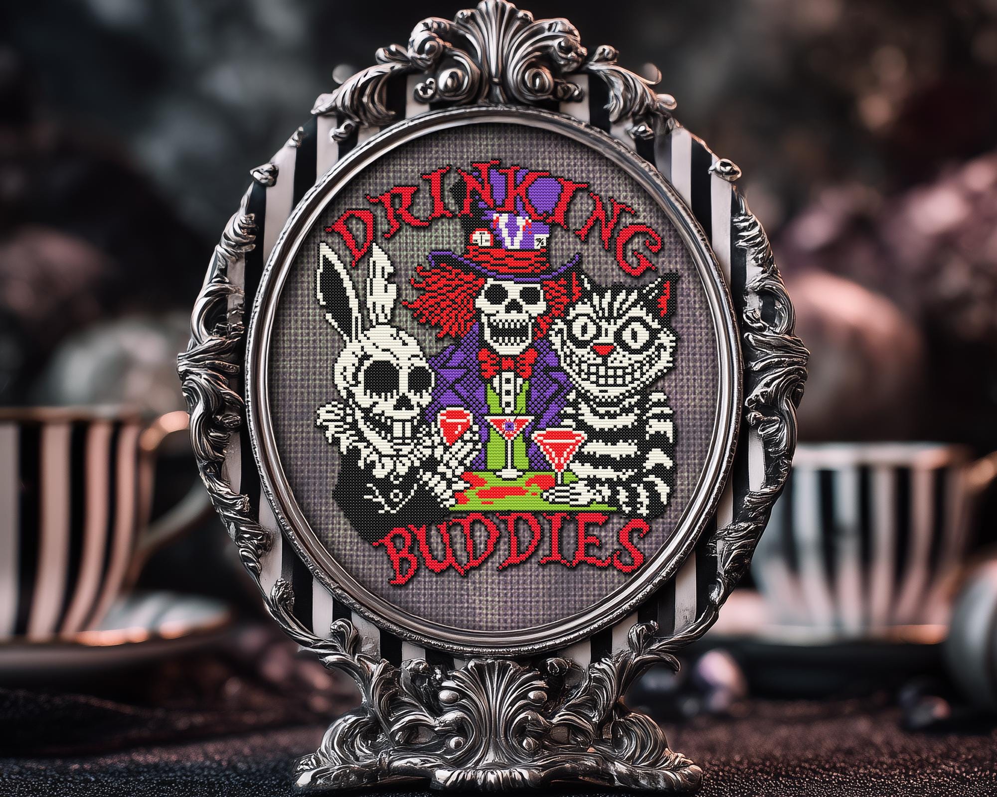 Pattern inc. 3 versions, “Mad Tea Party,” “Drinking Buddies,” or no-text. An Alice cross stitch fever dream steeped in sarcasm and stitched with love. The skull cross stitch details make it gleefully macabre, while the cat cross stitch energy keeps things adorably wicked. So brew your tea (or pour something stronger), summon your inner lunatic, and let this funny cross stitch transport you straight into Wonderland’s after-hours club. Somewhere between a spilled potion and a sugar rush, this gothic cross stitch pattern brings the white rabbit cross stitch to life in full kawaii cross stitch chaos with just the right touch of snarky cross stitch humor. This isn’t your grandmother’s mini cross stitch, it’s an easy cross stitch that’s snarky, bold, and unapologetically mad. 🖤 Now go on, grab your floss and join the madness, because in this xstitch world, we’re all mad for something delightfully dark.