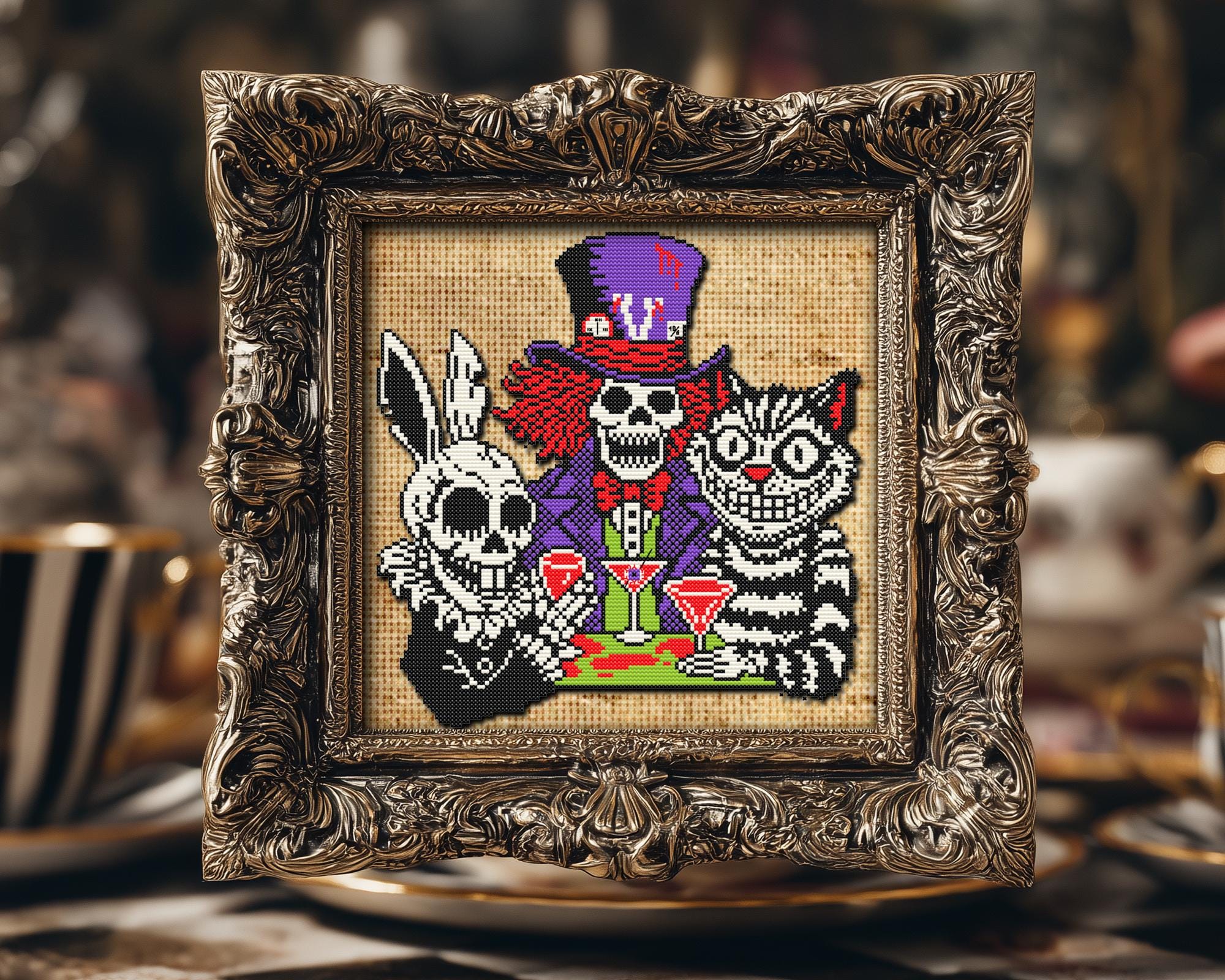 Oh, you thought Alice in Wonderland was weird before? Wait till you crash this Mad Tea Party, a delightfully deranged Halloween cross stitch where the mad hatter, white rabbit, and cheshire cat have traded their teacups for suspicious red liquids and their insanity for style. This is gothic cross stitch chaos at its most delicious, a modern cross stitch adventure dipped in booze and stitched straight from the afterlife. Whether you’re craving a spooky cross stitch, a dash of witchy cross stitch, or full-on occult cross stitch madness, this design’s got your name written in blood-red thread. It’s creepy cross stitch meets dark cross stitch, spiced with a hint of horror cross stitch glam, because even the dead deserve a good party. The Mad Hatter’s smile cracked a little too wide, the Rabbit’s pocket watch long stopped at “now o’clock,” and the cheshire cat cross stitch grinning like he knows your secrets. The twisted charm of this Wiccan cross stitch lies in its whimsical cross stitch vibe, equal parts cute and unsettling, perfect for fans of pastel goth cross stitch who love their patterns a little tipsy and unhinged. You’ll laugh, you’ll shiver, and you’ll probably start wondering if your teapot’s been whispering again.