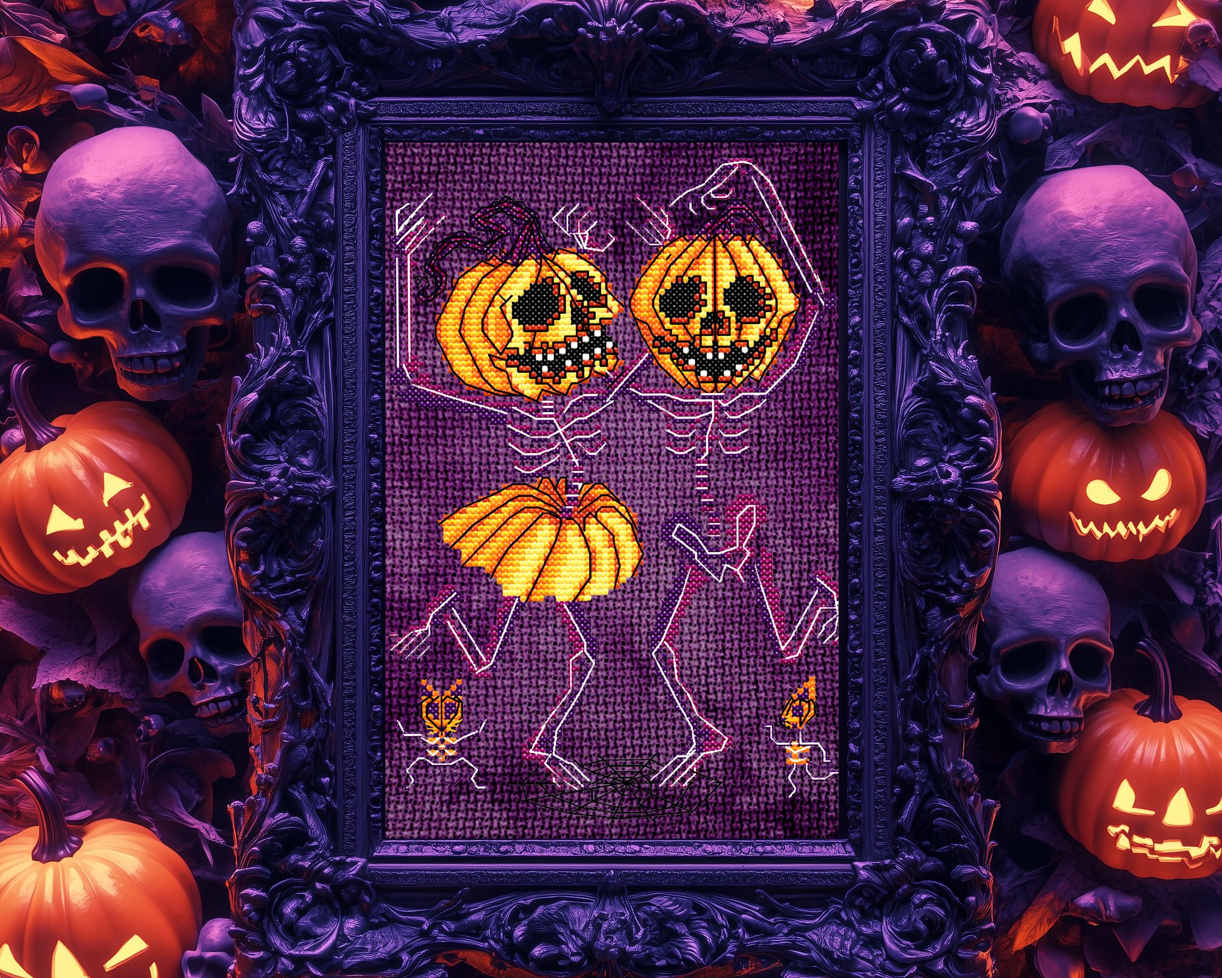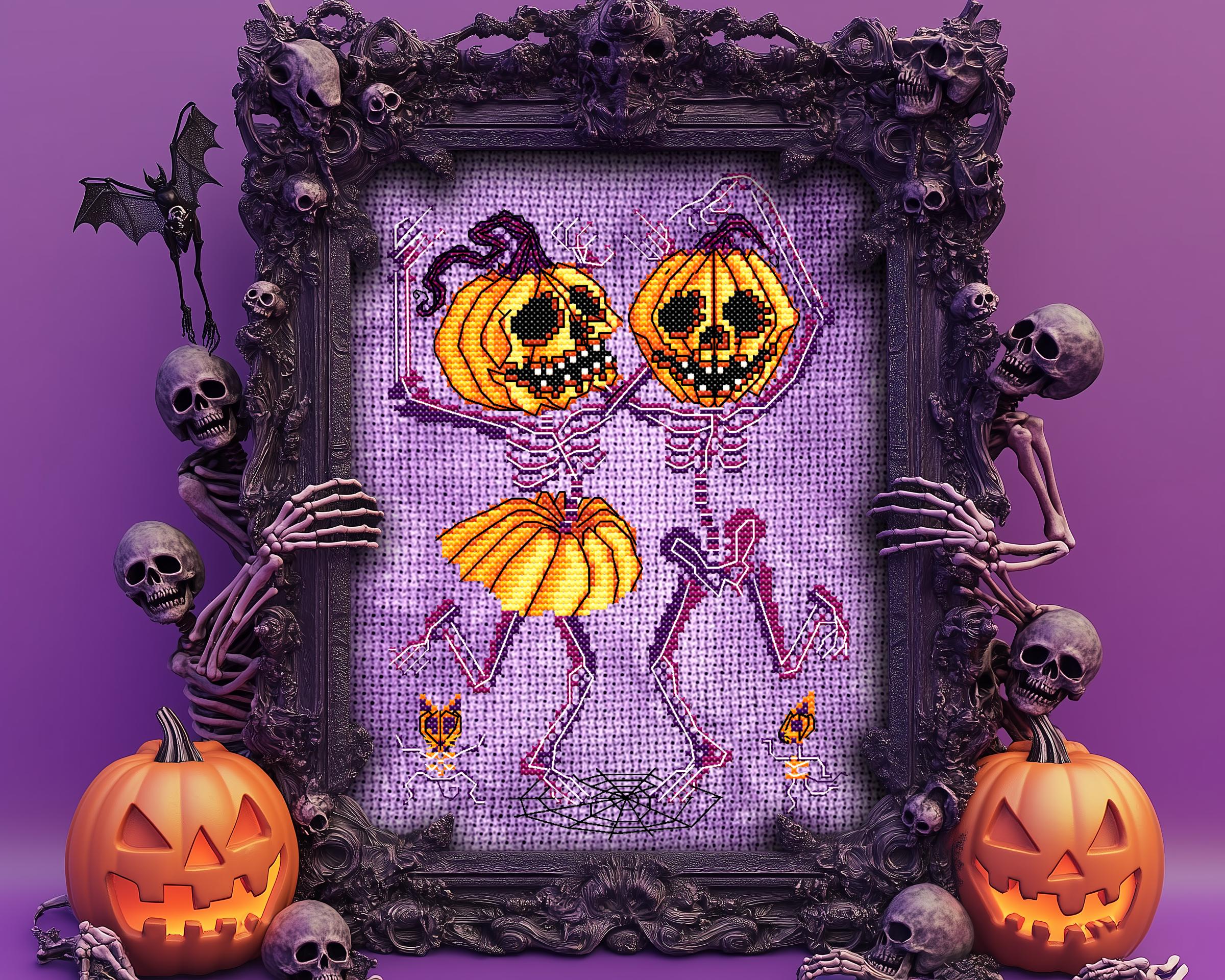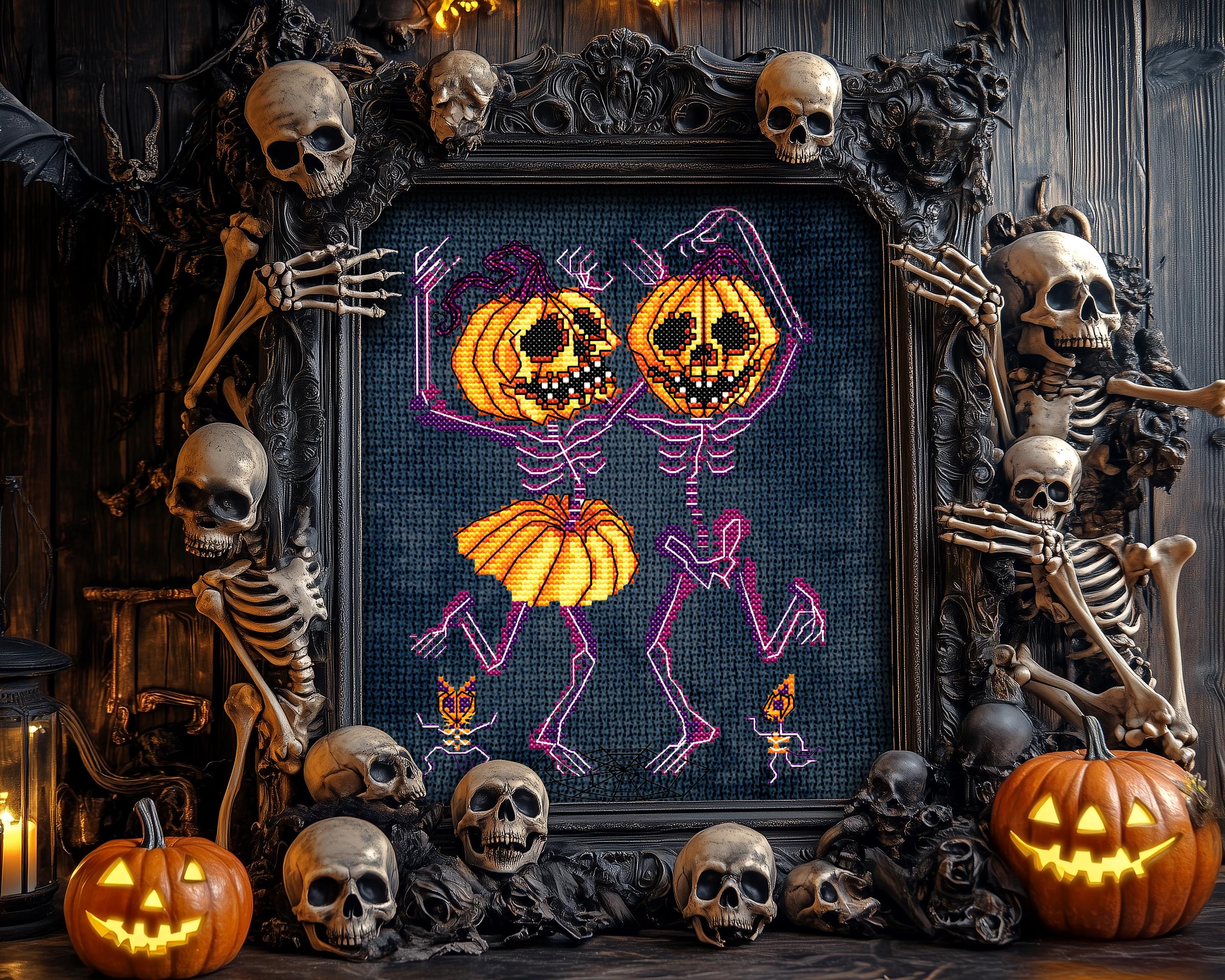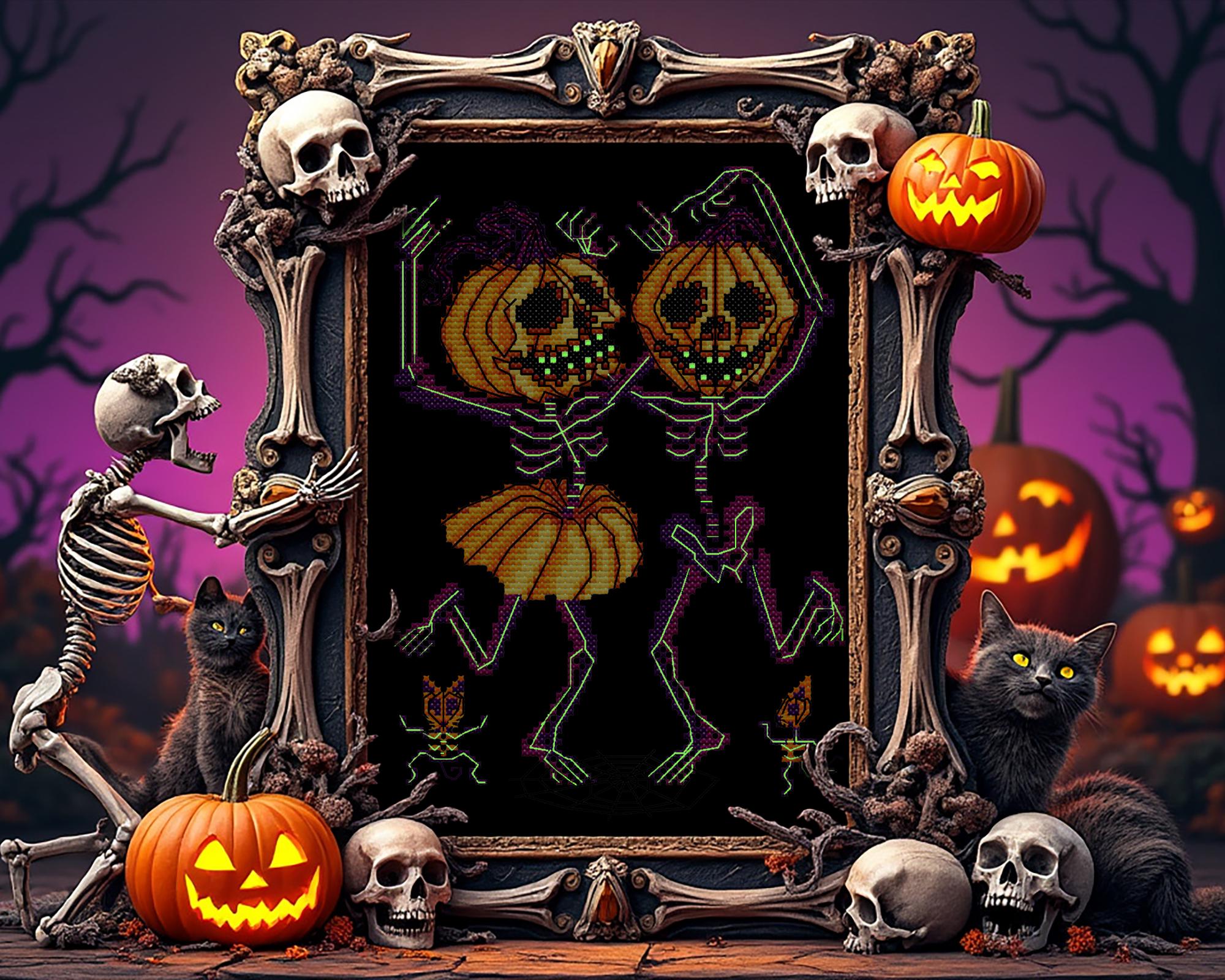Step right into the ultimate Danse Macabre with this gothic cross stitch pattern—the Marroweenies Cross Stitch! Two adorably creepy skeletons, with their glowing white bones, are dancing their way out of the cursed pumpkin patch, celebrating Halloween with their Jack-o-lantern heads held high! Perfect for any Halloween cross stitch lover, this quirky duo will have your stitches glowing in the dark (thanks to glow in the dark cross stitch thread DMC E940) while they perform their witchy cross stitch jig, complete with pumpkin skirts.