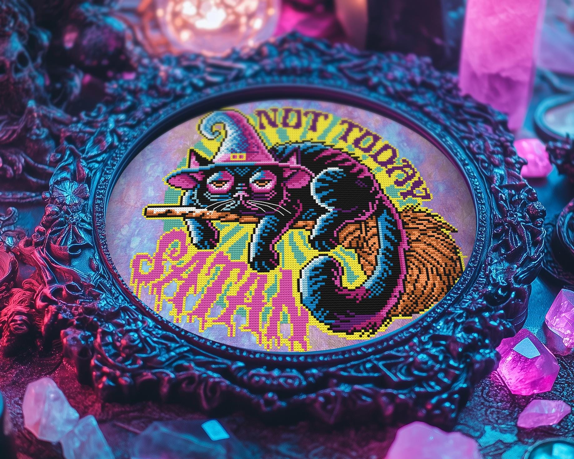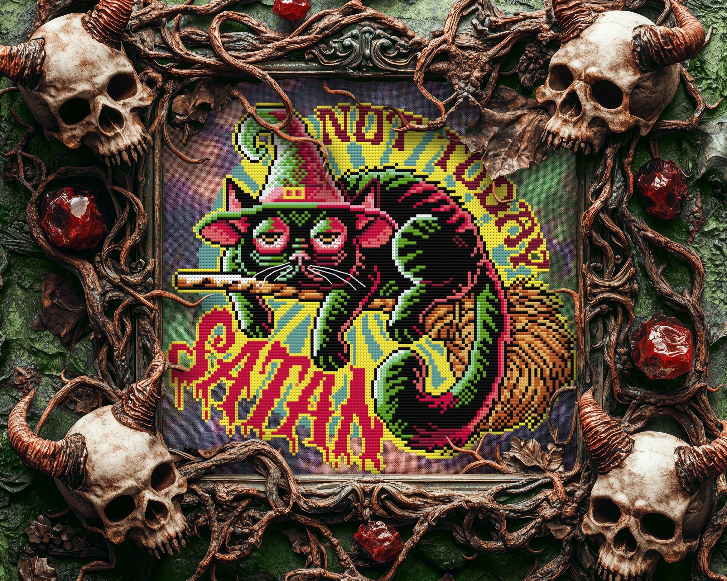 Featuring psychedelic tones, pastel goth pinks, and evil red alternatives (hello, choices!), this creepy cross stitch pattern is perfect for rebellious stitch witches with a love for edgy art. Bonus: Its background-free witchy cross stitch design lets you summon it on any fabric your dark heart desires, from hand-dyed aida to classic black. With just 12 DMC colors and a whole lot of black cat charm, this horror xstitch gem will be your new familiar in the art of crafty rebellion.