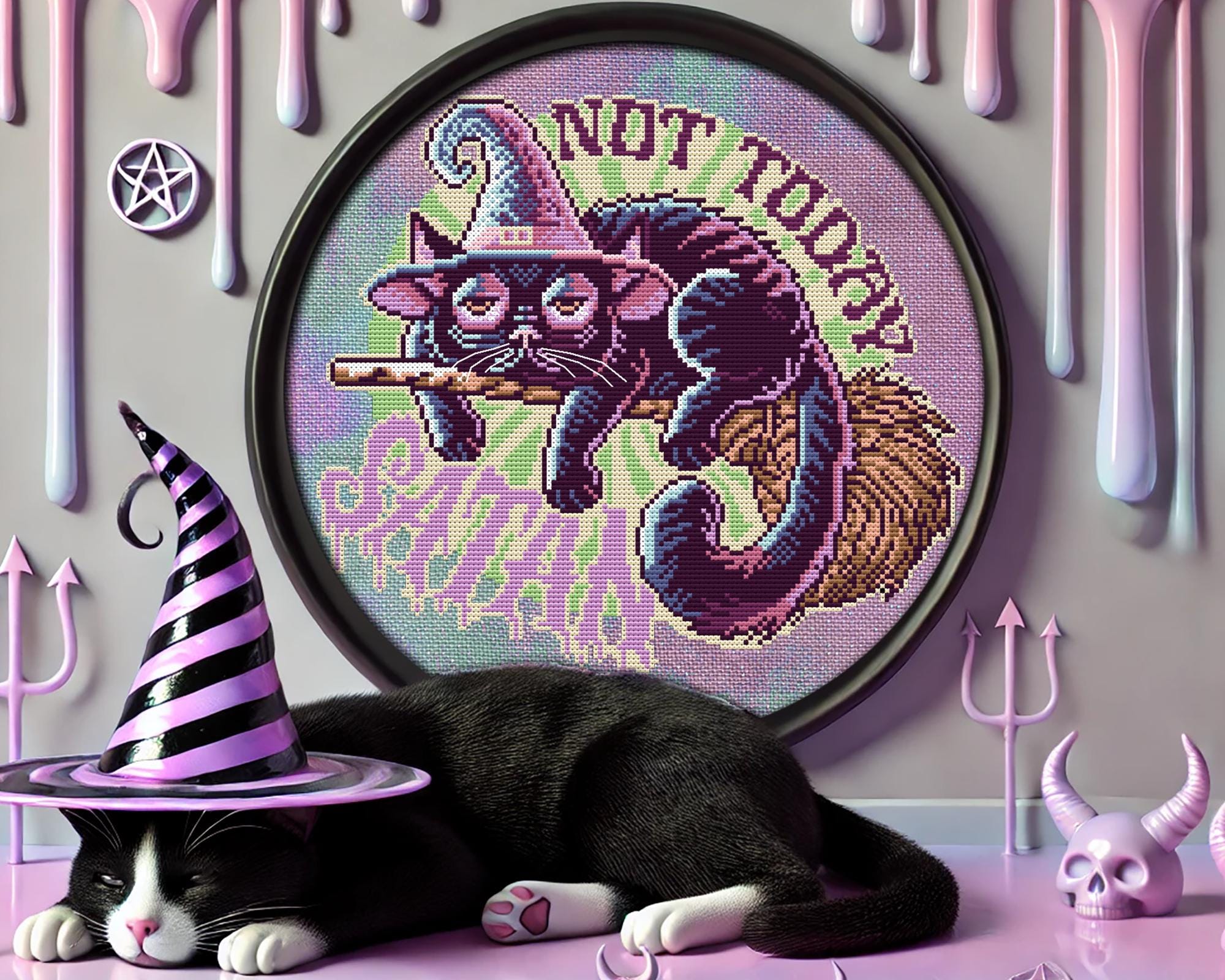 Ever had one of those days where even your inner demon gets put on snooze? This witchy black cat cross stitch pattern is here to tell you that sometimes the best spell is procrastination. Draped lazily on its broomstick, with those pastel goth cross stitch vibes and Not Today, Satan sass, this occult cross stitch masterpiece will have you cackling as you stitch. Whether you’re channeling spooky cross stitch magic, indulging in kawaii cross stitch flair, or fully embracing dark humor cross stitch, this modern cross stitch design is here to help you shirk all evil cross stitch responsibilities in style.
