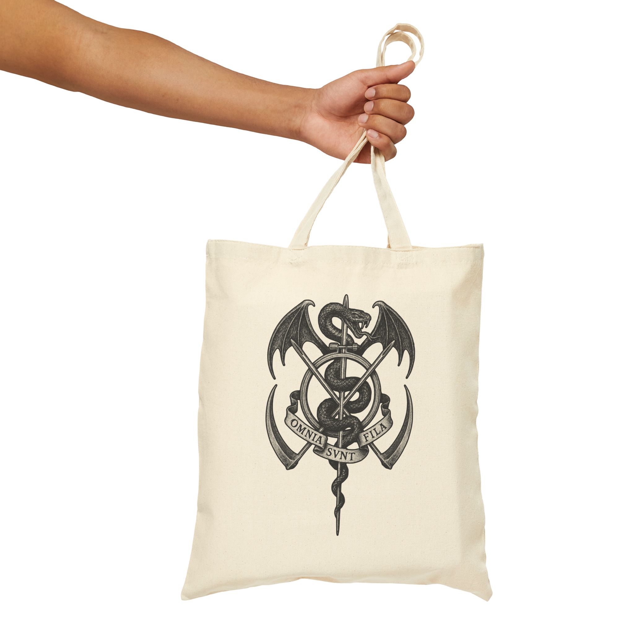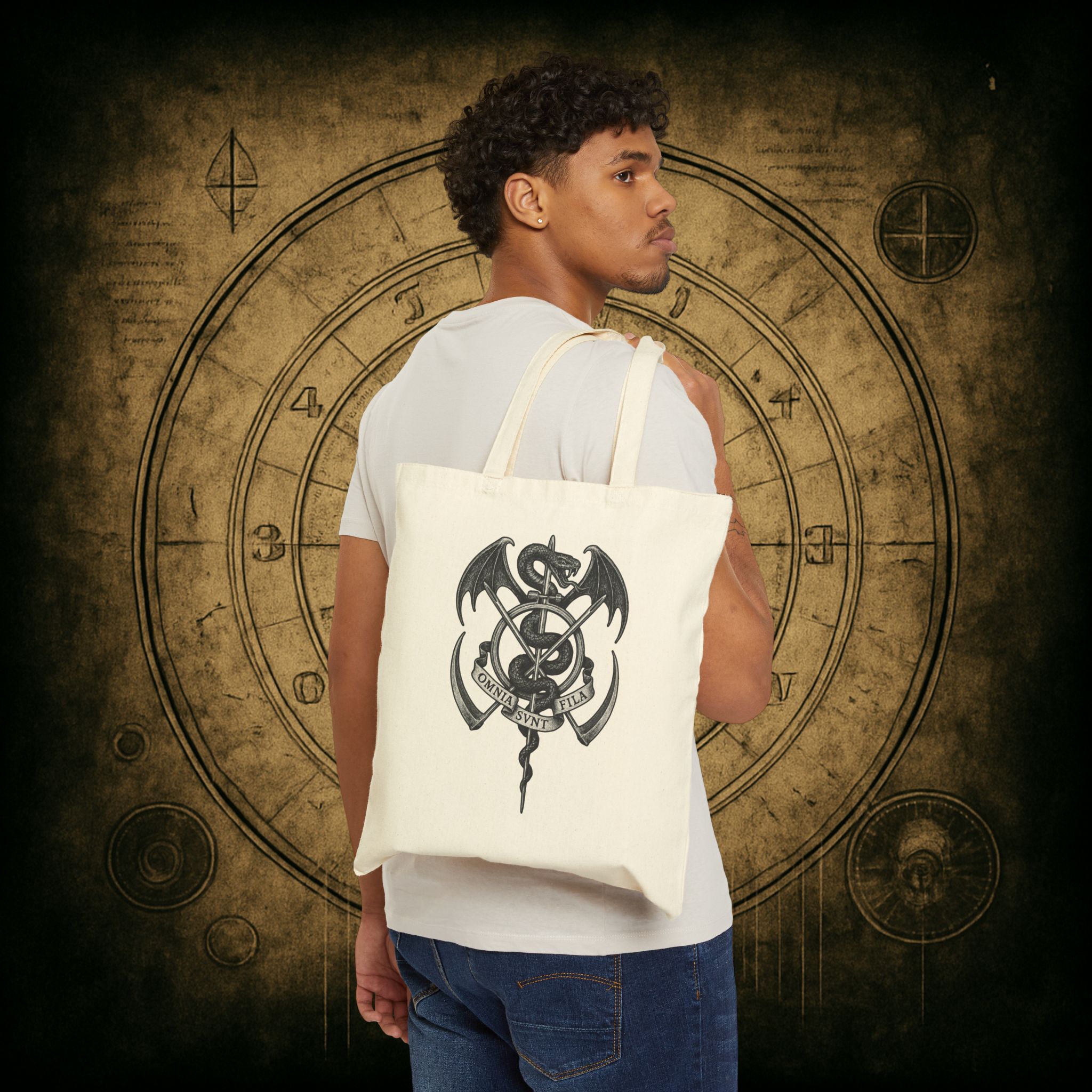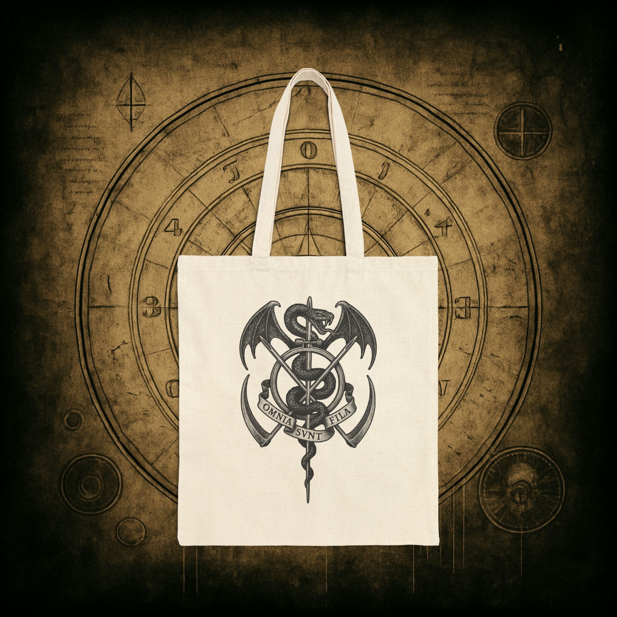 Step aside, basic bags, this one speaks Latin and breathes fire. The Omnia Sunt Fila Tote Bag is forged for those who know every thread is fate, and every errand is a quest. With its sigil of blades, serpents, and wings, this bag is equal parts prophecy and practicality.