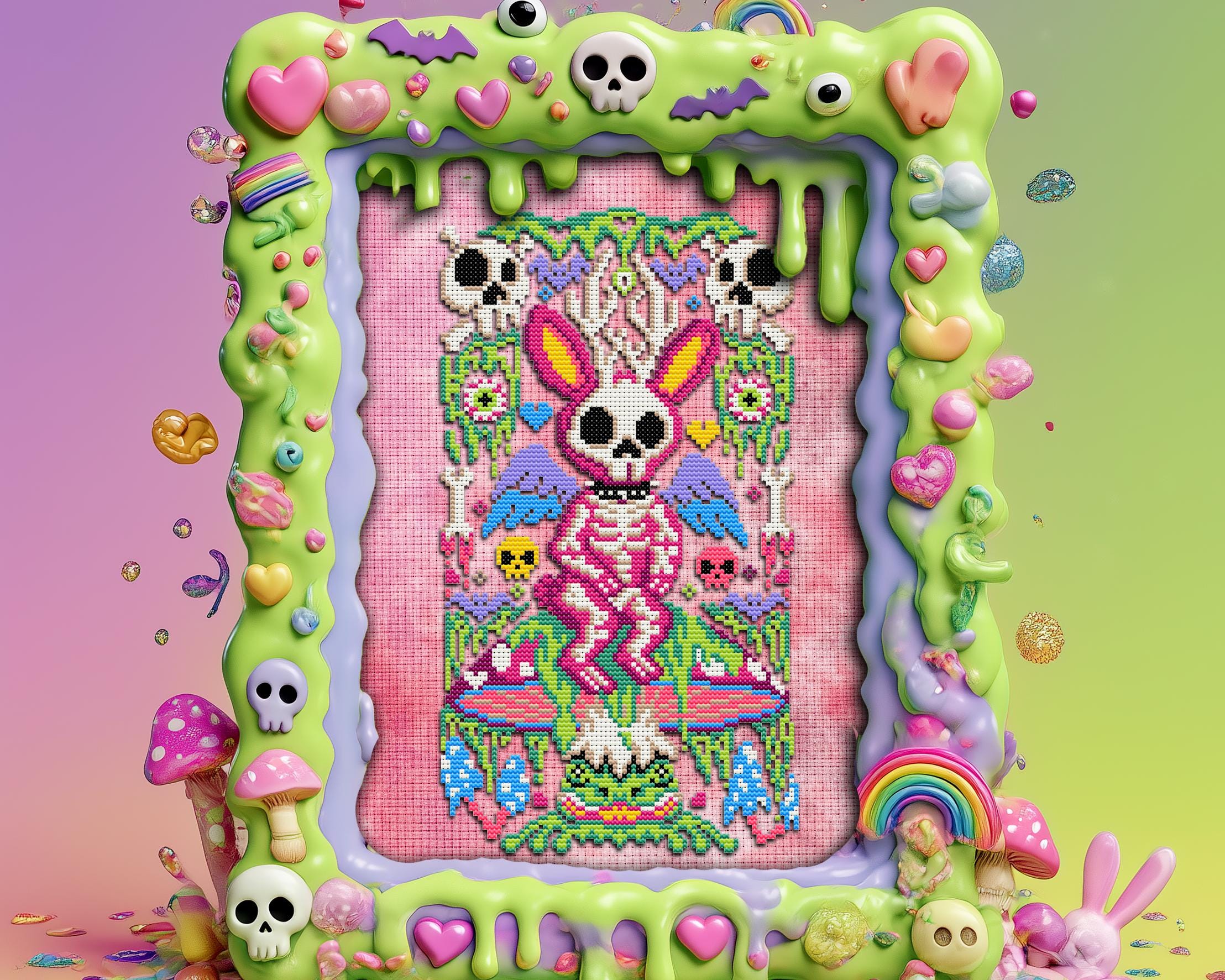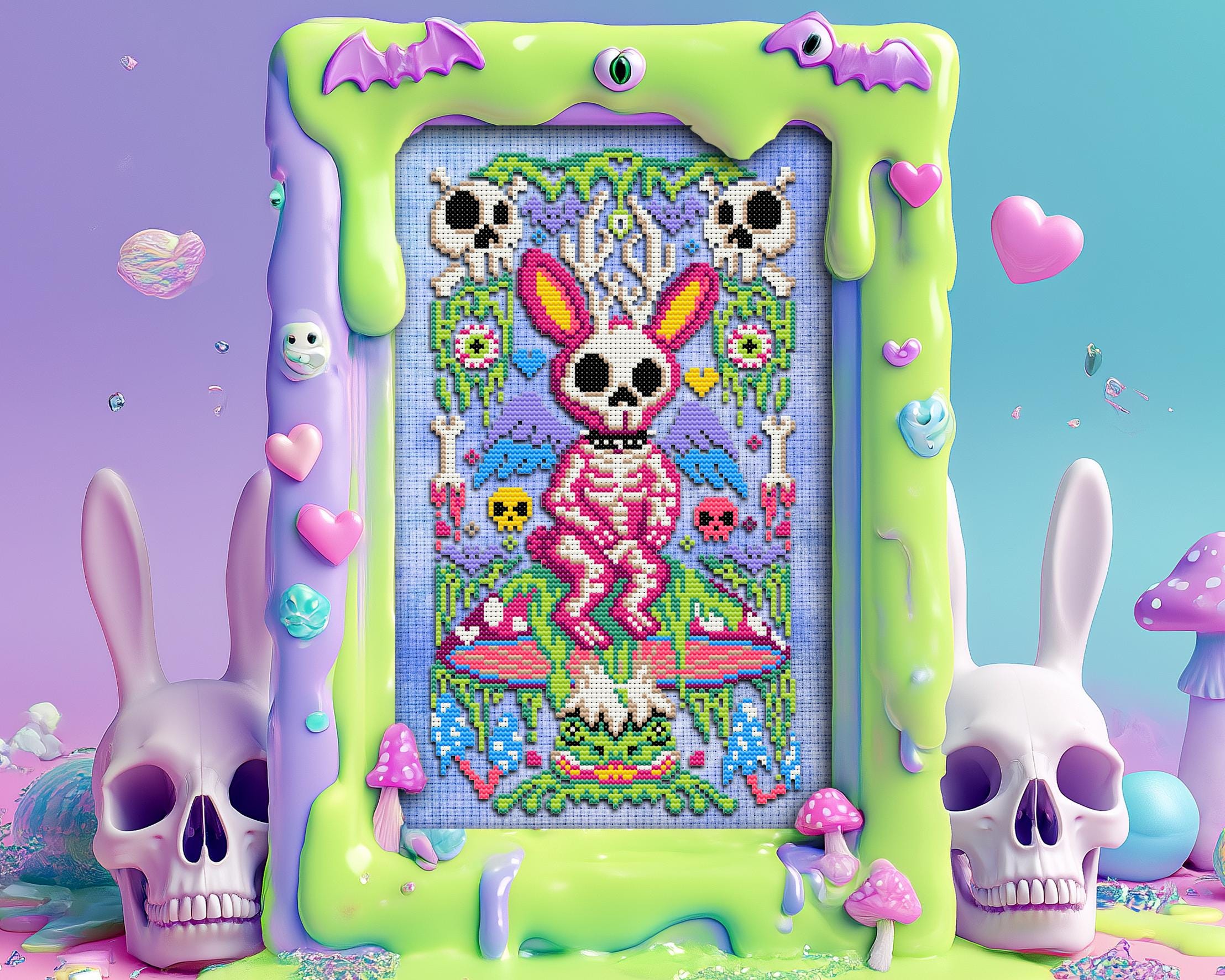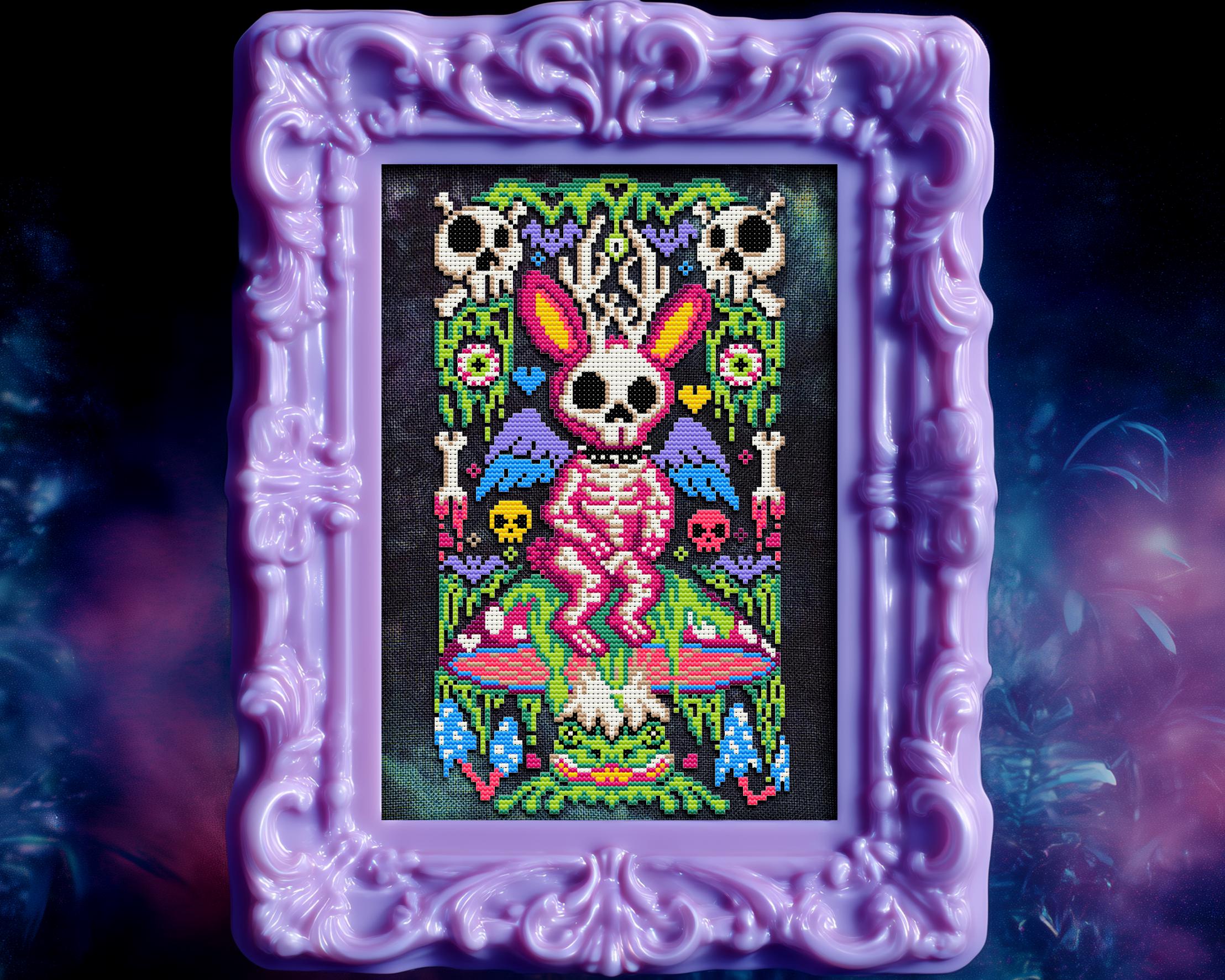 Our pink skeletal jackalope showed up wearing a spiked choker, sprouted seraphim wings, and flopped onto a slime-dripping magic mushroom like it owns rent, never mind that the mushroom is… um… blooming straight out of a very opinionated frog’s head. The background throws bones, flowers, and skulls like confetti, so yes, this absolutely scratches your skull cross stitch itch while radiating bubblegum mischief for hardcore pastel goth cross stitch lovers. It’s got baby-baddie proportions with a wicked wink toward jackalope cross stitch, the sugar-rush charm of kawaii cross stitch, and that sly grin that whispers “boo, but make it couture,” which makes it the cheekiest cousin in your halloween cross stitch rotation. 🐸✨