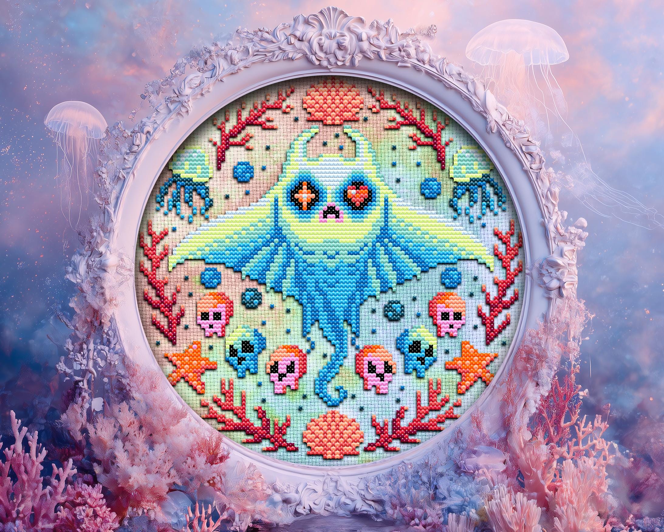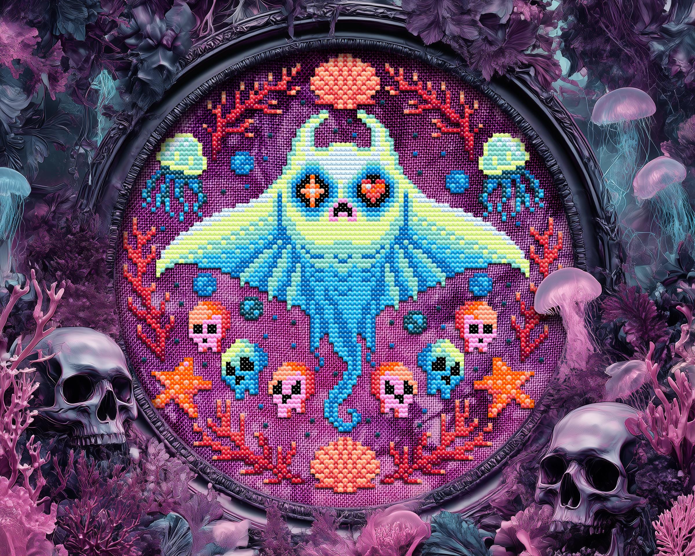 Deep in the neon abyss, this gothic cross stitch creature drifts like it owns the underworld of Atlantis, meet the Spectral Manta Ray, the sassiest sea phantom to ever haunt your hoop. This is no ordinary Halloween cross stitch pattern, it’s a delirious mash-up of modern cross stitch madness, tangled coral catacombs, rainbow skulls grinning from the depths, and glowing jellyfish floating like spectral disco balls. If you’ve ever wanted your stitching to feel like a séance under the sea, this gothic cross stitch pattern is it, equal parts spooky cross stitch, witchy cross stitch, occult cross stitch, and unapologetically creepy cross stitch with a pastel goth sugar rush. Think of it as an oceanic fever dream where every stitch pulls you deeper into a horror cross stitch fairytale, a dark cross stitch dive, a Wiccan cross stitch ritual, and an otherworldly xstitch obsession you didn’t know you needed. Our glowing manta ray isn’t just moody, it’s got heart-eyes, literally, because nothing says romance like staring into the abyss and seeing it stare back. Surrounded by coral that looks like it’s plotting something sinister, and skulls that look way too happy to be dead, this design slips between jelly fish cross stitch, cute cross stitch, and whimsical cross stitch territory, while still keeping its pastel goth cross stitch edge sharp as coral. It’s the kind of ghost cross stitch that makes you wonder if Poseidon’s been dabbling in necromancy, the kind of witch cross stitch that makes you giggle at your own morbidity, and the kind of funny cross stitch that’s also secretly a snarky cross stitch, like, “Sure Karen, let’s put a manta ghost with starfish eyeball minions in the living room, what could possibly go wrong?” If you’re craving a skull cross stitch with summery undertones, a summer cross stitch that doubles as a sea cross stitch, or just want something gloriously unhinged to keep your needle dancing, this pattern will have you cackling at your hoop. It’s bright, it’s bizarre, it’s doom in technicolor, and trust me, the abyss has never looked this cute