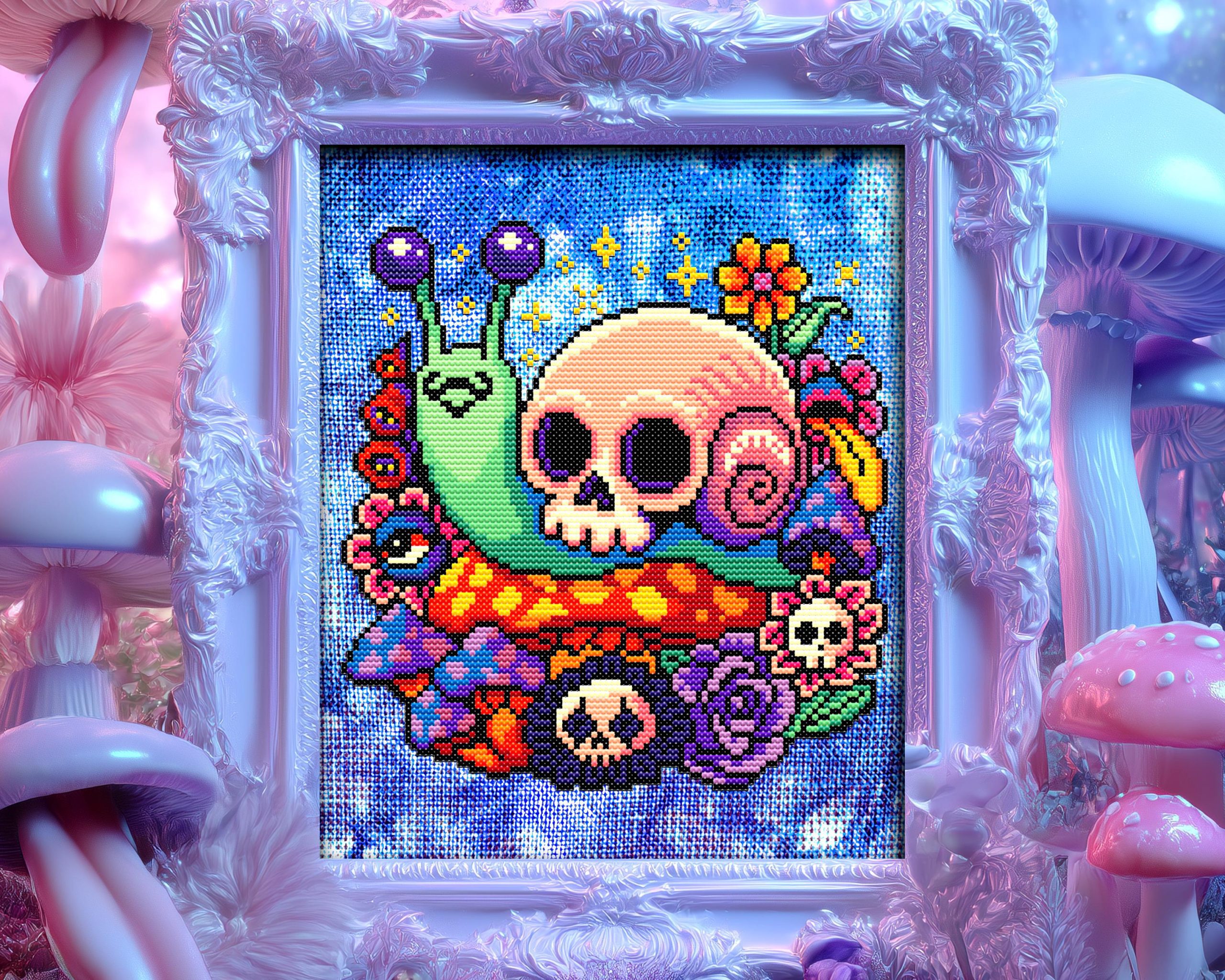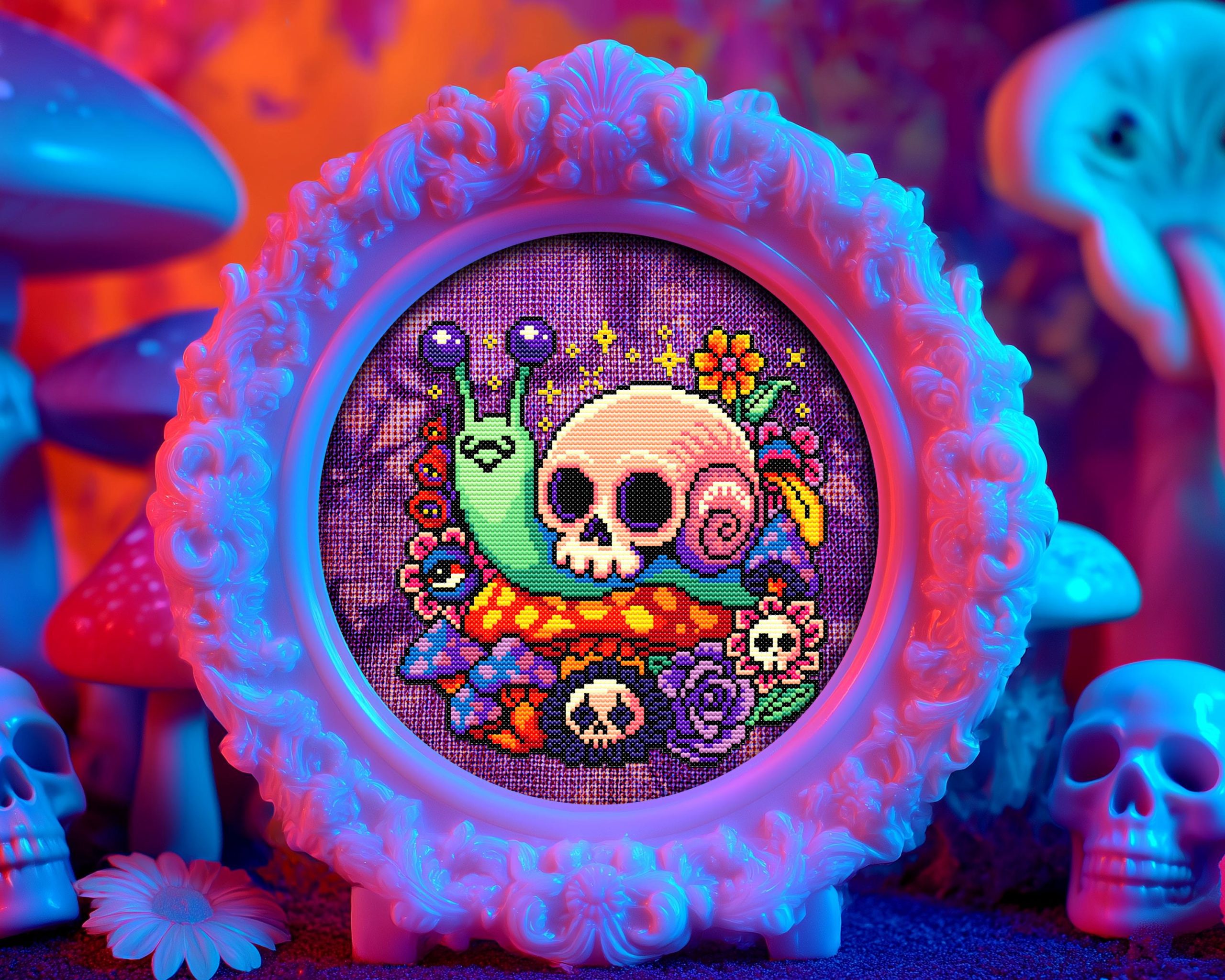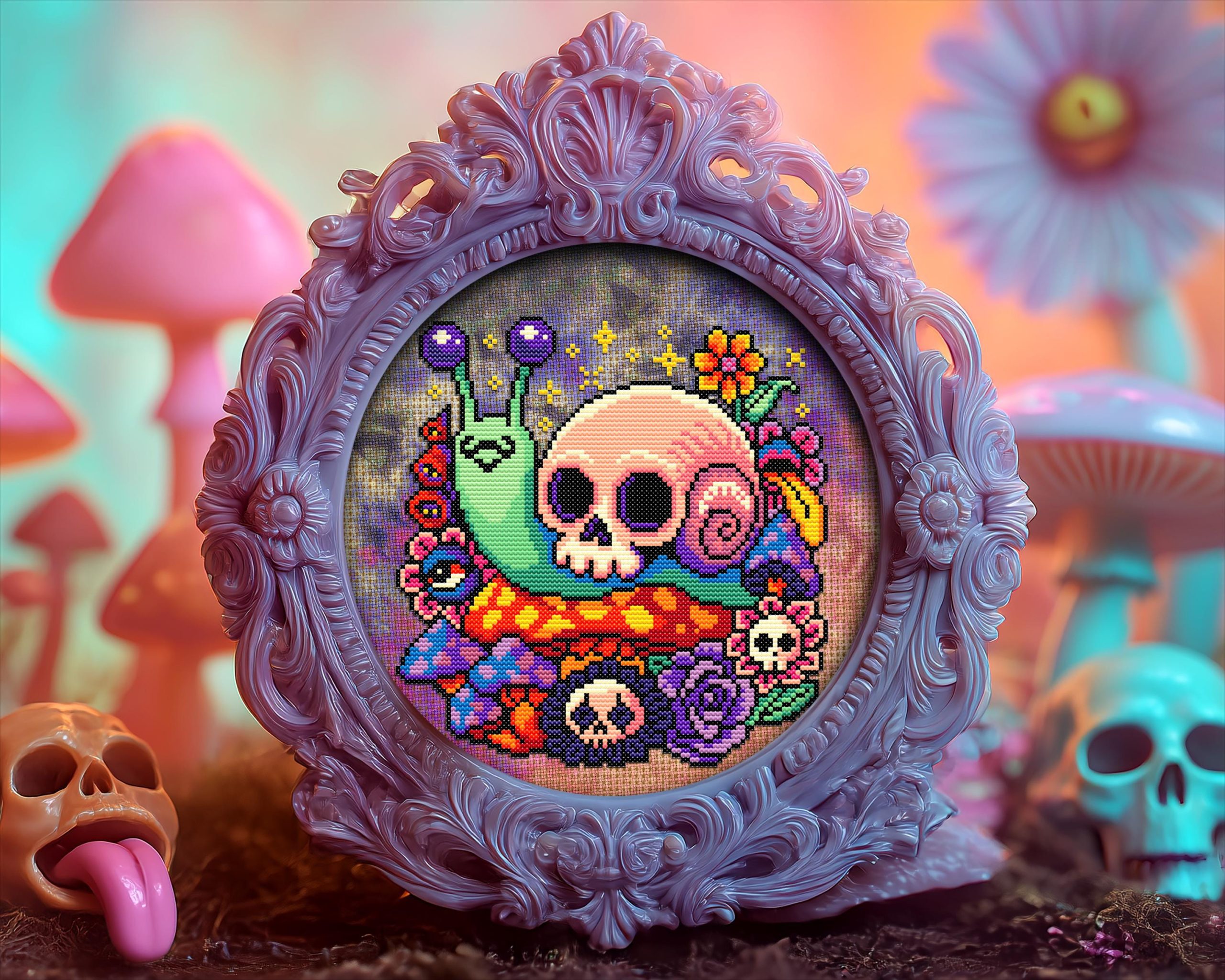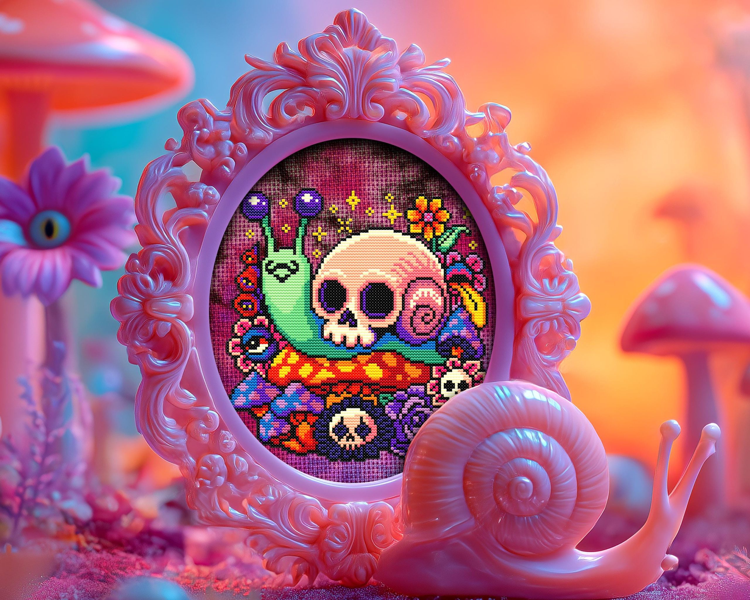 Somewhere between cute and mildly cursed, this gothic cross stitch fever dream crawled into existence: a pastel snail (or, let’s be honest, a smug little slug wearing a borrowed skull) gliding across toxic polka-dot fungi, the unholy love child of Halloween cross stitch mayhem and pastel goth cross stitch sweetness, dreamed up as a modern cross stitch rebellion for anyone whose idea of spooky cross stitch involves glittering spores, skull blossoms and eyeball flowers throwing side-eye at your guests. It’s basically what happens when snail Cross stitch decides it wants to be skull cross stitch and accidentally ends up as full-blown kawaii cross stitch instead, with the whole scene radiating whimsical cross stitch storybook chaos in the brightest, weirdest way.