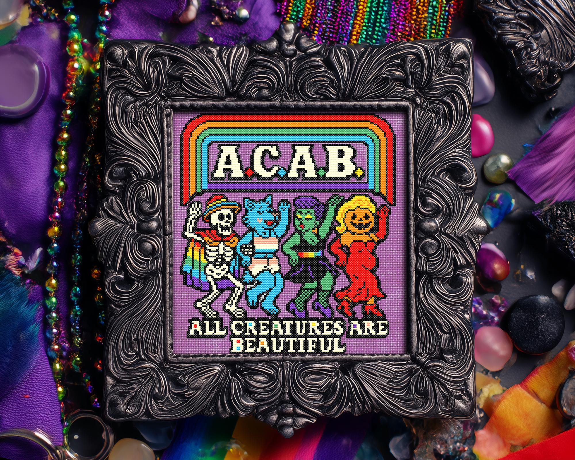 Drop everything, babes, because the gothic cross stitch, Halloween cross stitch, and full-on pride cross stitch chaos parade has arrived and it is LOUD, it is PROUD, and it is bedazzled to the bone. This pixel party is what happens when your queer cross stitch dreams take a shot of glitter, toss on a wig, and jump into a pride parade with skeletons, werewolves, monsters, and sultry produce. Yes, really. This ain’t no subtle tribute, this is ACAB cross stitch energy at its finest, where All Creatures Are Beautiful and no thread goes un-slayed. Whether you’re here for the modern cross stitch flair, the funny cross stitch flavor, or just that sweet sweet rainbow cross stitch radiance, this design serves queer pandemonium in full undead technicolor.
