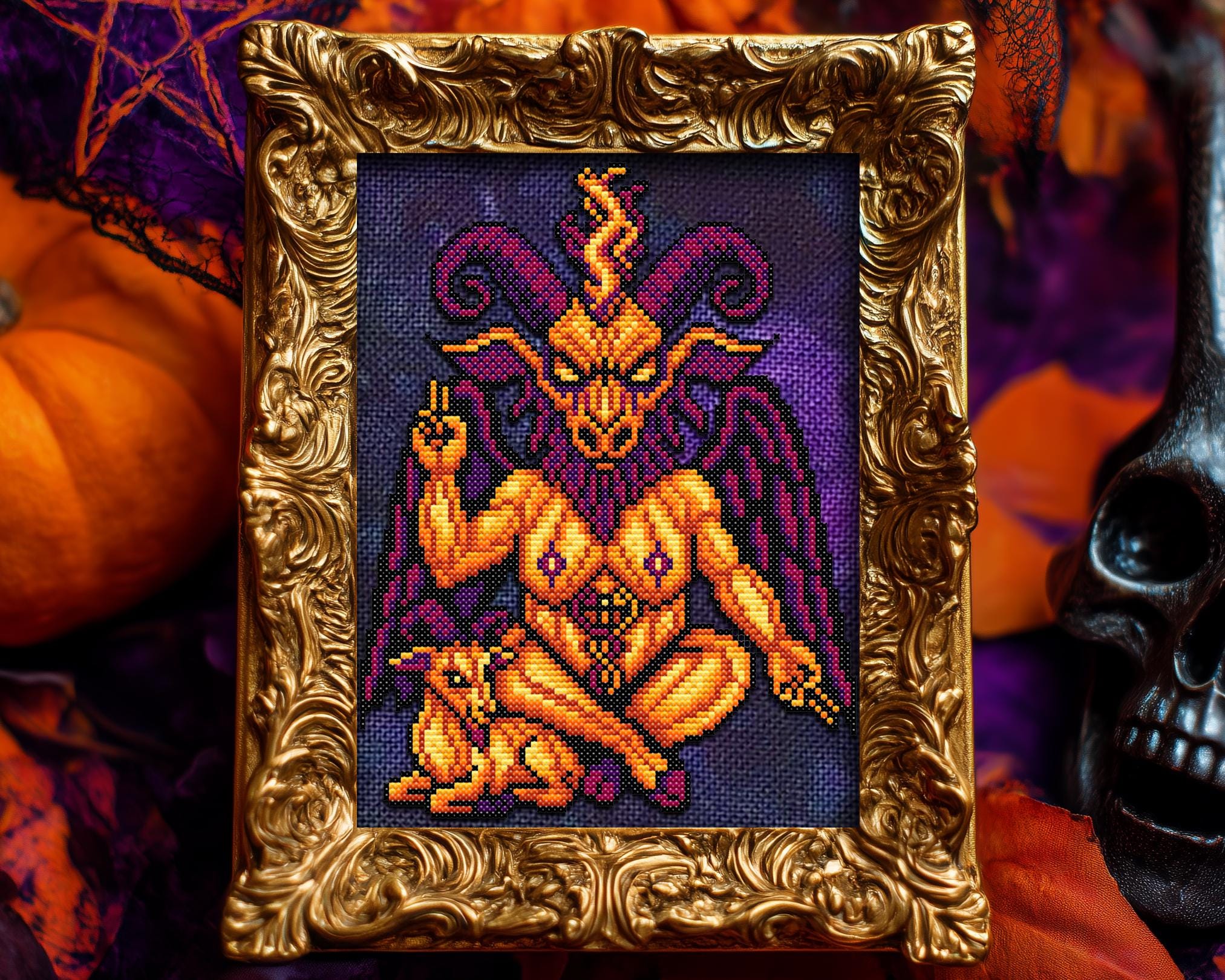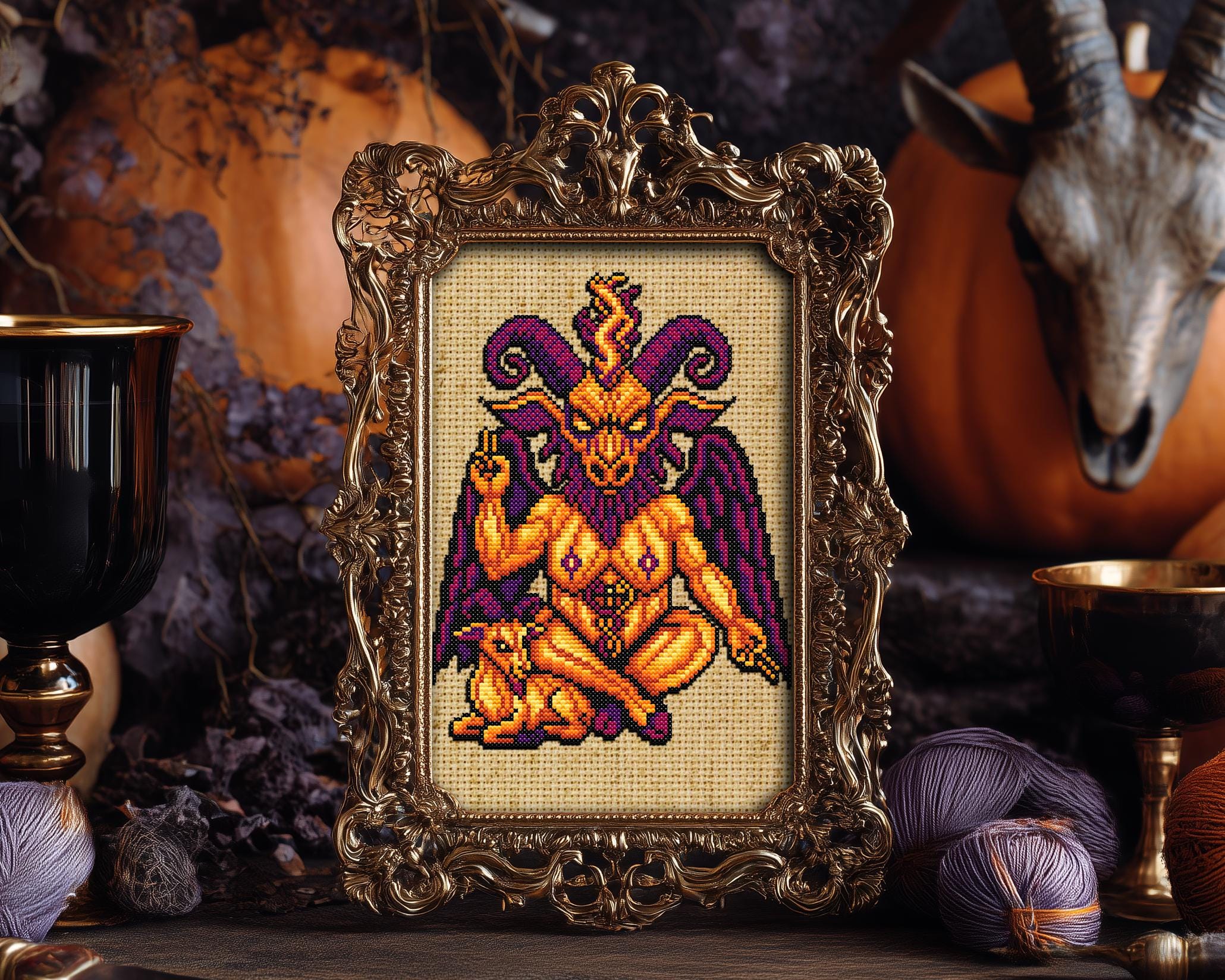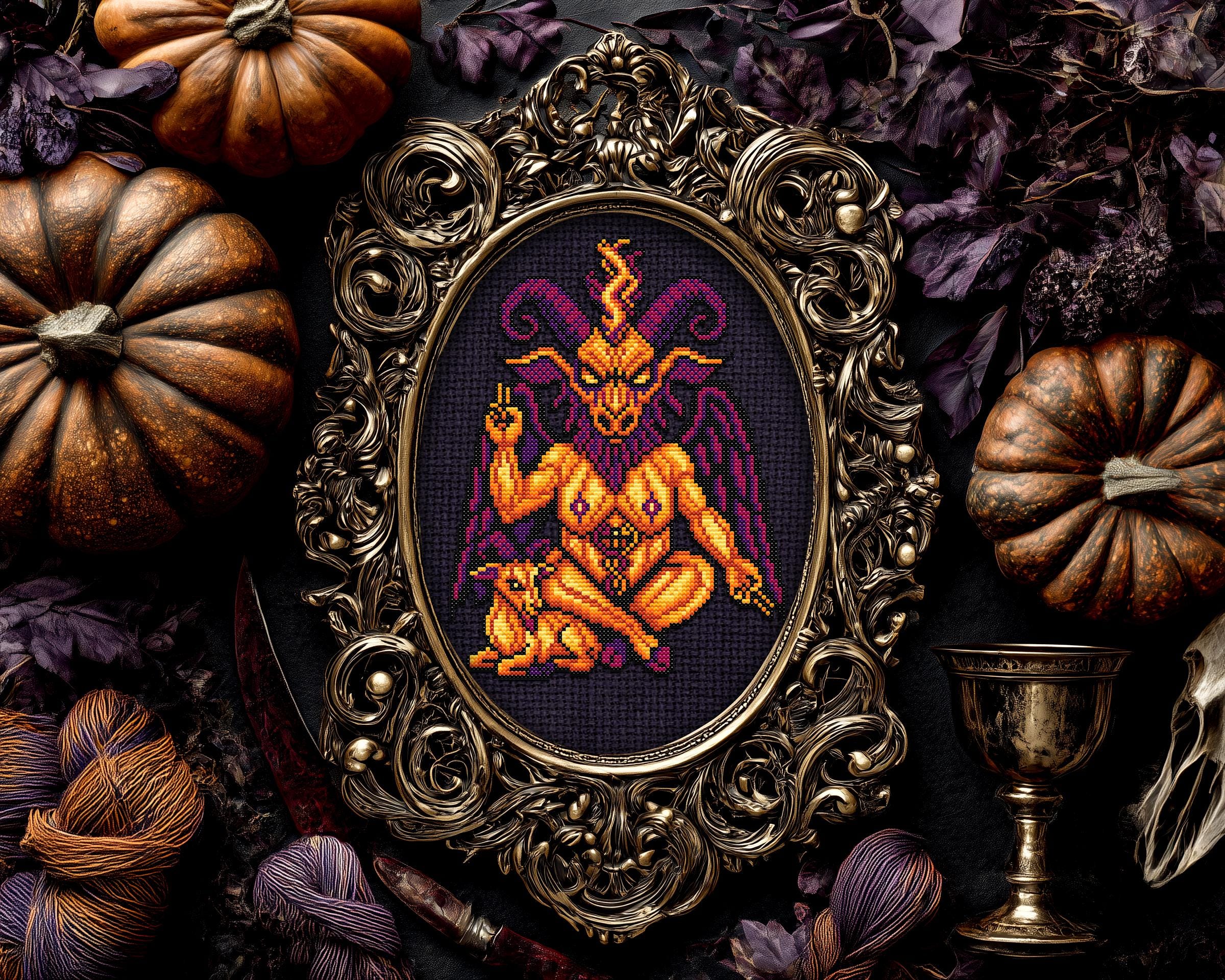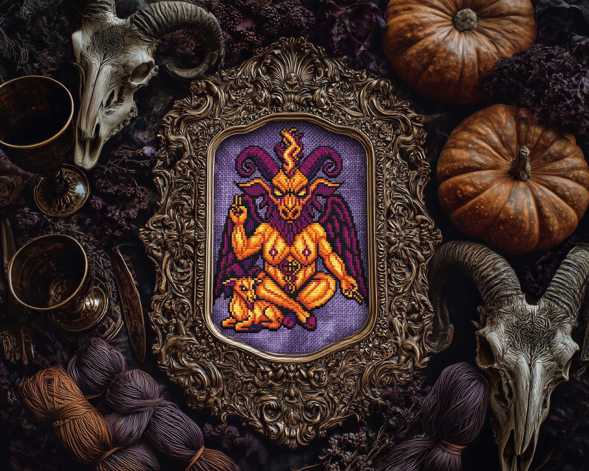 Pumphomet is no silent devil. With every stitch, they cackle in the key of creepy cross stitch, hum lullabies from the dark cross stitch dimension, and flirt with the flames of horror cross stitch lore. Whether you’re lighting candles for your ancestors or just avoiding that one neighbor who keeps asking about your “little hobby,” this piece delivers all the cozy dread of a good Wiccan cross stitch séance. And yes, it absolutely qualifies as witchy cross stitch, just look at those majestic horns and unapologetically cursed posture. It’s the sassiest satan cross stitch design to ever grow legs and walk out of your embroidery hoop.