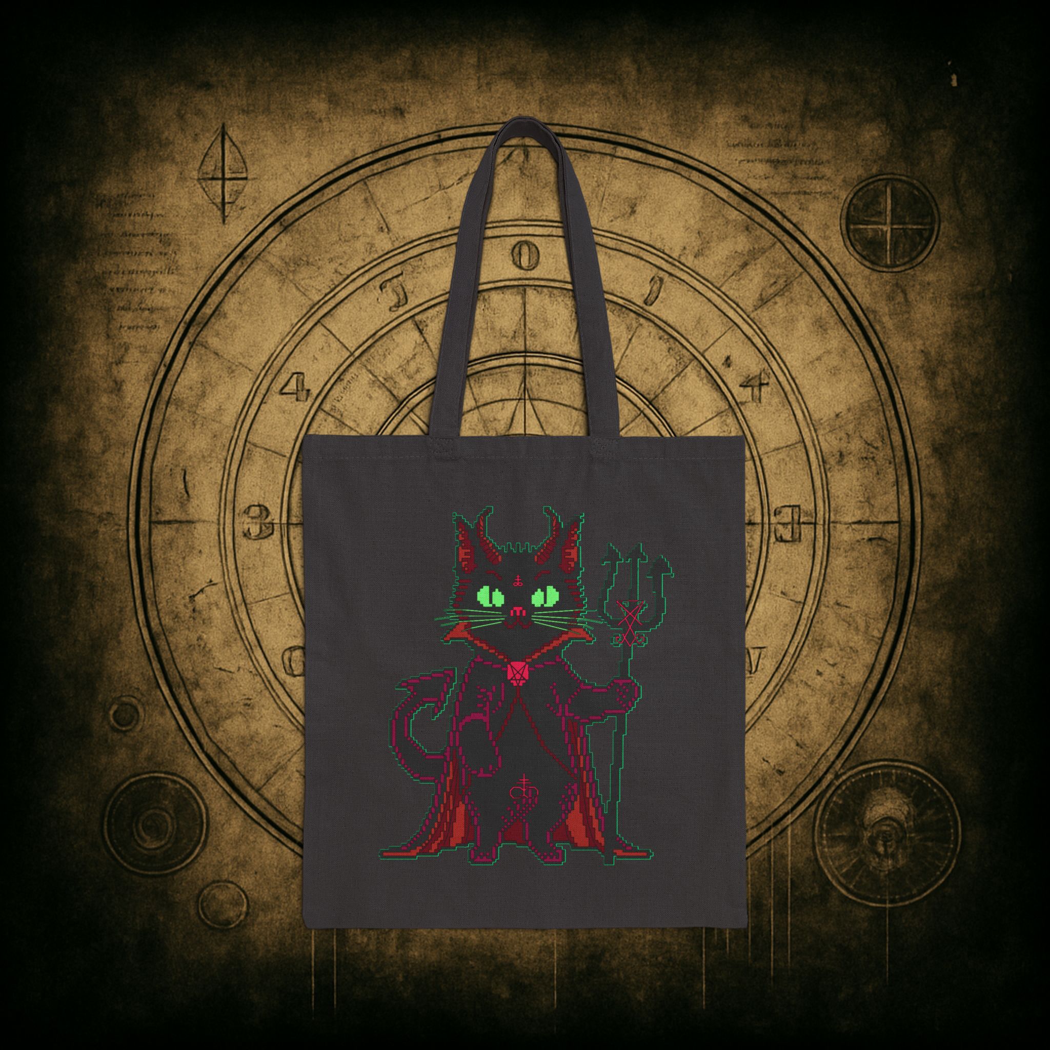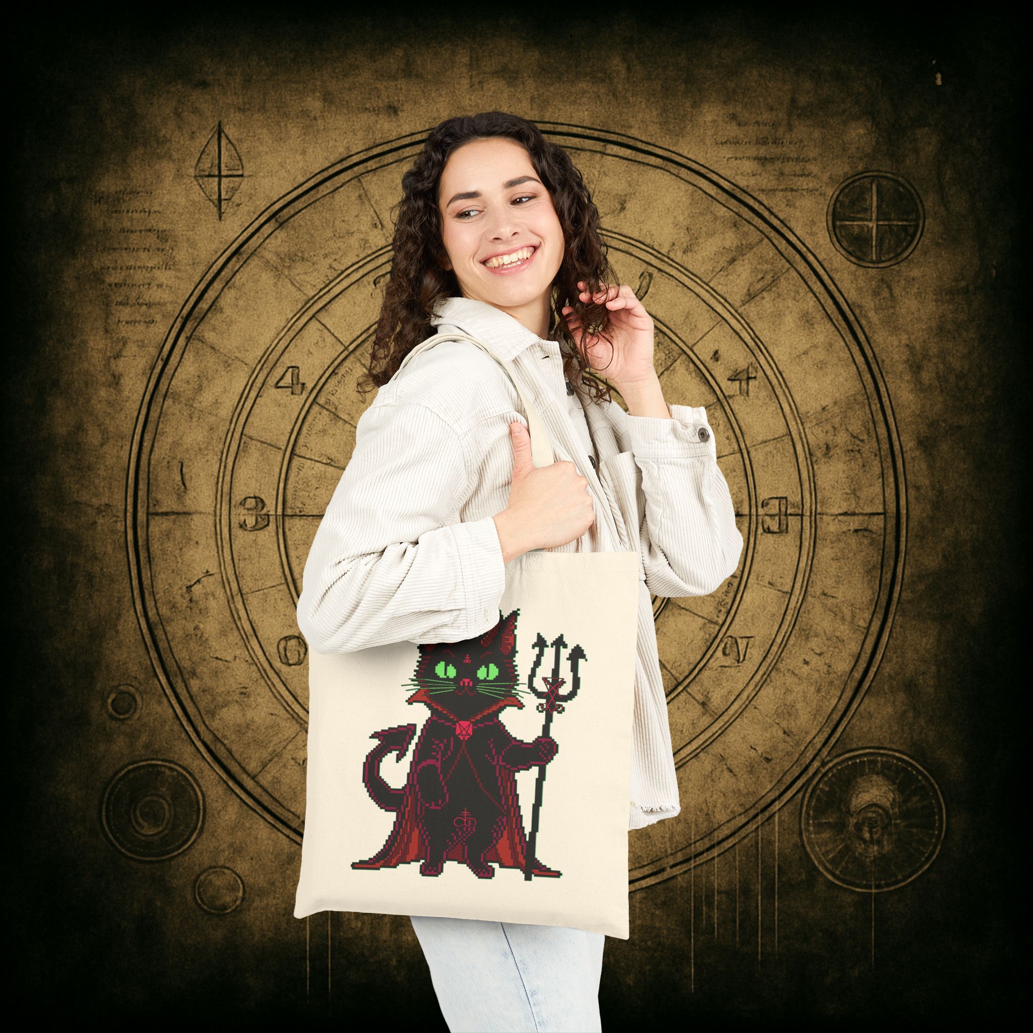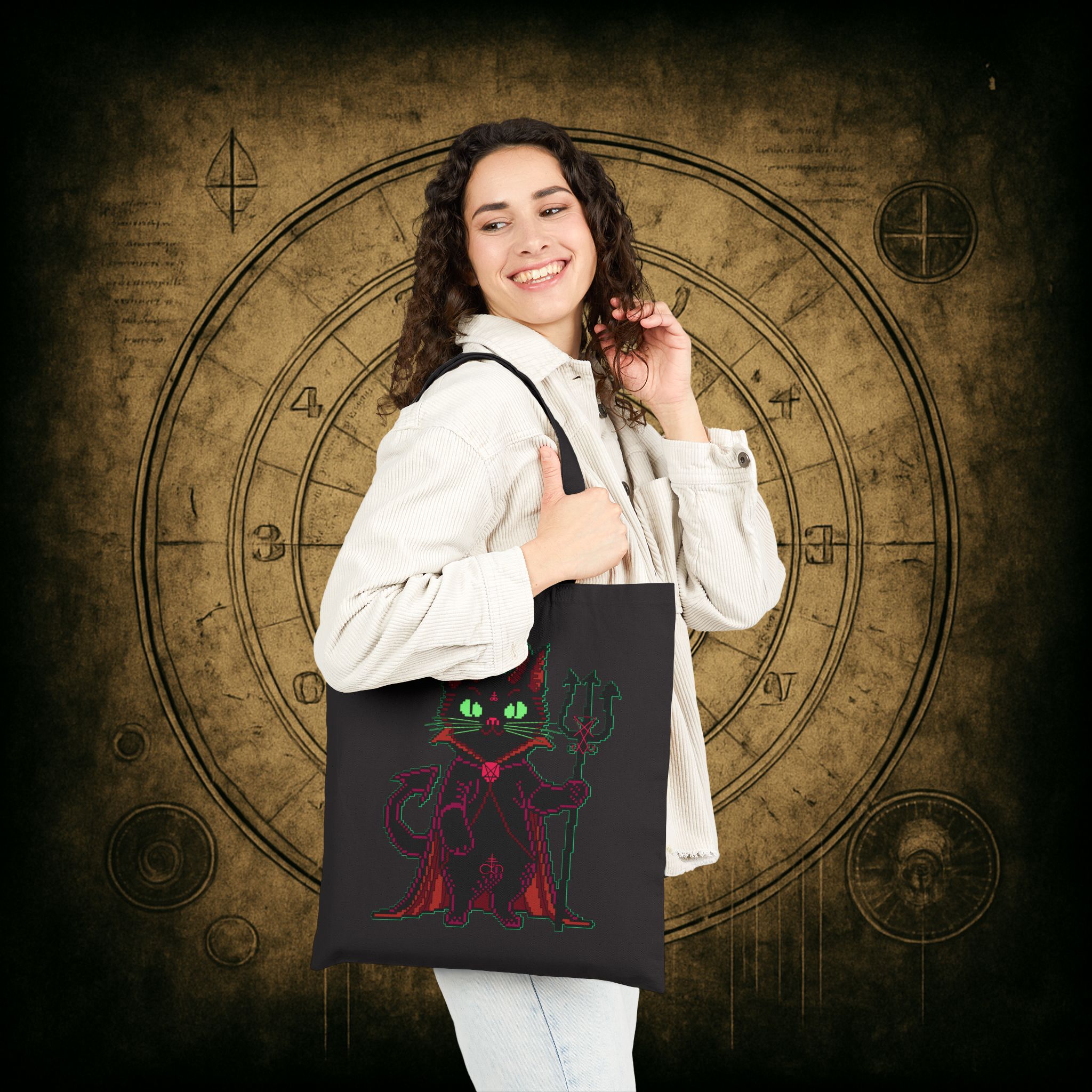 Whether you’re raiding the farmers’ market or escaping your mortal obligations with a dramatic cape swoosh, the Puscifer Tote Bag is your ultimate chaotic sidekick. Adorned with a pixel-perfect infernal kitty, complete with glowing green eyes, a trident, and just enough sass to start a cult, this bag isn’t just a carrier, it’s a whole attitude. Perfect for unholy errands, forbidden spellbooks, or smuggling snacks into coven meetings.