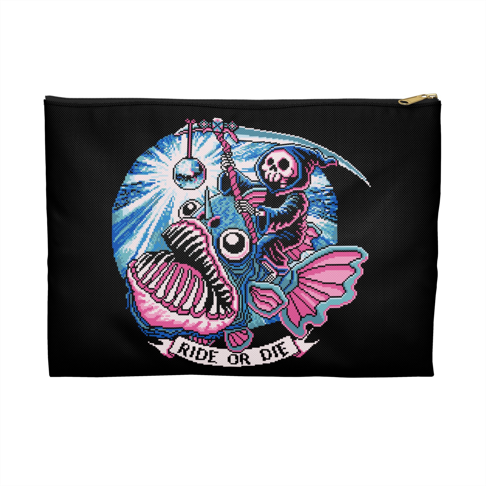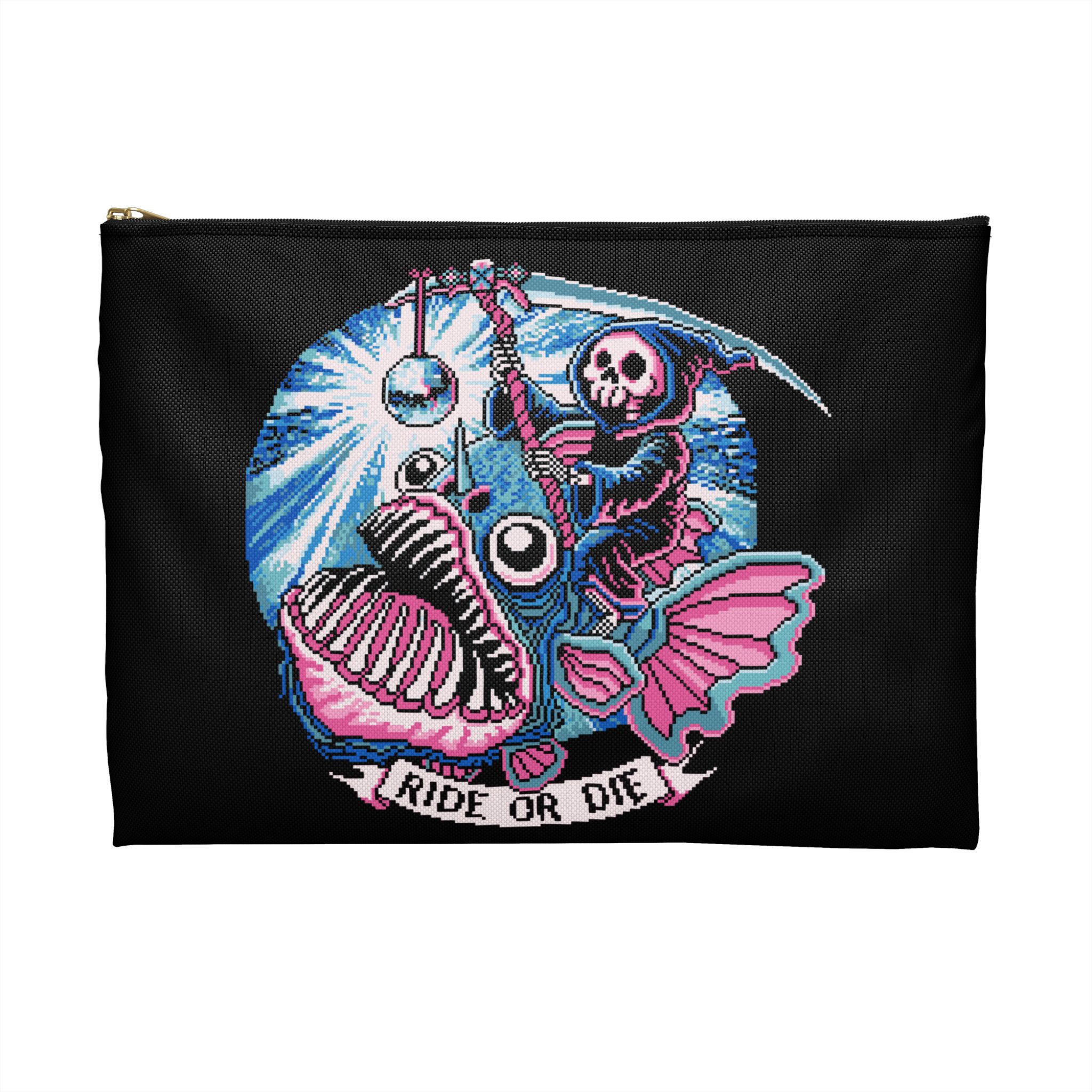 For the stitchers who prefer the deep sea over the high road. The Ride or Die Angler Fish Project Bag pairs a deranged disco-ball-toting angler fish with a reaper who’s clearly in their deep-sea villain era. This bag doesn’t just hold your WIPs, it swallows them whole, lights the abyss, and asks, “you coming or not?”