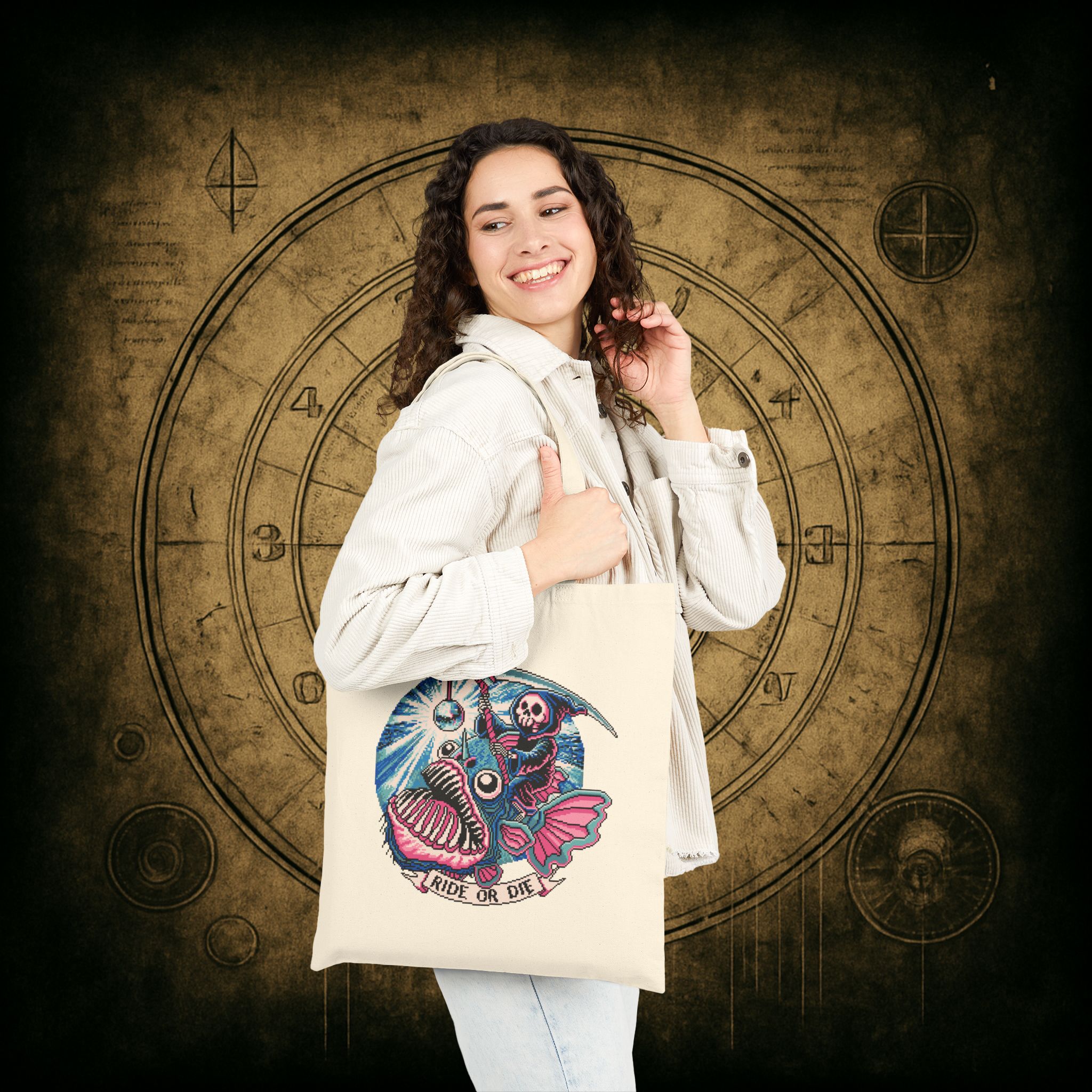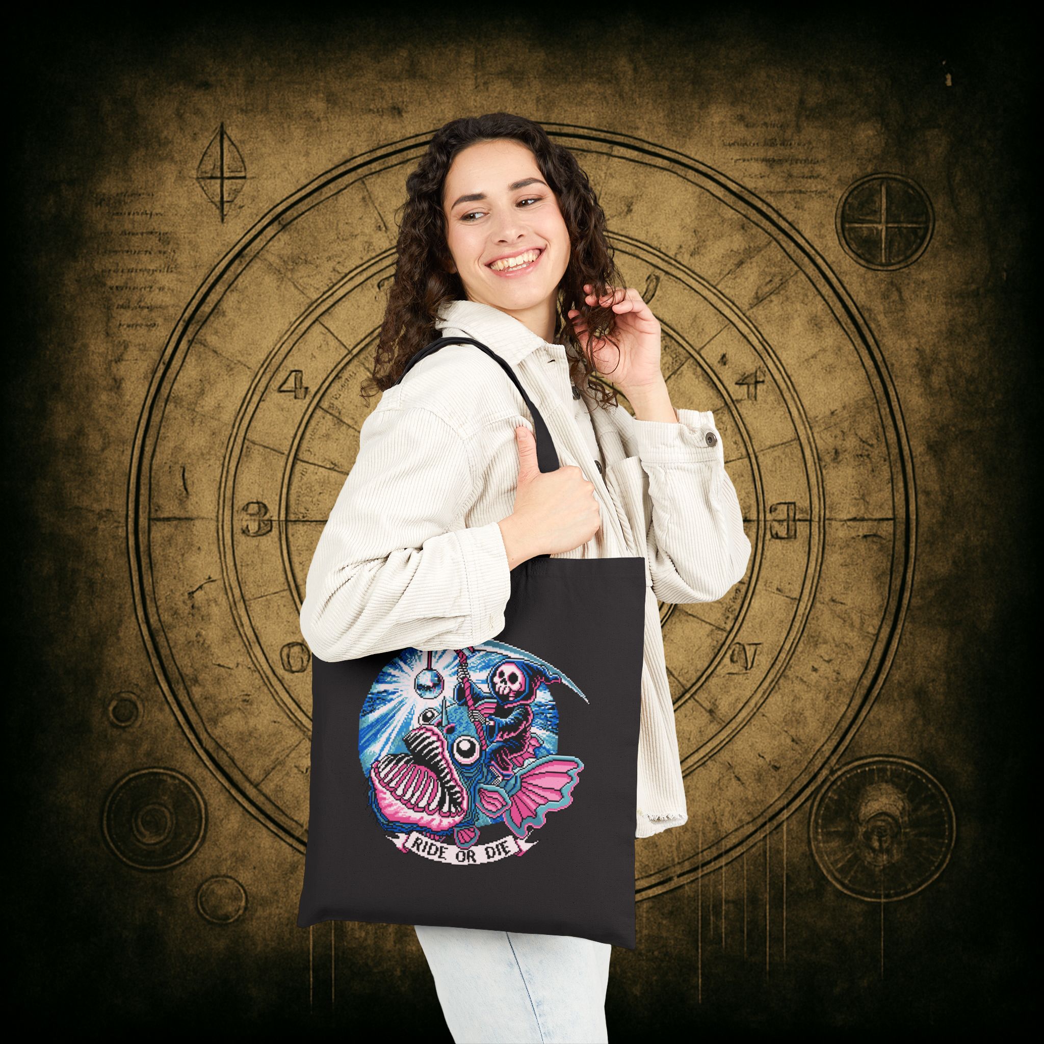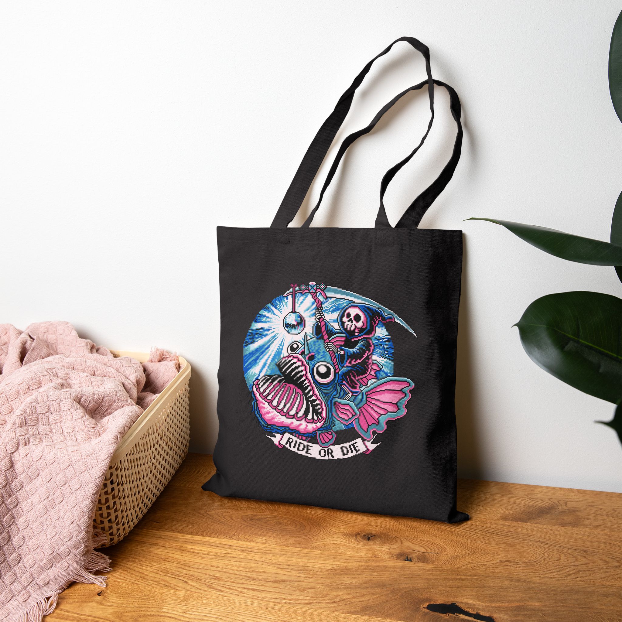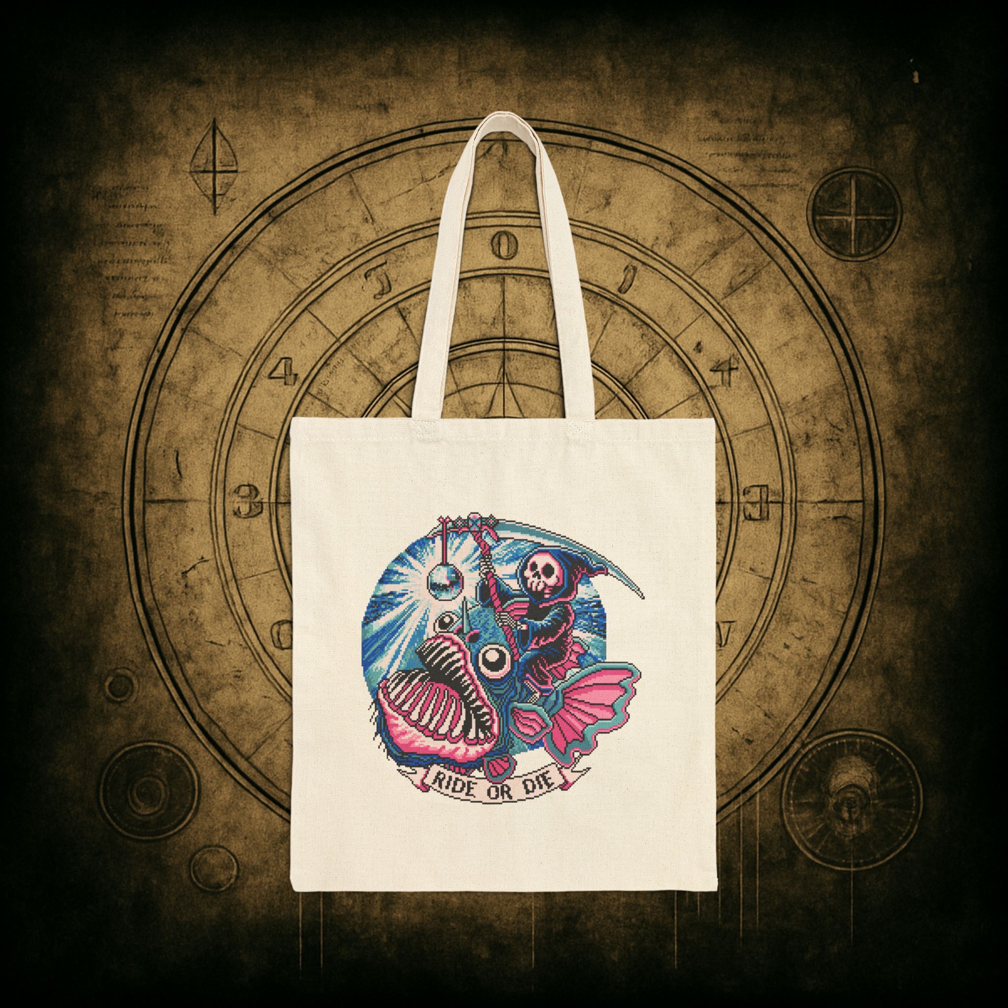 Plunge into the abyss with the Ride or Die Angler Fish Tote Bag, where death rides deep-sea style and disco balls light the way. Featuring a skeletal reaper clutching reins atop the creepiest glam-fish you’ve ever seen, this tote doesn’t ask permission, it devours expectations. Perfect for midnight dives into your craft stash or boldly swimming against the current of basic.