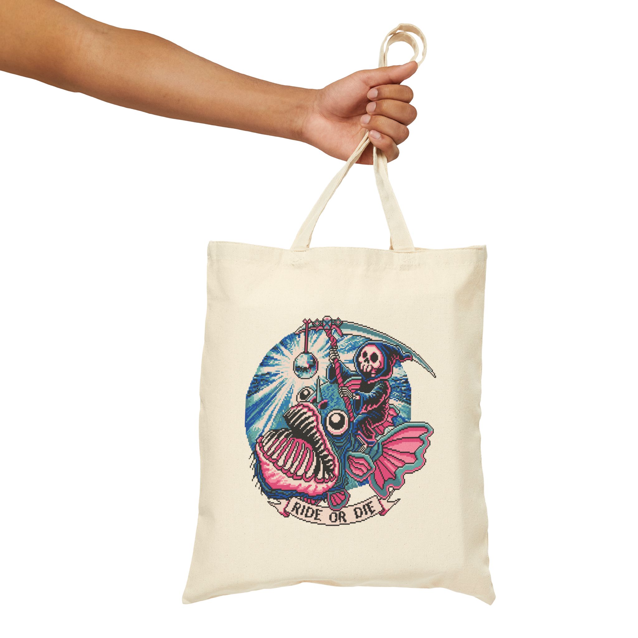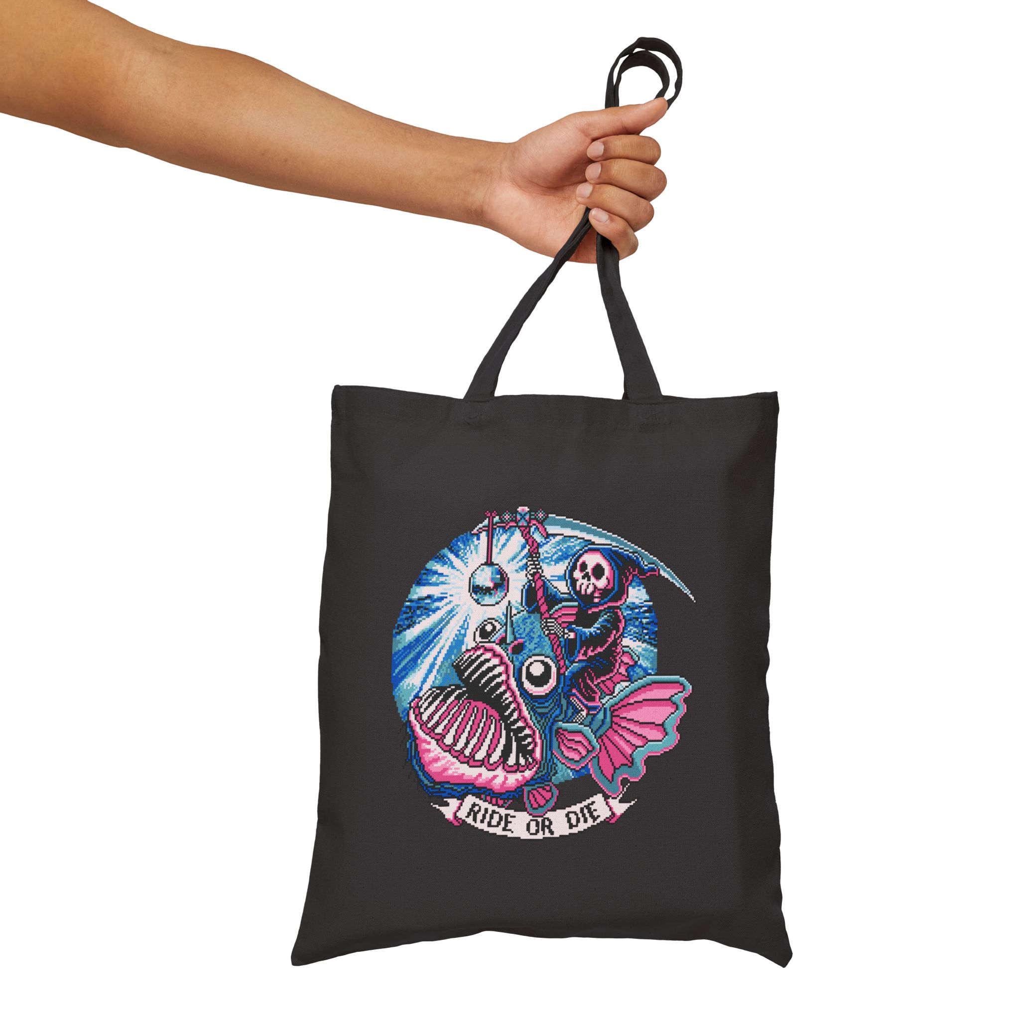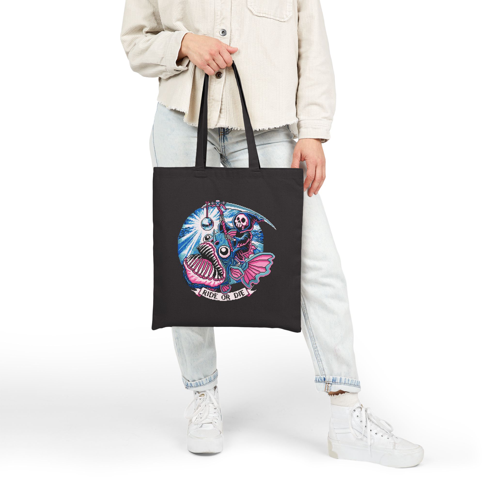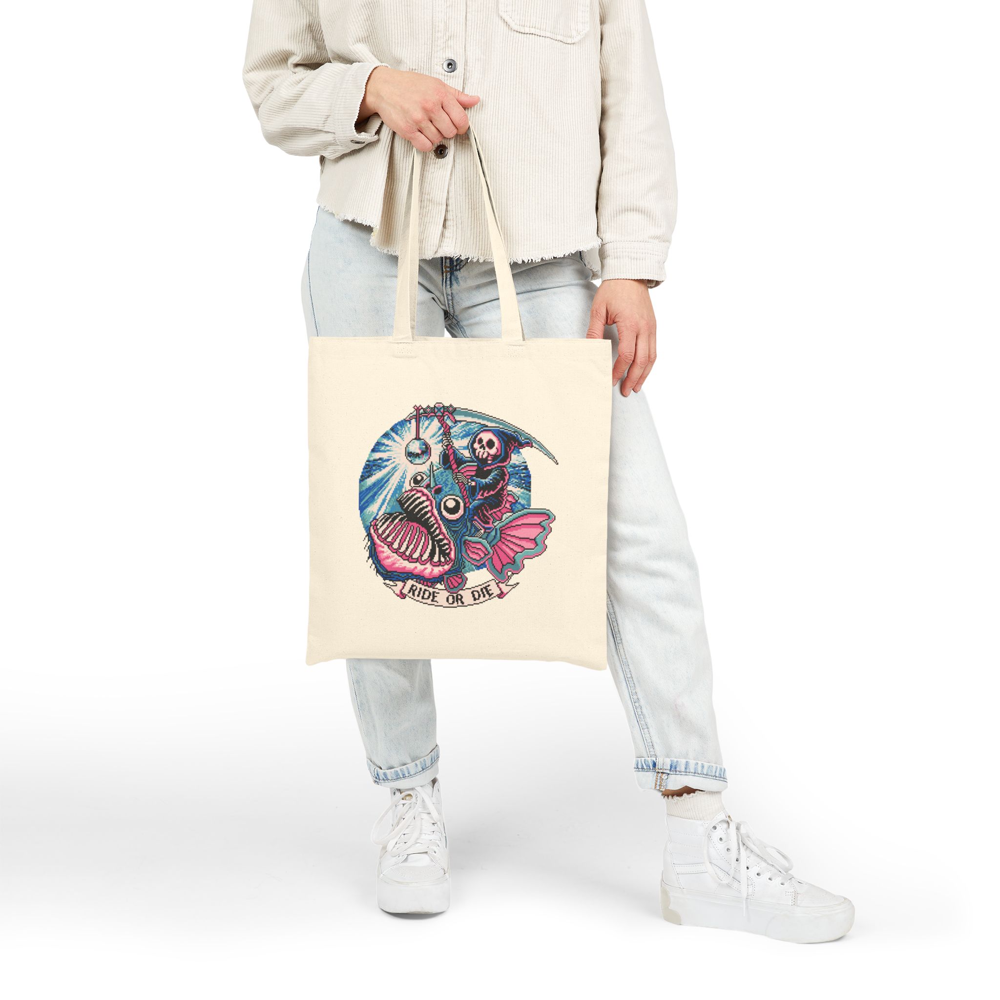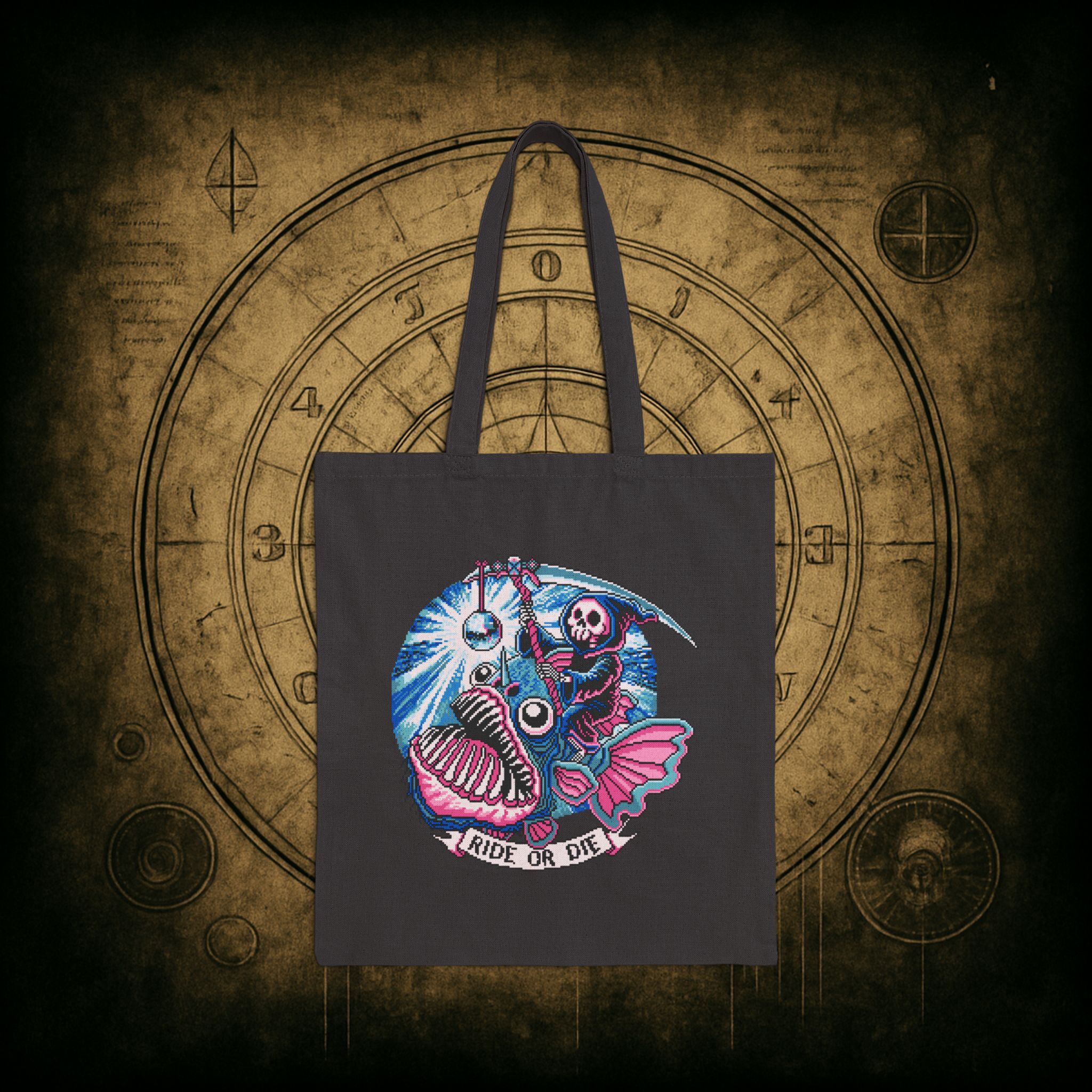 Plunge into the abyss with the Ride or Die Angler Fish Tote Bag, where death rides deep-sea style and disco balls light the way. Featuring a skeletal reaper clutching reins atop the creepiest glam-fish you’ve ever seen, this tote doesn’t ask permission, it devours expectations. Perfect for midnight dives into your craft stash or boldly swimming against the current of basic.