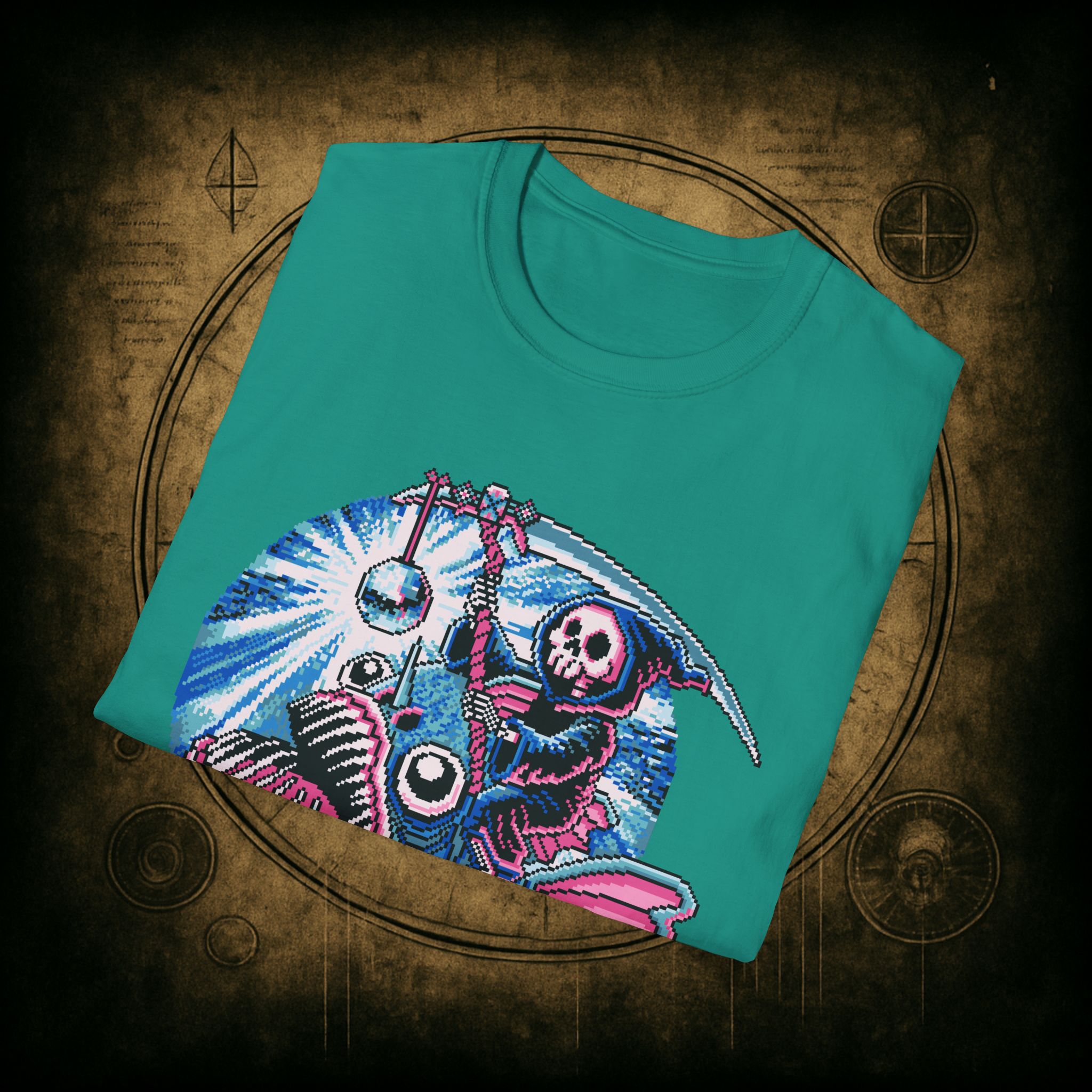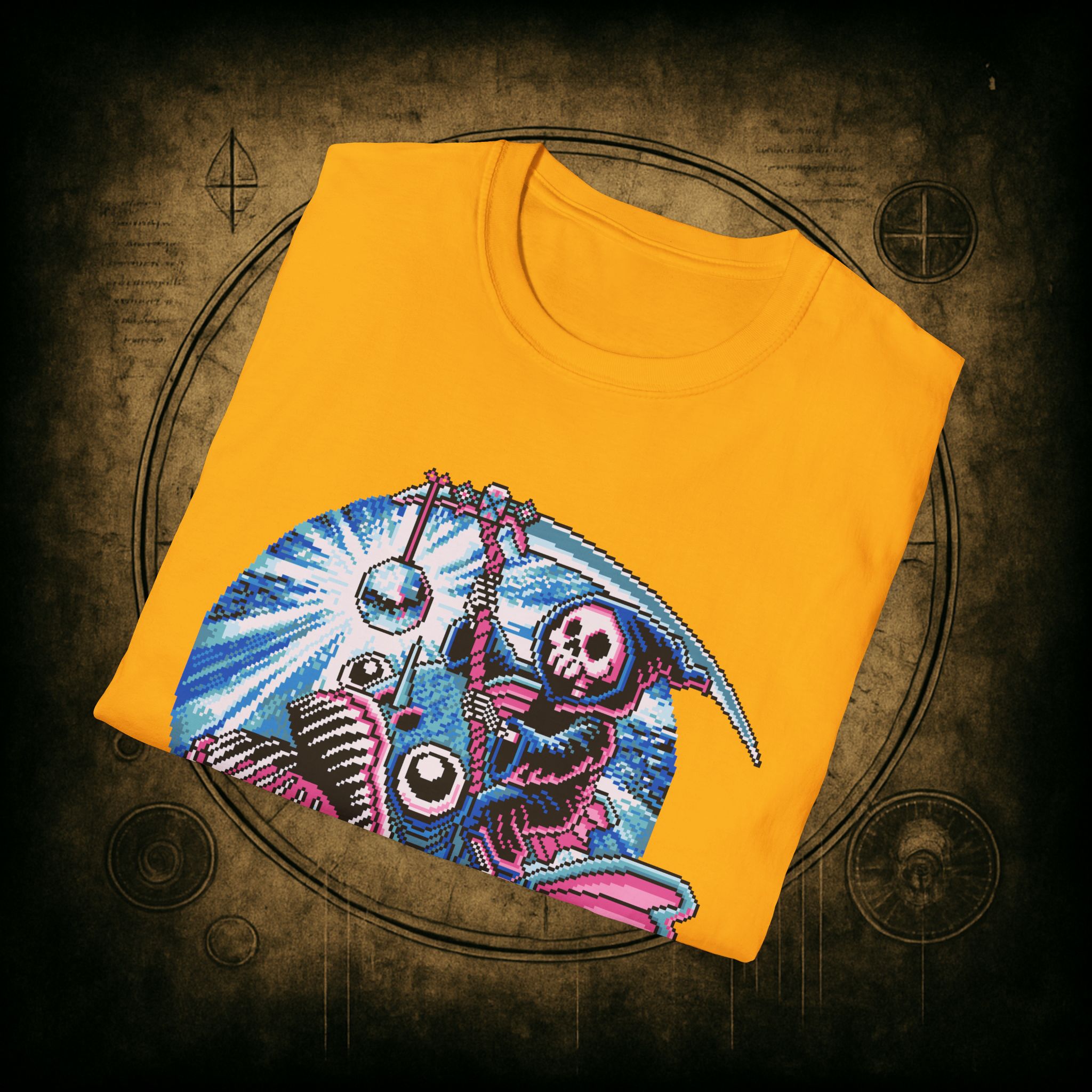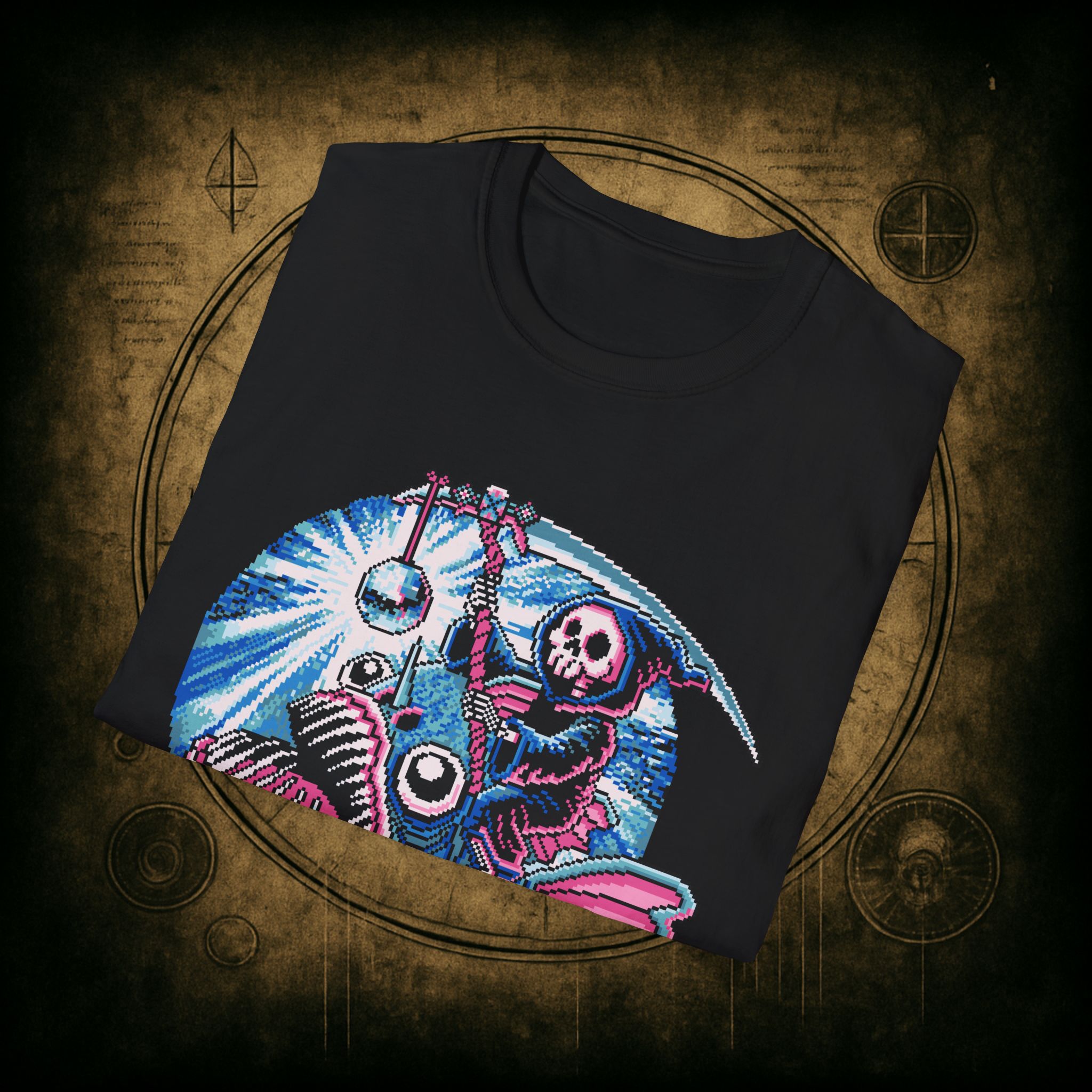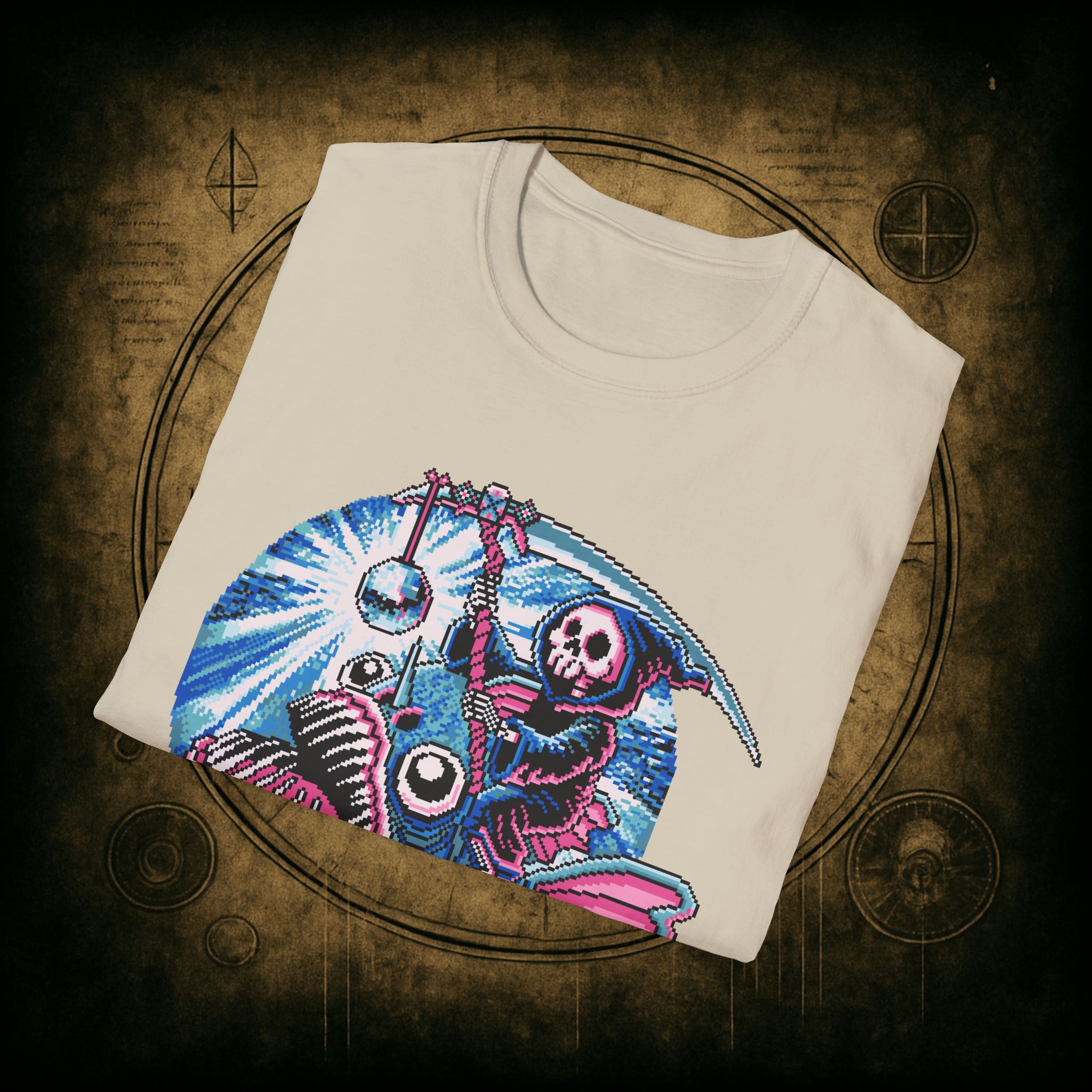 This tee is pure chaos magic, deep-sea death cult meets underworld rave. The fish is clearly not built for this. The disco ball has no remorse. And the reaper? Just trying to go out fabulously.