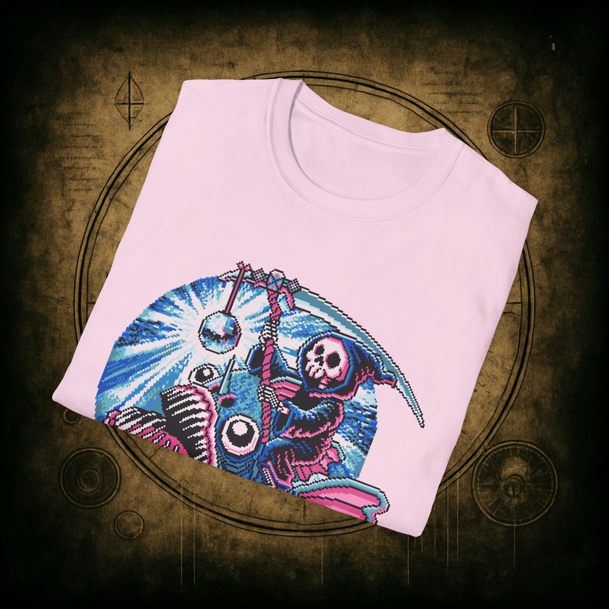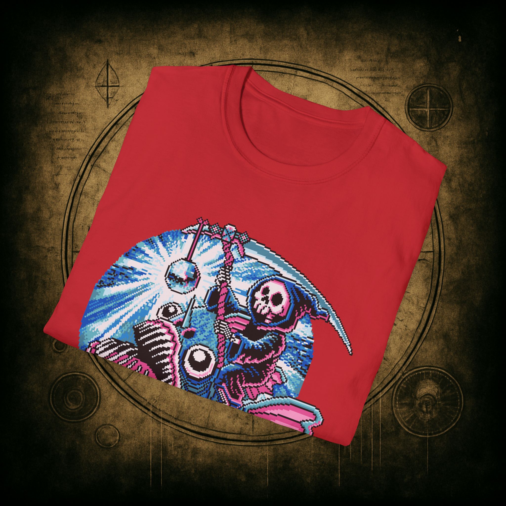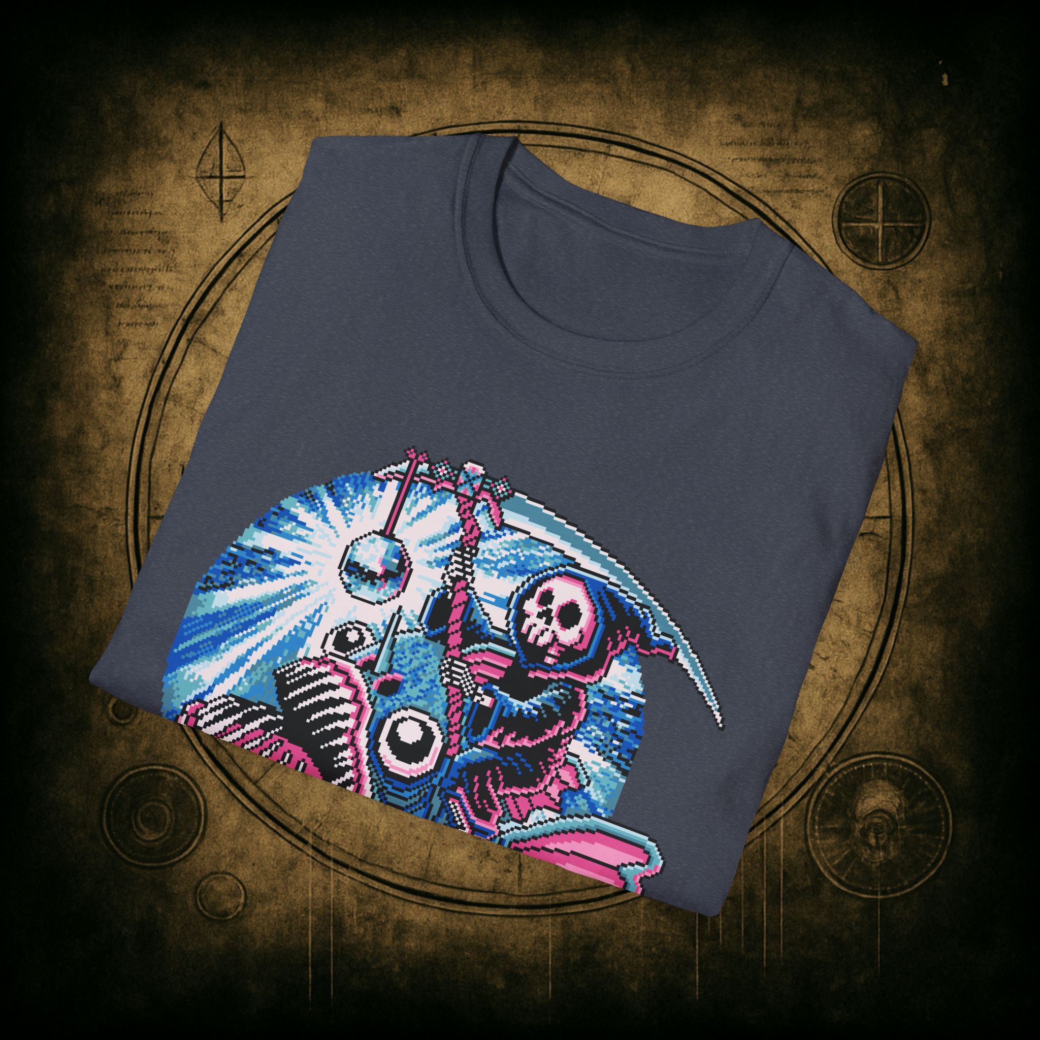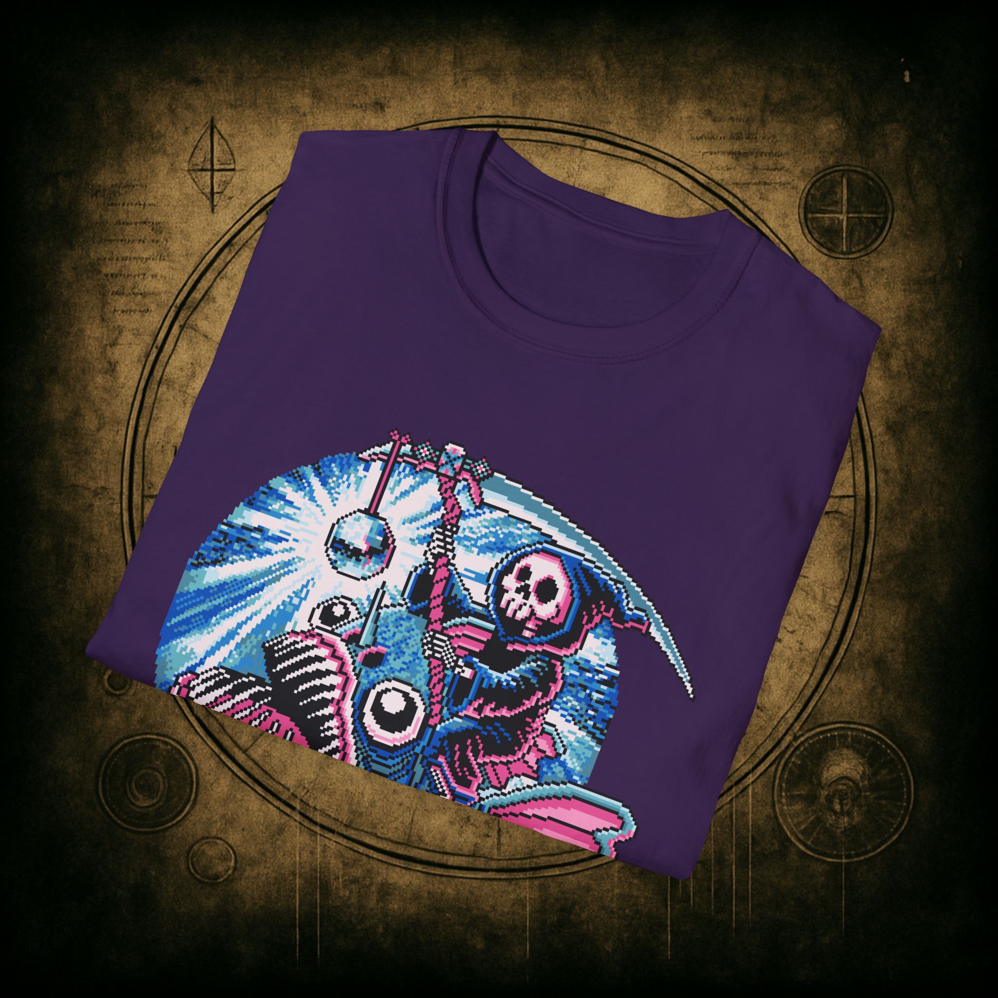 This tee is pure chaos magic, deep-sea death cult meets underworld rave. The fish is clearly not built for this. The disco ball has no remorse. And the reaper? Just trying to go out fabulously.