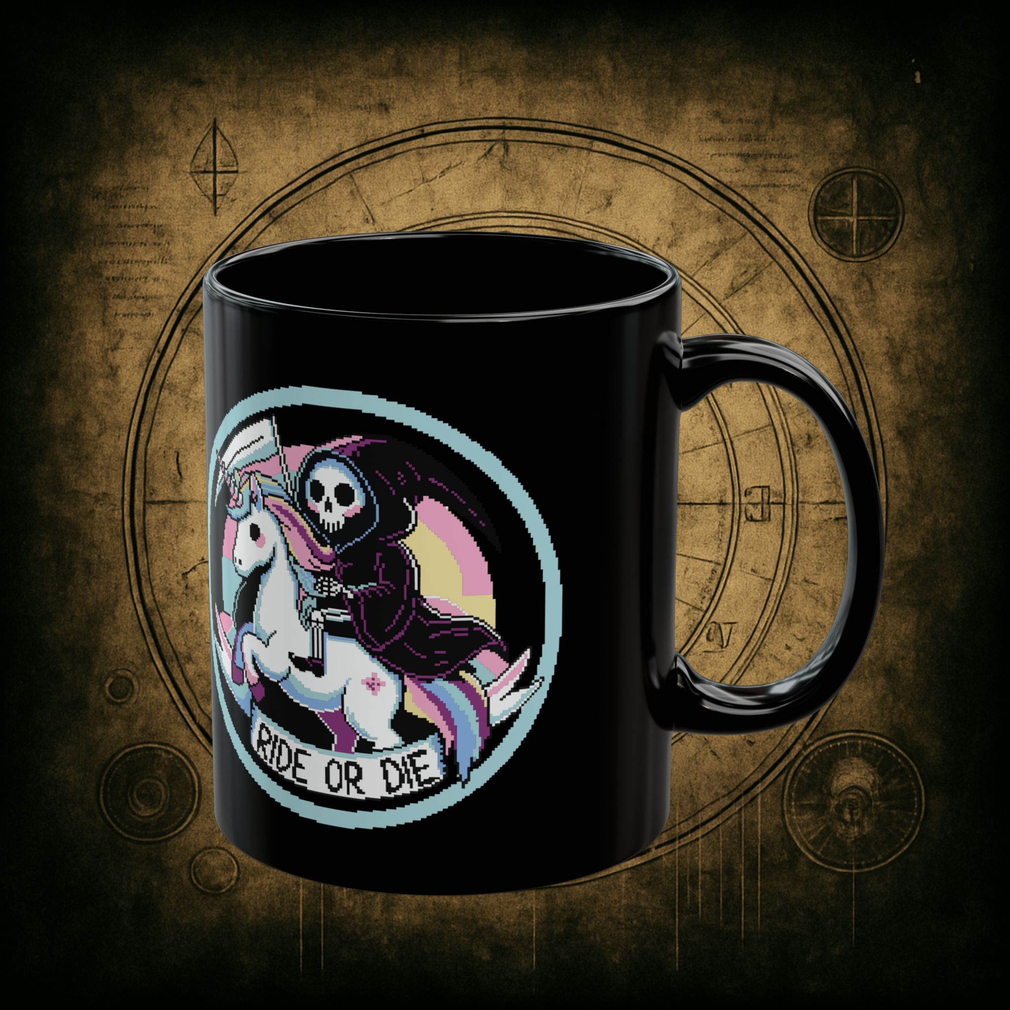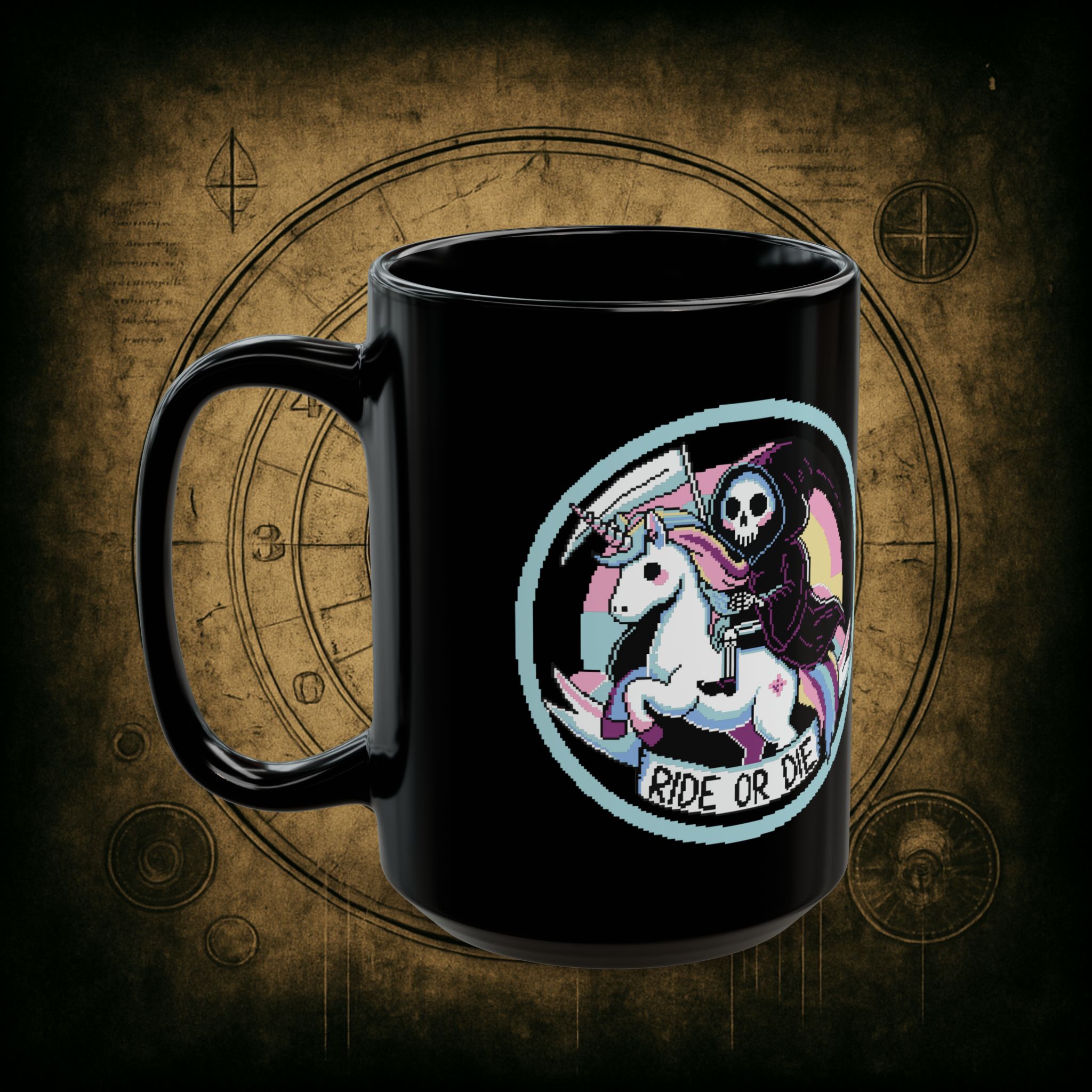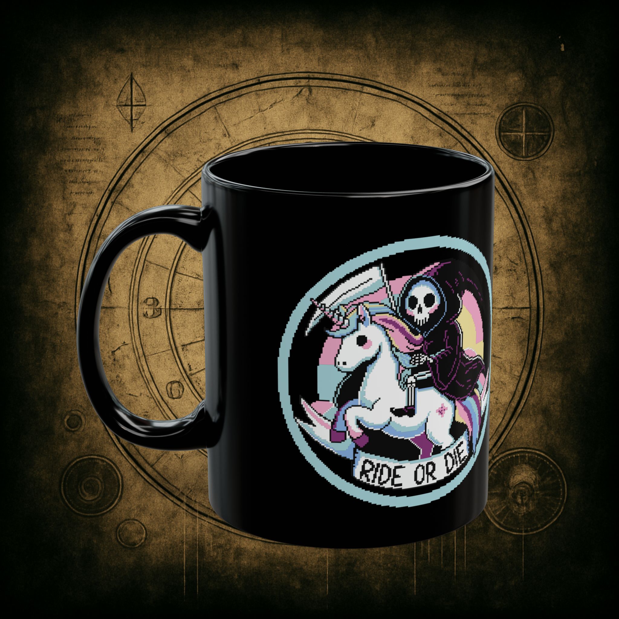 The Grim Reaper has upgraded, now featuring pastel rainbows, deadly sparkle, and a unicorn with serious vengeance issues. This mug is for the goths with glitter, the doomers with style, and anyone who wants their morning brew served with ✨drama✨.