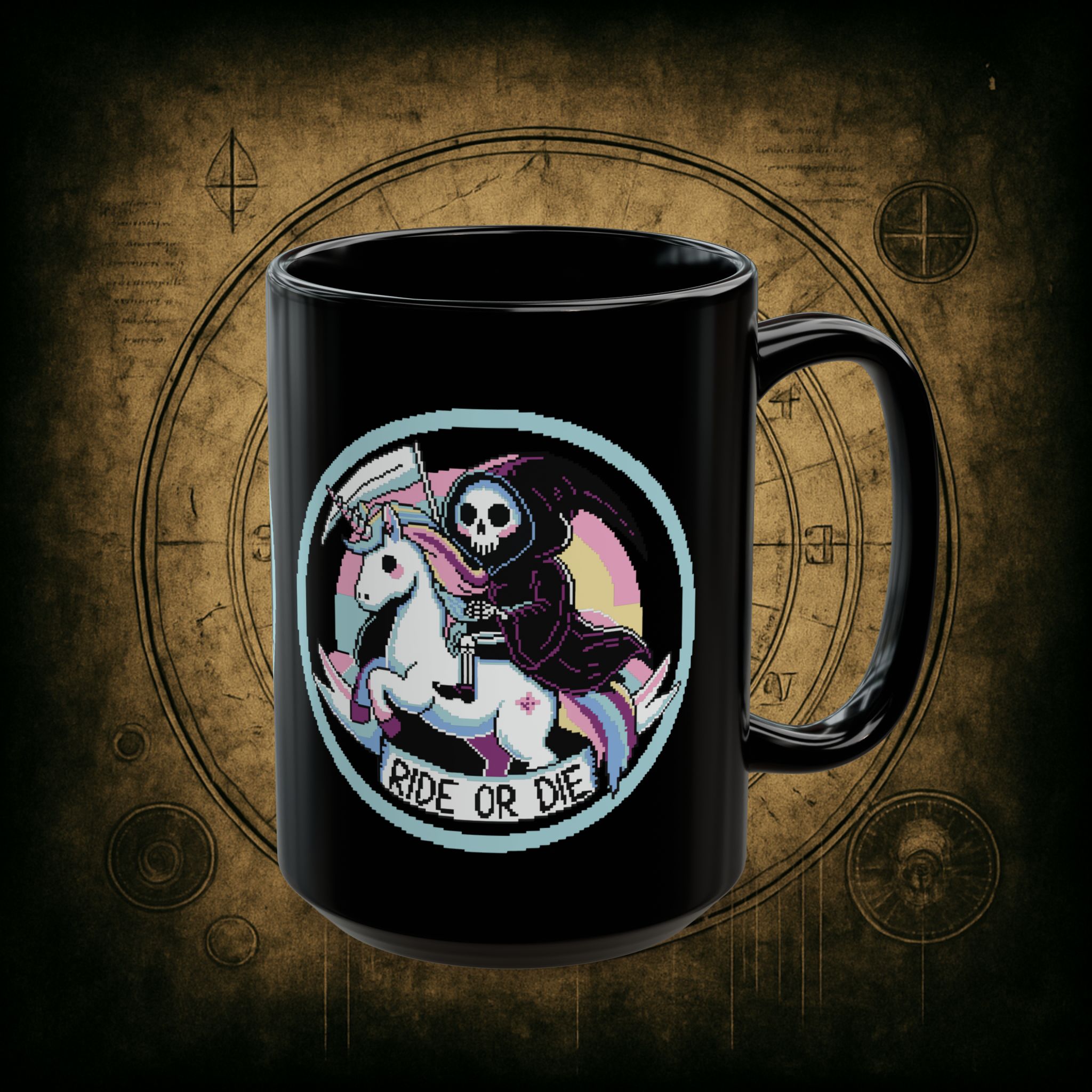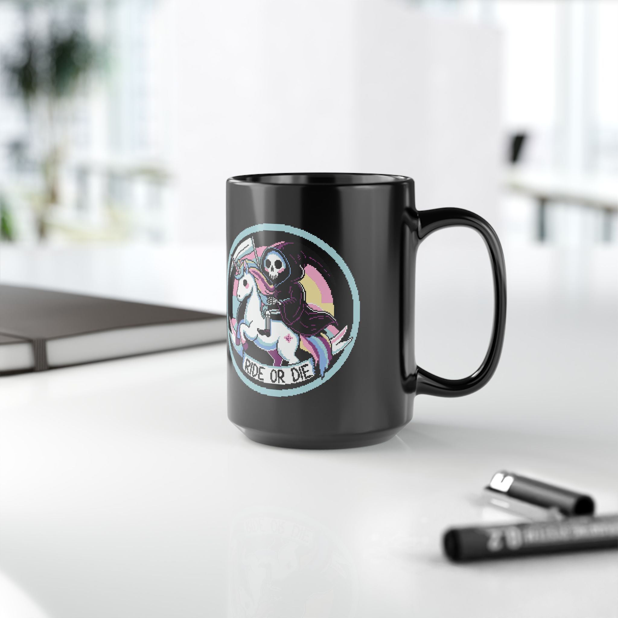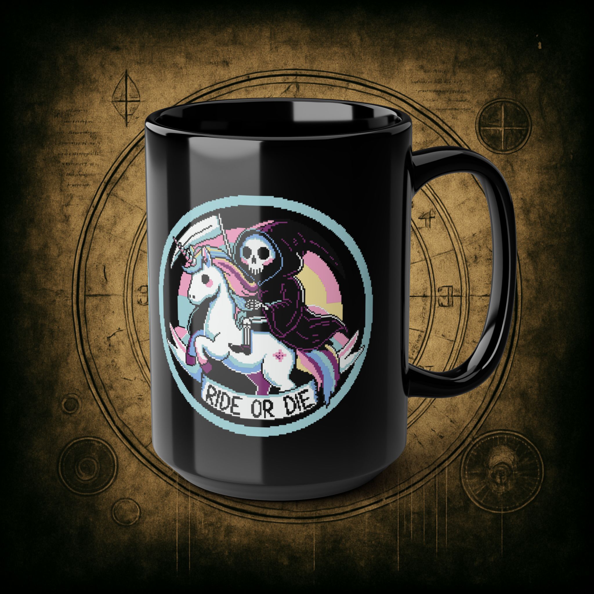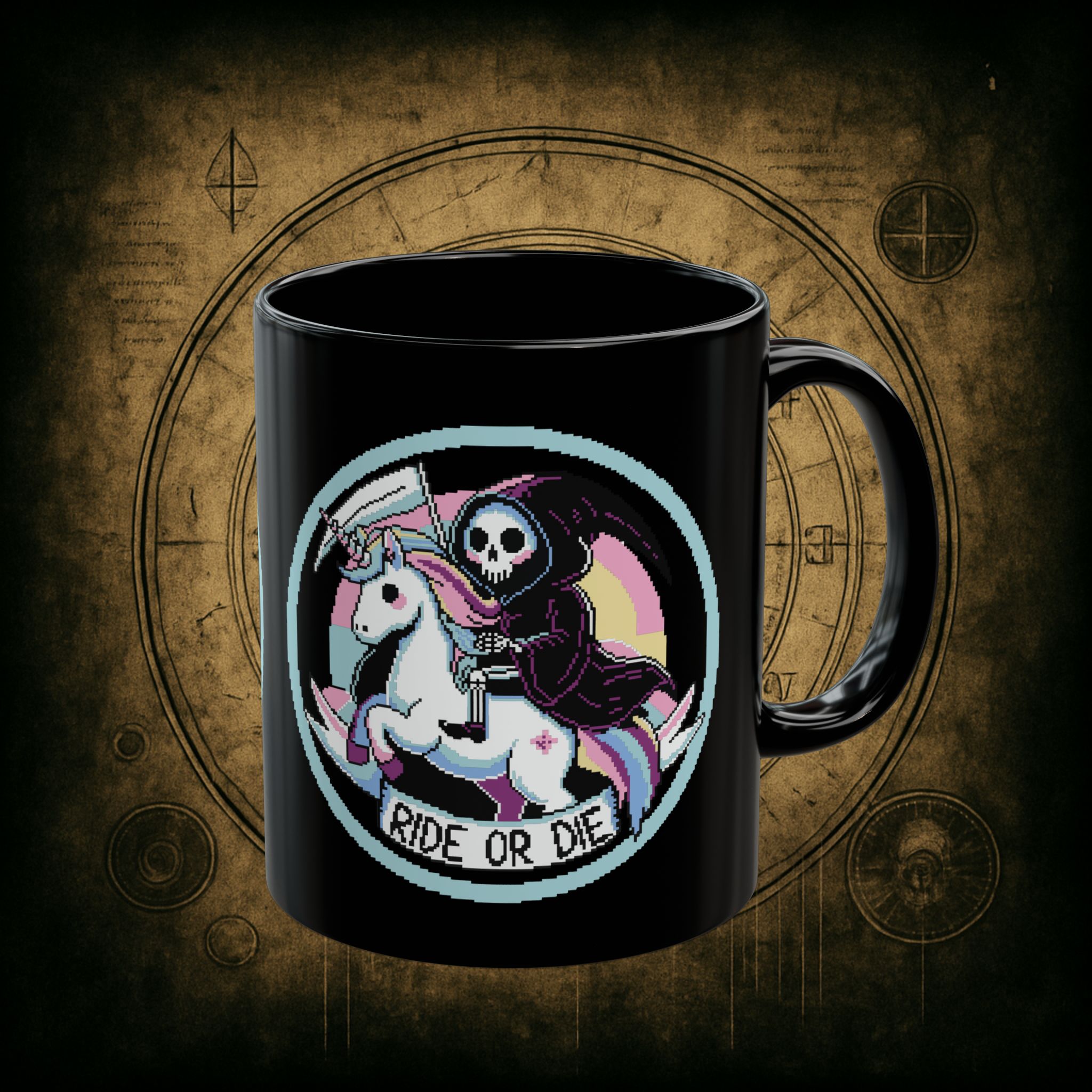 The Grim Reaper has upgraded, now featuring pastel rainbows, deadly sparkle, and a unicorn with serious vengeance issues. This mug is for the goths with glitter, the doomers with style, and anyone who wants their morning brew served with ✨drama✨.