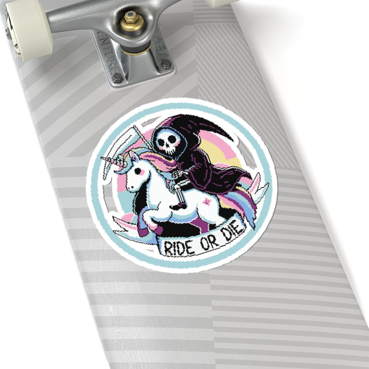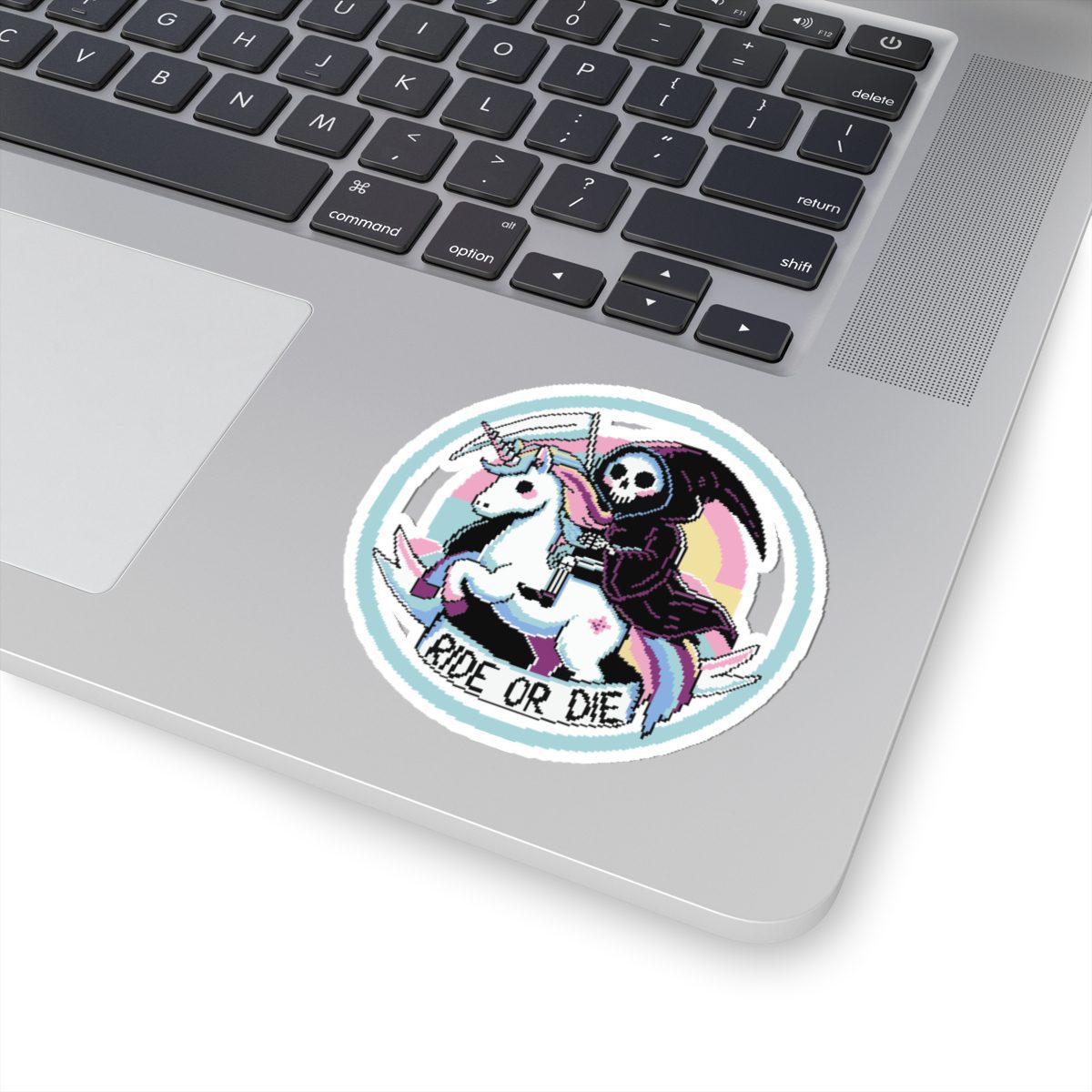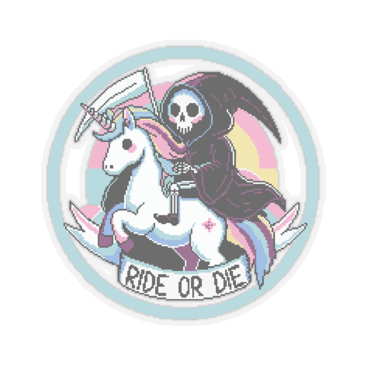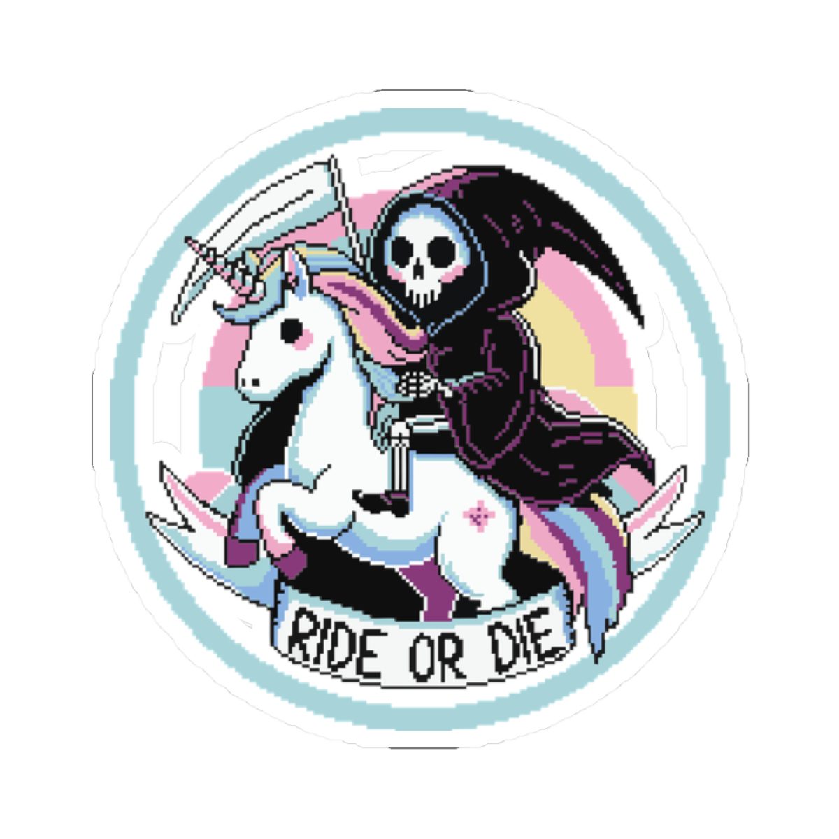 Nothing says loyalty like a scythe-wielding reaper on a rainbow-maned unicorn. The Ride or Die Kiss-Cut Sticker is for the baddies who charge into battle (or brunch) side by side with the underworld’s most fashionable skeleton. Whether you’re slaying enemies or to-do lists, this sticker’s got your back… and your soul.
