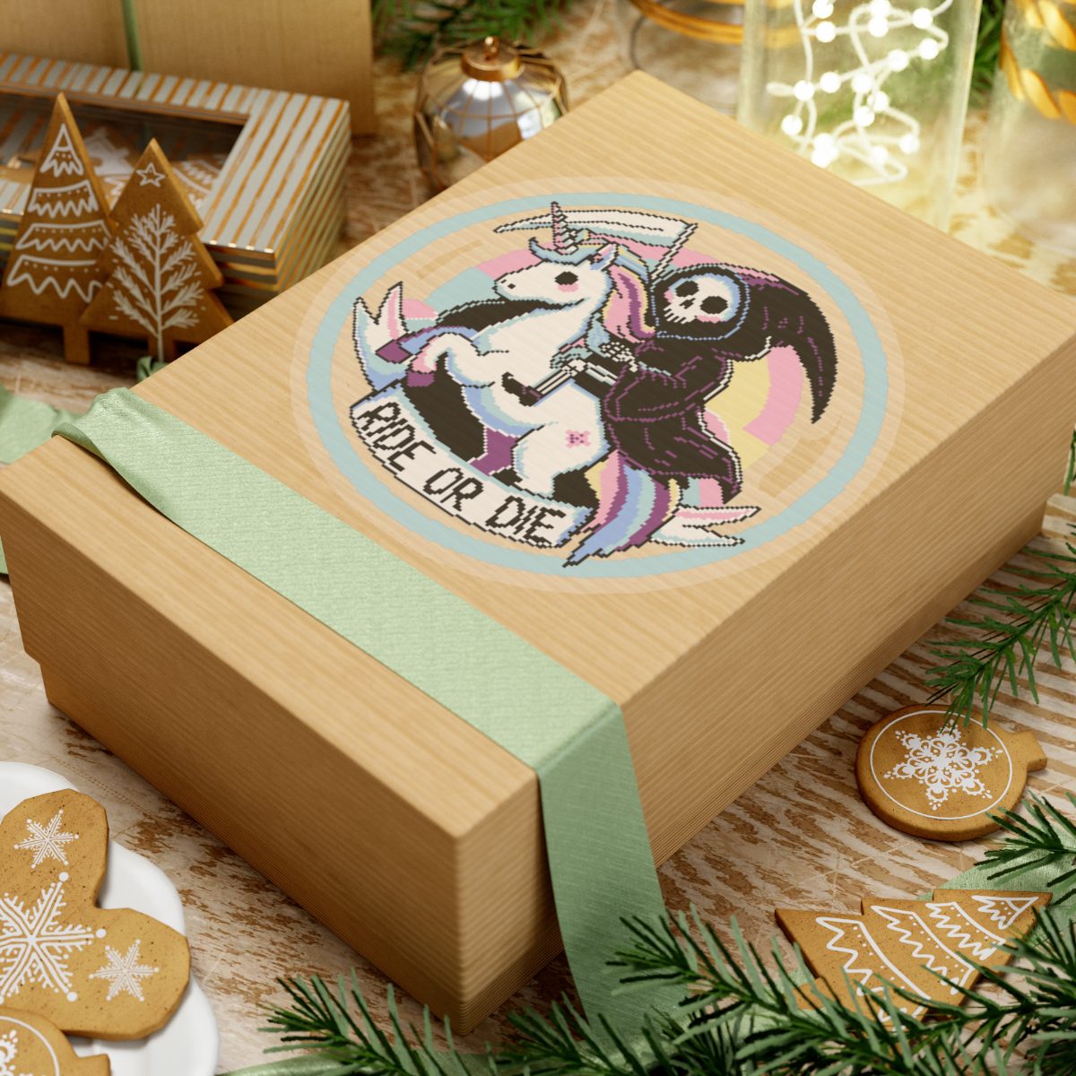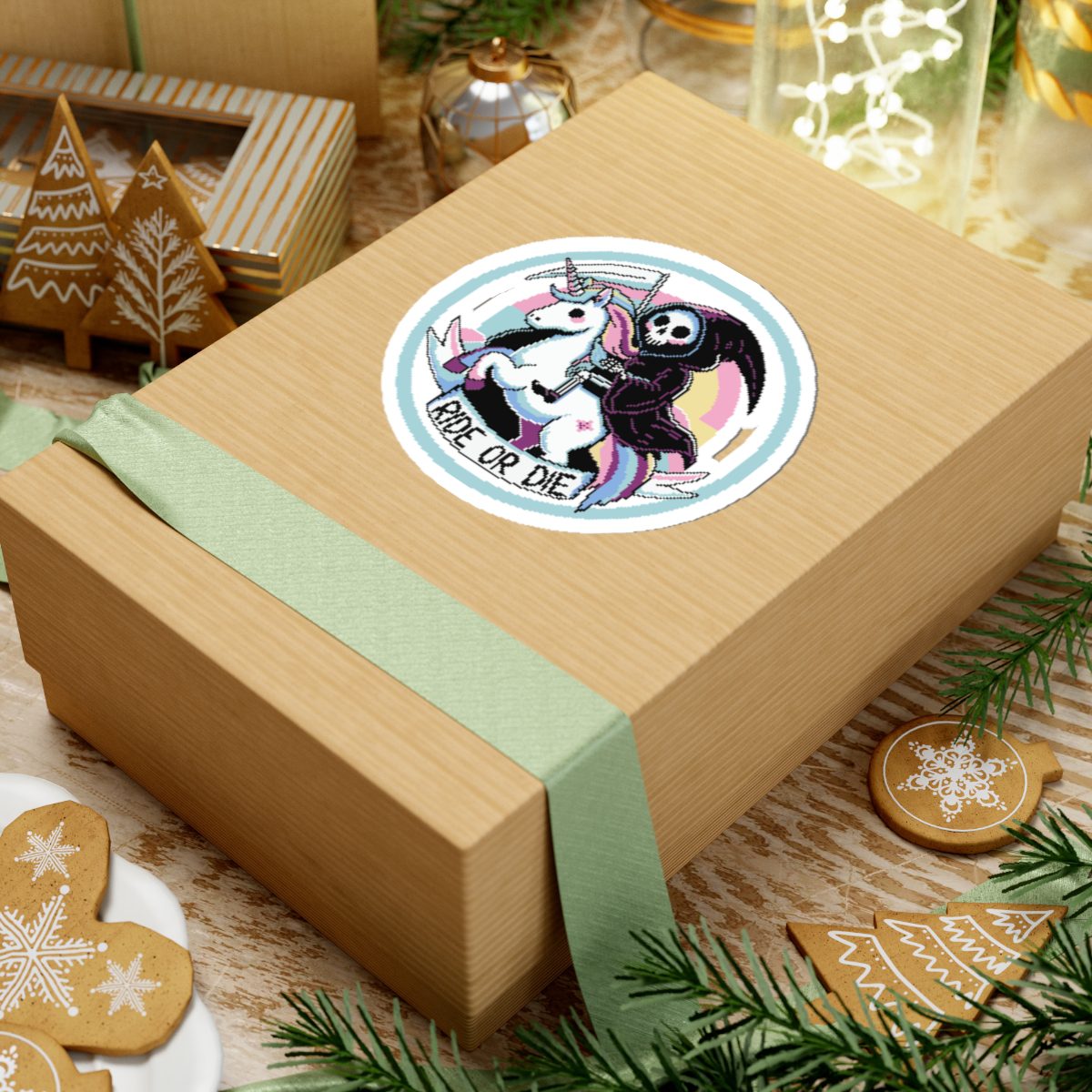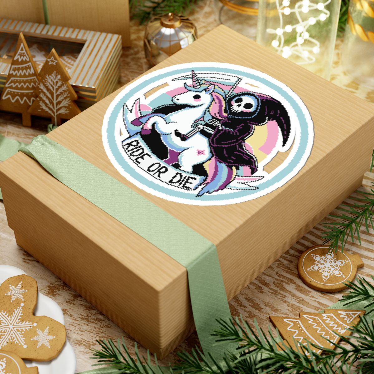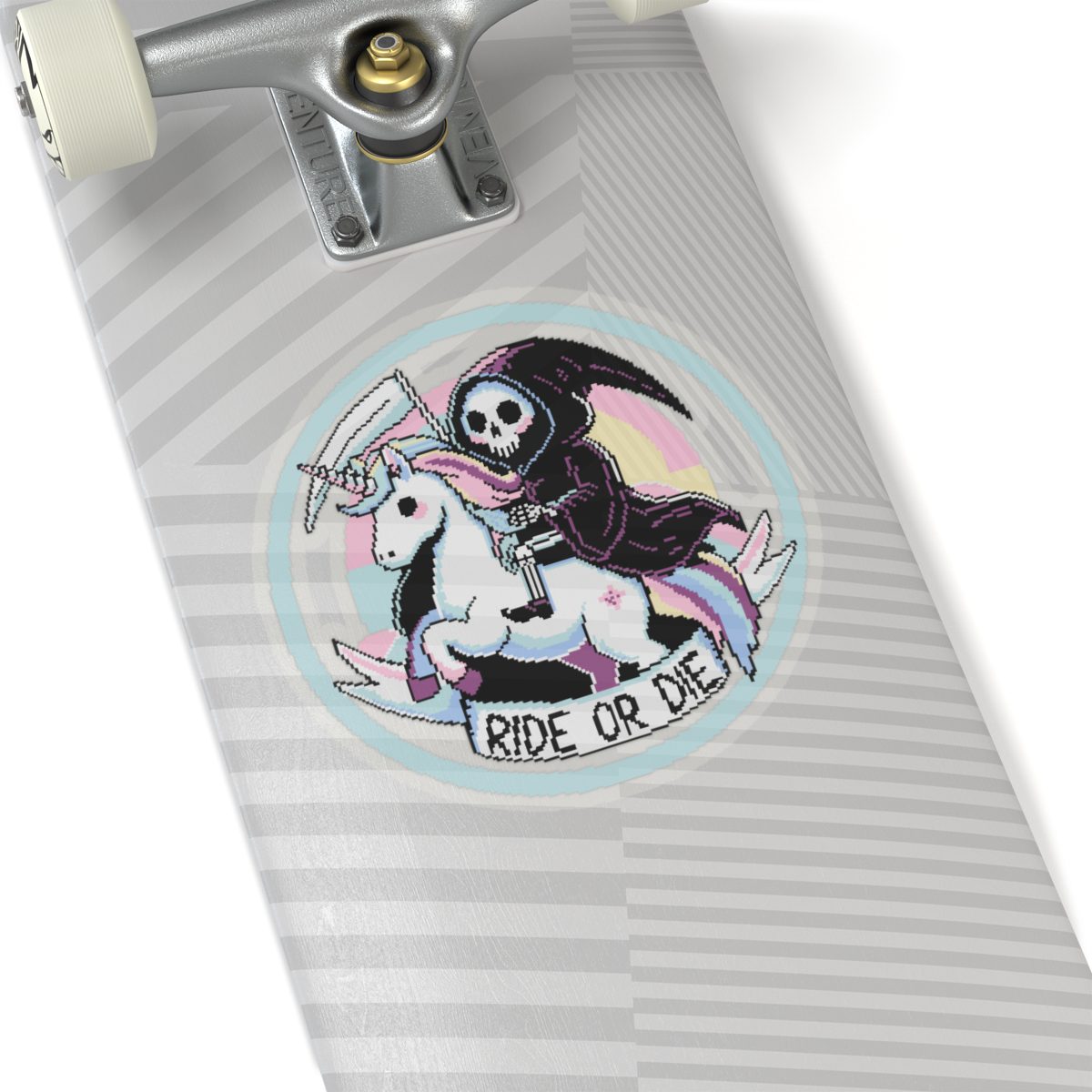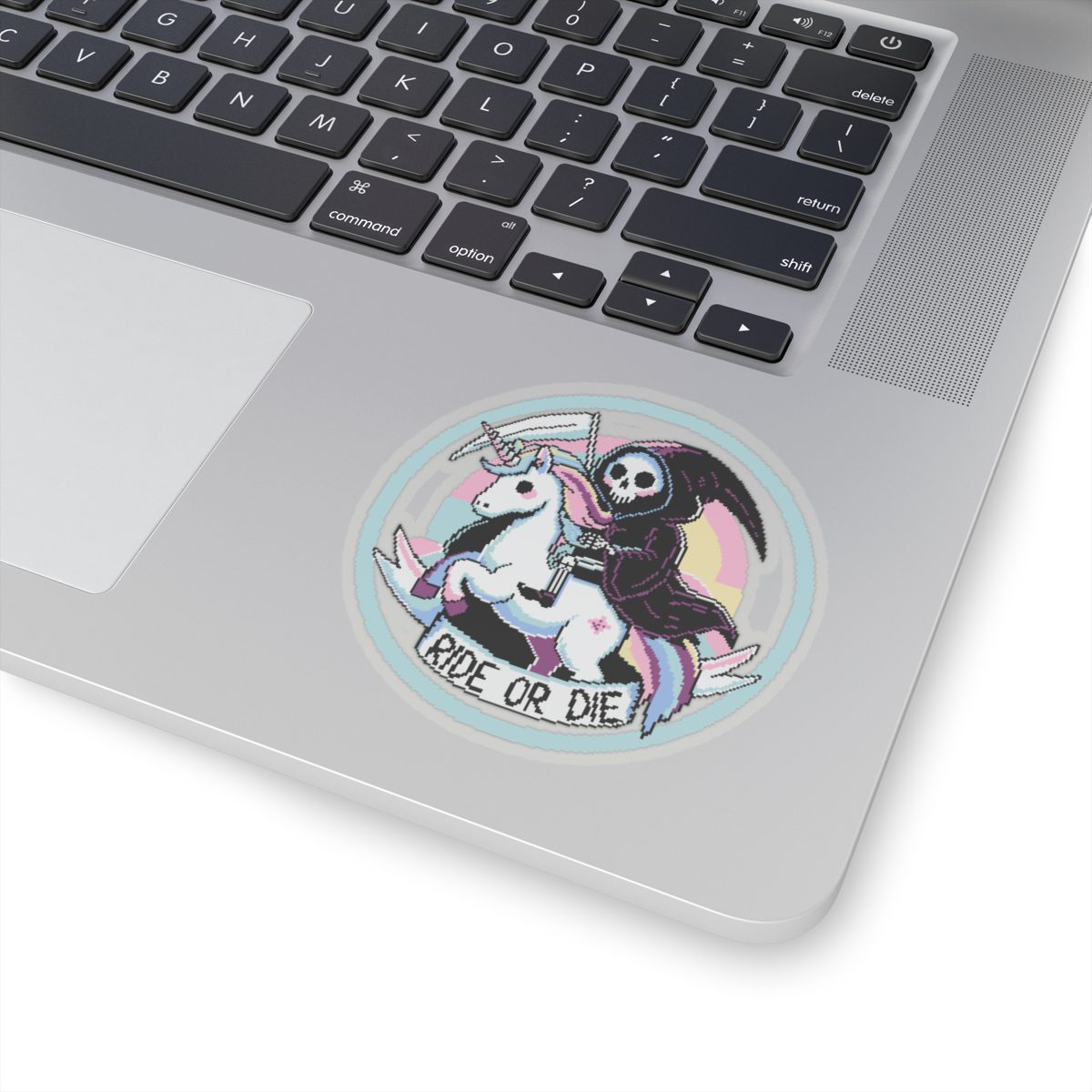 Nothing says loyalty like a scythe-wielding reaper on a rainbow-maned unicorn. The Ride or Die Kiss-Cut Sticker is for the baddies who charge into battle (or brunch) side by side with the underworld’s most fashionable skeleton. Whether you’re slaying enemies or to-do lists, this sticker’s got your back… and your soul.