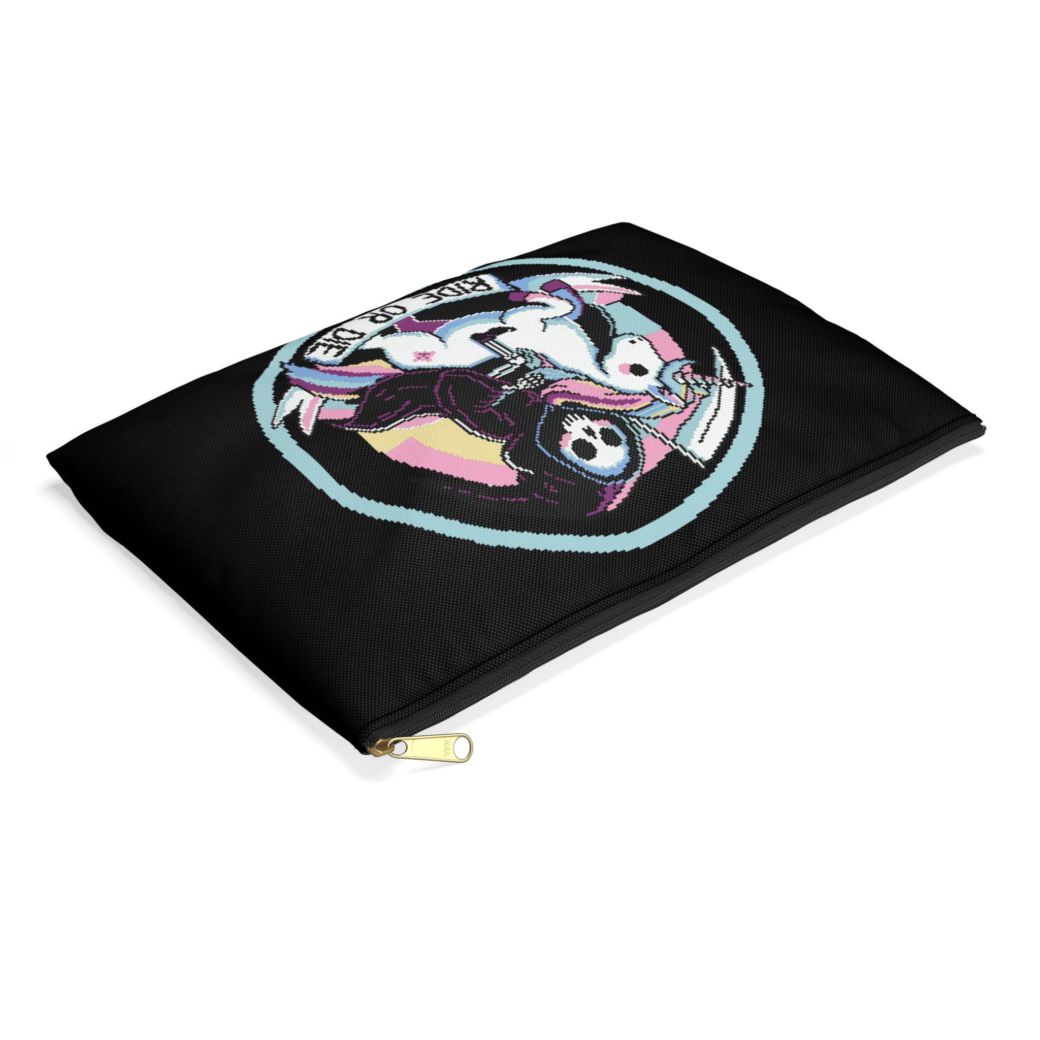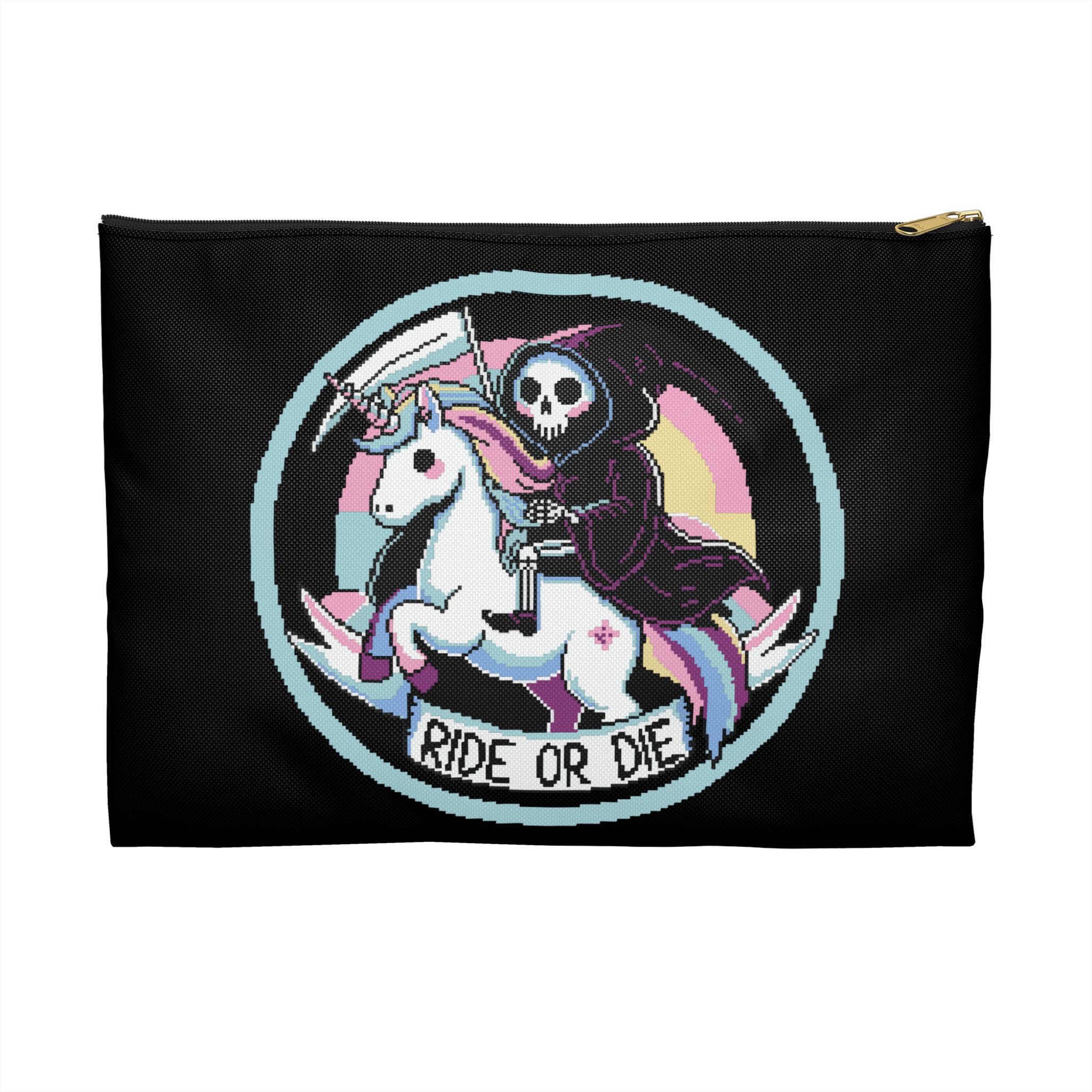 Pastel vibes, hardcore loyalty. The Ride or Die Project Bag features your fave skeletal reaper hitchin’ a ride on a rainbow-maned unicorn, scythe in hand and no chill in sight. This bag doesn’t ask if you’ve got a plan, it just says “get on” and gallops directly into the nearest stitch emergency.