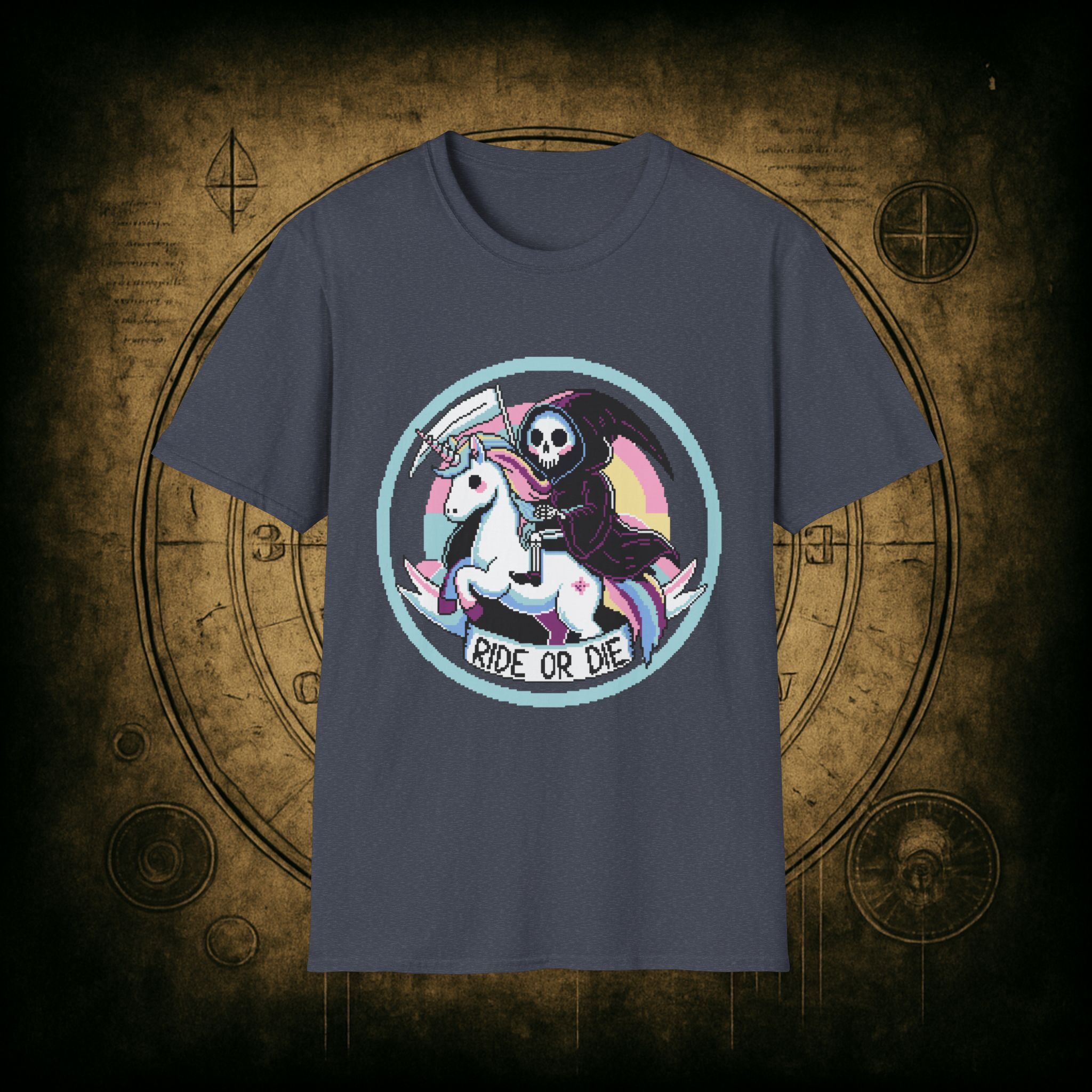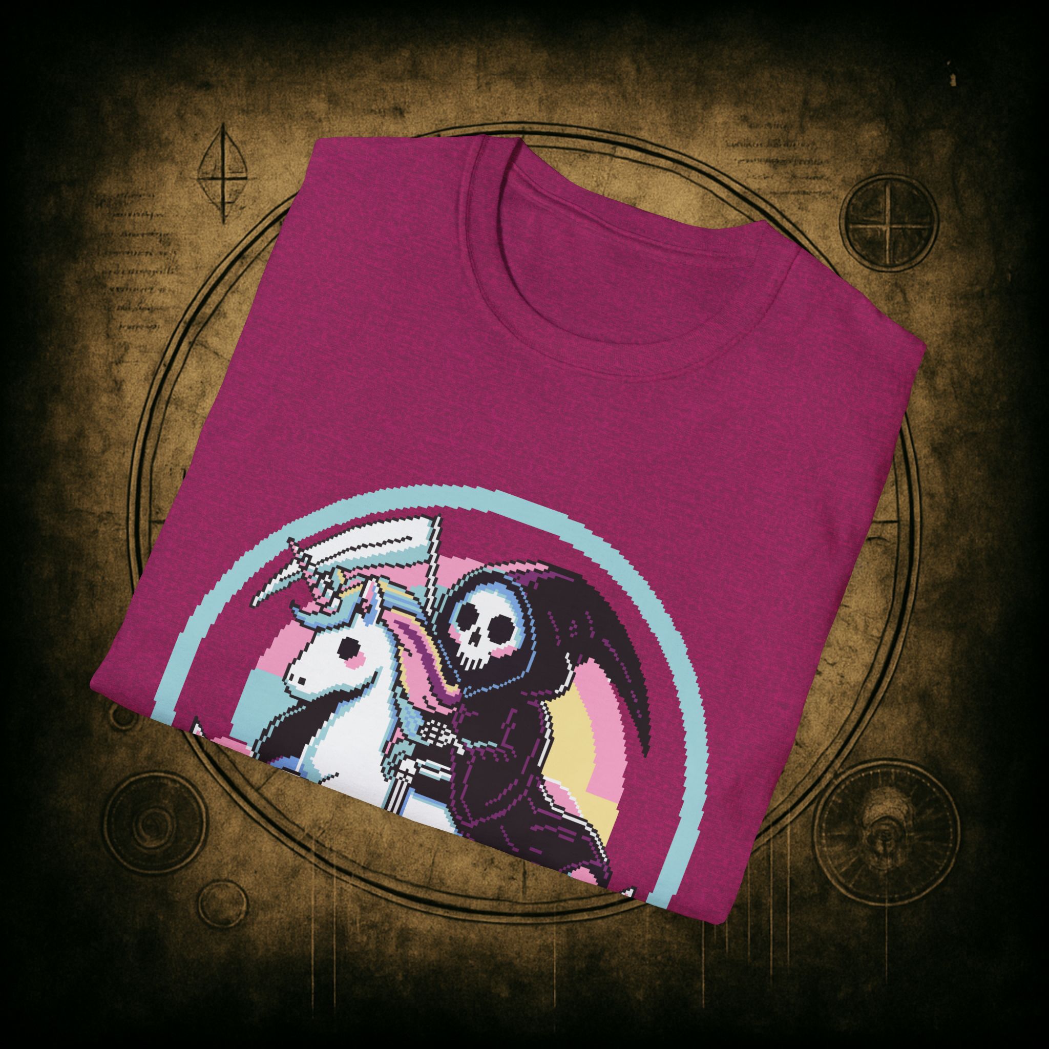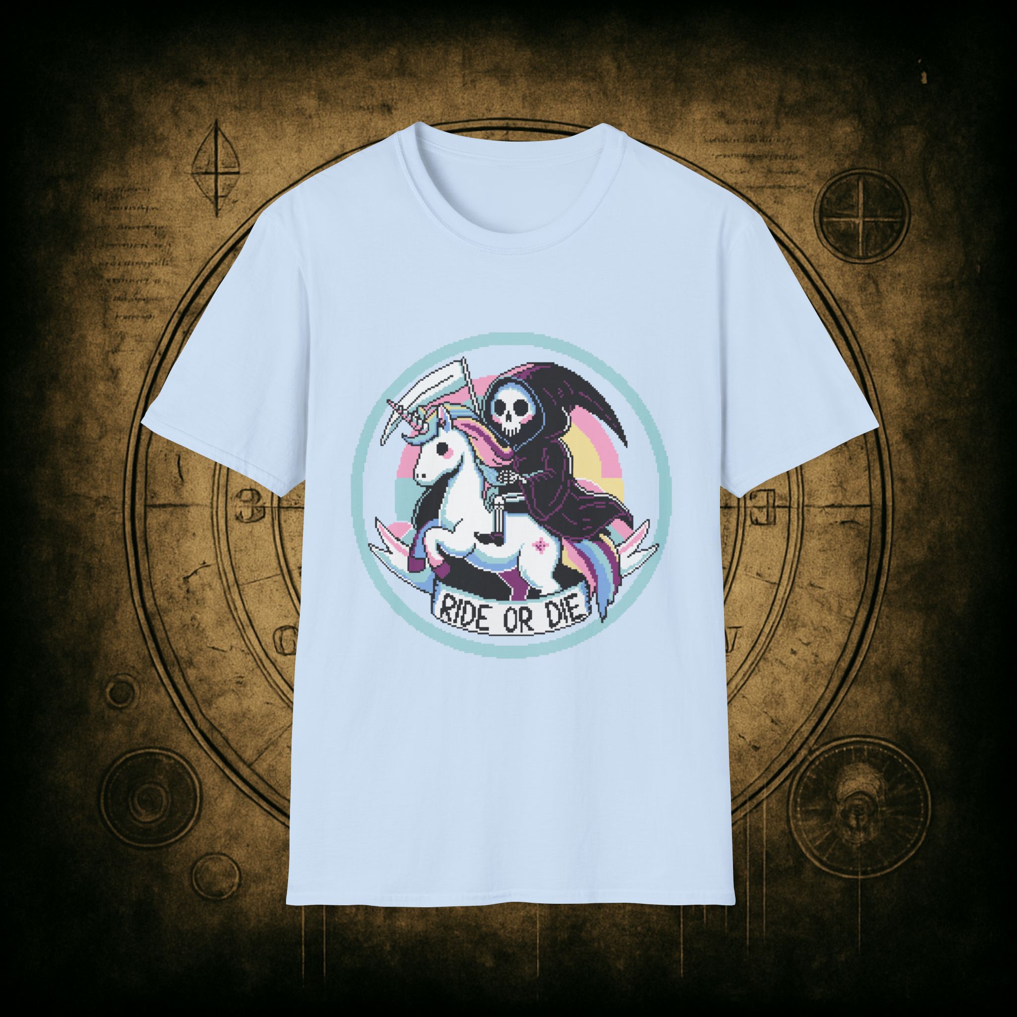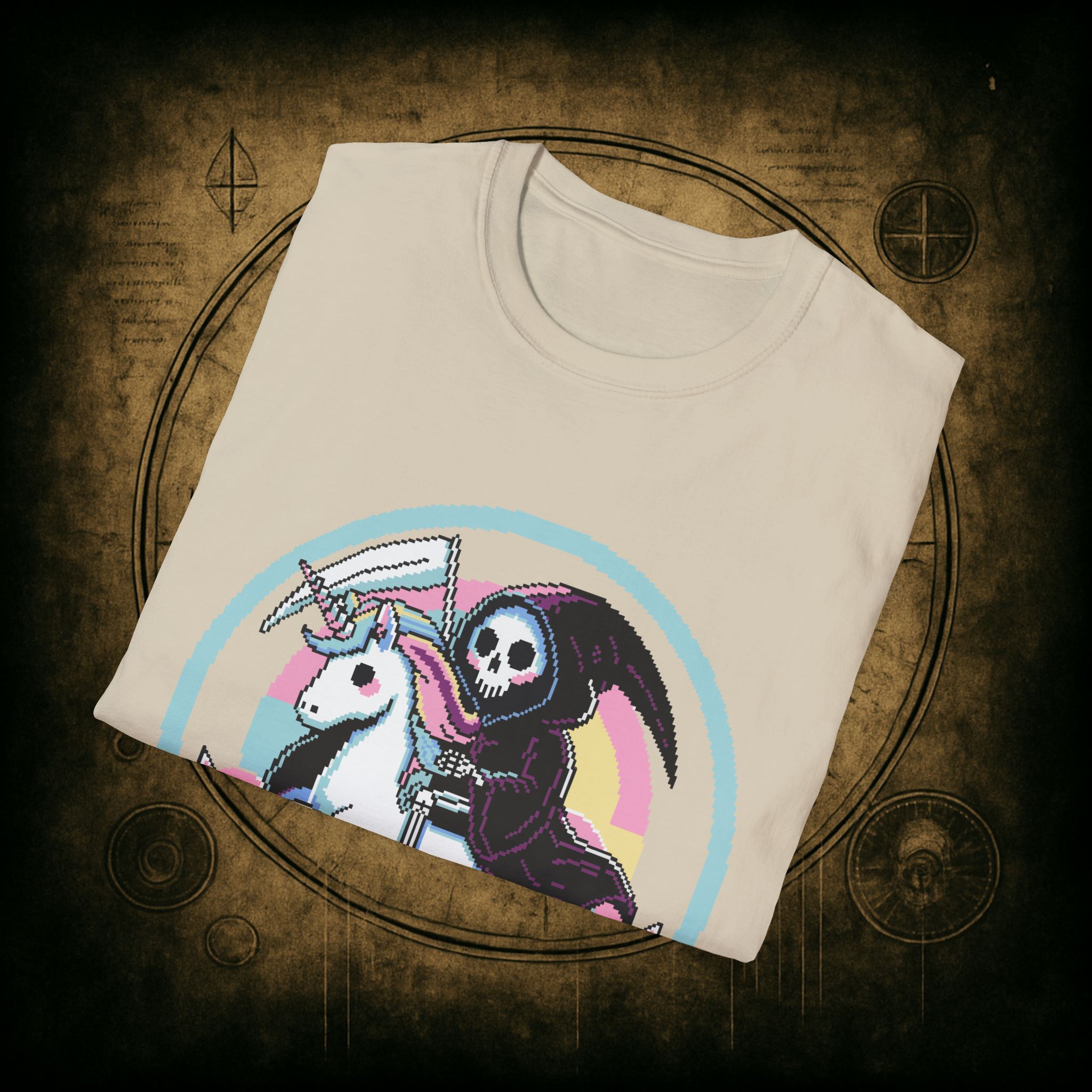 Because when Death rides a unicorn with a pastel rainbow tail and a bad attitude, you know it’s not just a phase. This tee is for the brave, the bold, and the beautifully unhinged who know loyalty is eternal and glitter is non-negotiable.