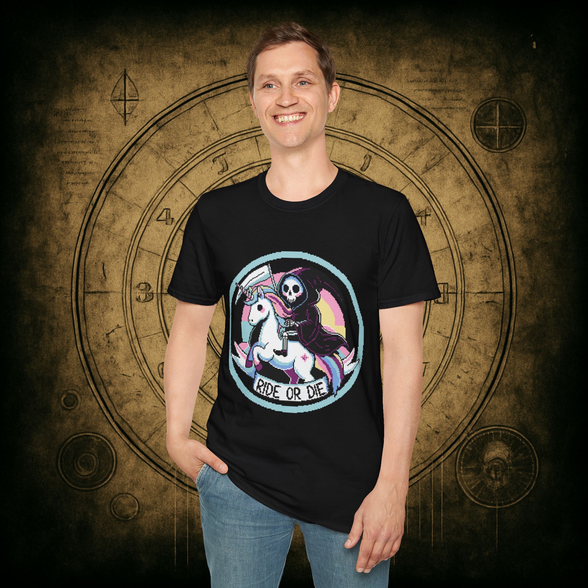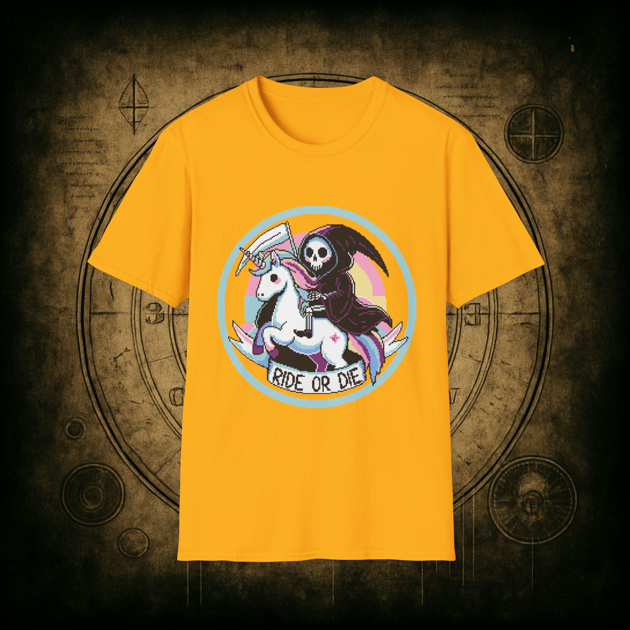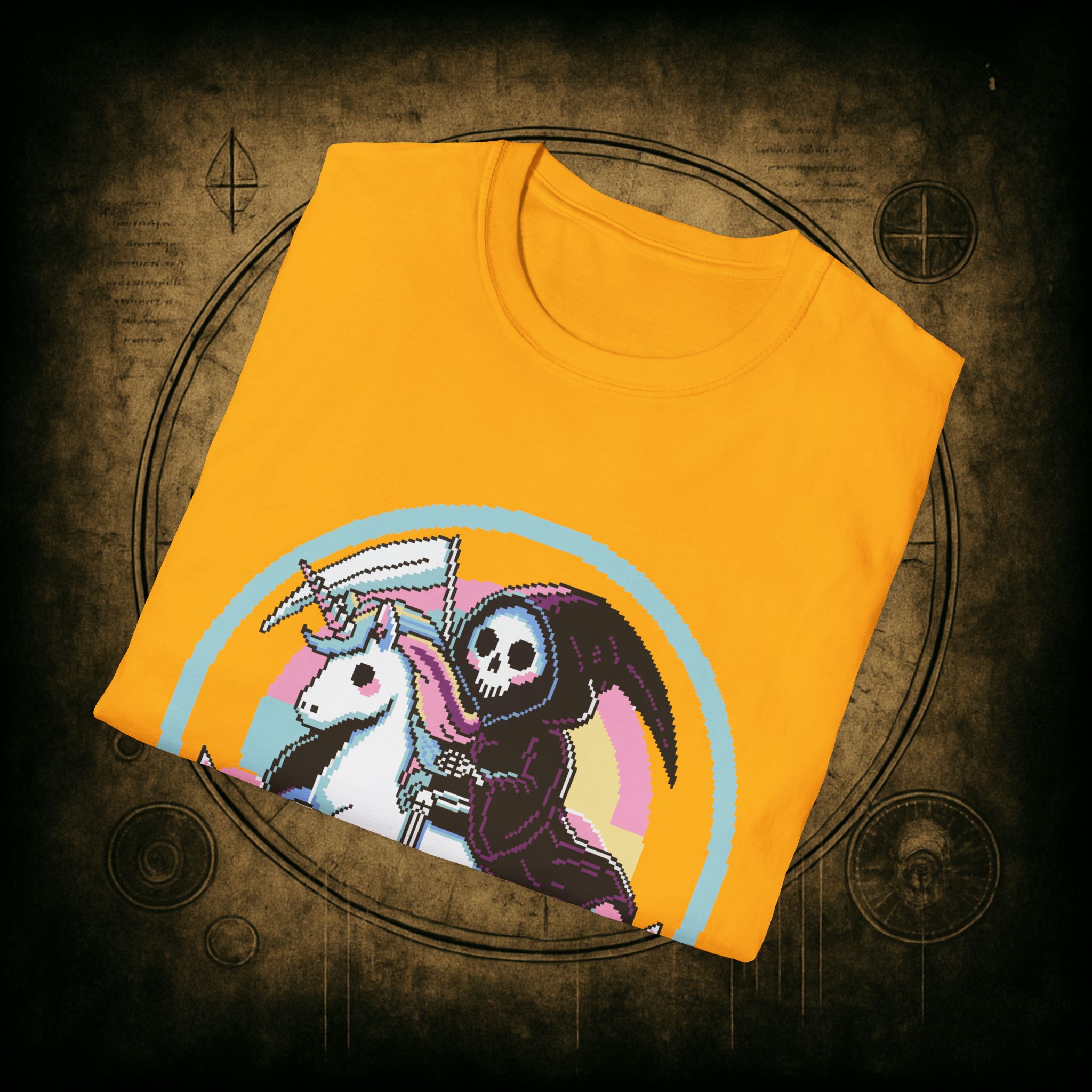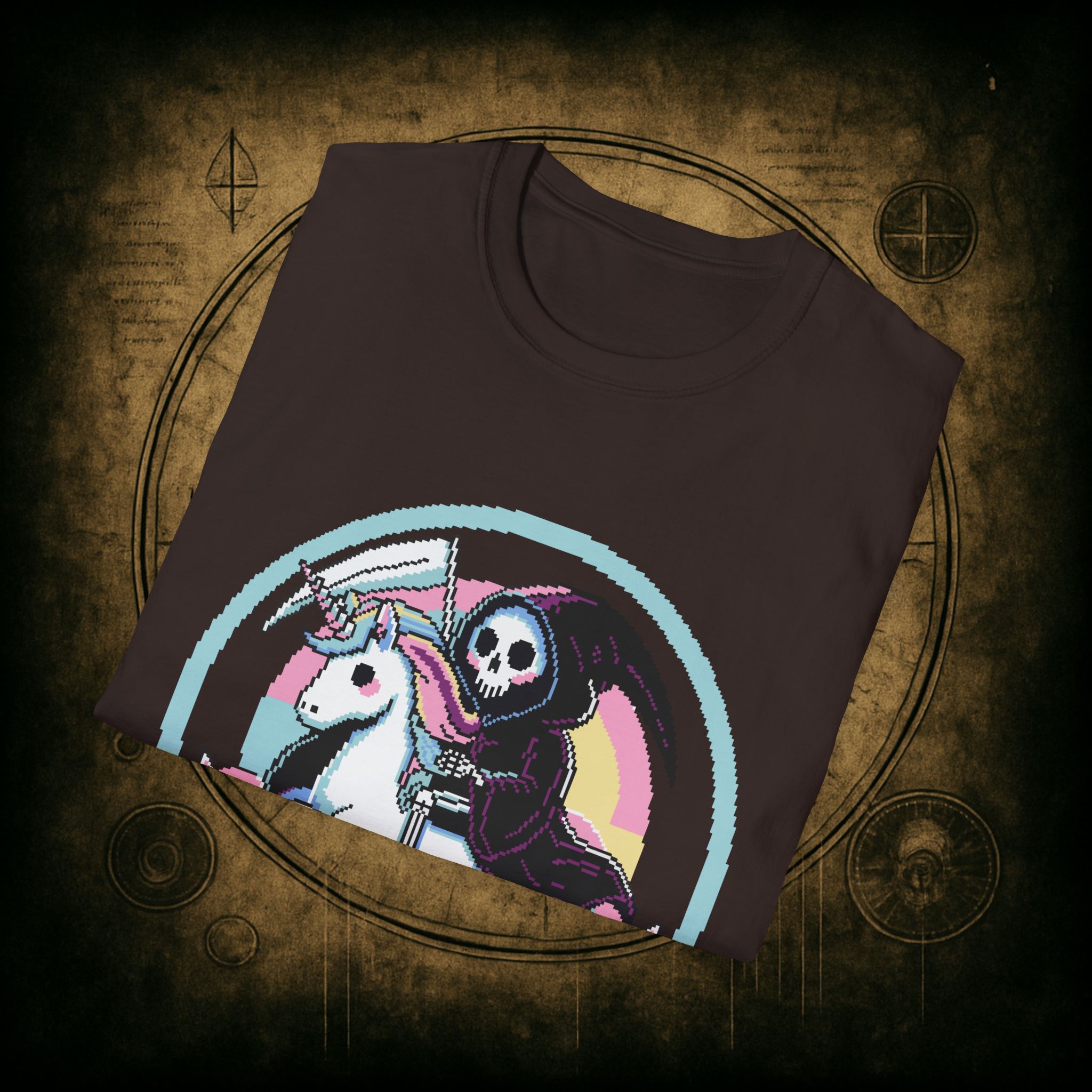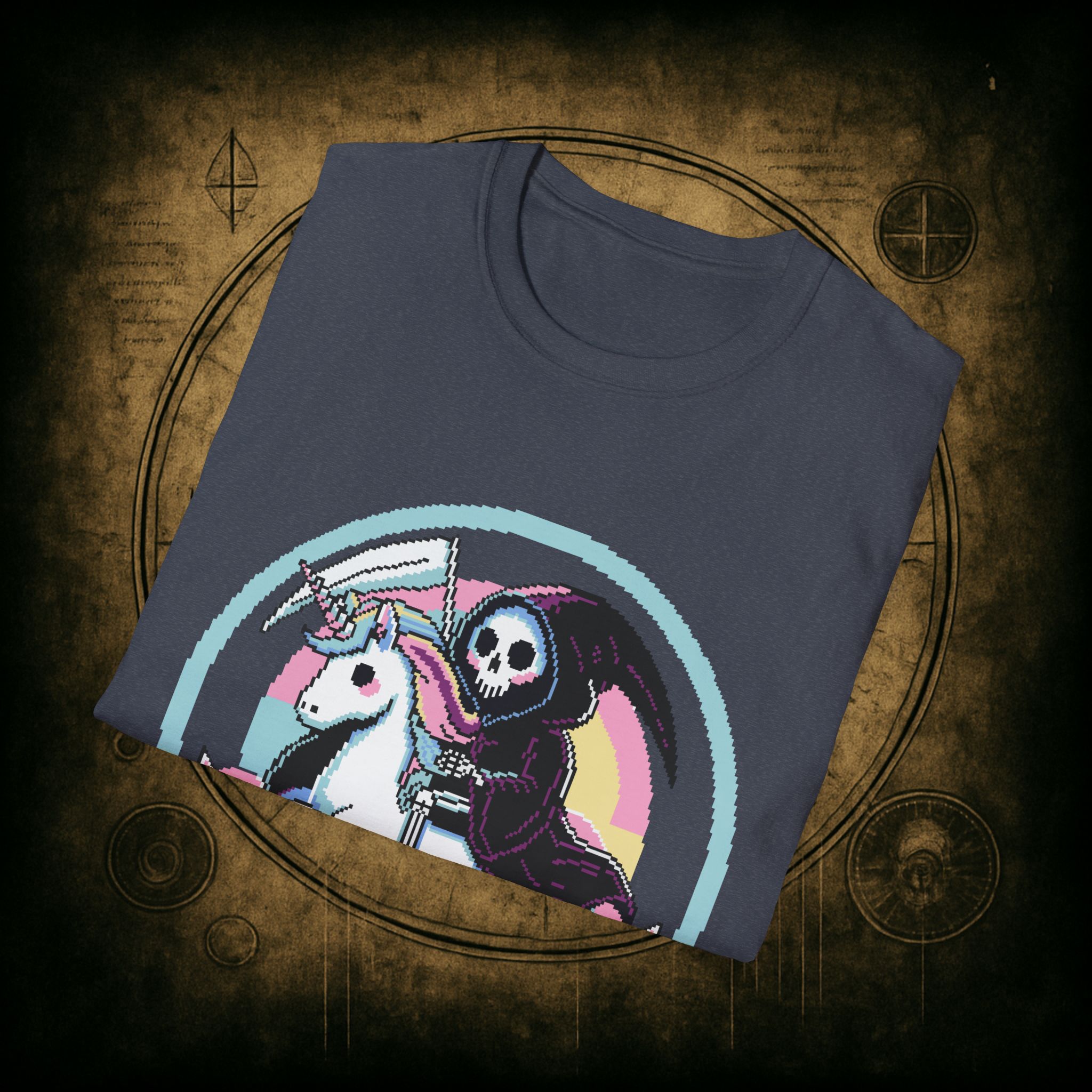 Because when Death rides a unicorn with a pastel rainbow tail and a bad attitude, you know it’s not just a phase. This tee is for the brave, the bold, and the beautifully unhinged who know loyalty is eternal and glitter is non-negotiable.