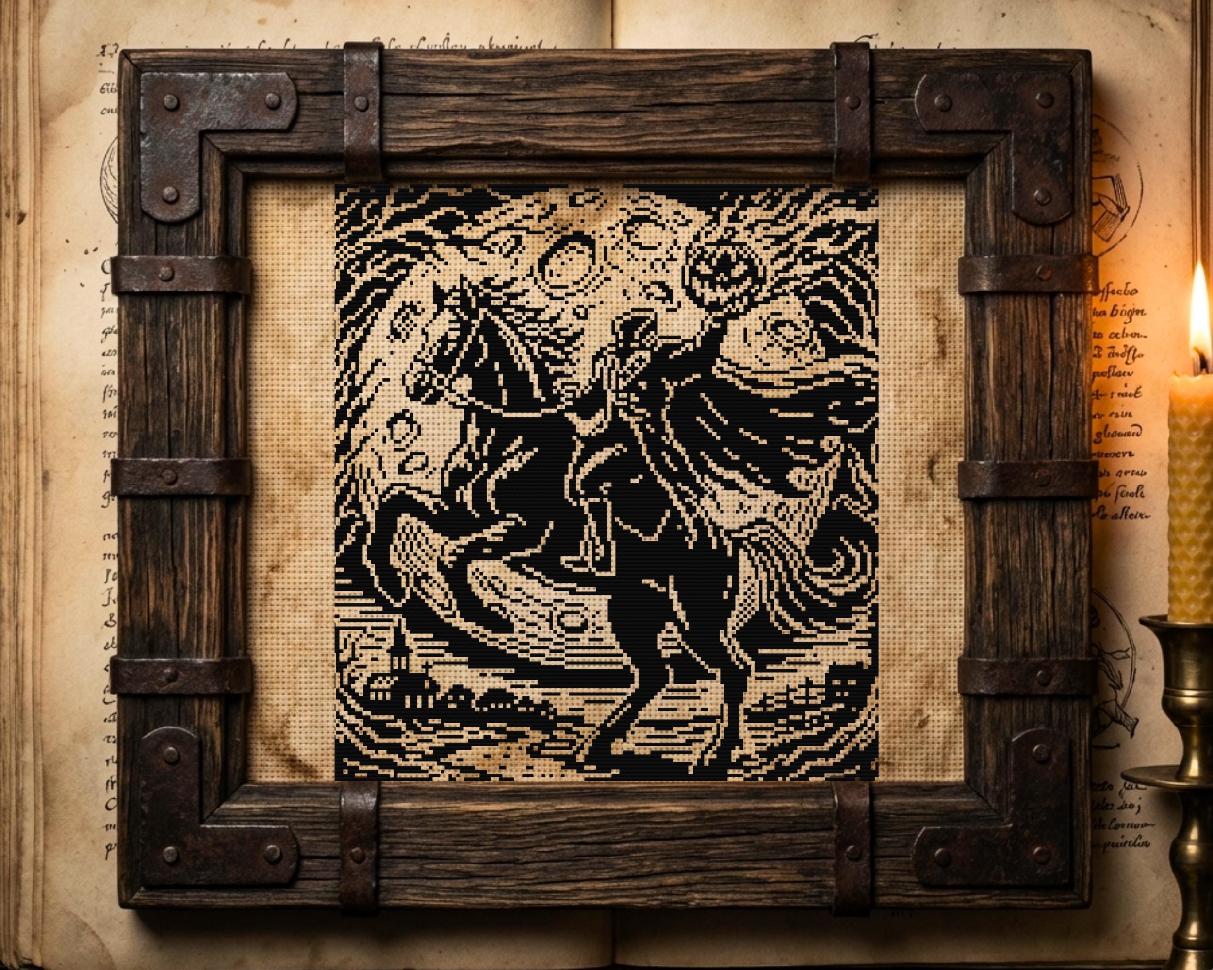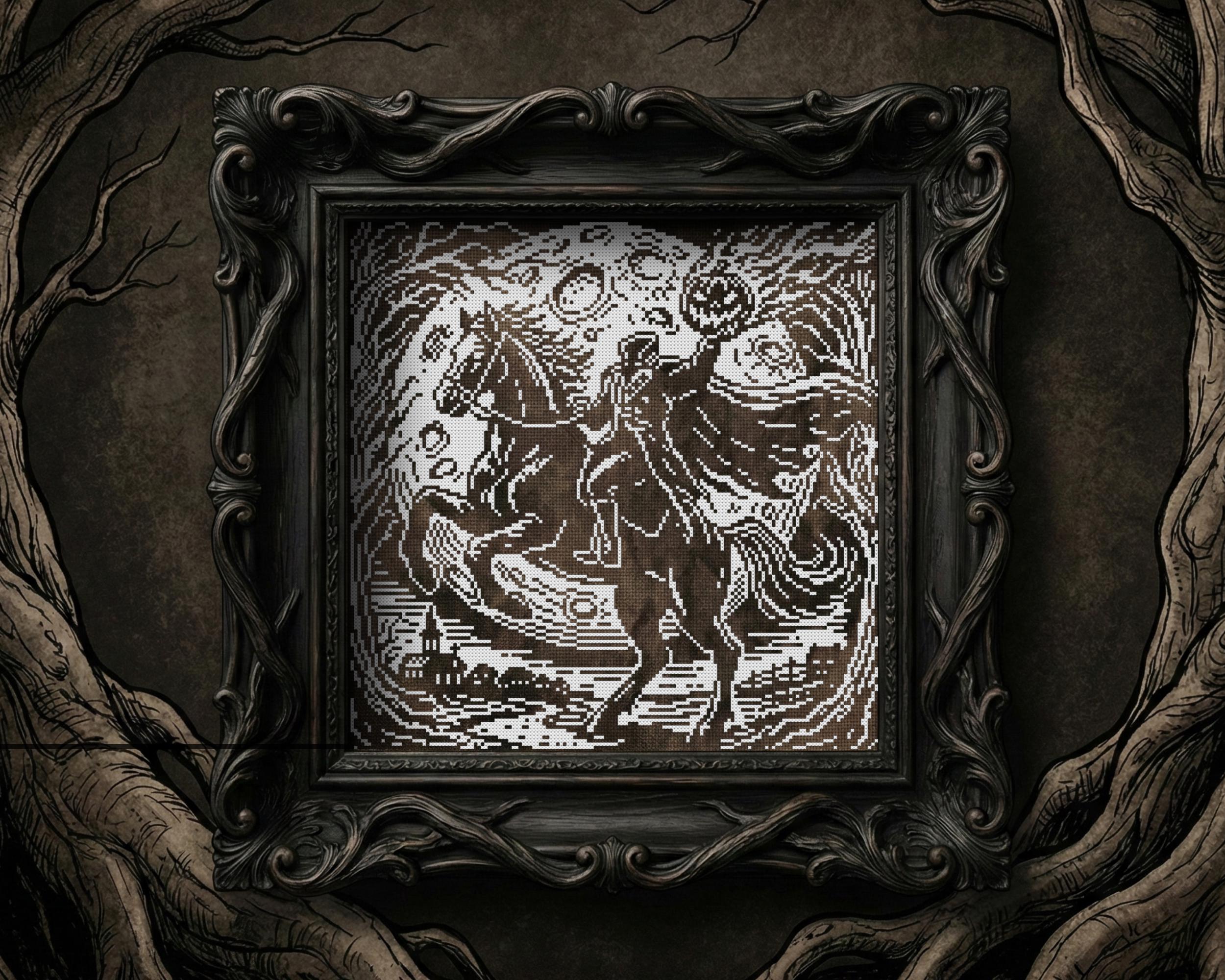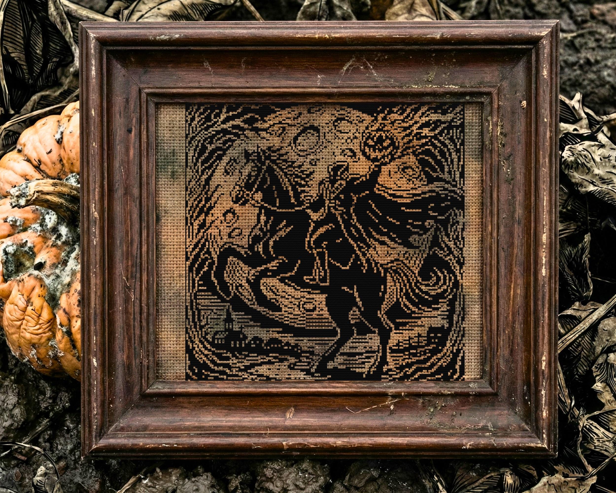 There is a chill in the air, and this headless horseman cross stitch is ready to ride straight out of the legend and into your living room. If you have been hunting for the perfect sleepy hollow cross stitch to celebrate the season, this design is hauntingly perfect. It is the ultimate Halloween cross stitch project for anyone who loves a ghost story with a little less… head.