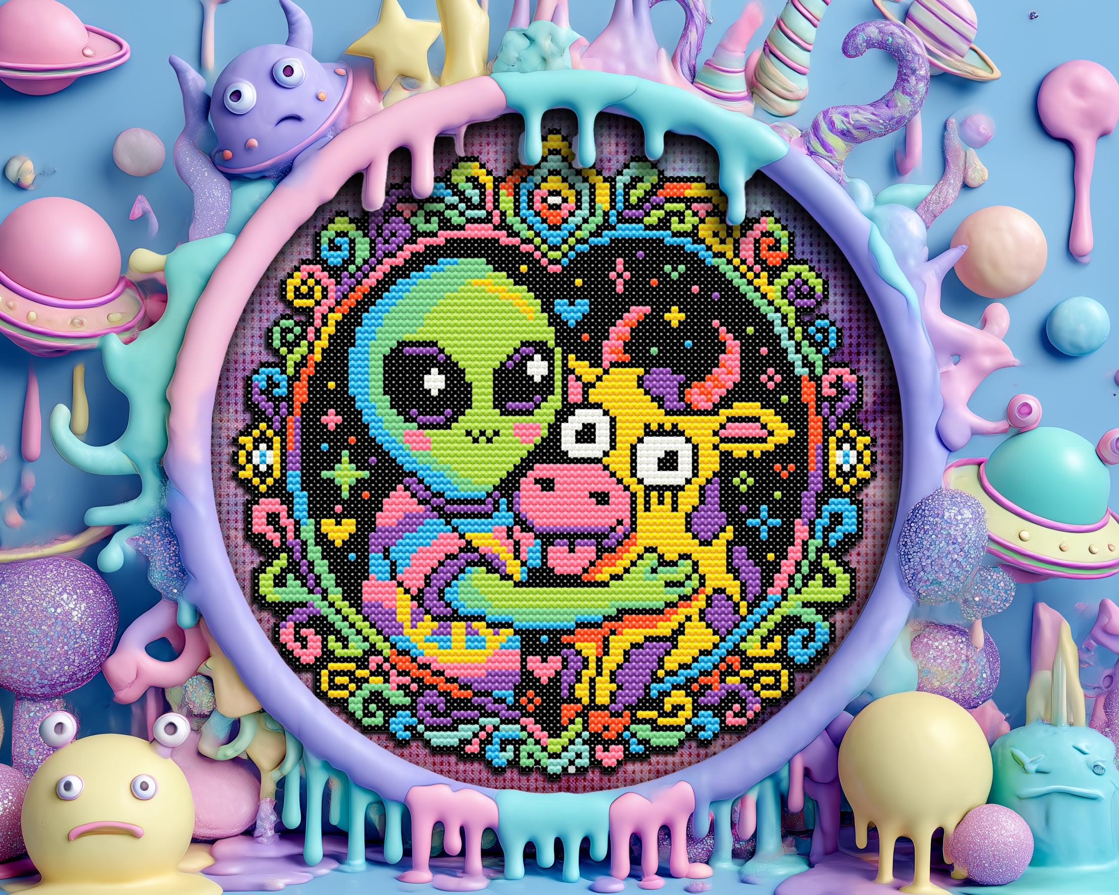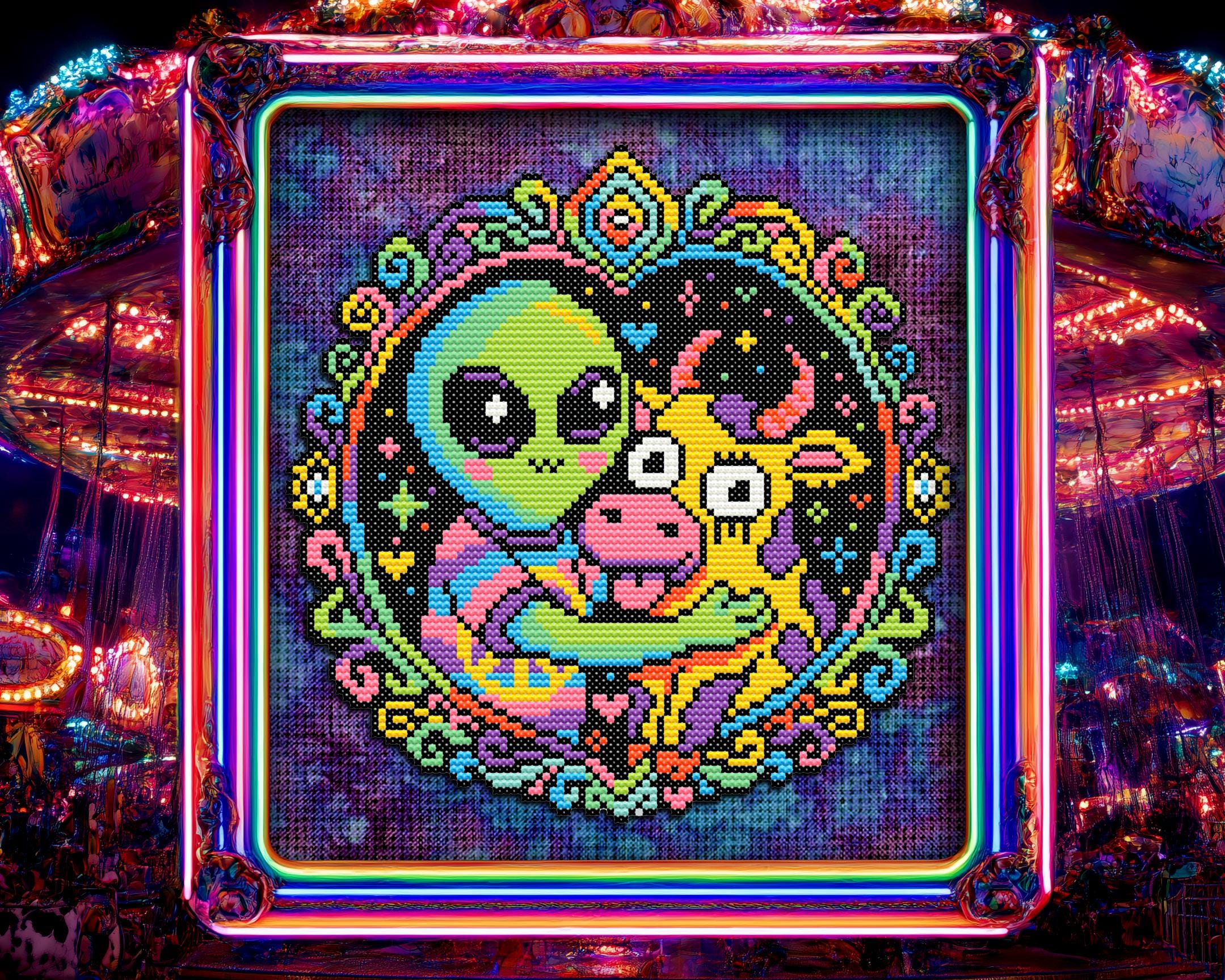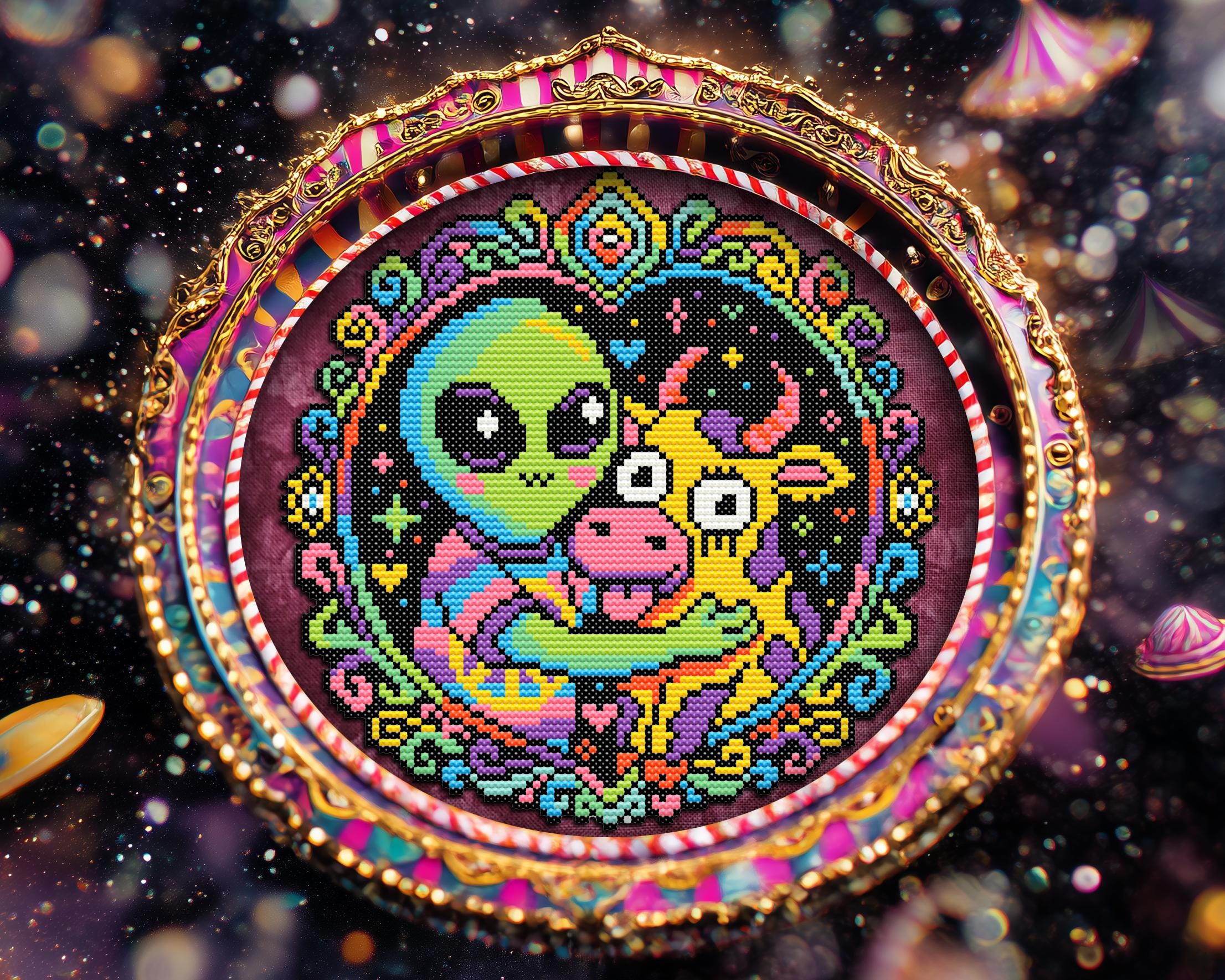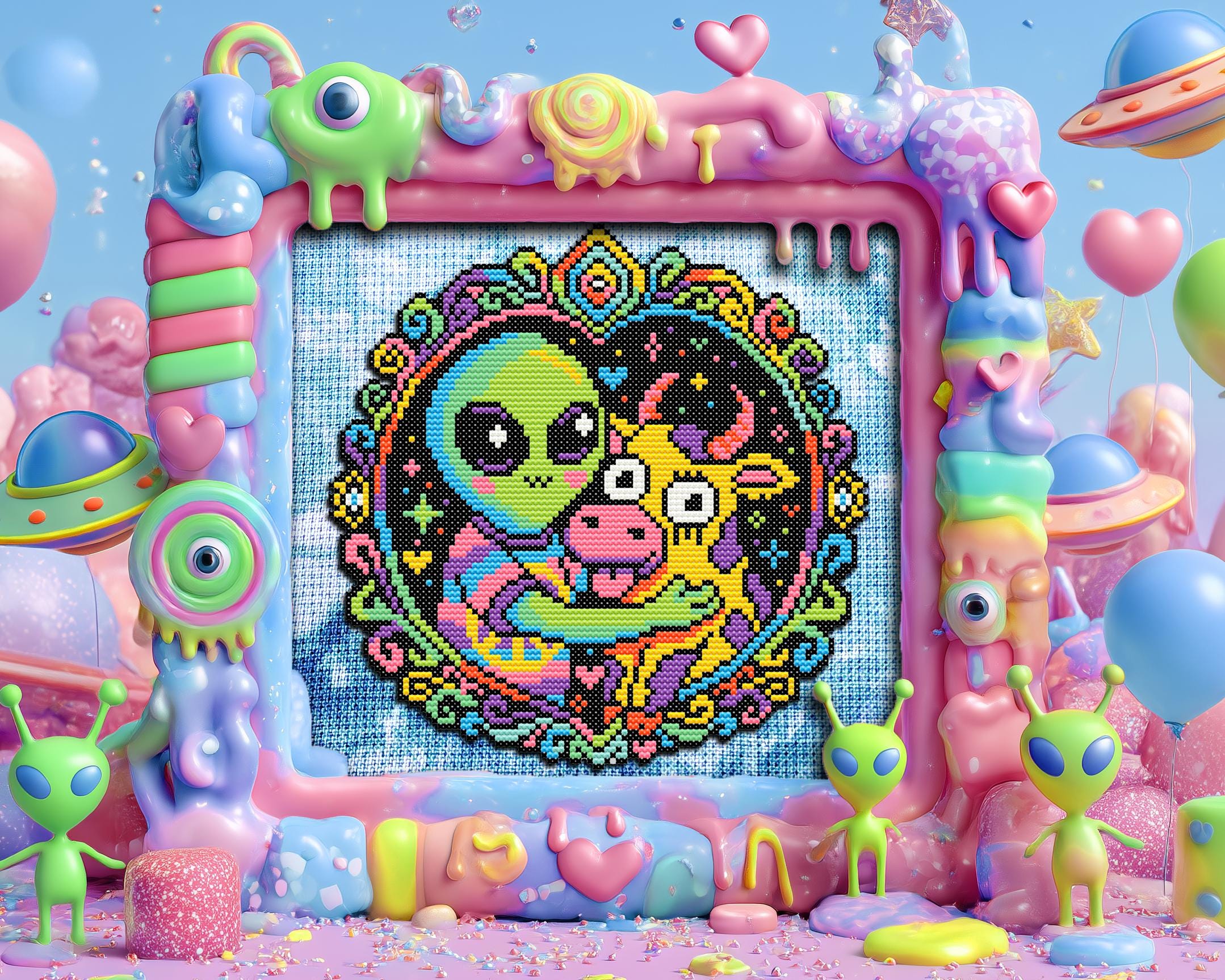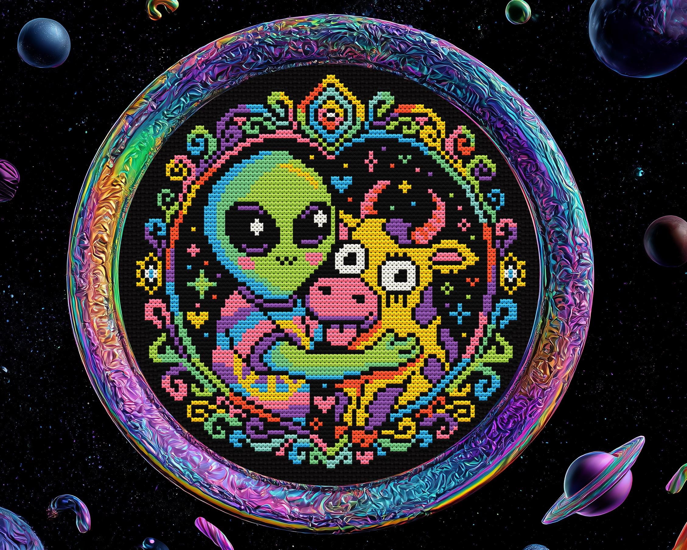 A lime-green space bean hugging their derpy moo-friend under a galaxy confetti halo, pure friendship goals rendered as alien cross stitch romance and dopamine-bright neon cross stitch sparkle. The palette is sugar-rush pastel goth cross stitch perfection, the faces are adorable enough to qualify as kawaii cross stitch and sweet little chibi cross stitch, and the whole frame swirls with whimsical cross stitch drama like your cauldron just brewed a rainbow. It’s the kind of wall candy that whispers i want to believe while side-eyeing your snack stash. Stitch-wise, she’s approachable witchcraft, a joyfully chaotic hug of moooon-magic that satisfies your “quick win” itch with easy cross stitch flow and bite-size mini cross stitch sessions, yet still struts like couture snarky cross stitch and giggle-worthy funny cross stitch when you show it off. Whether you’re decking out your lair for pumpkin season with some unapologetically cute halloween cross stitch, chasing a pun-happy constellation of typo charm with rebellious spce cross stitch, or rounding out your barn-meets-Milky-Way collection with gleefully bovine cow Cross stitch, this design is your neon portal to weird, tender, utterly cosmic love. 🖤