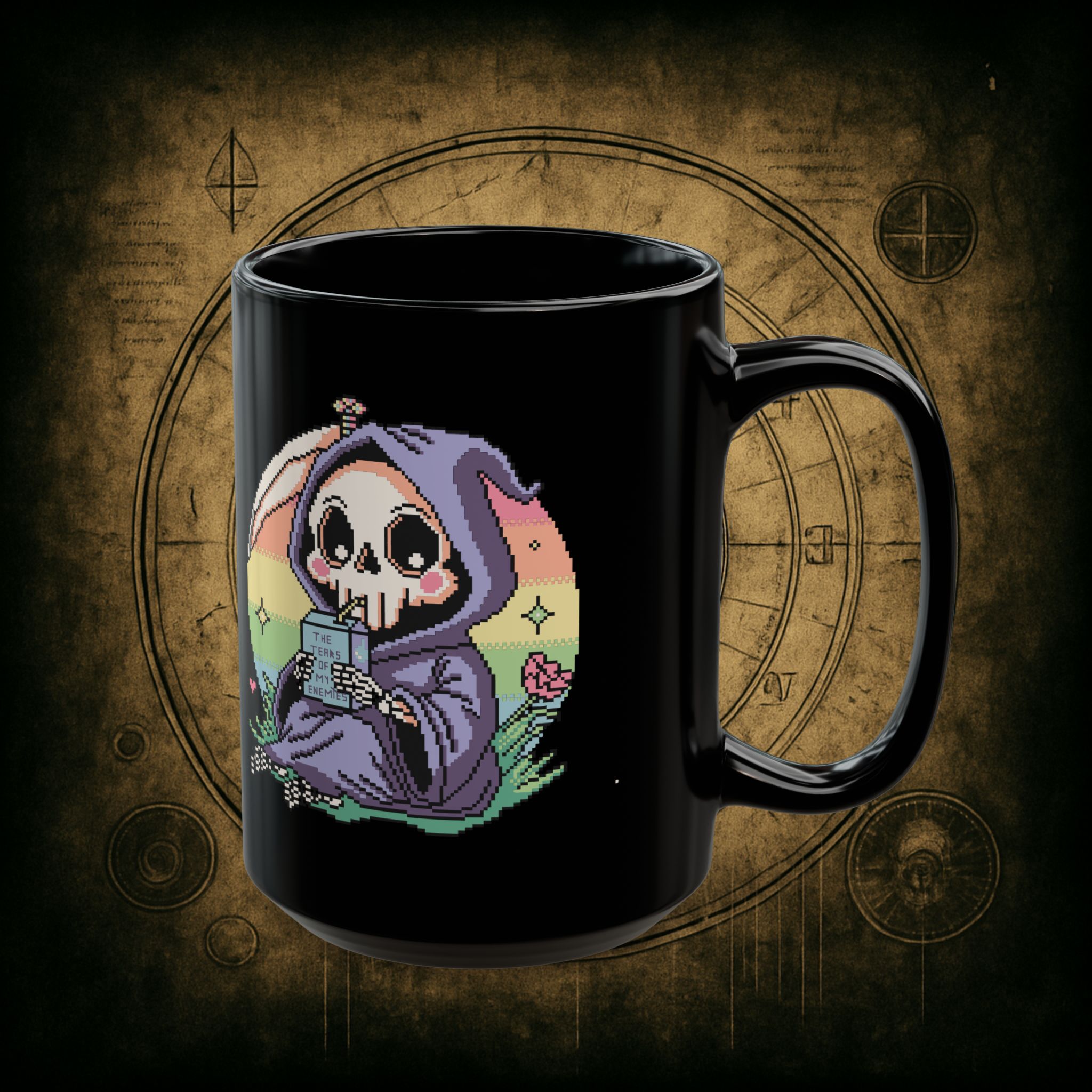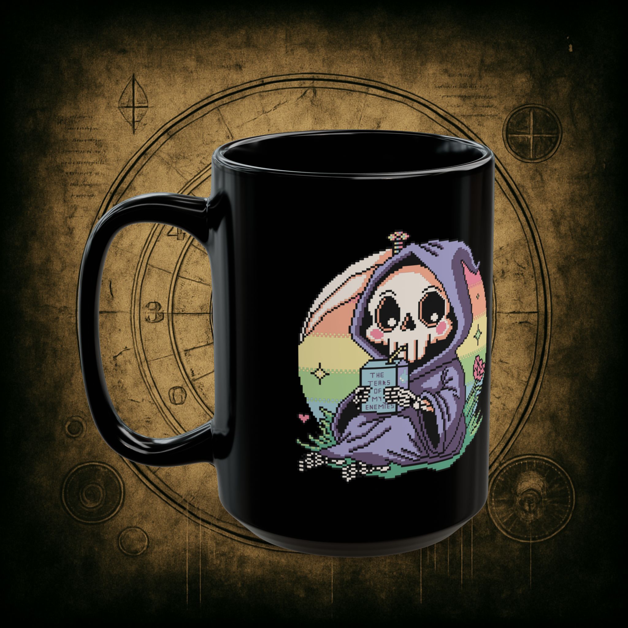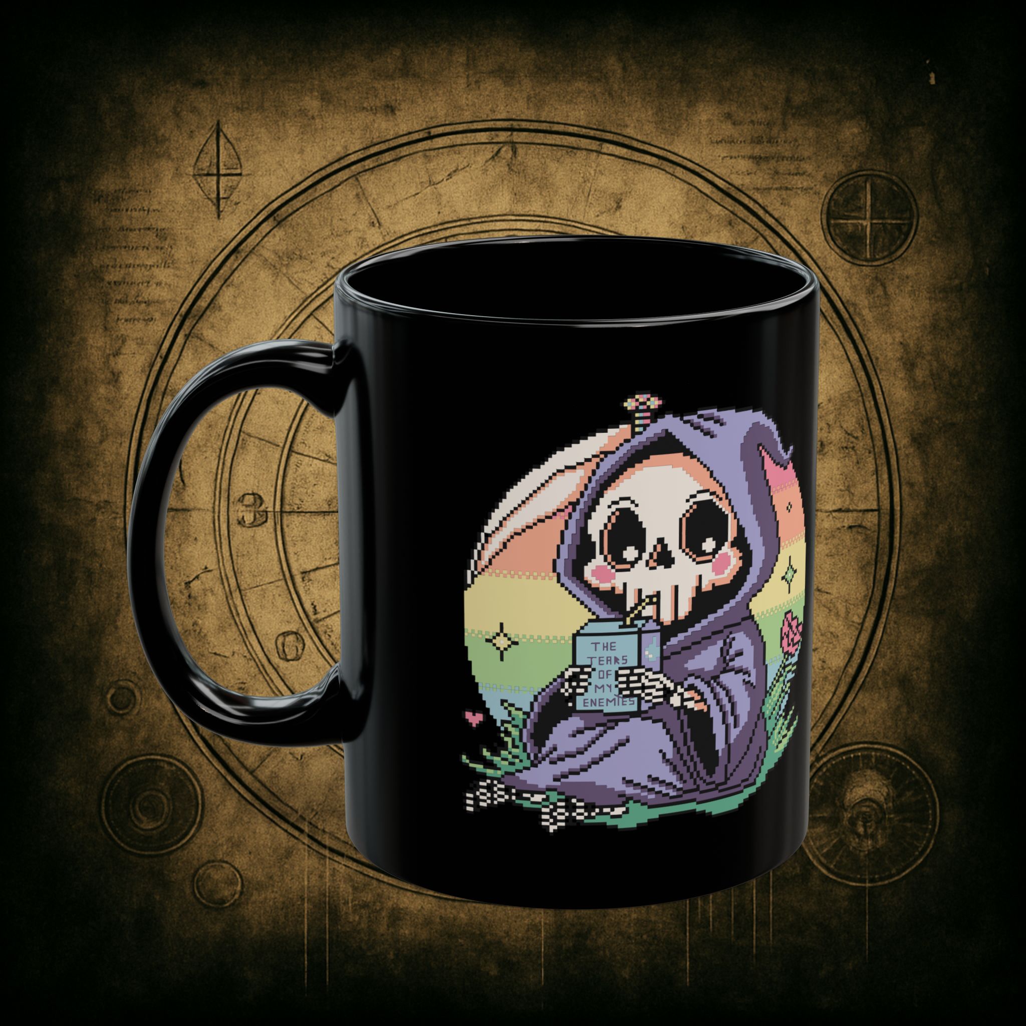 Sweet. Salty. Petty. This baby reaper’s got pastel eyes, a deadly aura, and a juice box labeled “The Tears of My Enemies.” Honestly, it’s giving peace, but make it vengeful.