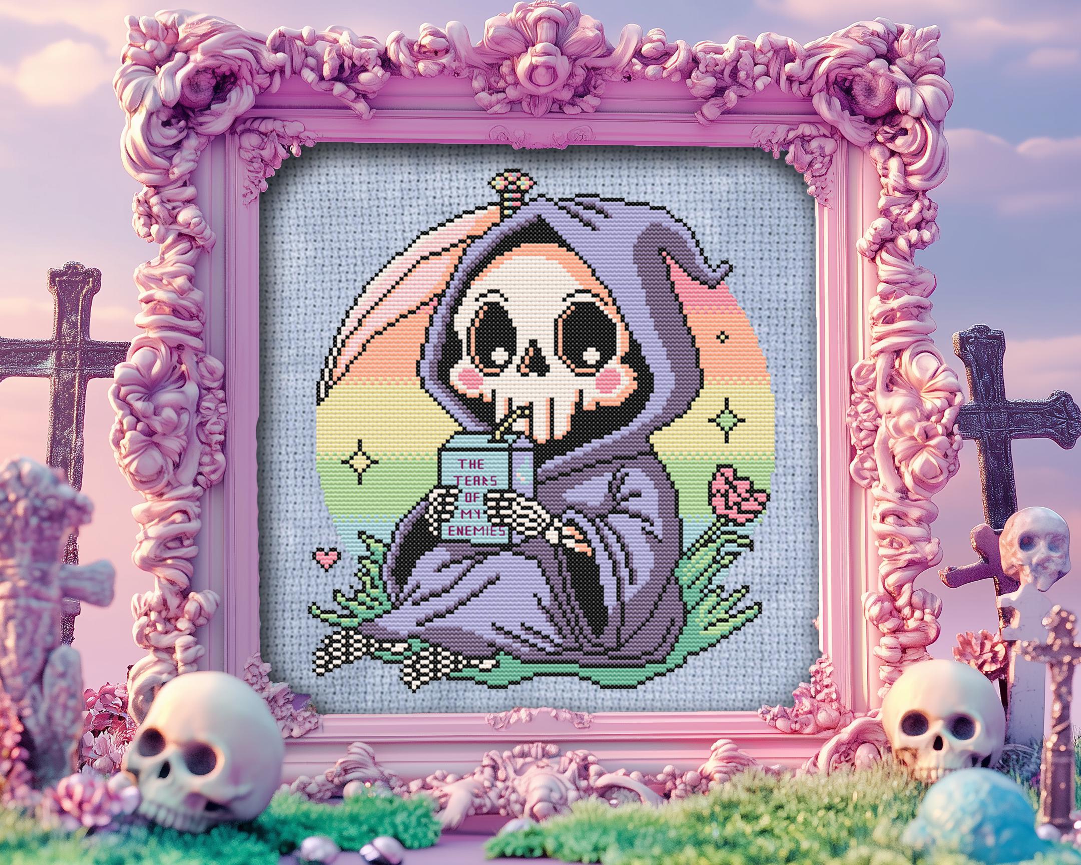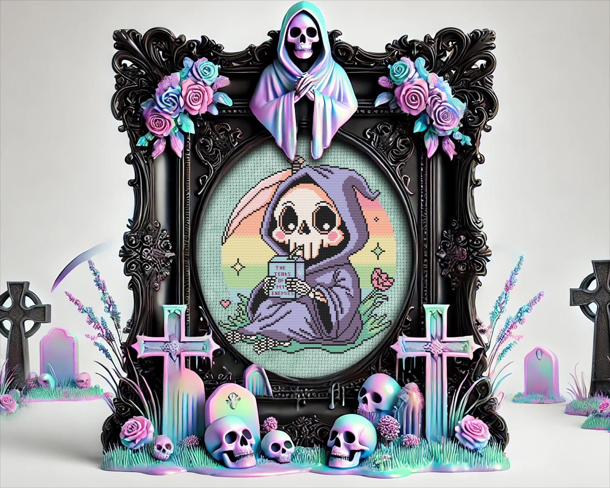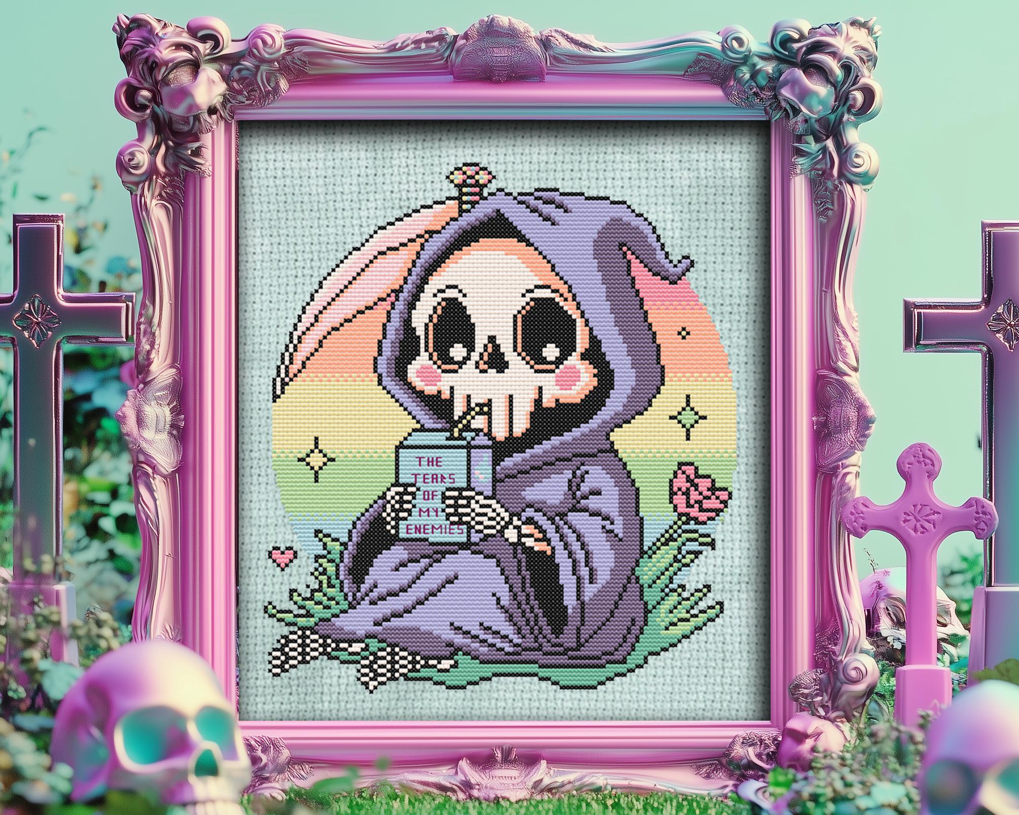 Why sip on the ordinary when you can quench your thirst with the tears of your enemies? This whimsical grim reaper is doing just that, cuddled up in a lush patch of green under a pastel goth sky, rocking an outfit Morticia would envy. Inspired by the infamous line, I drink the tears of my enemies and crafted with kawaii-meets-macabre charm, this Halloween cross stitch is a playful twist for anyone who loves funny cross stitch with a side of snark.
