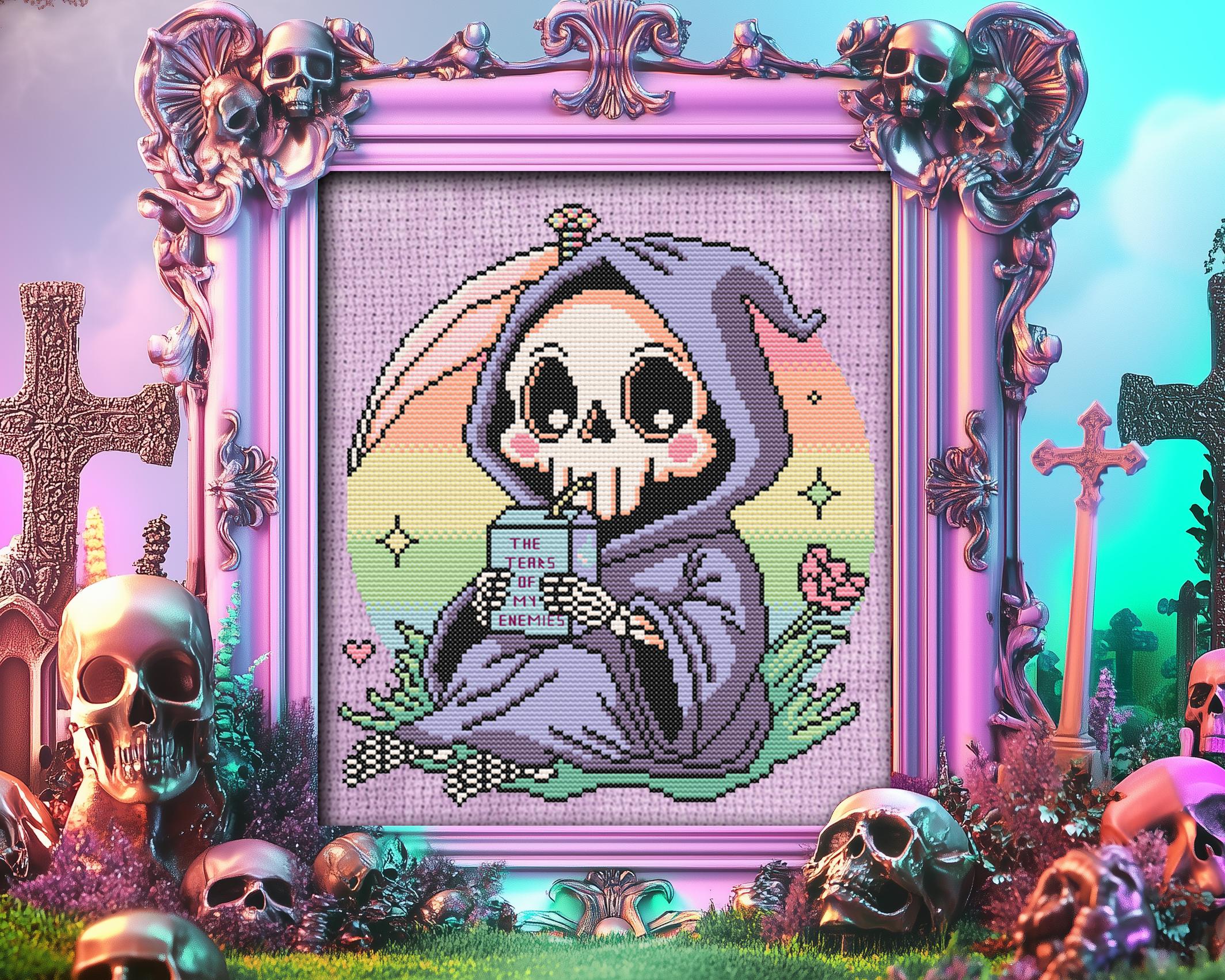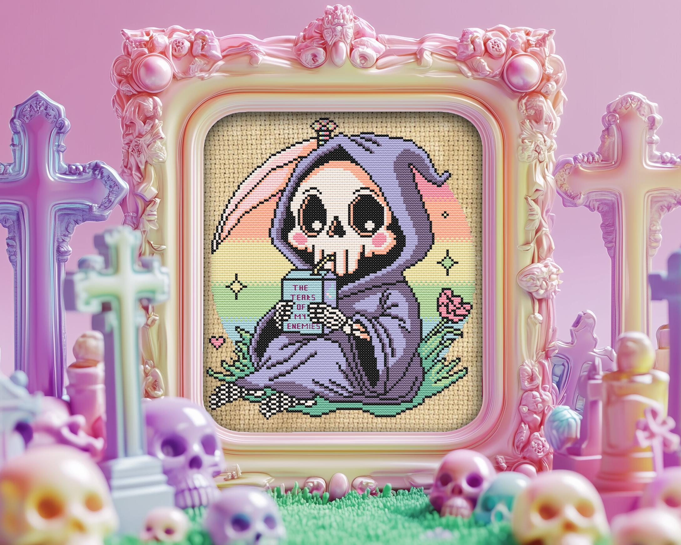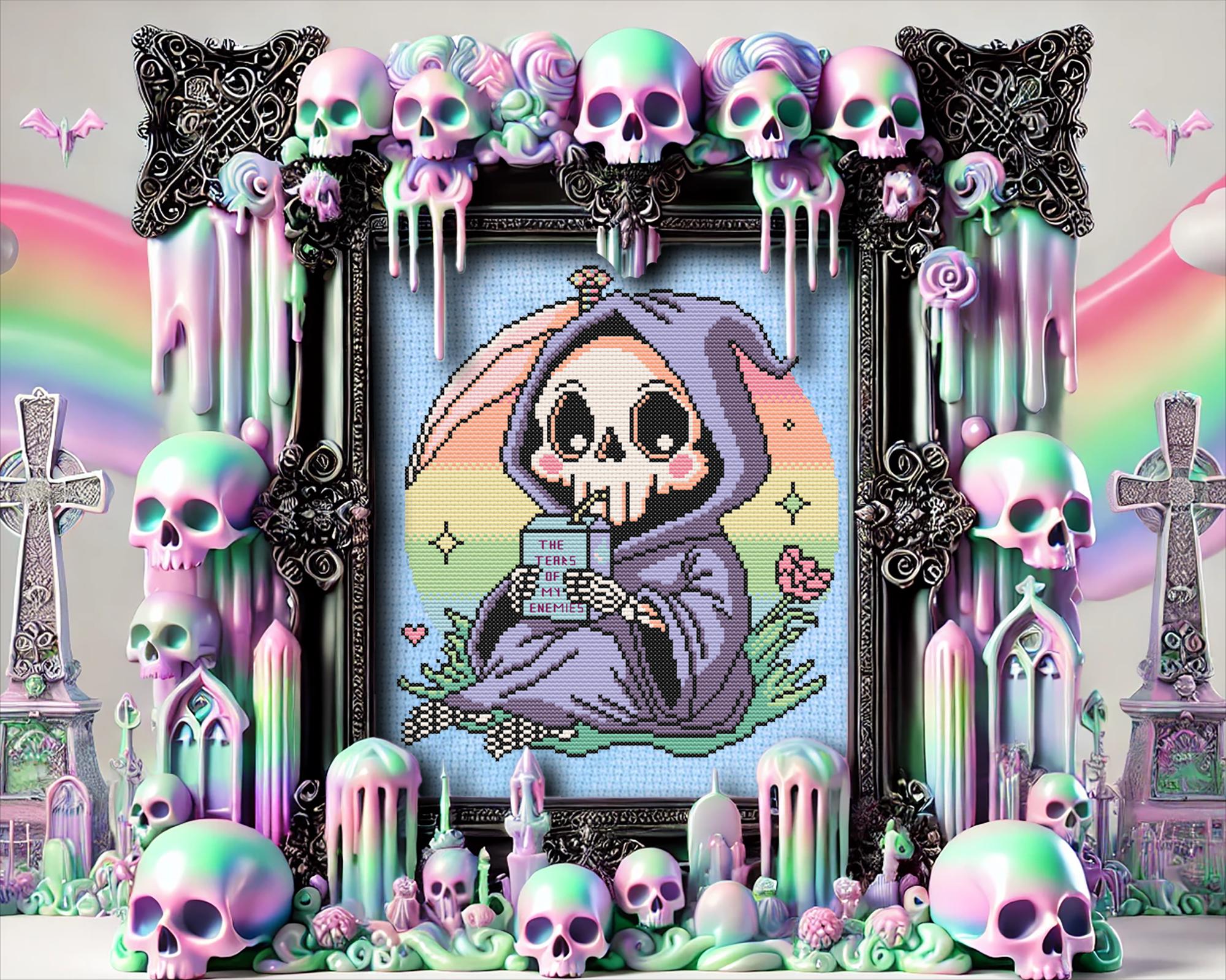 Why sip on the ordinary when you can quench your thirst with the tears of your enemies? This whimsical grim reaper is doing just that, cuddled up in a lush patch of green under a pastel goth sky, rocking an outfit Morticia would envy. Inspired by the infamous line, I drink the tears of my enemies and crafted with kawaii-meets-macabre charm, this Halloween cross stitch is a playful twist for anyone who loves funny cross stitch with a side of snark.