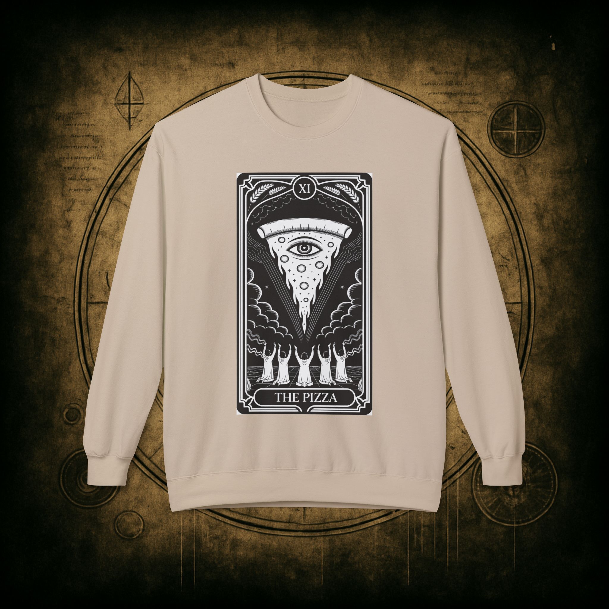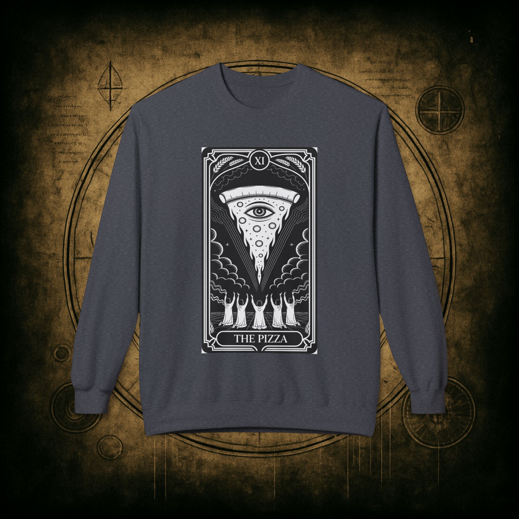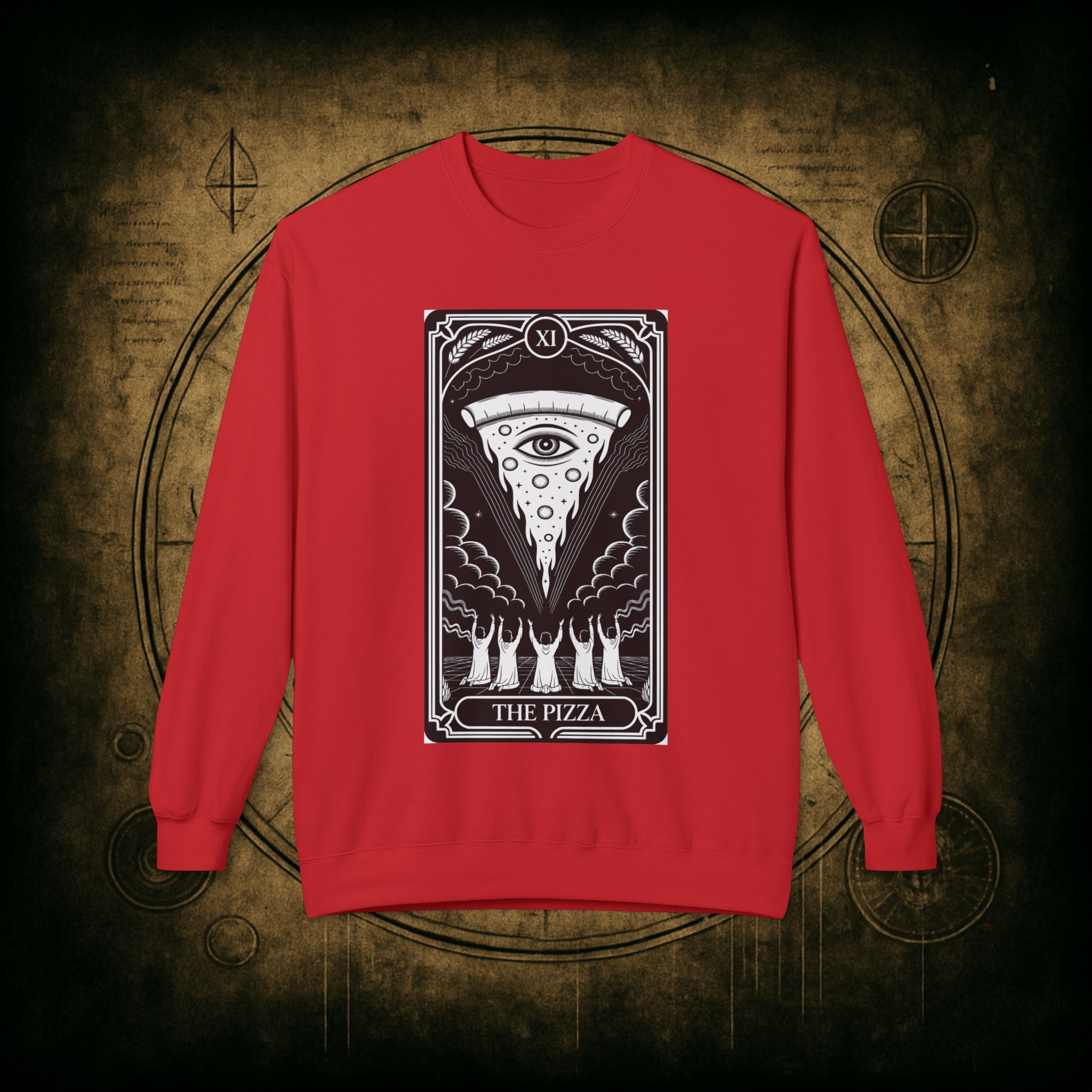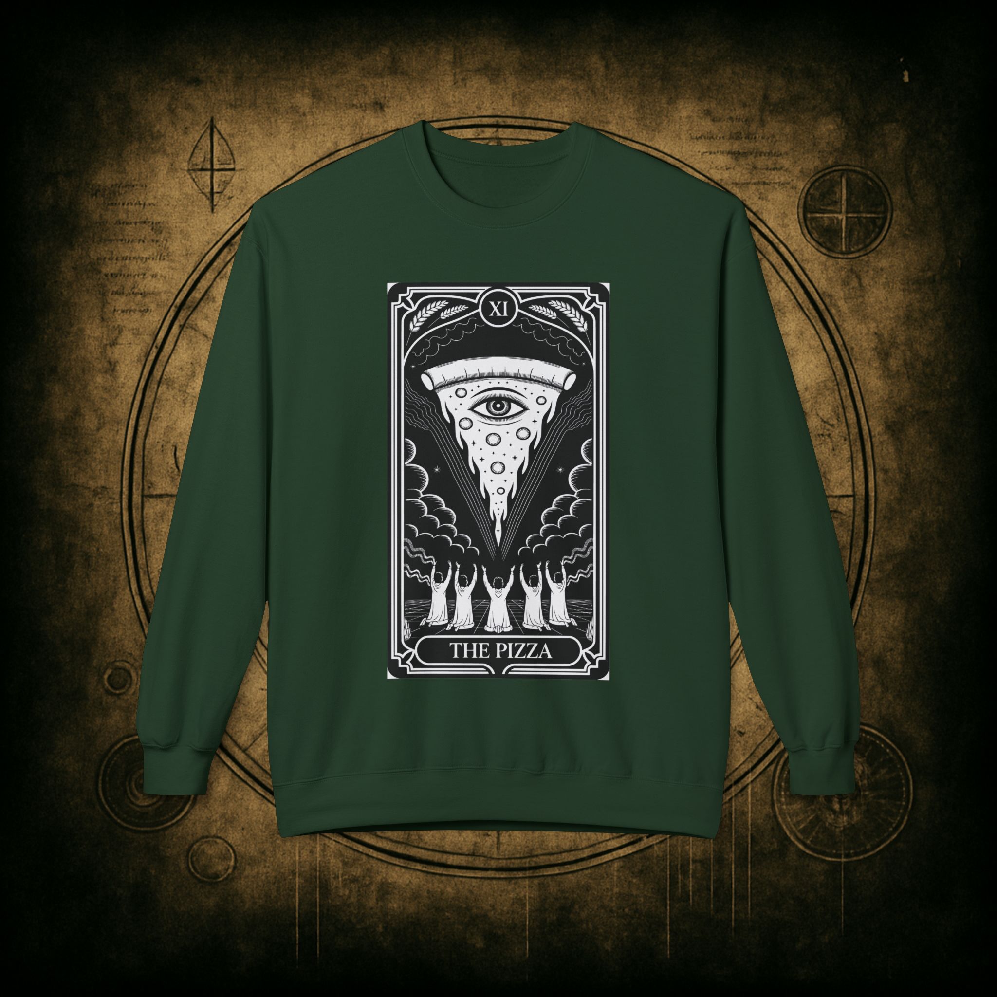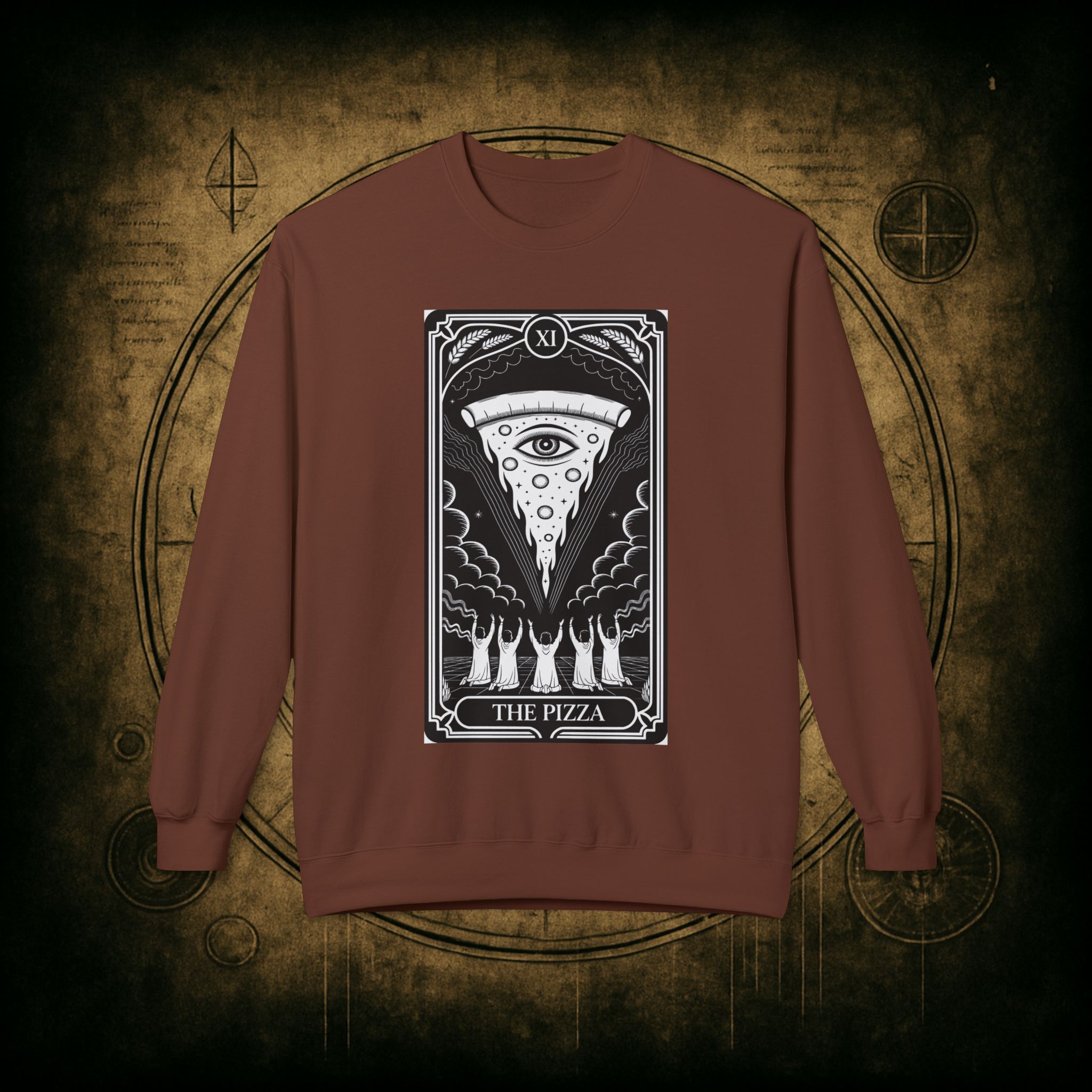 Card XI is hot, cheesy, and fully illuminated. Behold The Pizza, the divine slice of enlightenment, with the all-seeing eye nestled between mushrooms and pepperoni. Five robed figures raise their hands in reverence… because how else do you greet your sacred carbs?