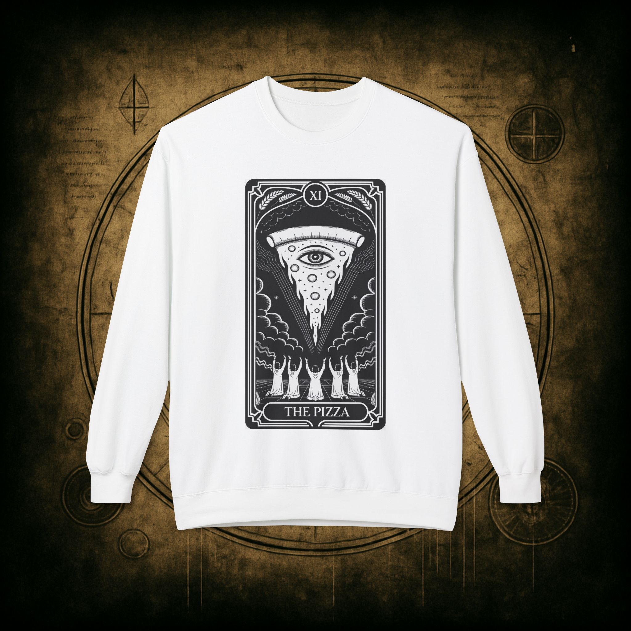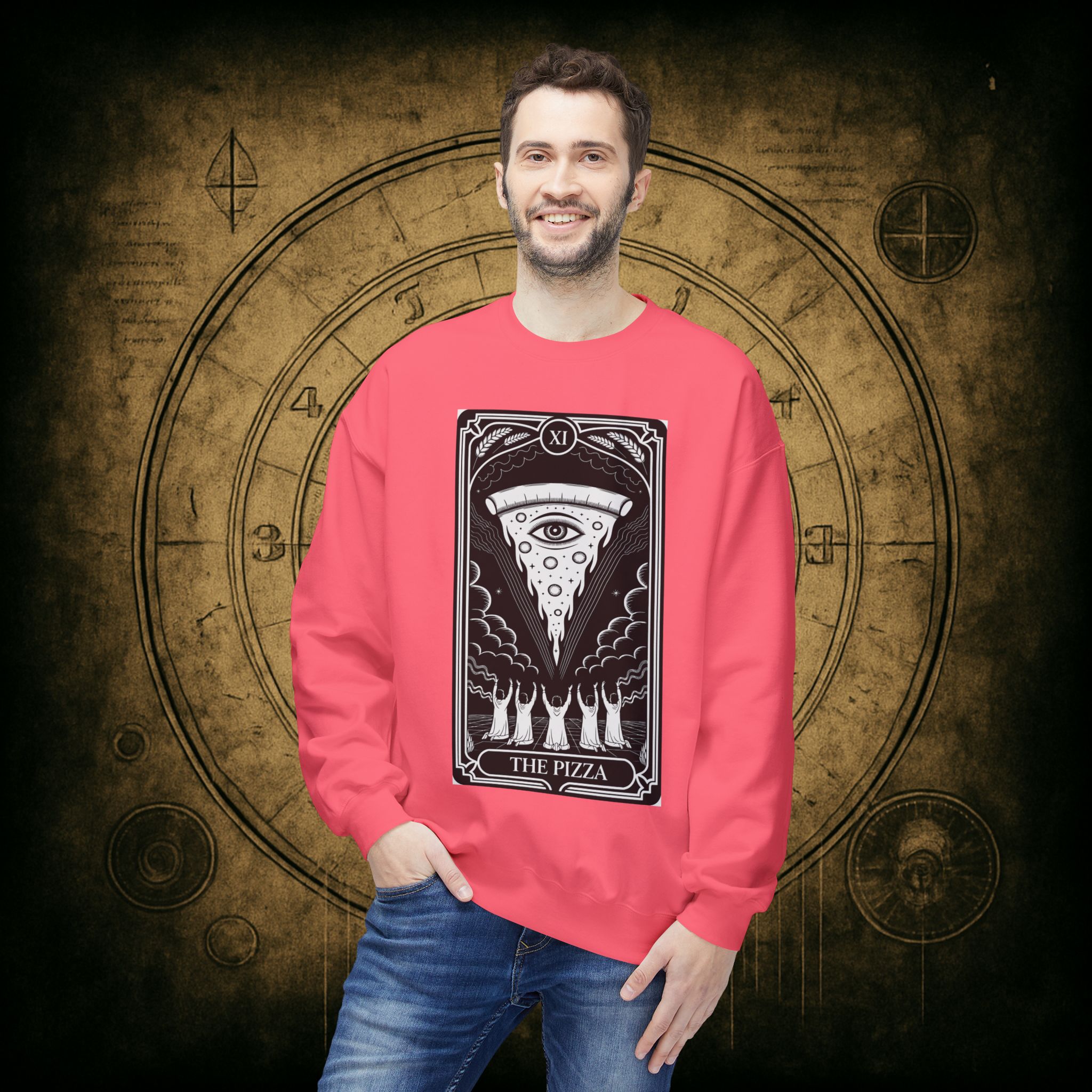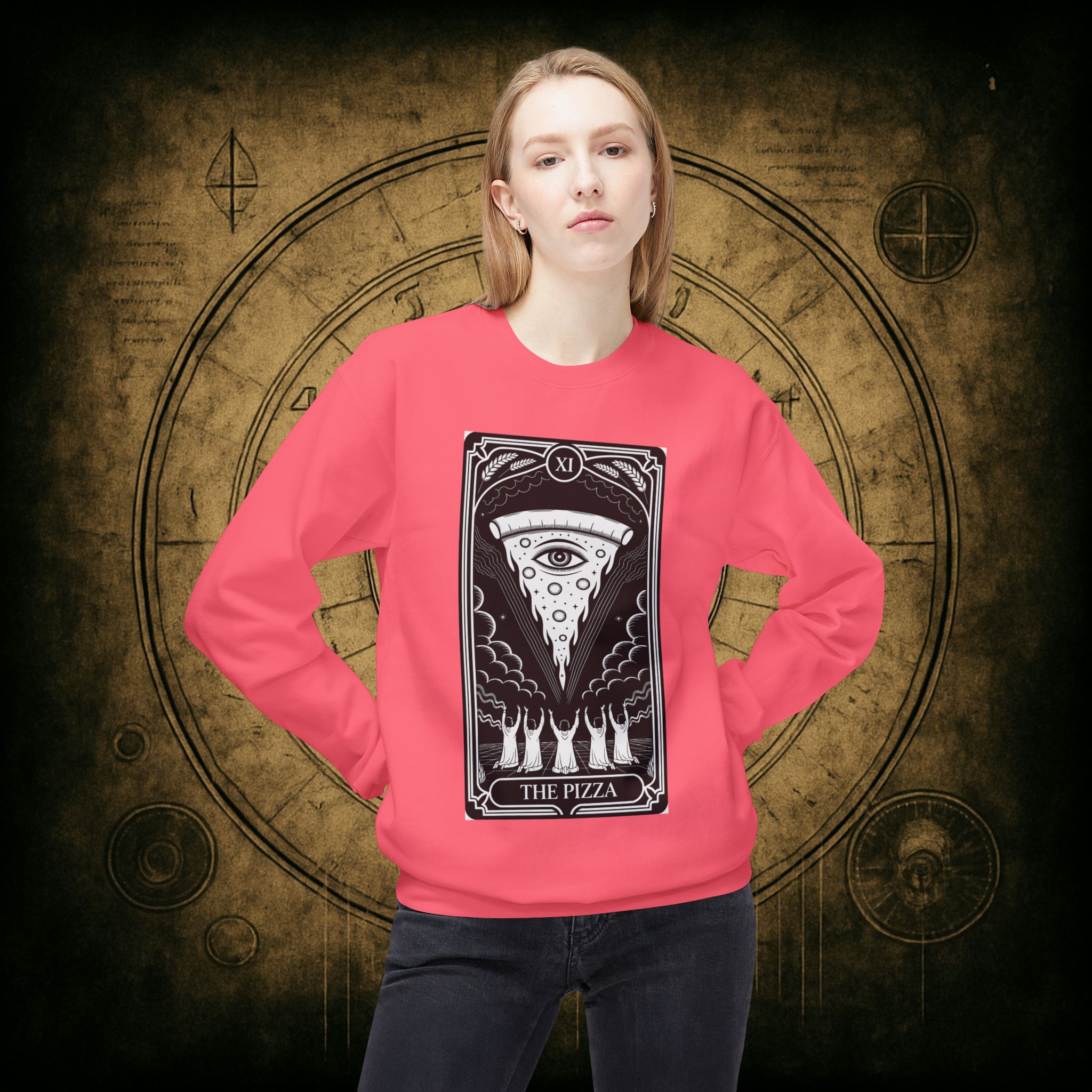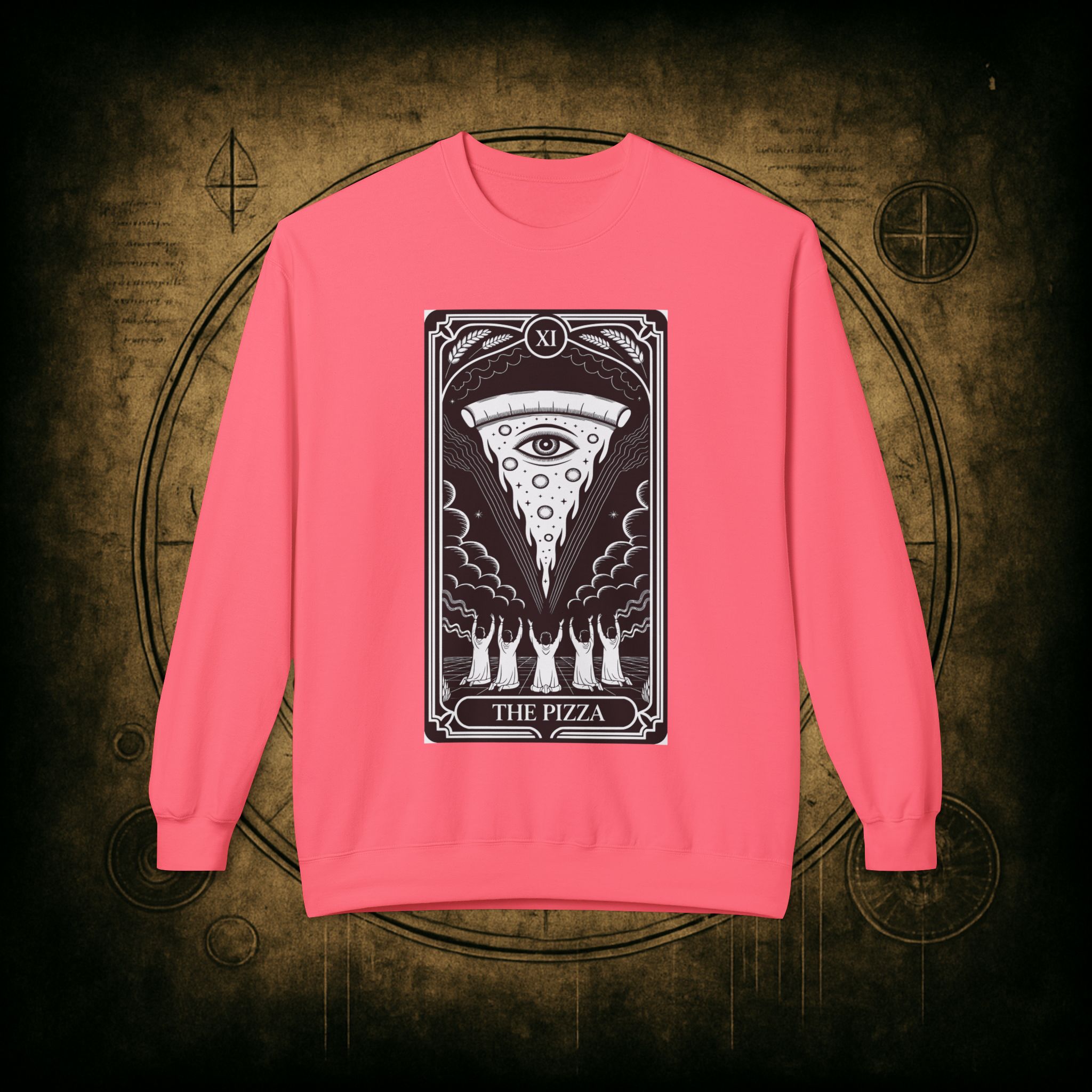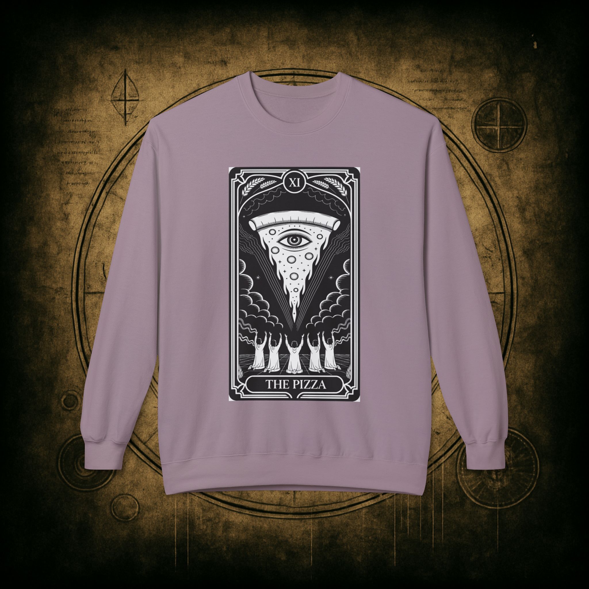 Card XI is hot, cheesy, and fully illuminated. Behold The Pizza, the divine slice of enlightenment, with the all-seeing eye nestled between mushrooms and pepperoni. Five robed figures raise their hands in reverence… because how else do you greet your sacred carbs?