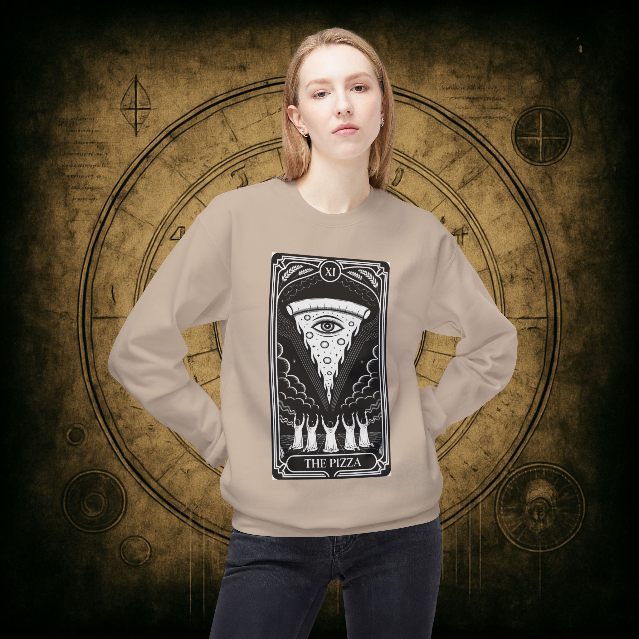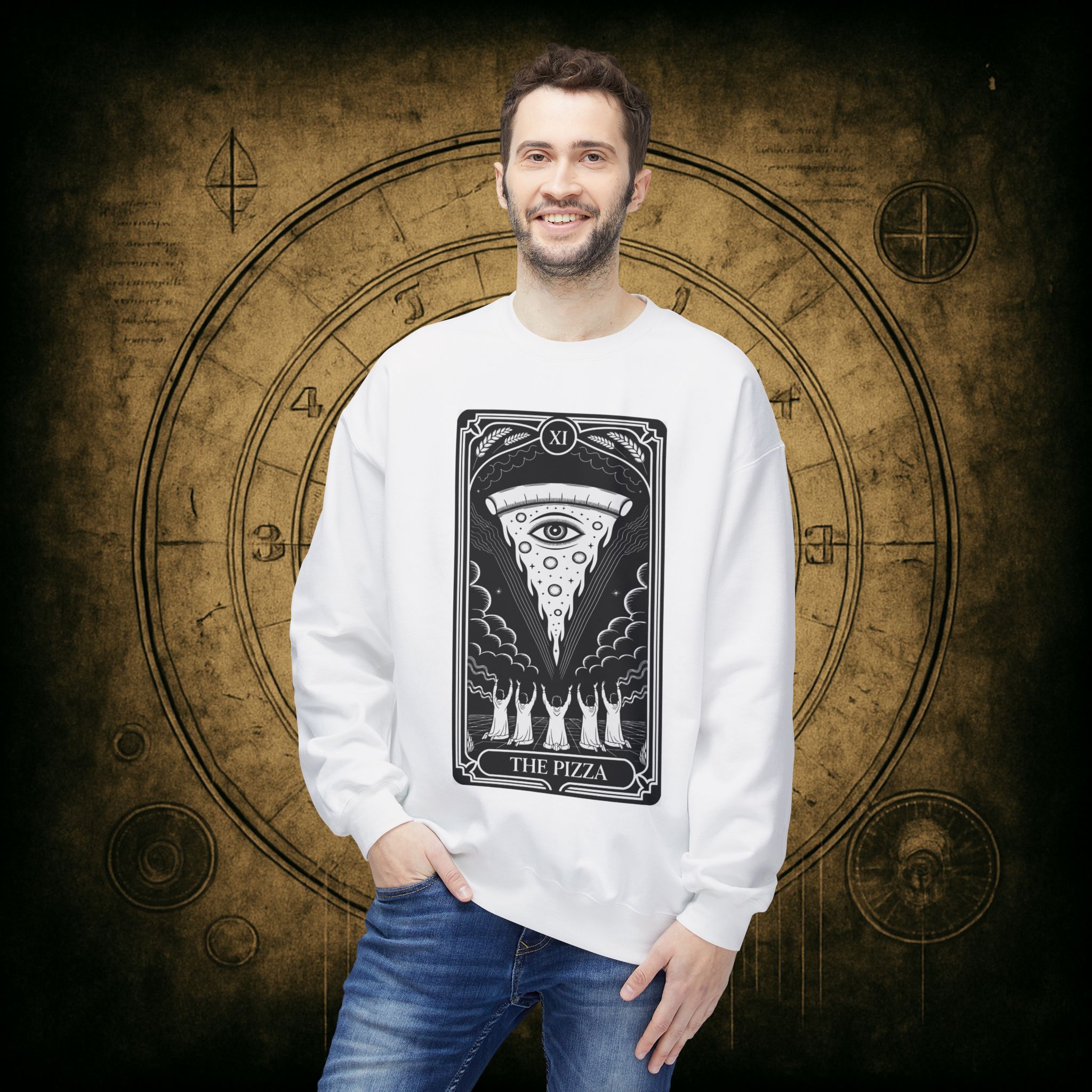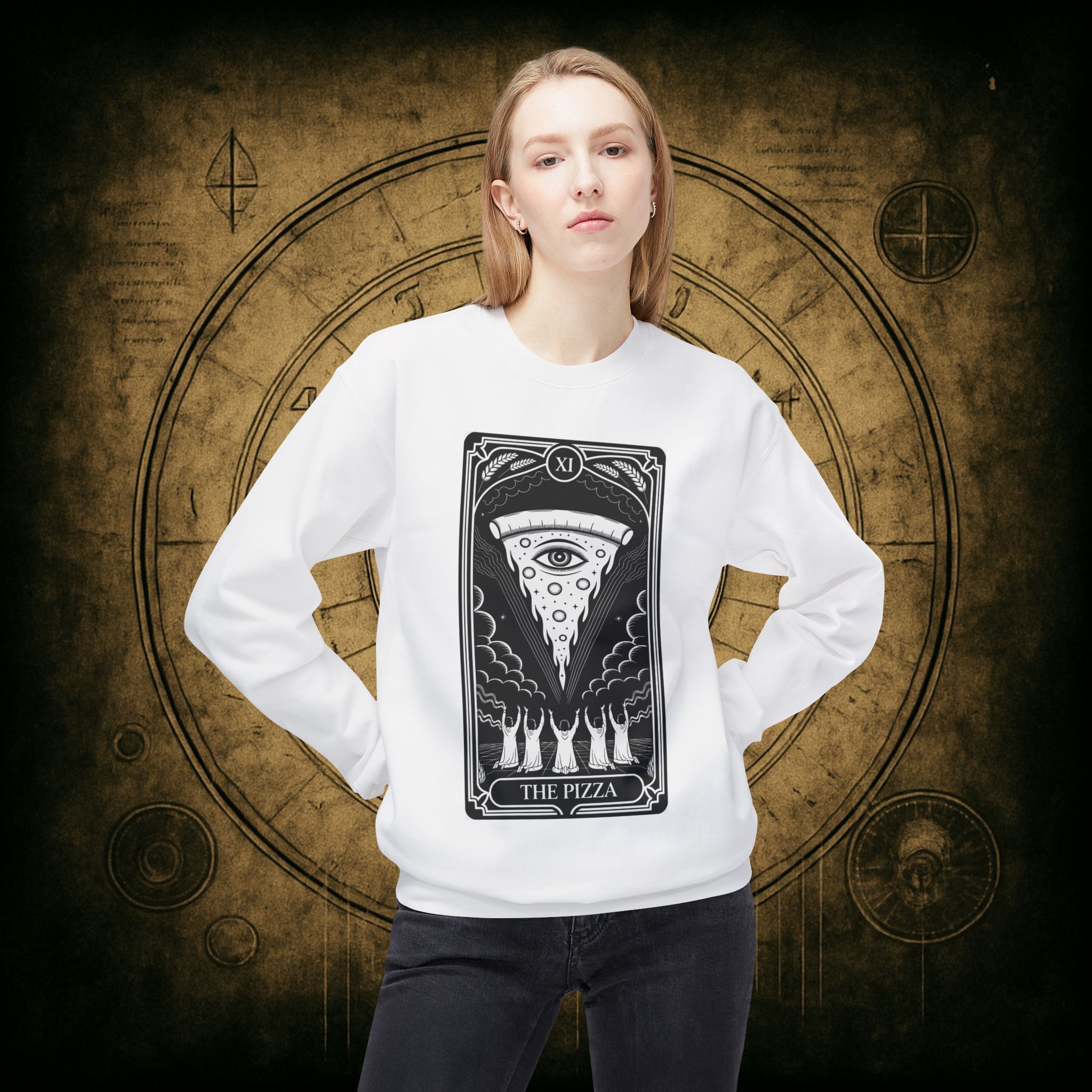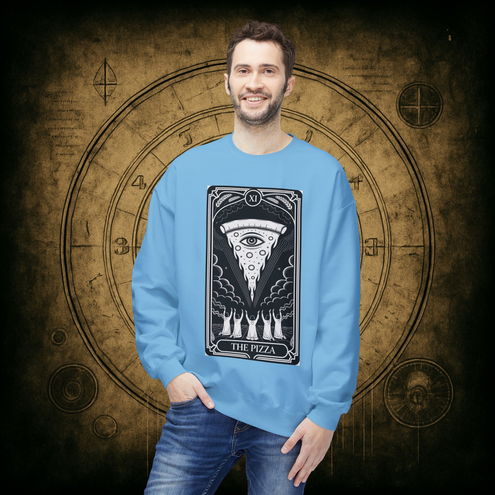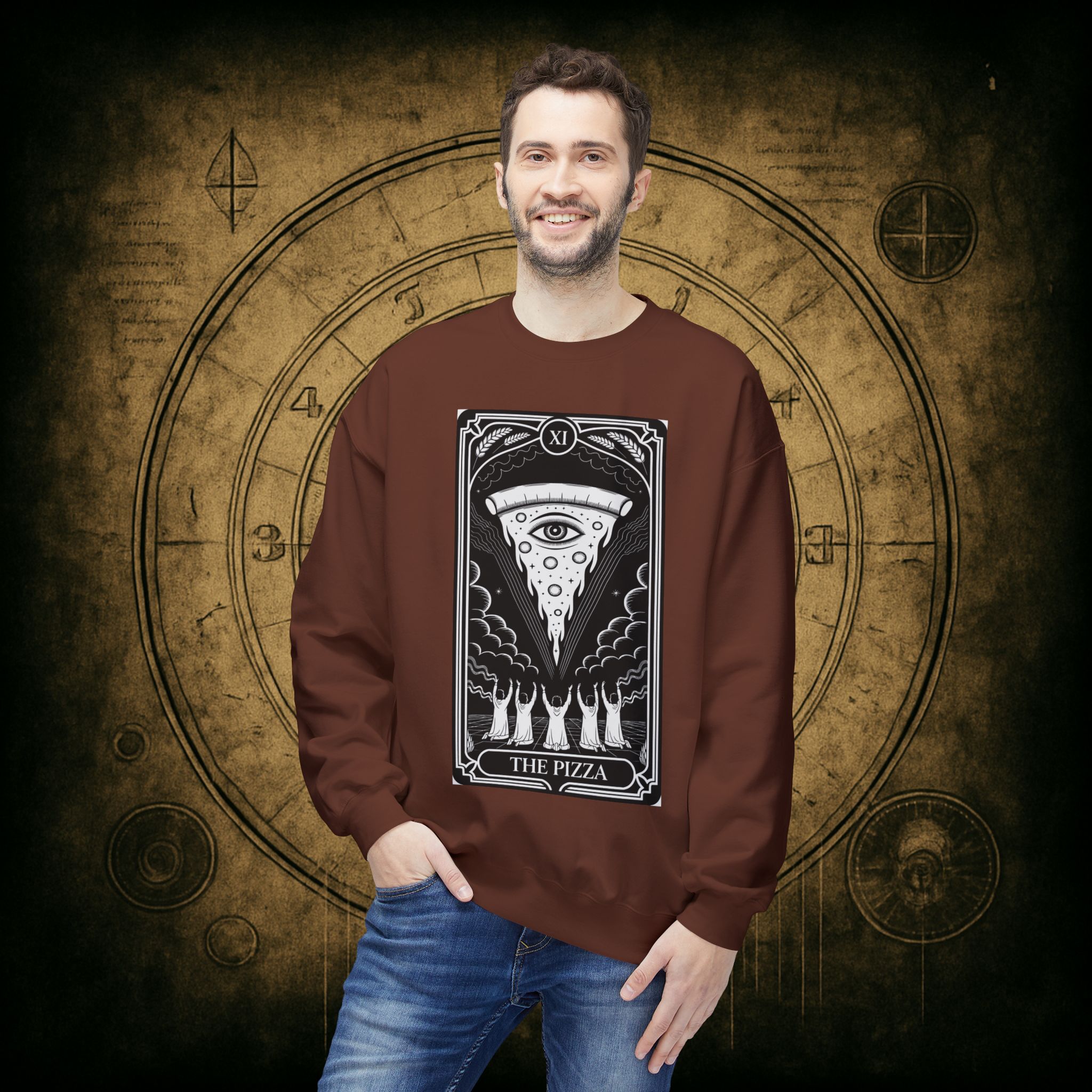 Card XI is hot, cheesy, and fully illuminated. Behold The Pizza, the divine slice of enlightenment, with the all-seeing eye nestled between mushrooms and pepperoni. Five robed figures raise their hands in reverence… because how else do you greet your sacred carbs?
