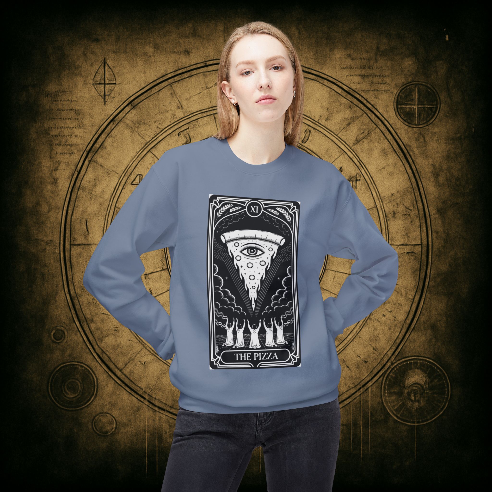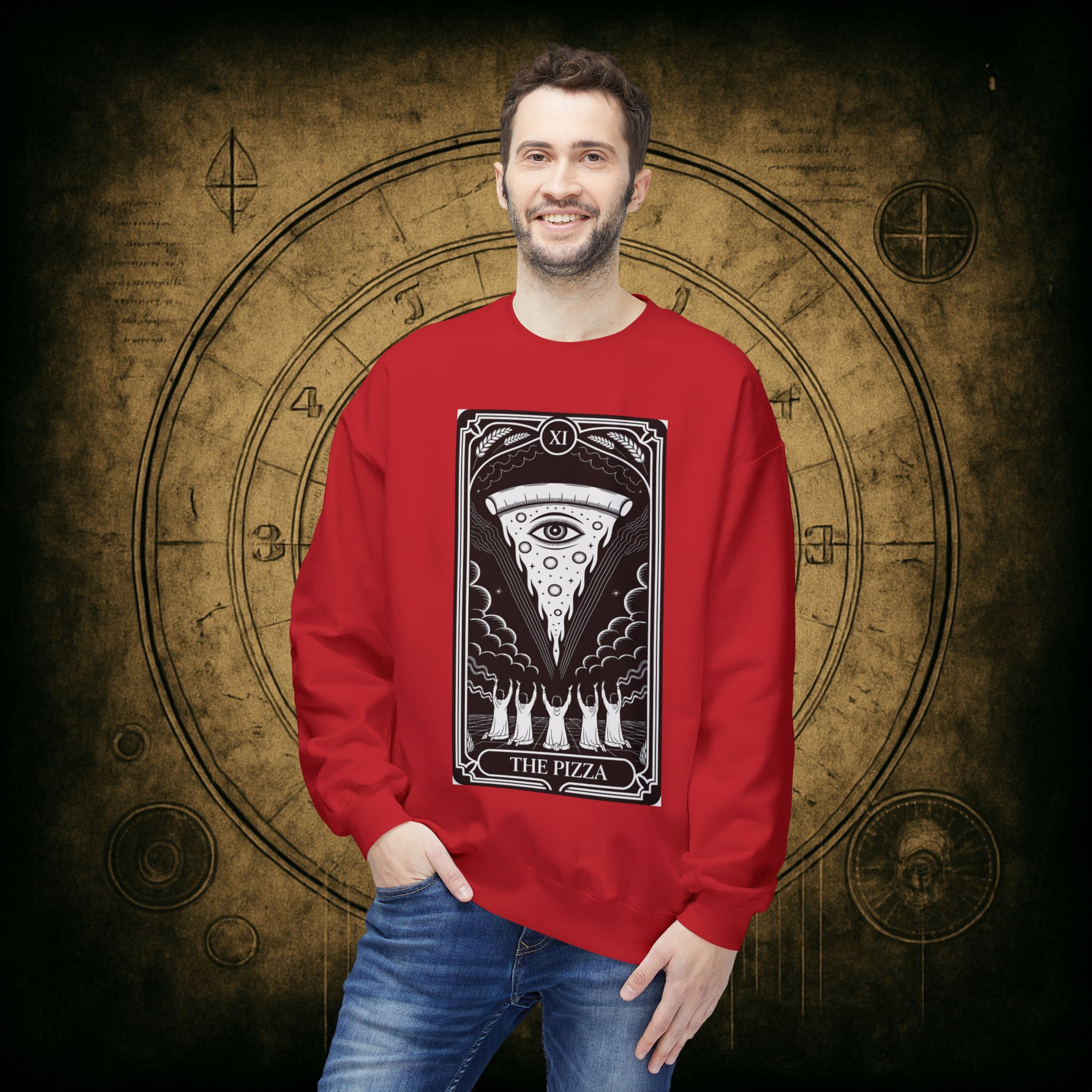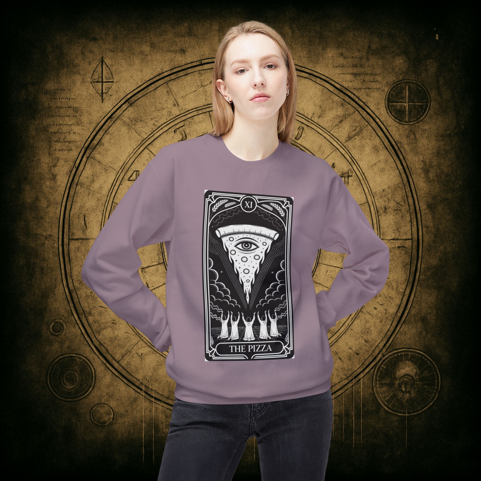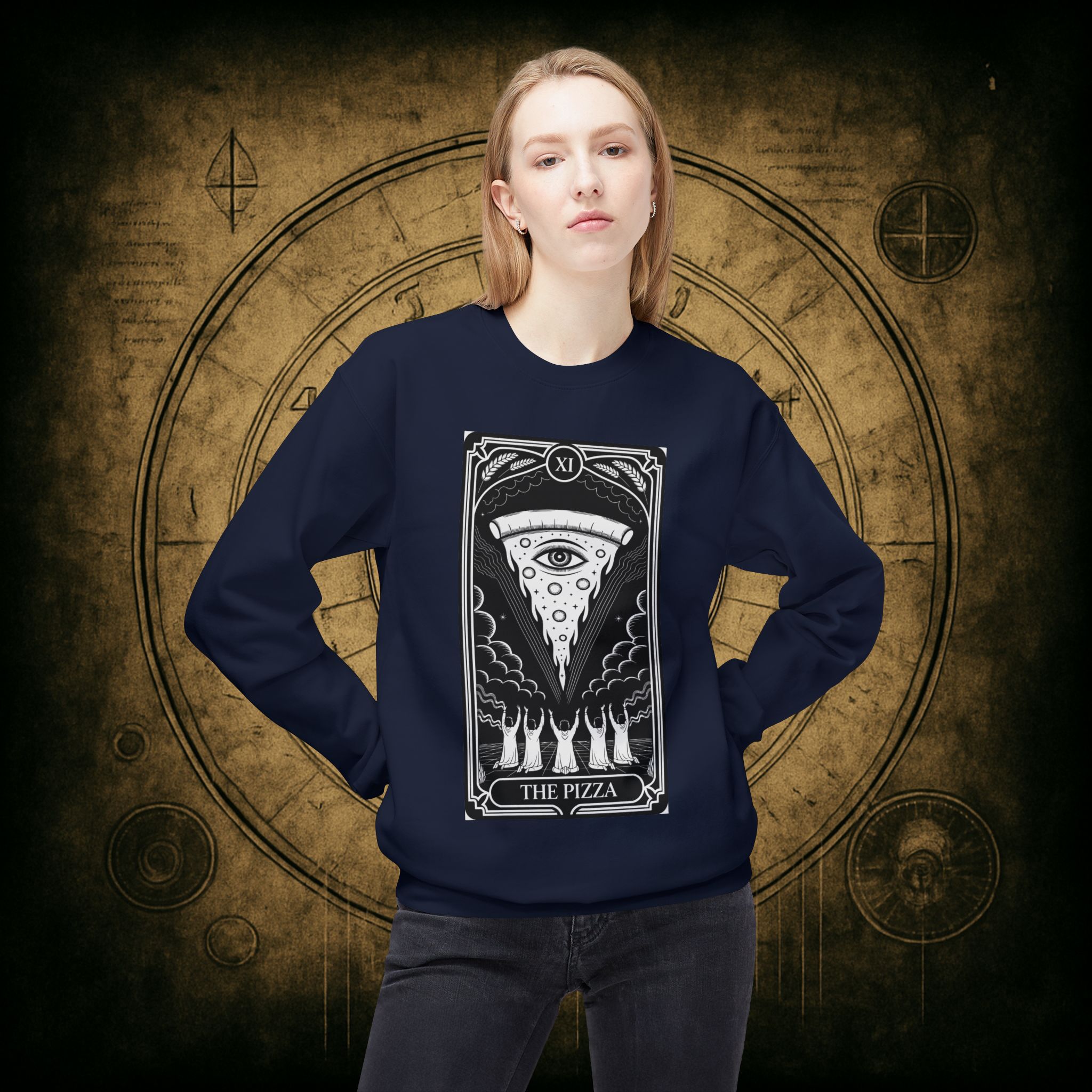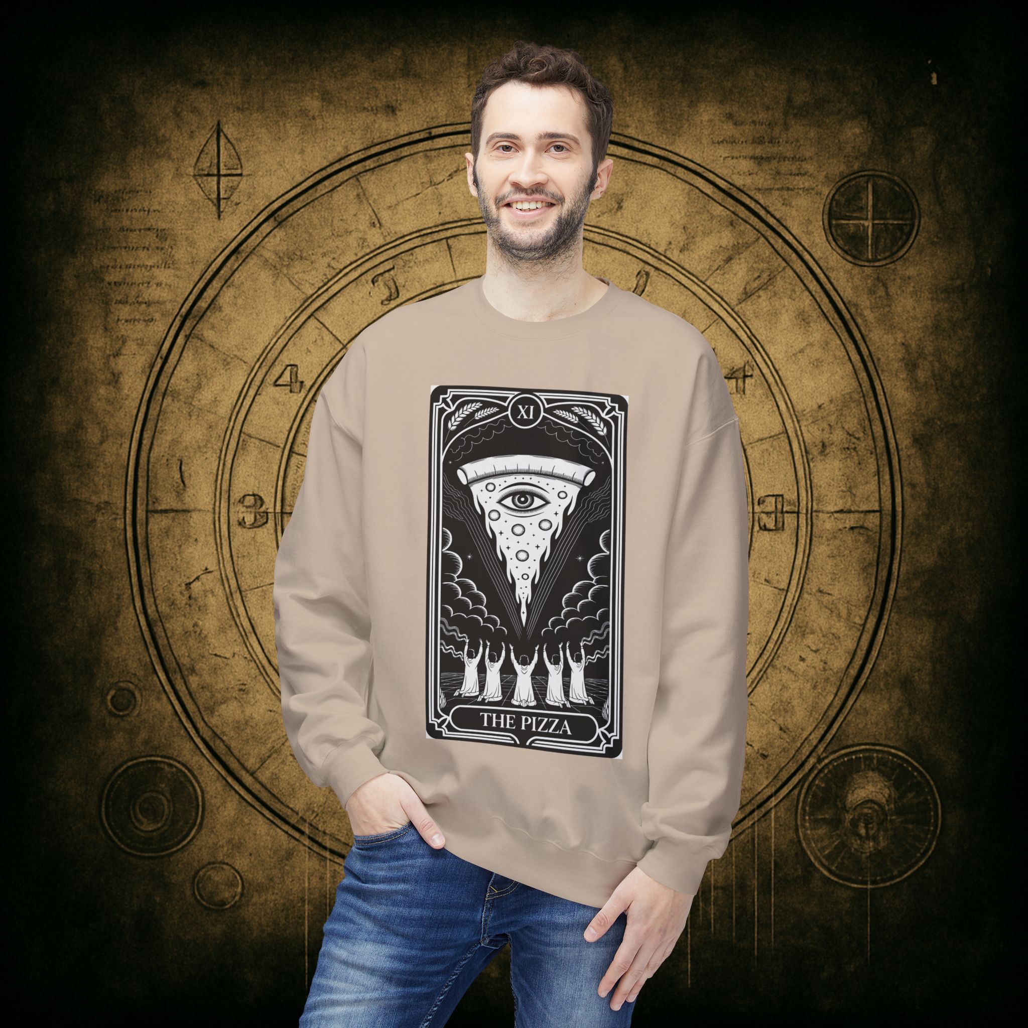 Card XI is hot, cheesy, and fully illuminated. Behold The Pizza, the divine slice of enlightenment, with the all-seeing eye nestled between mushrooms and pepperoni. Five robed figures raise their hands in reverence… because how else do you greet your sacred carbs?