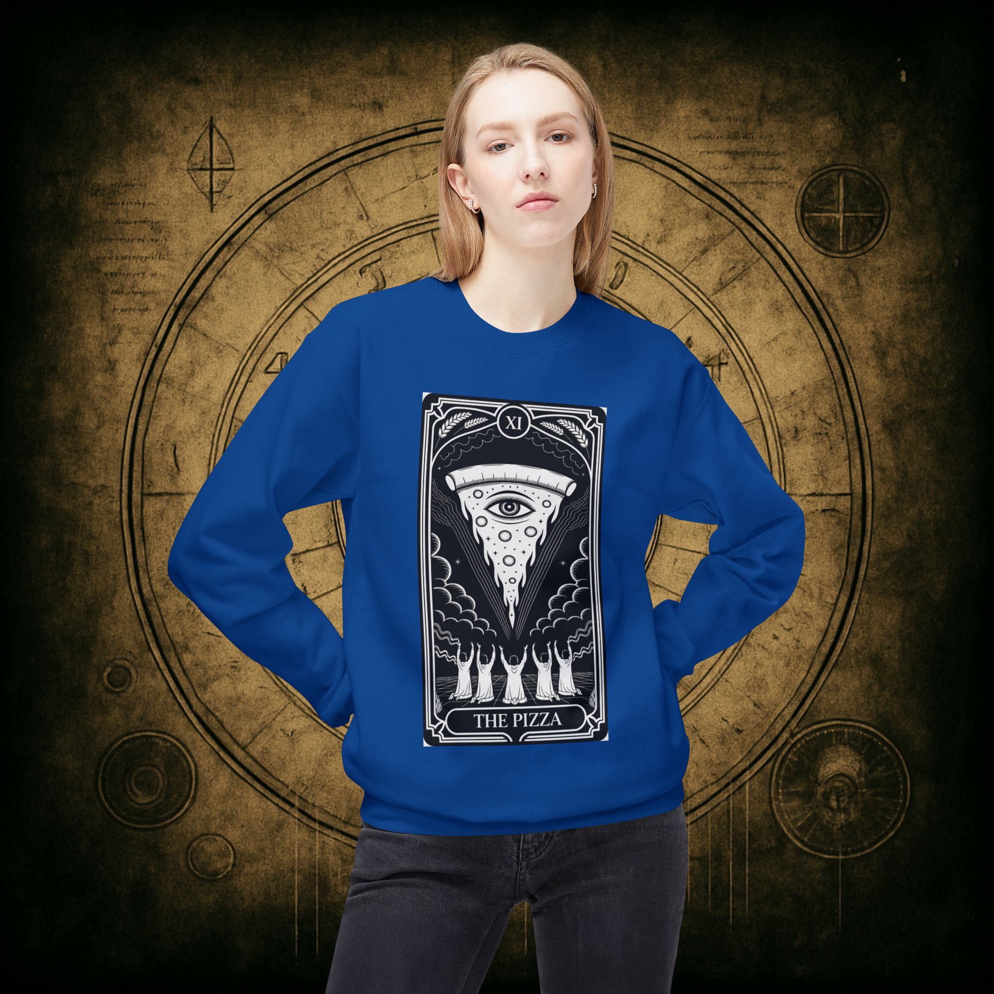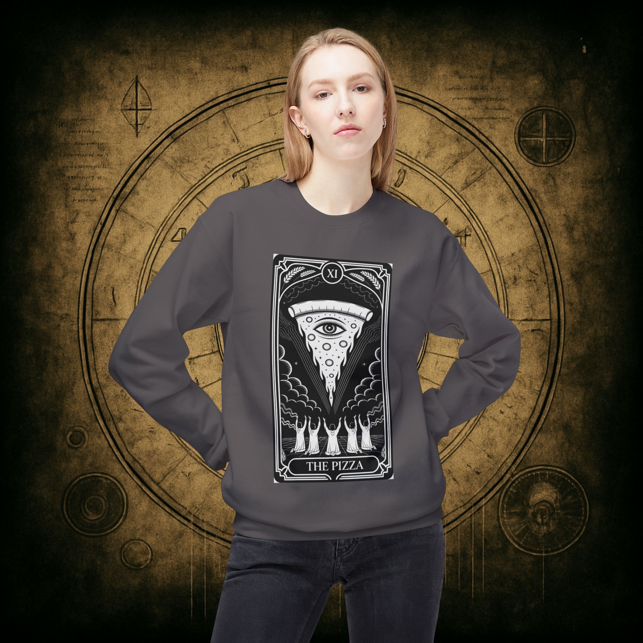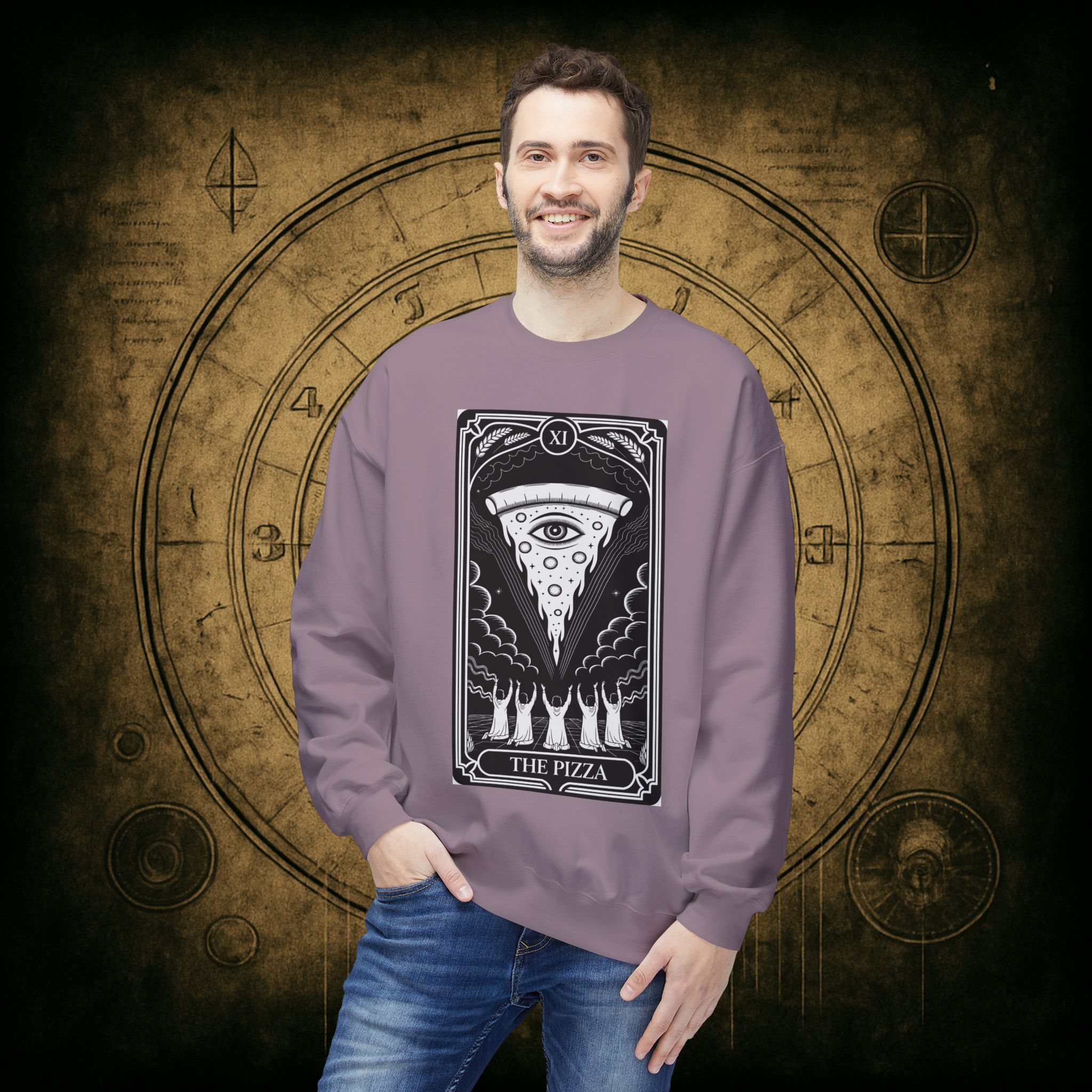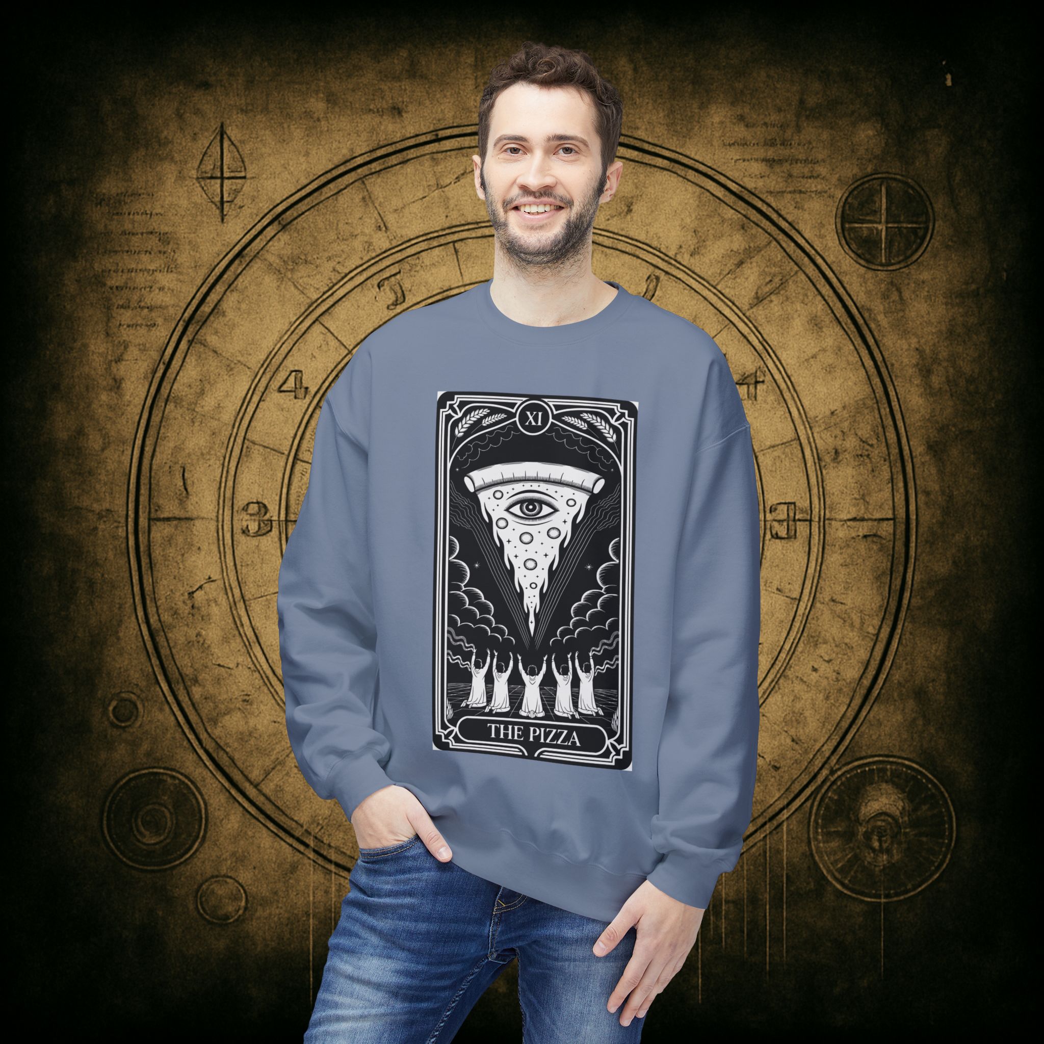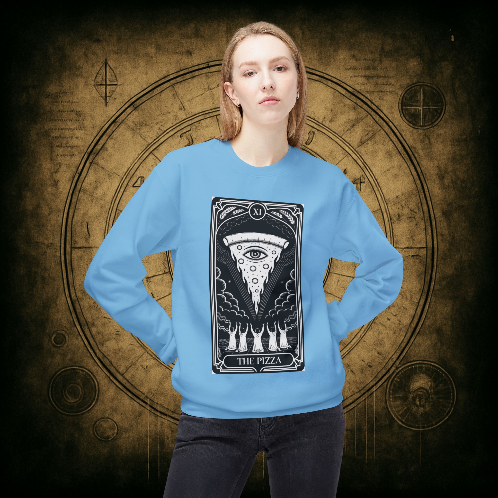 Card XI is hot, cheesy, and fully illuminated. Behold The Pizza, the divine slice of enlightenment, with the all-seeing eye nestled between mushrooms and pepperoni. Five robed figures raise their hands in reverence… because how else do you greet your sacred carbs?