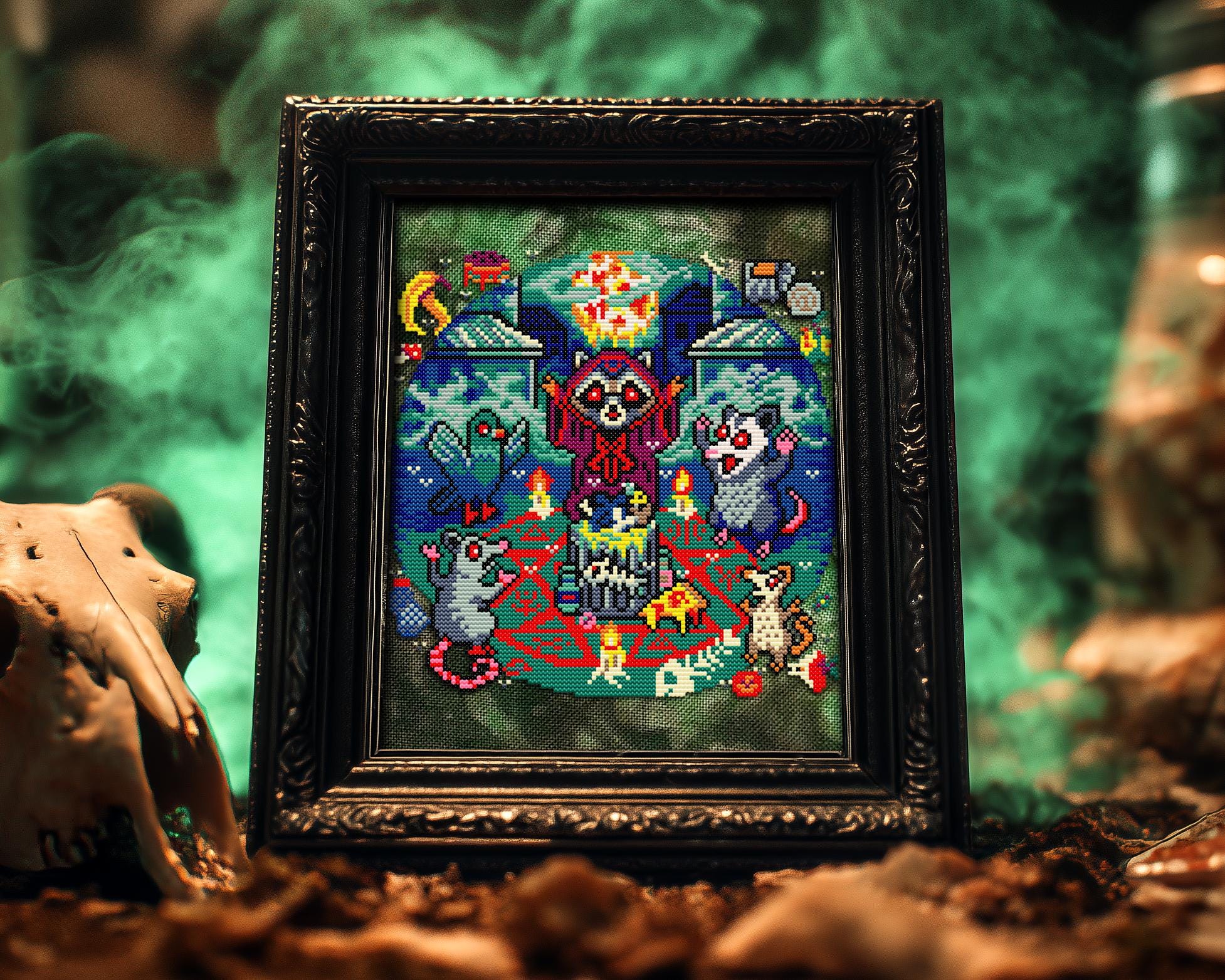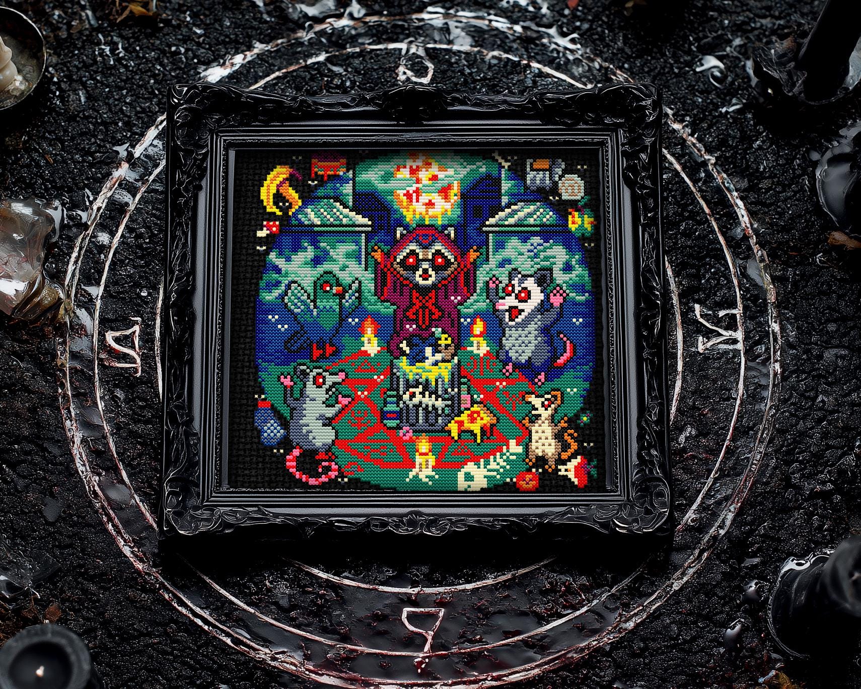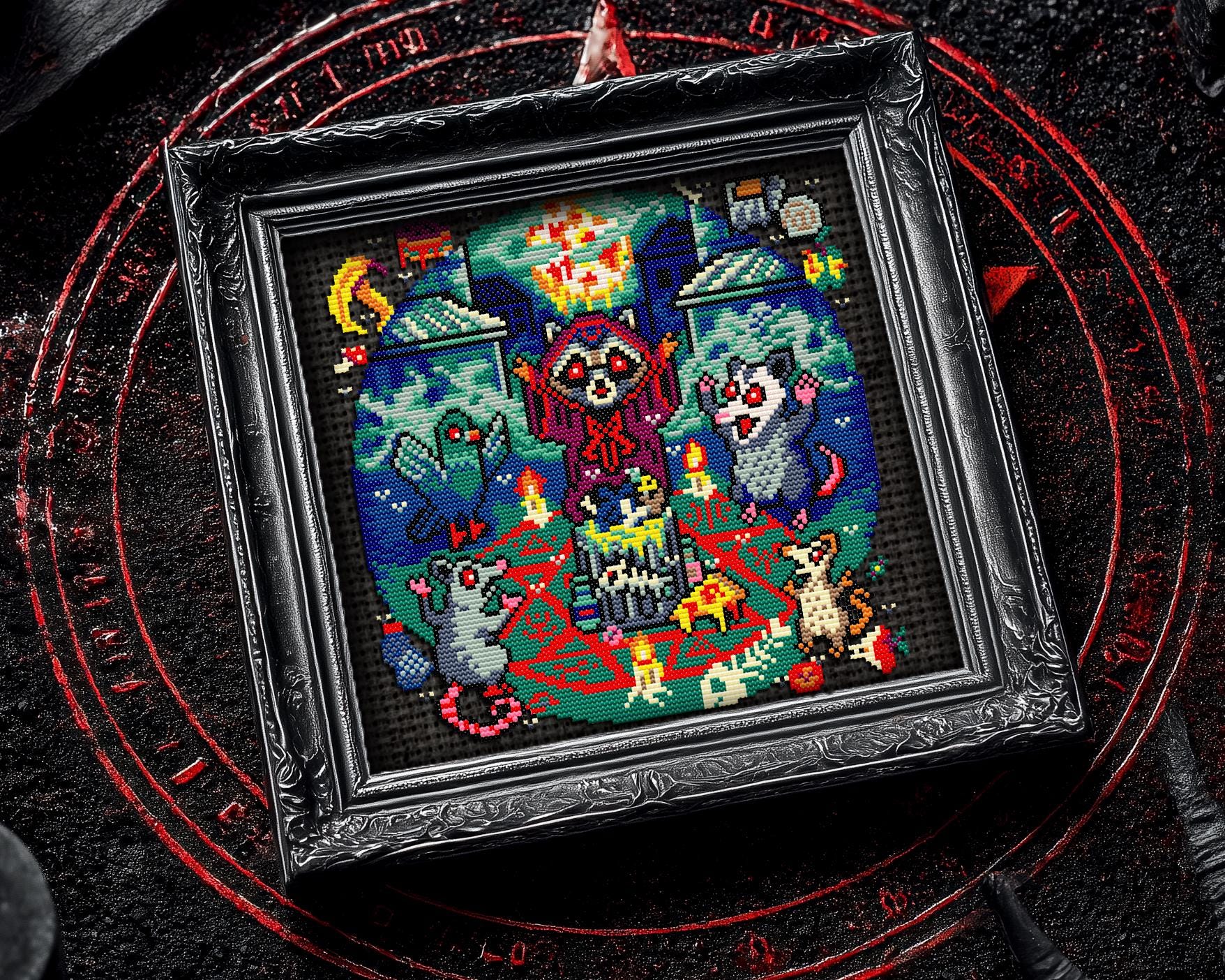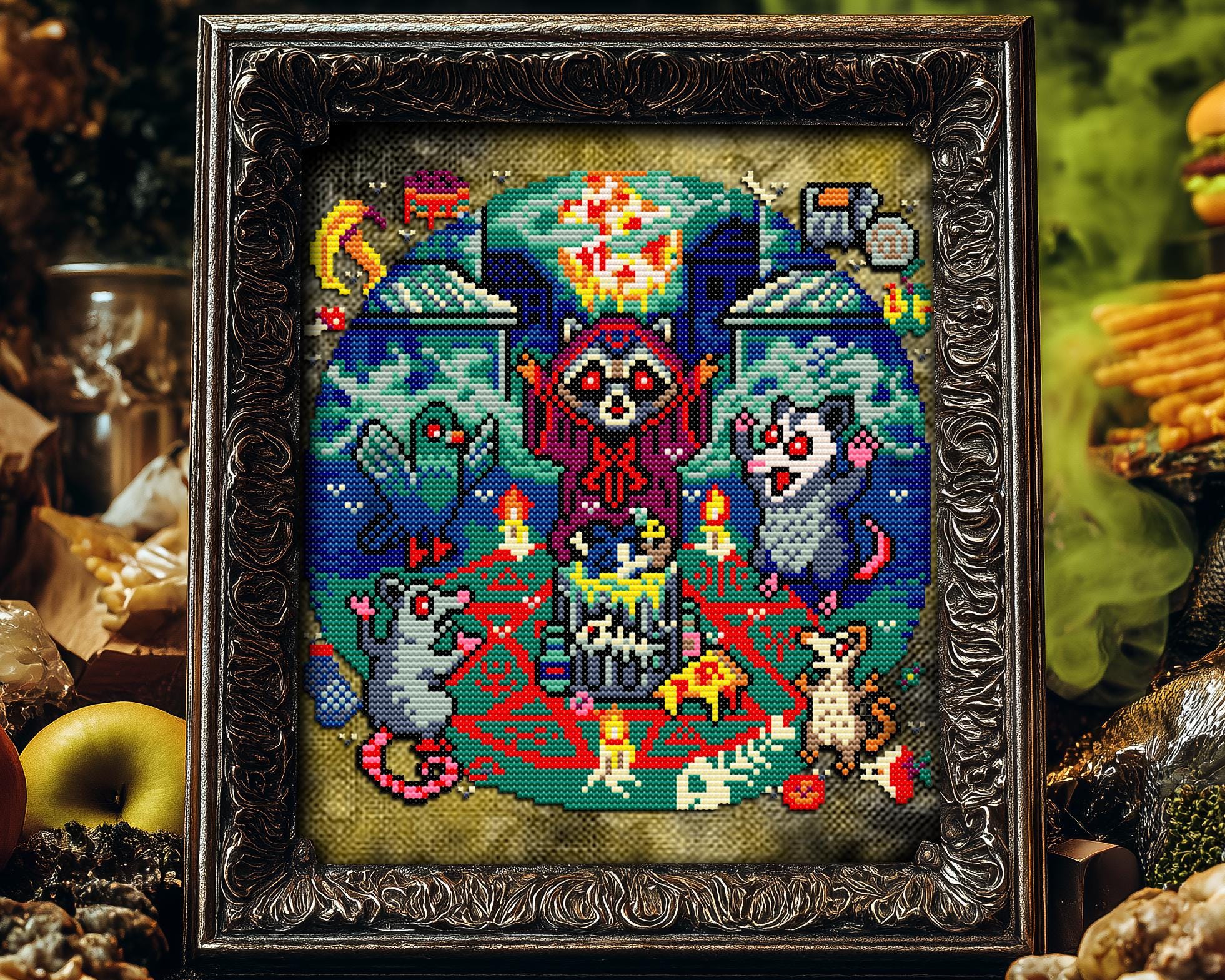 Oh no no no, don’t adjust your eyes, yes, that is a raccoon in a blood-red cult robe leading a moonlit trash ritual deep in the alley under the crustiest full moon you’ve ever seen. Welcome to Trash Summoners, the second unhinged masterpiece in the Trash Eaters series, where gothic cross stitch, Halloween cross stitch, and modern cross stitch collide in the filthiest urban summoning this side of Beelzebub’s recycle bin. Our beloved trash eater cross stitch crew, featuring the unholy alliance of raccoon cross stitch, rat cross stitch, pigeon cross stitch, and one very loud opossum, have carved a witchy cross stitch circle out of pepperoni slices and fish bones, and are full-sending a call into the trashcore void. It’s stinky, it’s sacred, it’s… suspiciously pizza-themed. This is spooky cross stitch meets occult cross stitch in its most gloriously feral form.