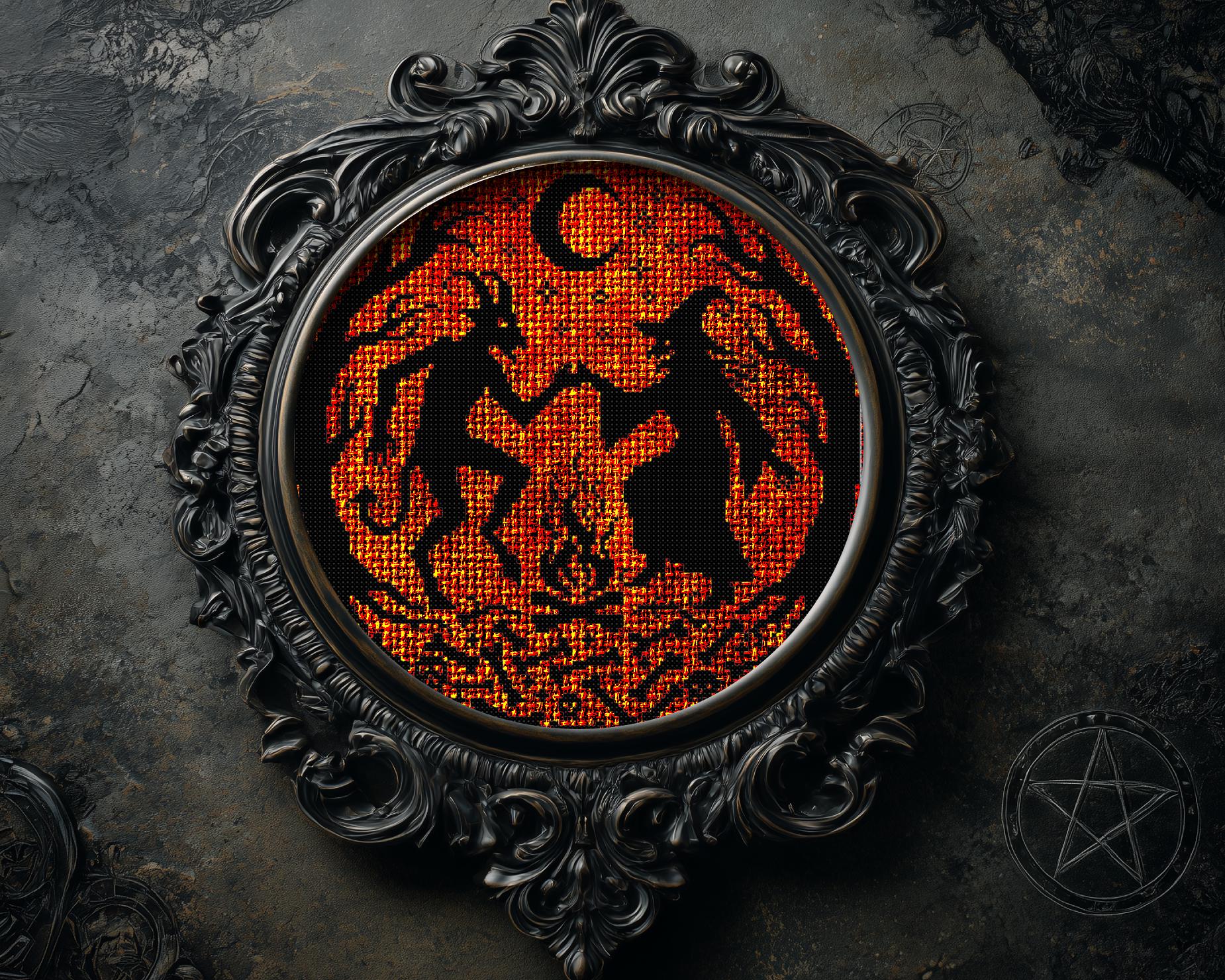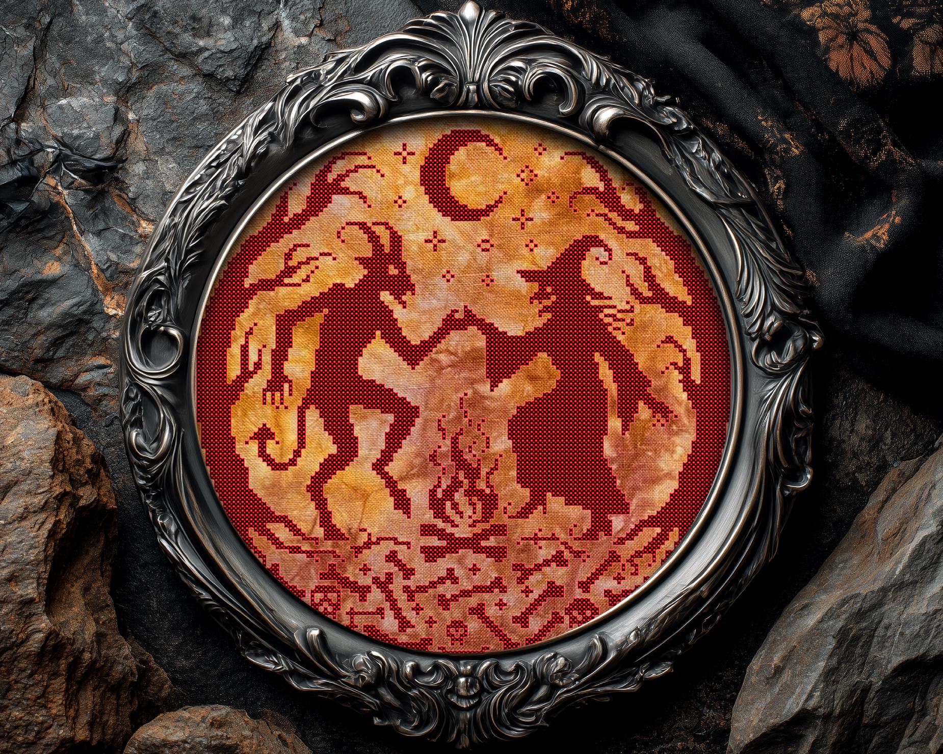 This Wicked xstitch is a whole tiny ritual hands linked, bonfire crackling, and a circle of night that feels like it could swallow your living room in the best way. This is a gothic cross stitch pattern for people who like their décor a little cursed (affectionate) and their stitches a little unhinged. If you live for that “I swear it’s art” modern cross stitch moment, you’ll love how bold and graphic it looks once it starts filling in. It also scratches that “don’t ask why my wall looks haunted” itch that occult cross stitch fans totally understand. And if your sense of humor runs delightfully sideways, the whole scene has that “are they flirting or summoning?” creepy cross stitch charm that makes you grin while you stitch. 🪡🖤