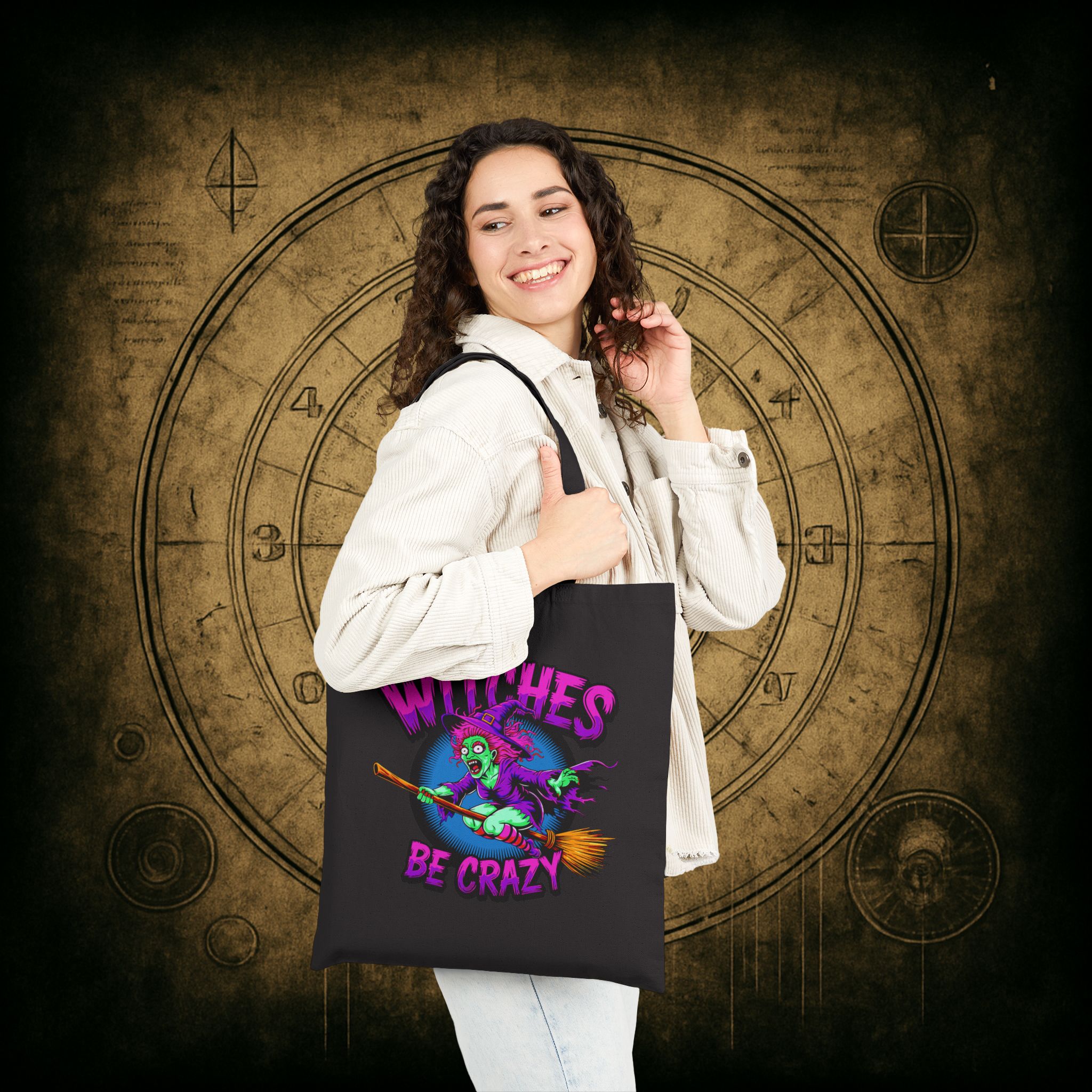 Chaos? Check. Eyeliner? Triple check. The Witches Be Crazy Tote Bag is your sassy, spell-slinging sidekick for days when you’re feeling just a little… unhinged in the most fashionable way. Featuring a neon-green enchantress wildin’ out mid-broomstick flight, this bag brings glam, grit, and a sprinkle of “don’t try me” to your everyday carry. Ideal for carrying potions, potlucks, or your latest plot twist.