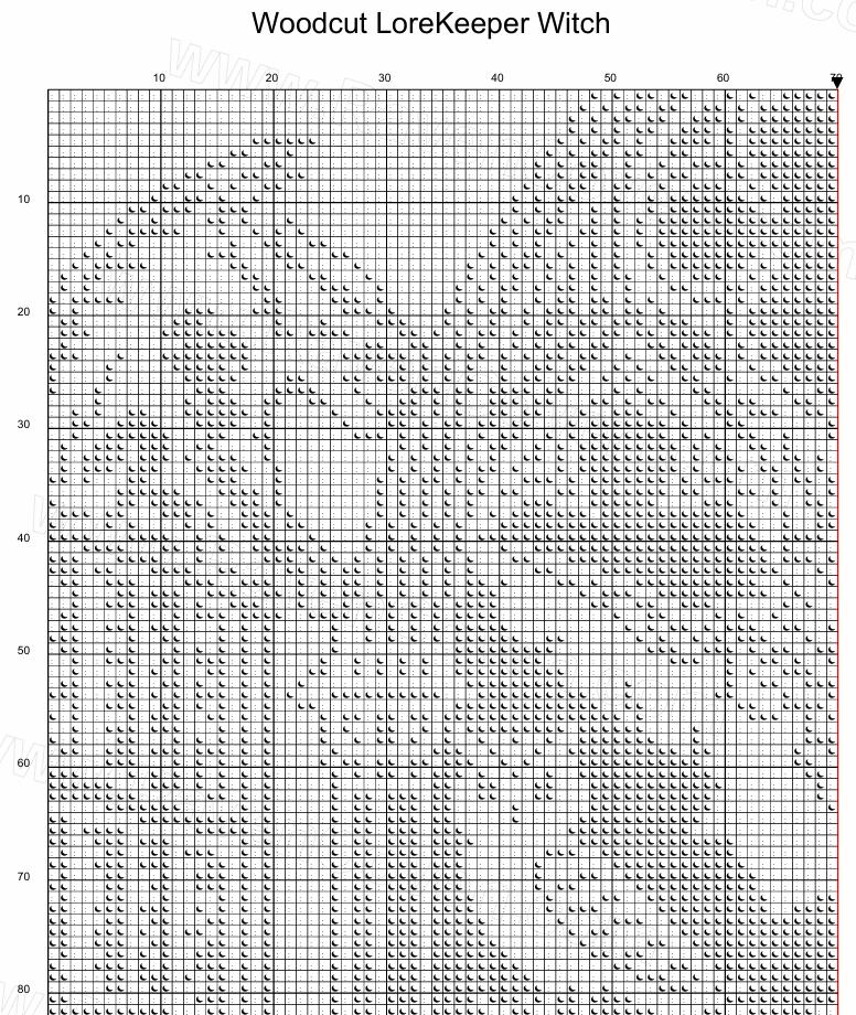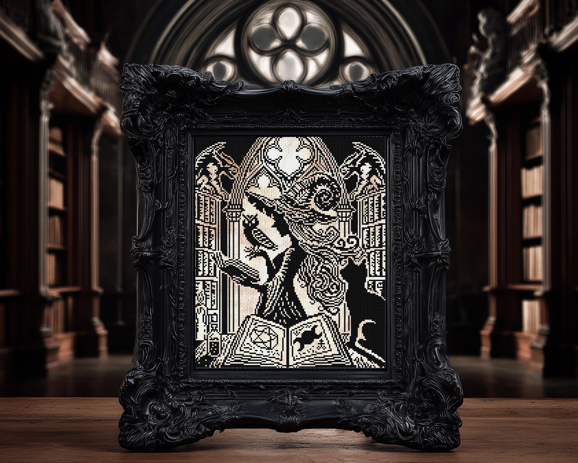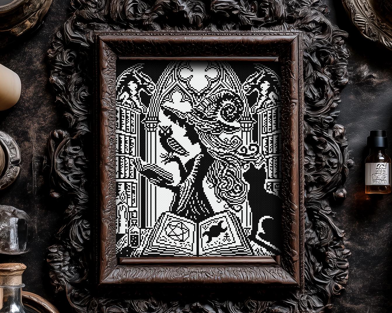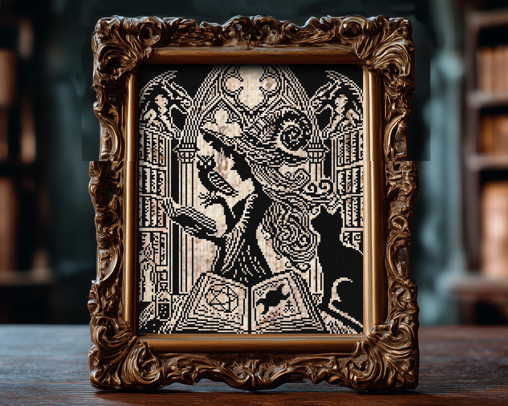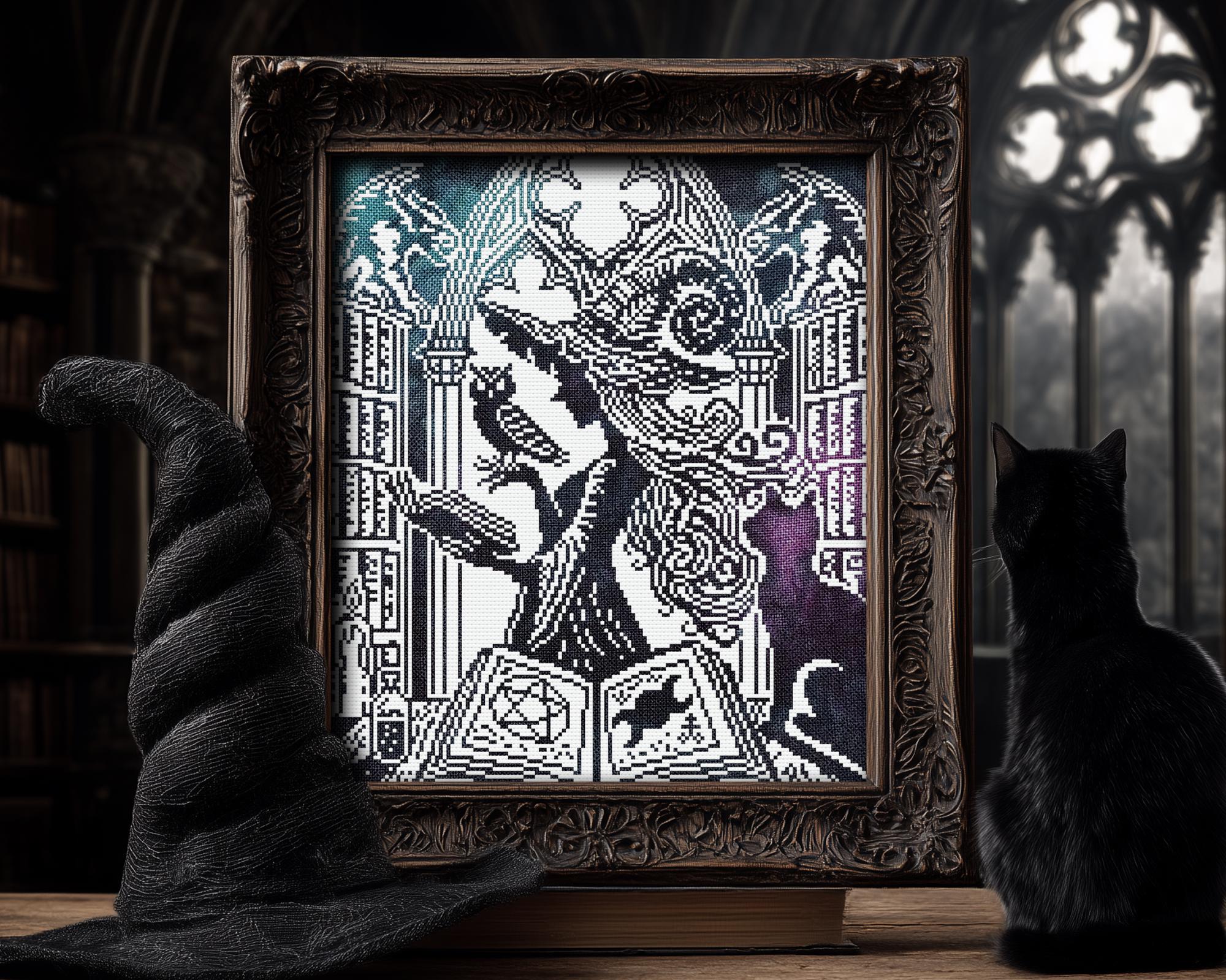stitch, all blessed like Wiccan cross stitch rites and absolutely born for xstitch. She’s the newest witch of the best-selling of the coven’s woodcut series, the Woodcut LoreKeeper Witch, wise as your grandmother’s side-eye and twice as stubborn. In her towering stacks of forbidden tomes, this design doubles as a love letter to bookworms and an esoteric wink to your inner librarian: a brooding gothic arch door, a pentagrammed page, the all-seeing eye, and familiars who know more than they’re telling. The scratchy, carved texture leans into primitive cross stitch charm while staying striking as a gallery print; it’s a moody love note to your shelves, the ultimate library cross stitch to anchor a reading nook, and a spellbound nod to bibliophiles craving book cross stitch. Your familiar gets their moment too, there’s familiar-forward cat cross stitch energy and vigilant owl cross stitch wisdom, all etched as a proud Woodcut Cross stitch showpiece starring our relentless Woodcut Witch. If your heart beats for myth and moon-logic, this is unabashed fantasy cross stitch, and it knows exactly which shelf it belongs on. Stitched at 10×12 inches on 14ct aida, she behaves for every skill level, rookie stitchers and seasoned stitch-witches alike.