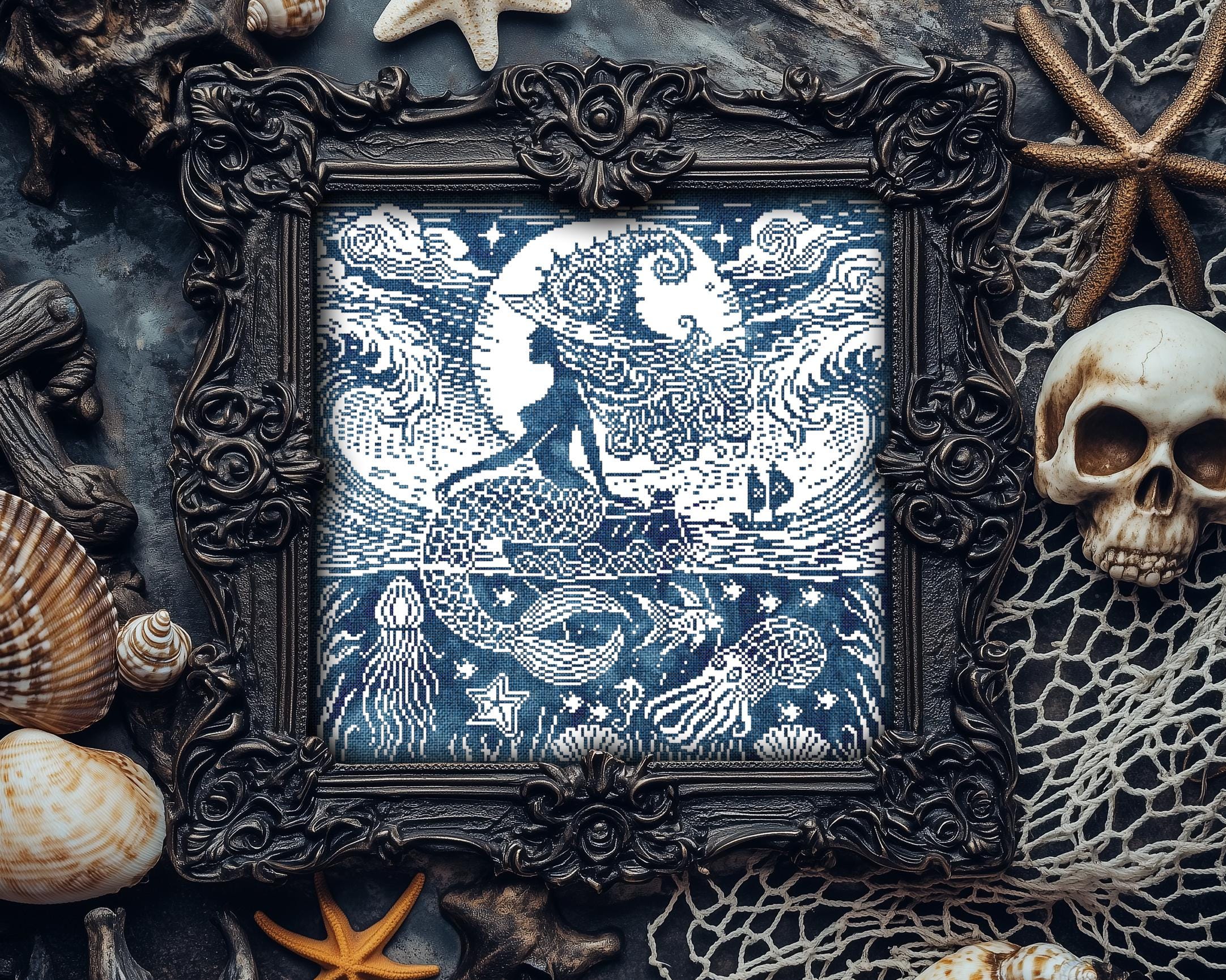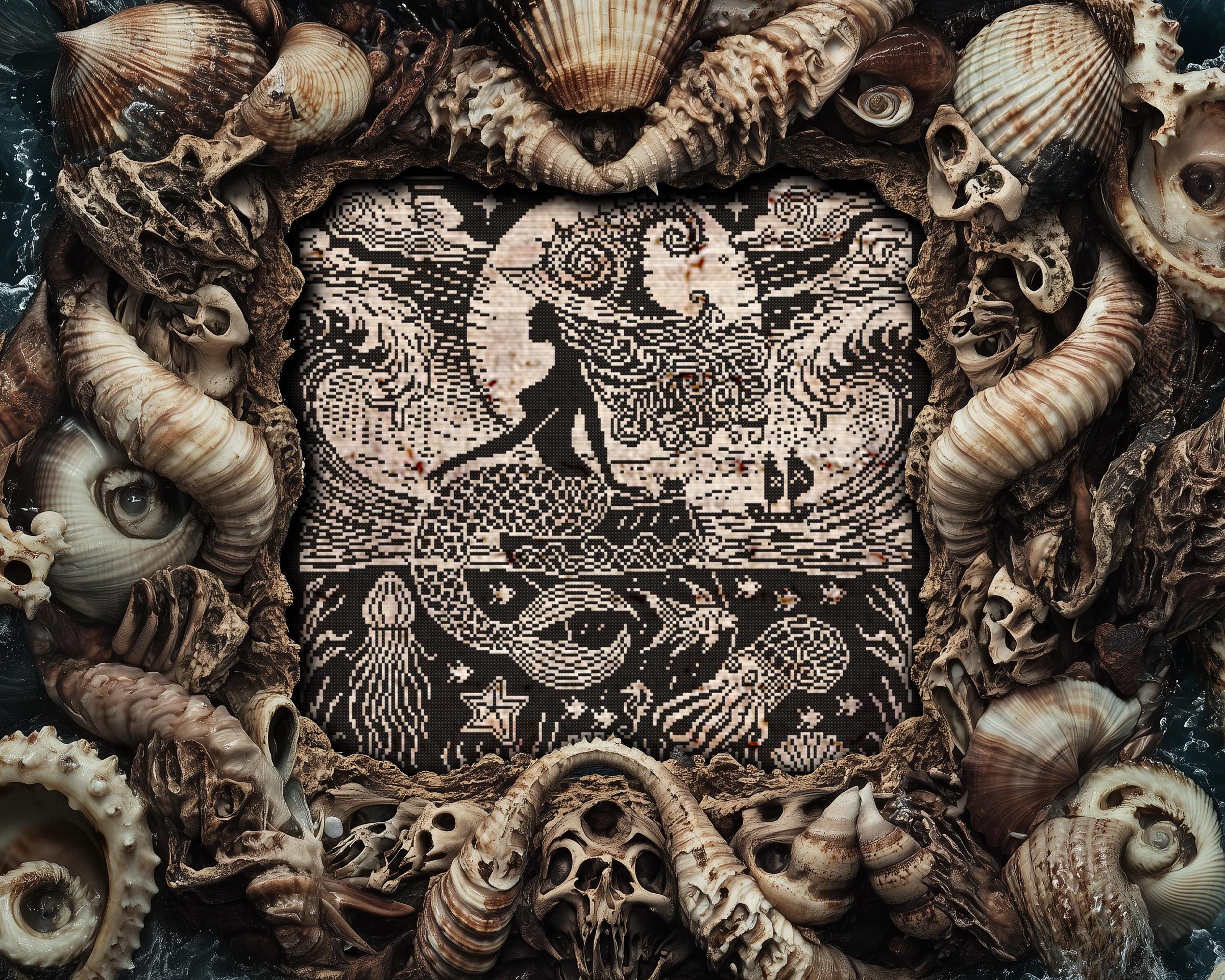 This gothic cross stitch charm is the newest member of the Woodcut Witches collection, dripping with dark cross stitch magic. It’s a Halloween cross stitch dream for those who crave modern cross stitch designs with a touch of Wiccan cross stitch energy. Want to add a little extra sorcery? Try stitching it on hand-dyed Aida or with variegated floss to give the sea a truly enchanted glow. Whether you go for a witchy cross stitch, a mermaid cross stitch, or lean into the occult cross stitch vibes, this piece is your siren call.