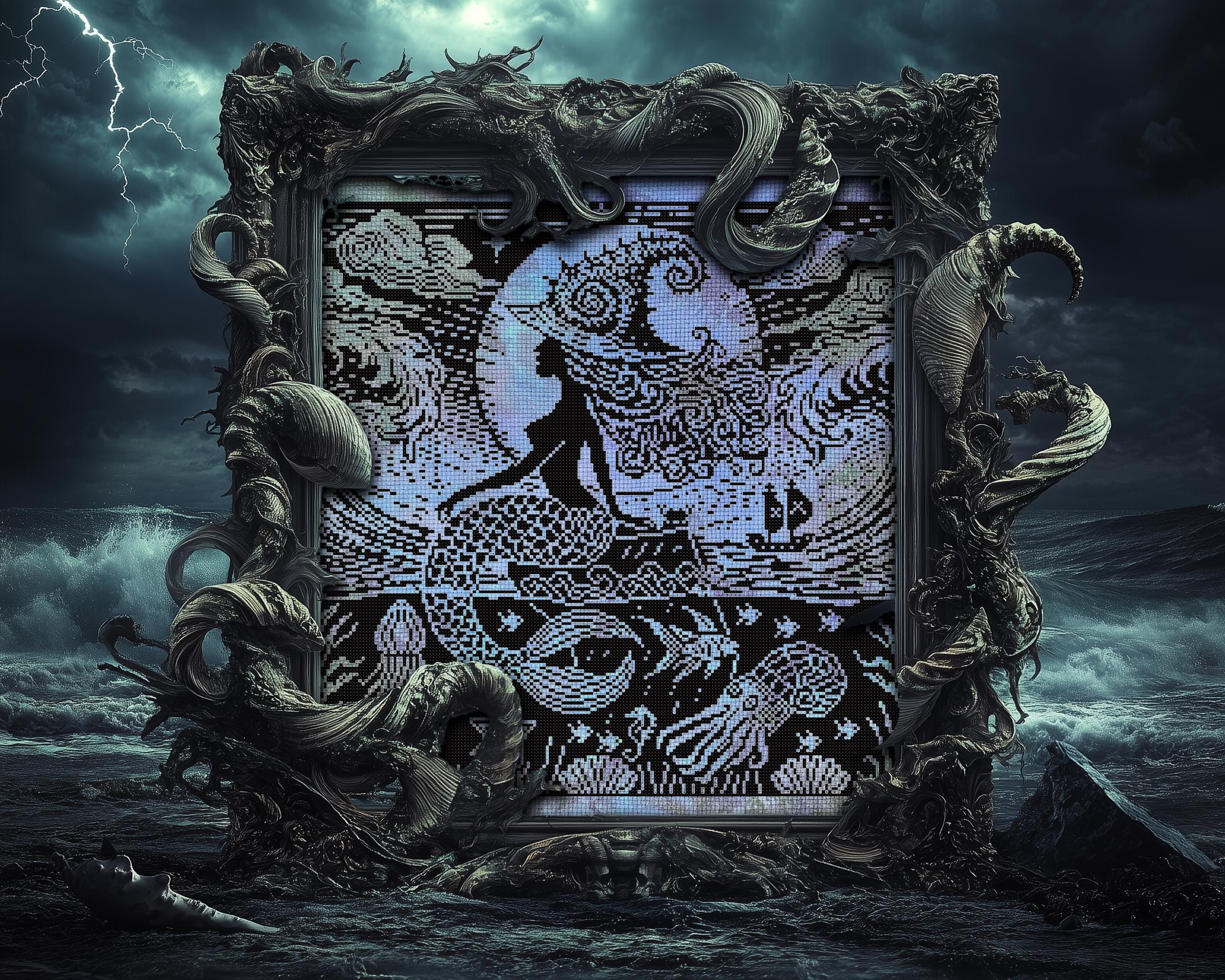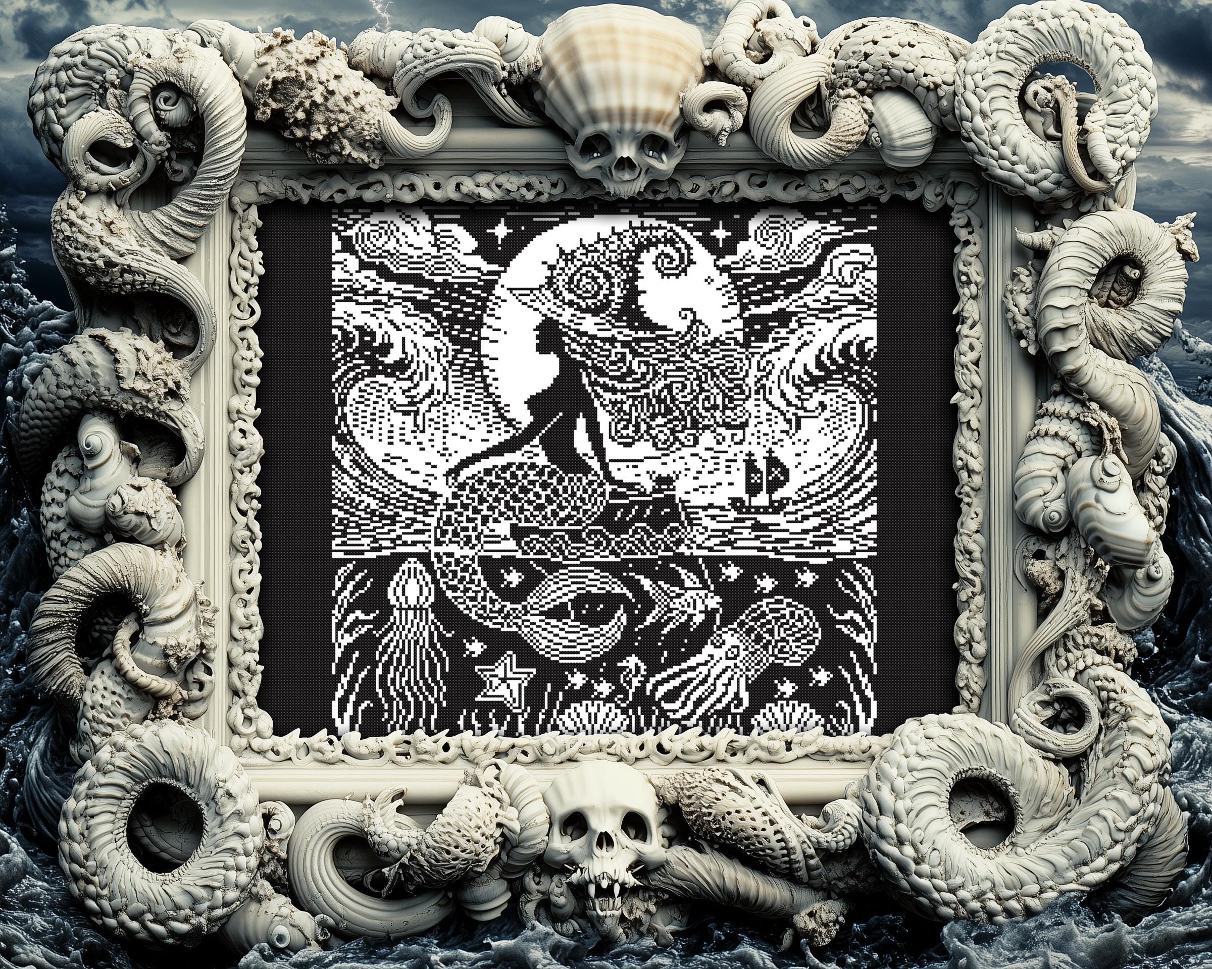 Perfect for xstitch lovers who want something creepy cross stitch, horror cross stitch, and unmistakably Woodcut Cross stitch in style. Whether you’re crafting a siren cross stitch, a sea cross stitch, or adding a fantasy cross stitch twist to your collection, this one-color wonder is both eerie and beginner-friendly. Stitch just the dark, stitch just the light, or embrace the full haunting beauty, whatever you do, just don’t stare too long into her eyes… you might not come back.