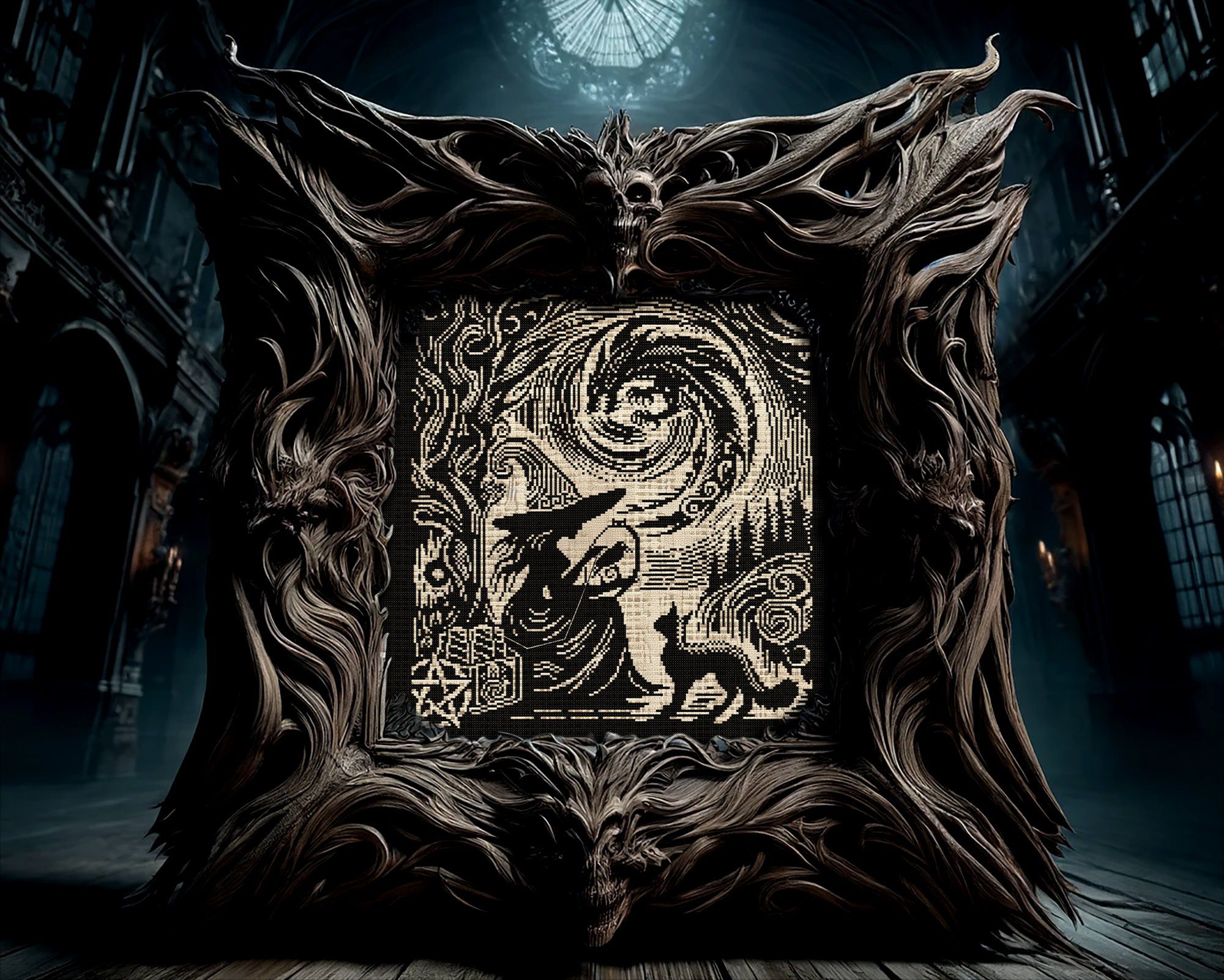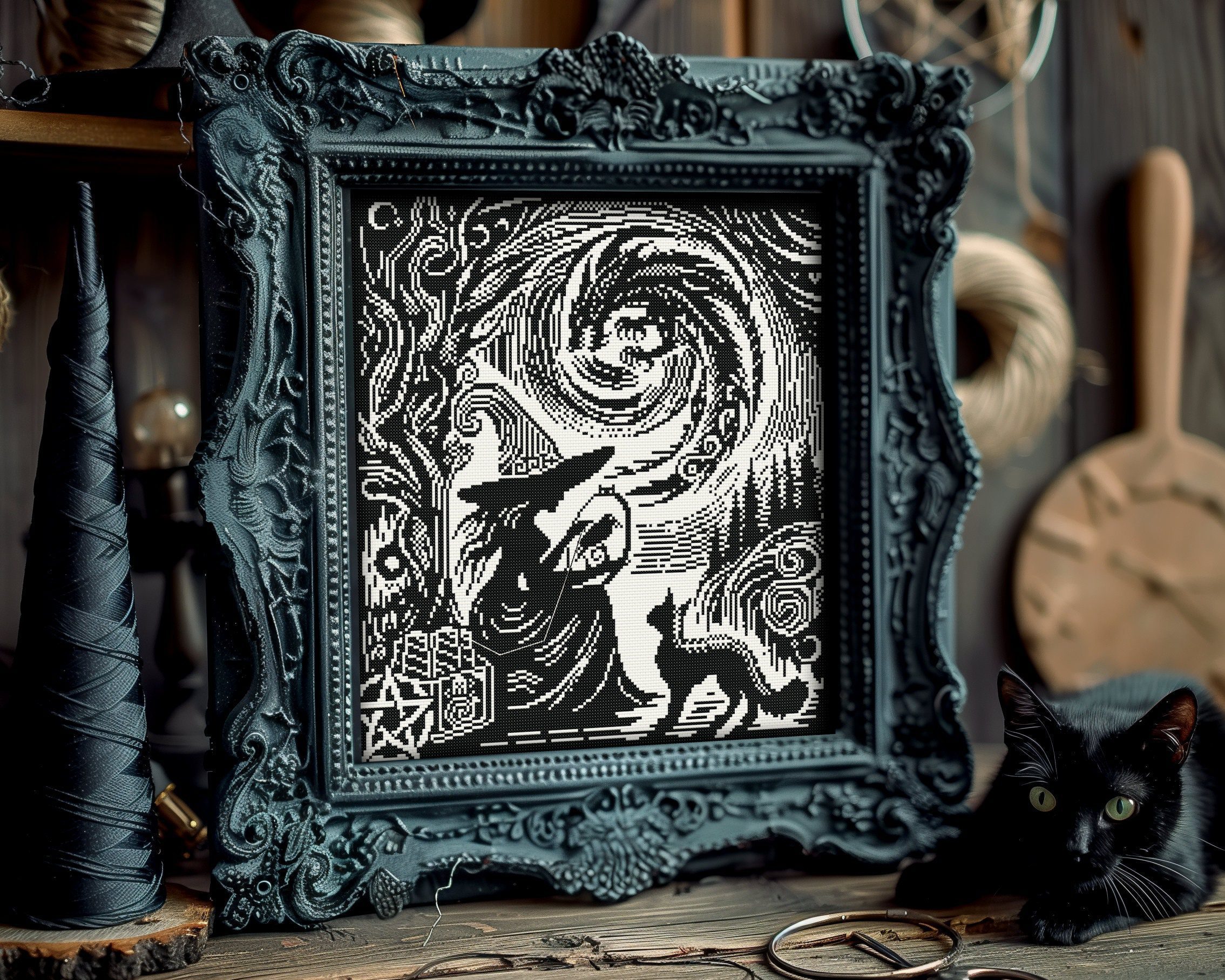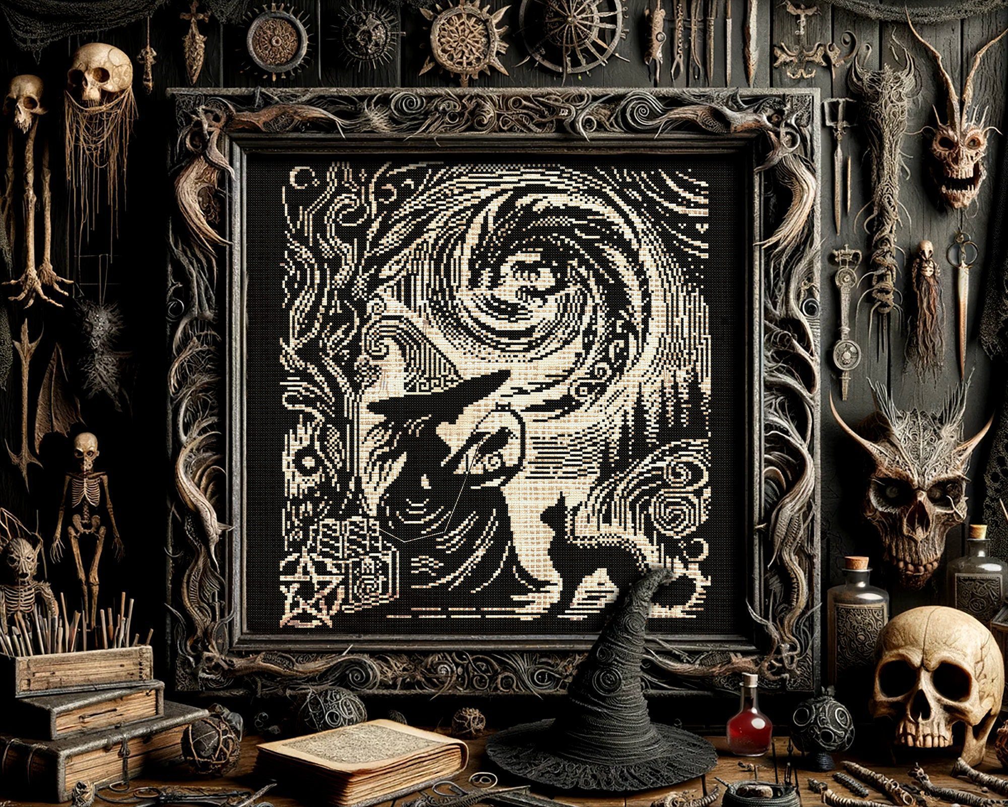 As you stitch, you’ll discover the subtle details that make this pattern truly magical. The black cat familiar adds a touch of classic black cat cross stitch charm, while the hidden dragon in the sky brings a sense of balance and fantasy. The mirrored version of the pattern offers double the fun, allowing you to explore different variations of this witch cross stitch masterpiece. Whether you’re a fan of occult cross stitch or looking to add a bit of creepy cross stitch to your repertoire, this design has something for everyone.
