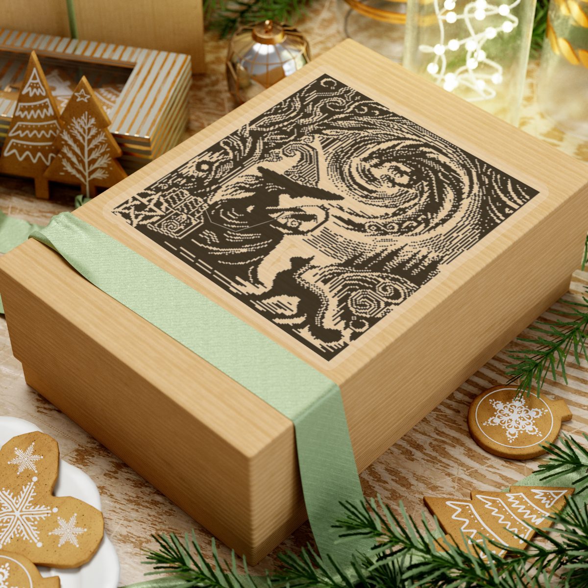 Summoned from swirling threads and stormy skies, the Woodcut Stitch Witch stands poised between cosmic chaos and cozy needlework. With her loyal familiar at her side and a vortex of secrets overhead, she weaves magic, mischief, and maybe one too many WIPs.