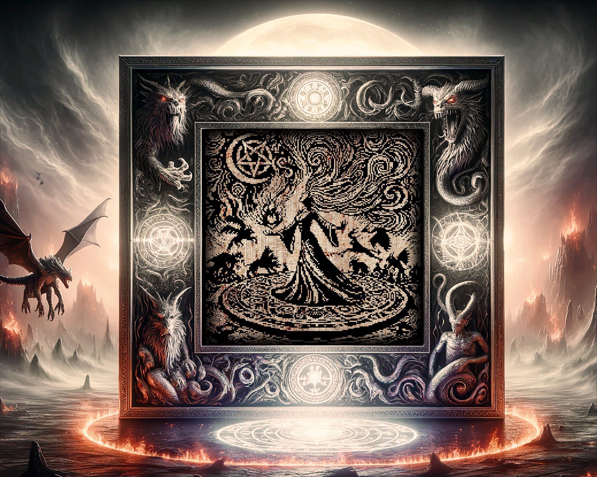 In the heart of this gothic cross stitch pattern lies a commanding witch, her presence a staple of spooky cross stitch. As a true witchy cross stitch, her arms are outstretched, summoning an assembly of the night’s most revered and occult cross stitch beings. Here, in the fabric of this creepy cross stitch, she is sovereign over the fabled Cerberus, her whispers guiding the flight of fire-breathing dragons. The Pegasus soars at her behest, while demons and other mystic creatures lurk, ready to leap from the horror cross stitch landscape.