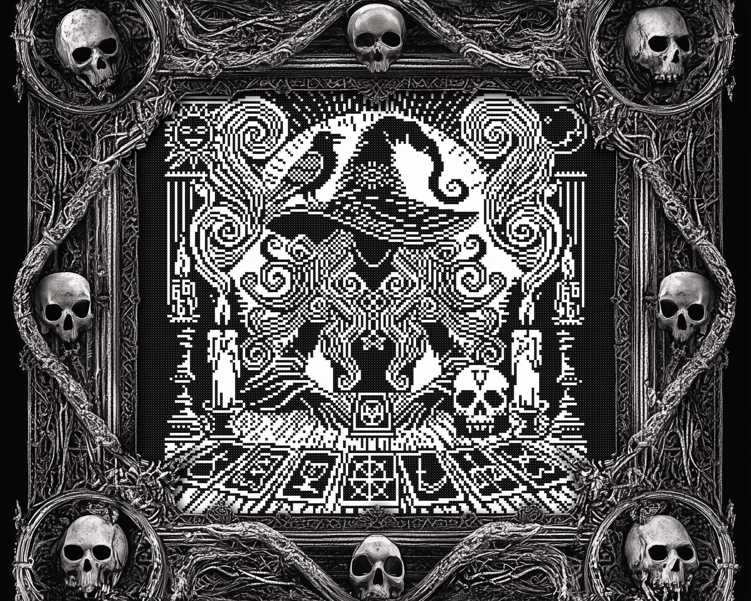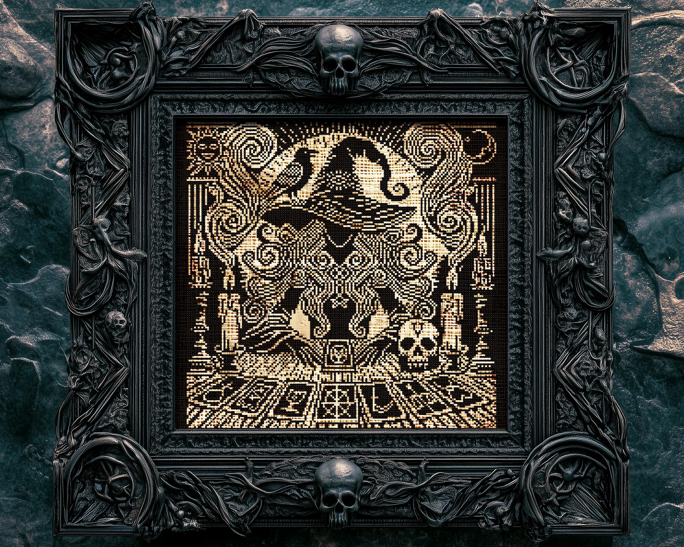This gothic cross stitch pattern is drenched in spooky cross stitch elements, from the misty swirls that curl around the witch to the ominous skull cross stitch details, making it a must-have for lovers of creepy cross stitch and horror cross stitch. The dark cross stitch aesthetic is perfectly captured, inviting those who embrace the shadows to dive deeper into the mystical and the macabre.