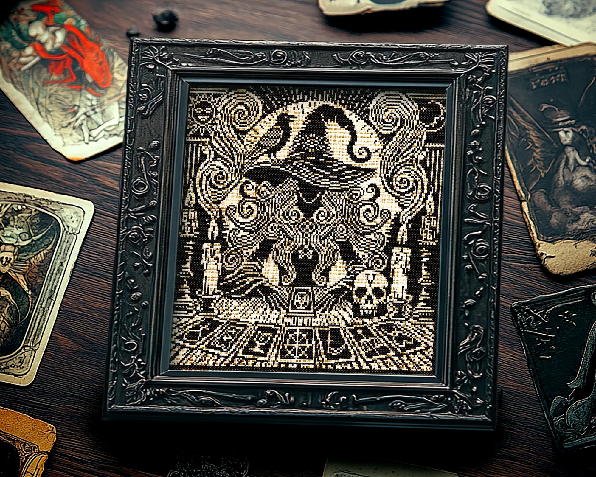 Oh, what have we conjured here? A masterpiece of darkness and mystery awaits you with the Woodcut Tarot Witch Cross Stitch Pattern! This isn’t just another gothic cross stitch pattern, it’s an immersive journey into the eerie realms of Halloween cross stitch and the arcane world of occult cross stitch. Imagine a witch, her face obscured by a swirling, oversized hat that pulses with dark energy, and her faithful Raven Cross stitch familiar perched atop, ready to unveil the secrets of the major arcana through an intricate Tarot Cross Stitch spread.